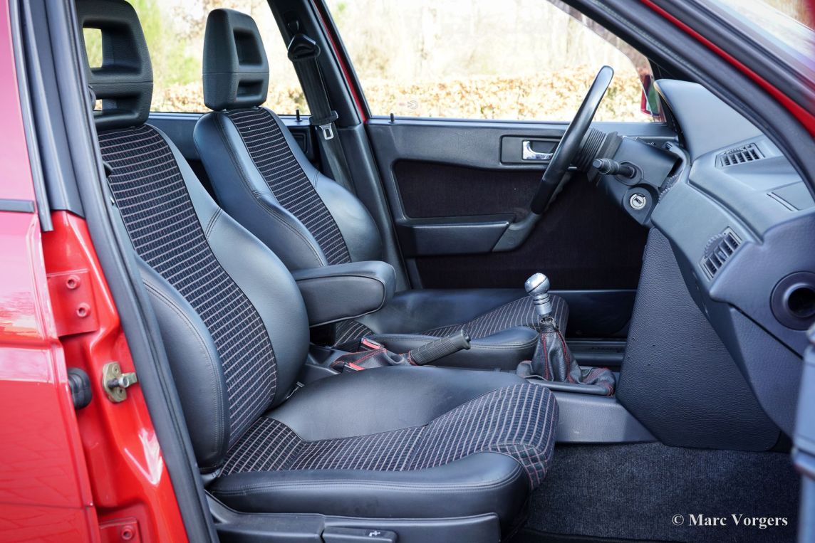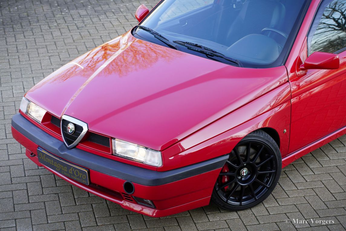Alfa Romeo 155 Twin Spark 2.0 16V, année 1995 (première immatriculation le 23 juin 1995). Numéro de châssis : ZAR16700000128500. Extérieur Rosso Alfa AR 501, rehaussé de superbes jantes Abarth 500 Esseesse noires de 17 pouces. Intérieur Q4 noir/gris avec sièges mi-cuir et moquette anthracite. Cette Alfa Romeo 155 Twin Spark 2.0 16V fut vendue neuve aux Pays-Bas. Provenant de son troisième propriétaire, elle affiche 173 754 kilomètres au compteur. L’Alfa Romeo 155 a connu un grand succès dans les championnats allemand DTM et britannique BTCC. Ses précédents propriétaires lui ont conféré un superbe look « DTM » avec une assiette élargie, des jantes en alliage chaussées de pneus taille basse qui remplissent parfaitement les passages de roue. Parmi ses autres atouts sportifs, on retrouve l'aileron arrière d'origine de la 155, les étriers de freins Brembo à 4 pistons sur les quatre roues, un système d'échappement EPS à gros diamètre, un kit de suspension spécifique, un pont antirapprochement Fusion, un volant sport Momo et une puce Squadra intégrée au système de gestion moteur. Cette Alfa Romeo sportive fut méticuleusement entretenue au fil des ans et se trouve en excellent état ! La courroie de distribution et son tendeur furent récemment remplacés, de même que les coussinets de bielle. Ont également été remplacés : l'embrayage (complet), les disques et plaquettes de freins, les flexibles de freins, les pneus, le filtre à air BMC, les bougies d'allumage, les bras de suspension, les roulements de roues et enfin les emblèmes Alfa Romeo. Nous avons photographié la voiture avant son polissage et son detailing, car elle sera prochainement prise en charge par notre atelier de peinture spécialisé pour une finition parfaite. Après cela, elle sera encore plus belle qu'en photo ! Il s'agit d'une magnifique Alfa Romeo 155 Twin Spark 2.0 16V en version DTM à carrosserie large, offrant des performances exceptionnelles !