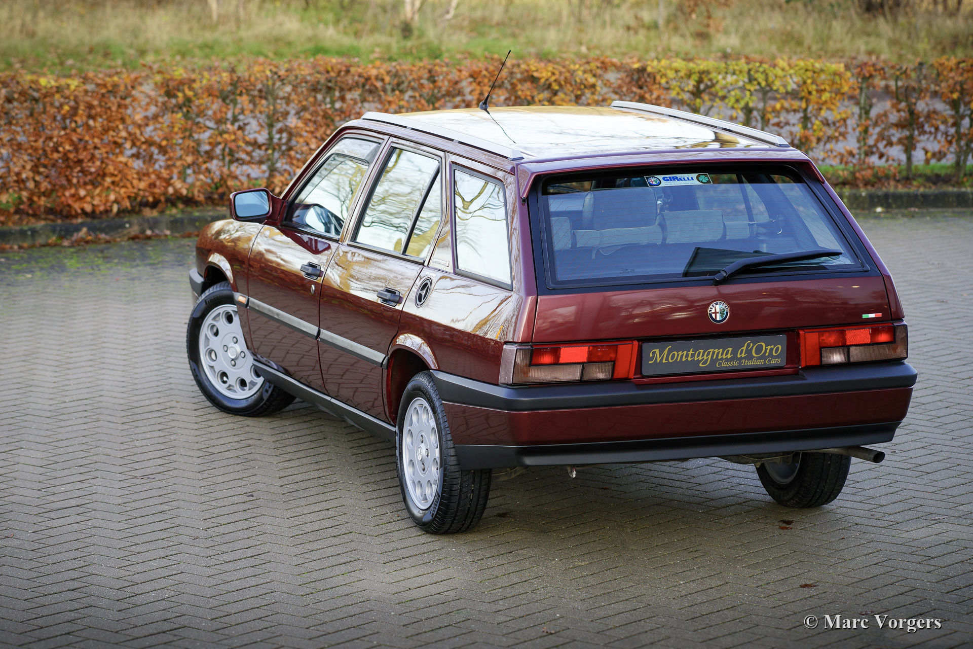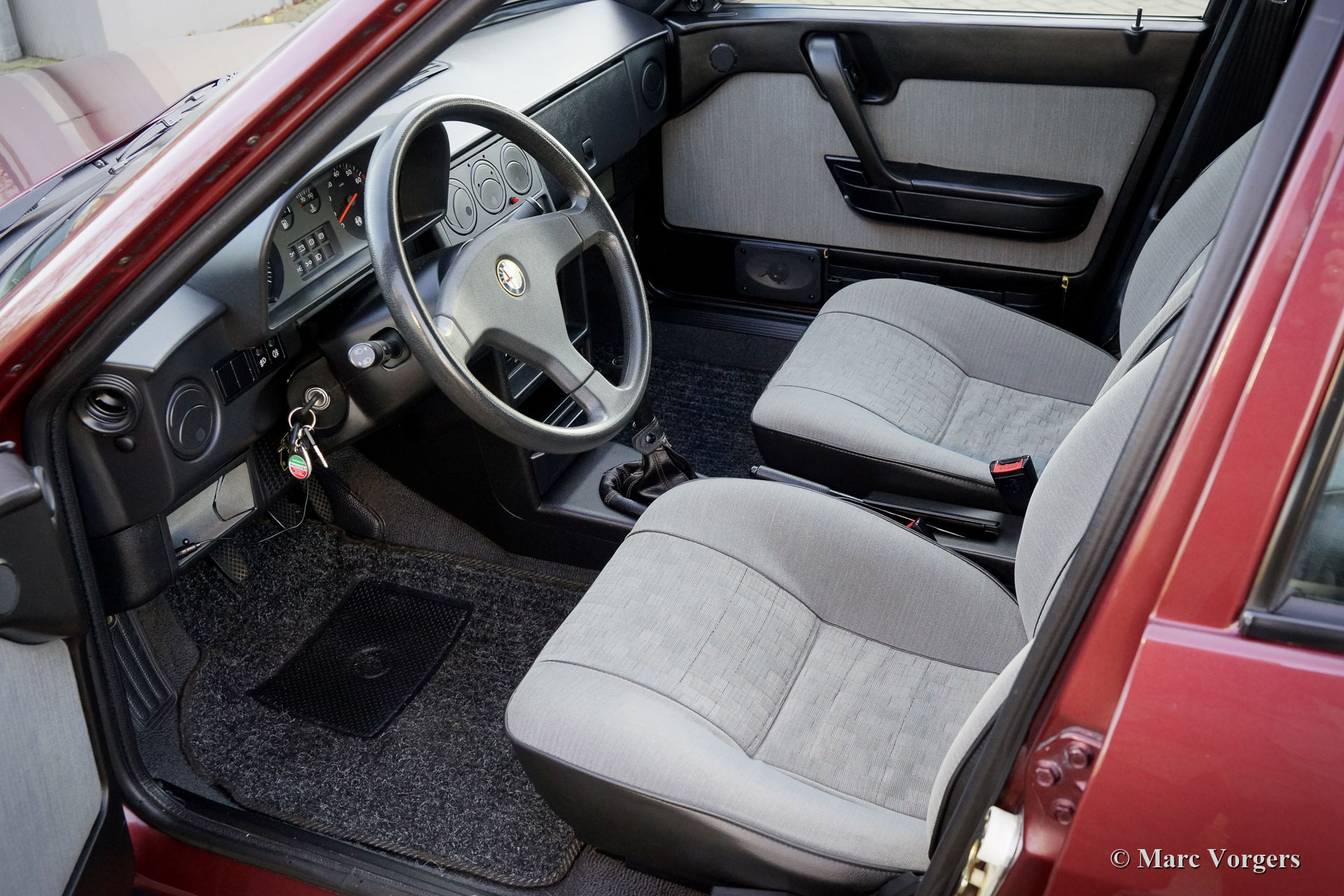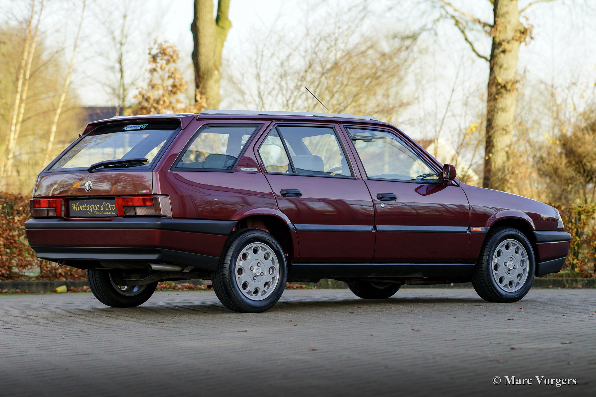 Alfa Romeo 33 Sport Wagon 1.4 IE, année 1994. Couleur Bordeaux Métallique (AR 148) combinée avec un intérieur en tissu gris / vinyle noir et un tapis gris. Cette très belle Alfa Romeo 33 Sport Wagon a été vendue neuve à M. Carlo Donini de Vérone Italie le 4 mars 1994. La voiture a été fournie par le représentant Alfa Romeo Girelli à Vérone. La voiture est livrée complète avec les livres d'origine, un livret de garantie / service estampillé Concessionaria Girelli et deux jeux de clés d'origine. L'automobile fut importée d'Italie en décembre 2020. La voiture fut vendue par Montagna d'Oro à un passionné néerlandais qui a amélioré la voiture avec de magnifiques nouvelles jantes en alliage Alfa Speedline d'origine chaussées de pneus Pirelli Cinturato P1. Depuis l'origine, cette Alfa Romeo n'a parcouru que 85,389 kilomètres et la voiture a été parfaitement entretenue au fil des ans. L'automobile est en excellent état d'origine avec seulement de légers signes d'utilisation antérieure. Vous trouverez de minuscules éclats de peinture sur la peinture et de minuscules trous de vis sur le côté gauche de la console provenant d'un kit de téléphone de voiture installé précédemment. La sellerie intérieure est comme neuve ! Il s'agit d'une magnifique Alfa Romeo Sport Wagon en excellent état d'origine et avec un faible kilométrage.