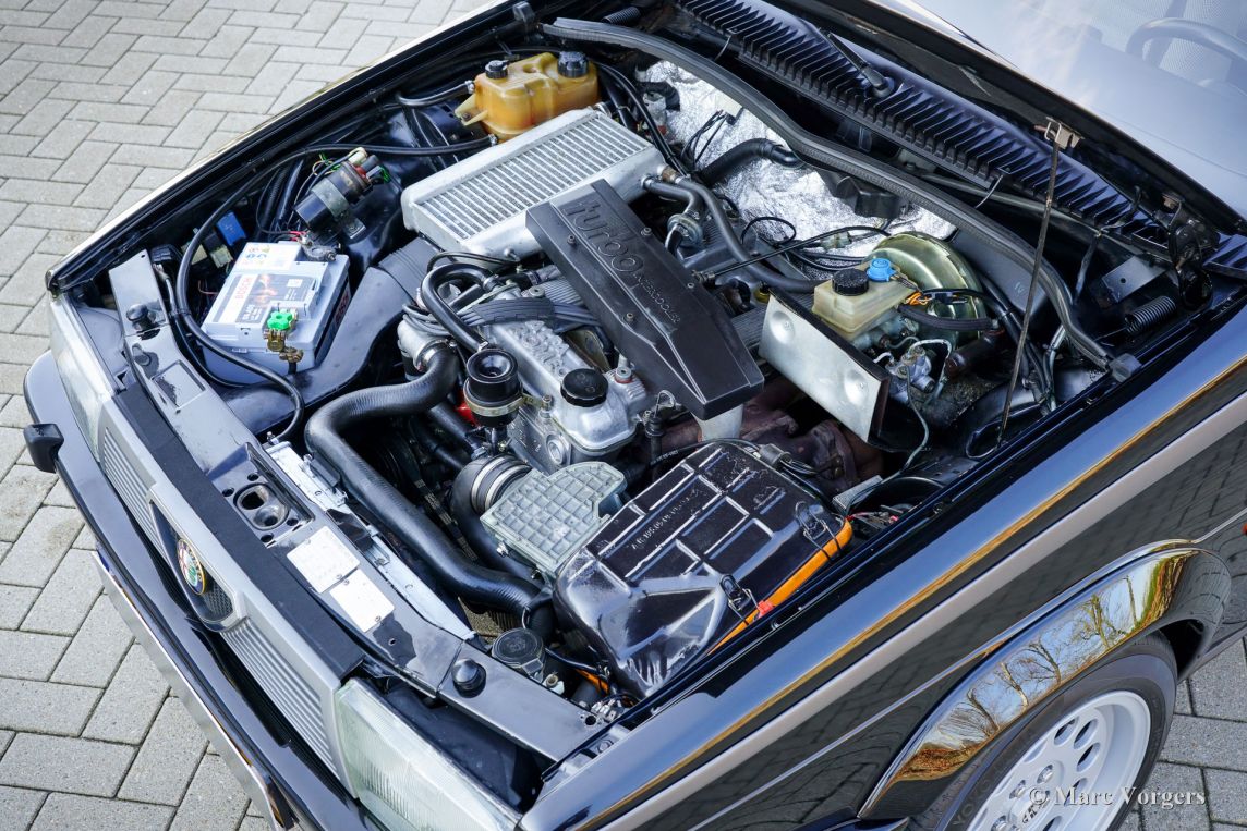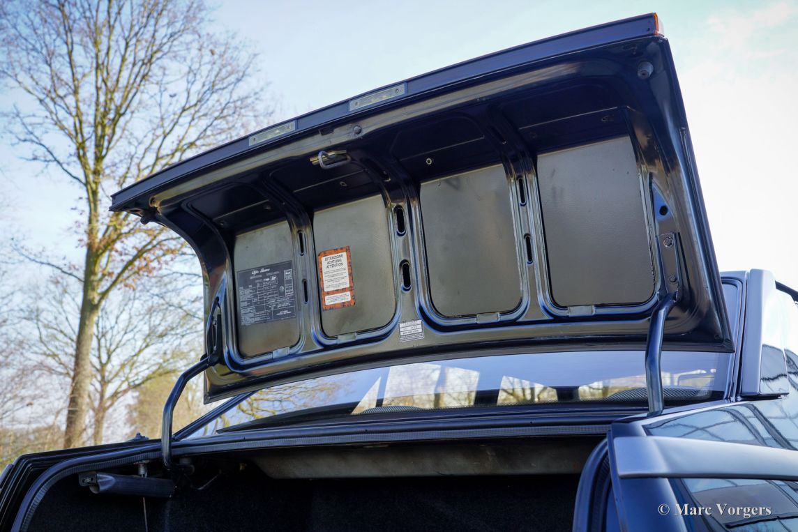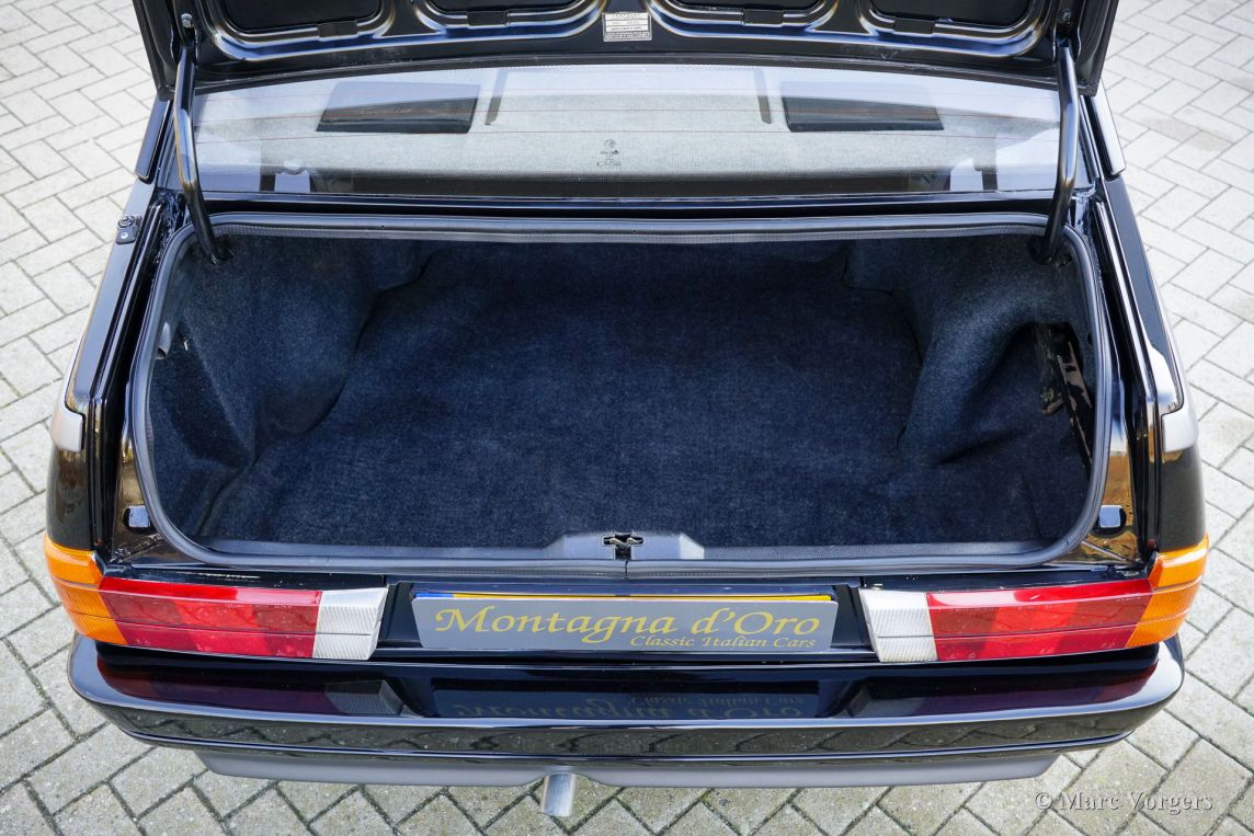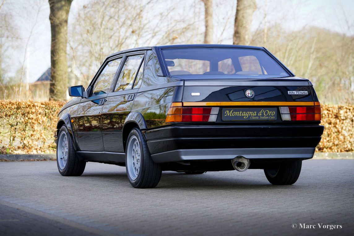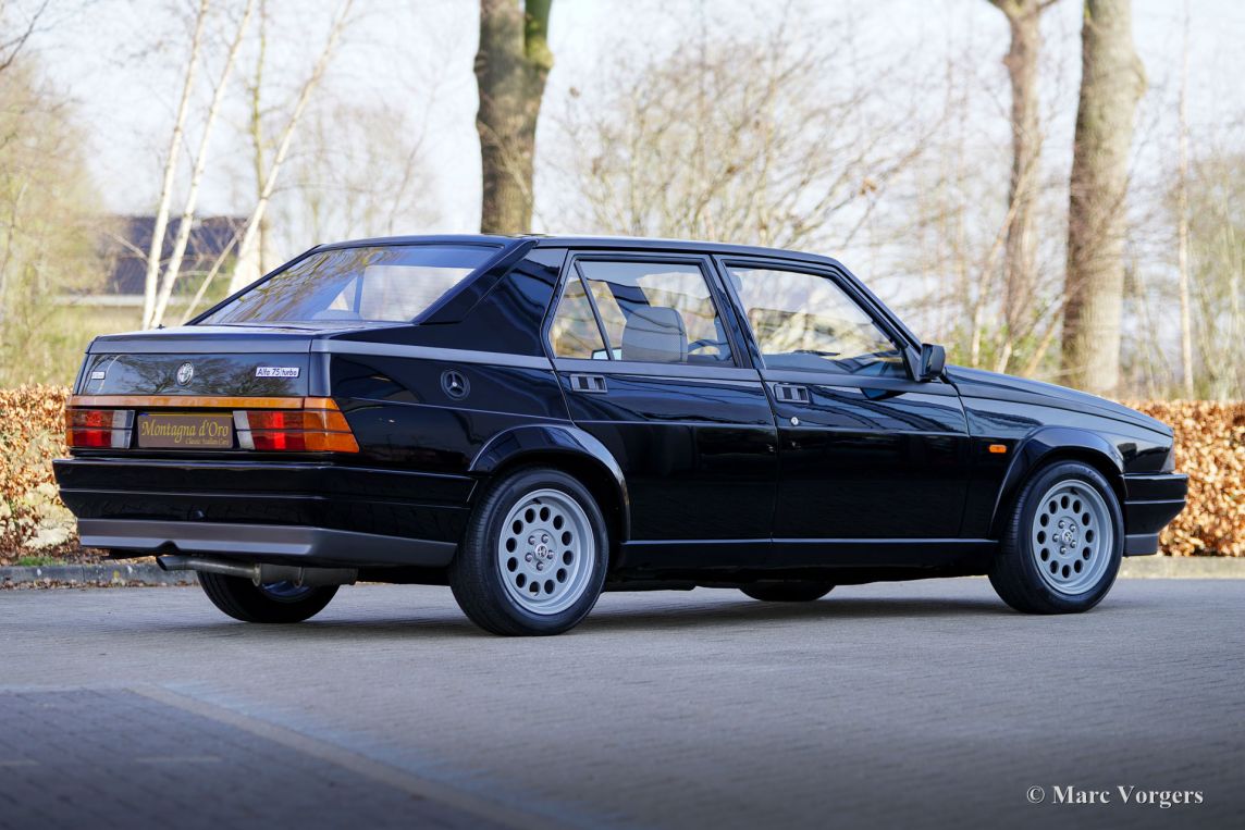 Alfa Romeo 75 1.8 Turbo, année 1986 (première immatriculation le 1er janvier 1986). Numéro de châssis ZAR162B1000050918. Extérieur noir (Nero AR 913) et intérieur noir, gris foncé et gris clair. Les sièges, comme neufs, sont revêtus de tissu à carreaux (gris très clair et gris foncé) avec des empiècements en cuir gris foncé sur les assises des sièges avant. Cette magnifique Alfa Romeo 75 Turbo fut vendue neuve en Italie. Elle est équipée d'une climatisation d'origine, une option très rare ! Il y a quelques années, cette superbe voiture fut restaurée par le célèbre atelier Museo Fratelli Cozzi de Legnano, en banlieue milanaise. Le moteur et la boîte de vitesses furent révisés et un magnifique intérieur flambant neuf a été installé. En 2024, la voiture fut importée aux Pays-Bas. Récemment, la peinture fut perfectionnée et traitée avec un glaçage Labocosmetica, et de nouvelles jantes en alliage Ronal d'origine furent montées. Les factures d'entretien sont disponibles. Afin de parfaire cette rare Alfa Romeo 75 Turbo, nous avons acquis des feux arrière neufs d'origine et une barre de réflecteurs arrière qui seront installés prochainement. Cette superbe Alfa Romeo 75 1.8 Turbo affiche seulement 101 511 kilomètres au compteur. La voiture est dans un état exceptionnel, proche du neuf, et se conduit comme une voiture neuve ! Vous aurez bien du mal à trouver un autre exemplaire dans un état aussi impeccable ! Les chiffres de production exacts de l'Alfa Romeo 75 1.8 Turbo sont inconnus, mais Alfa Romeo devait en produire au moins 5 000 pour obtenir l'homologation FIA pour les voitures de tourisme du Groupe A. Sous le capot, vous trouverez le moteur quatre cylindres en ligne de 1 800 cm³, équipé d'un turbocompresseur Garrett T3 et d'un intercooler, développant 155 ch et 226 Nm de couple. Le turbo offrait à la 75 des performances remarquables pour son époque, avec une vitesse de pointe de 210 km/h et une accélération de 0 à 100 km/h en 7,6 secondes. (Et c'est toujours très rapide avec le léger sifflement du turbo dans vos oreilles !) Ces chiffres plaçaient la 75 Turbo parmi les meilleures berlines compactes de direction de son temps. Saisissez l'opportunité d'acquérir une Alfa Romeo 75 1.8 Turbo dans un état de collection quasi parfait, provenant du prestigieux Museo Fratelli Cozzi !