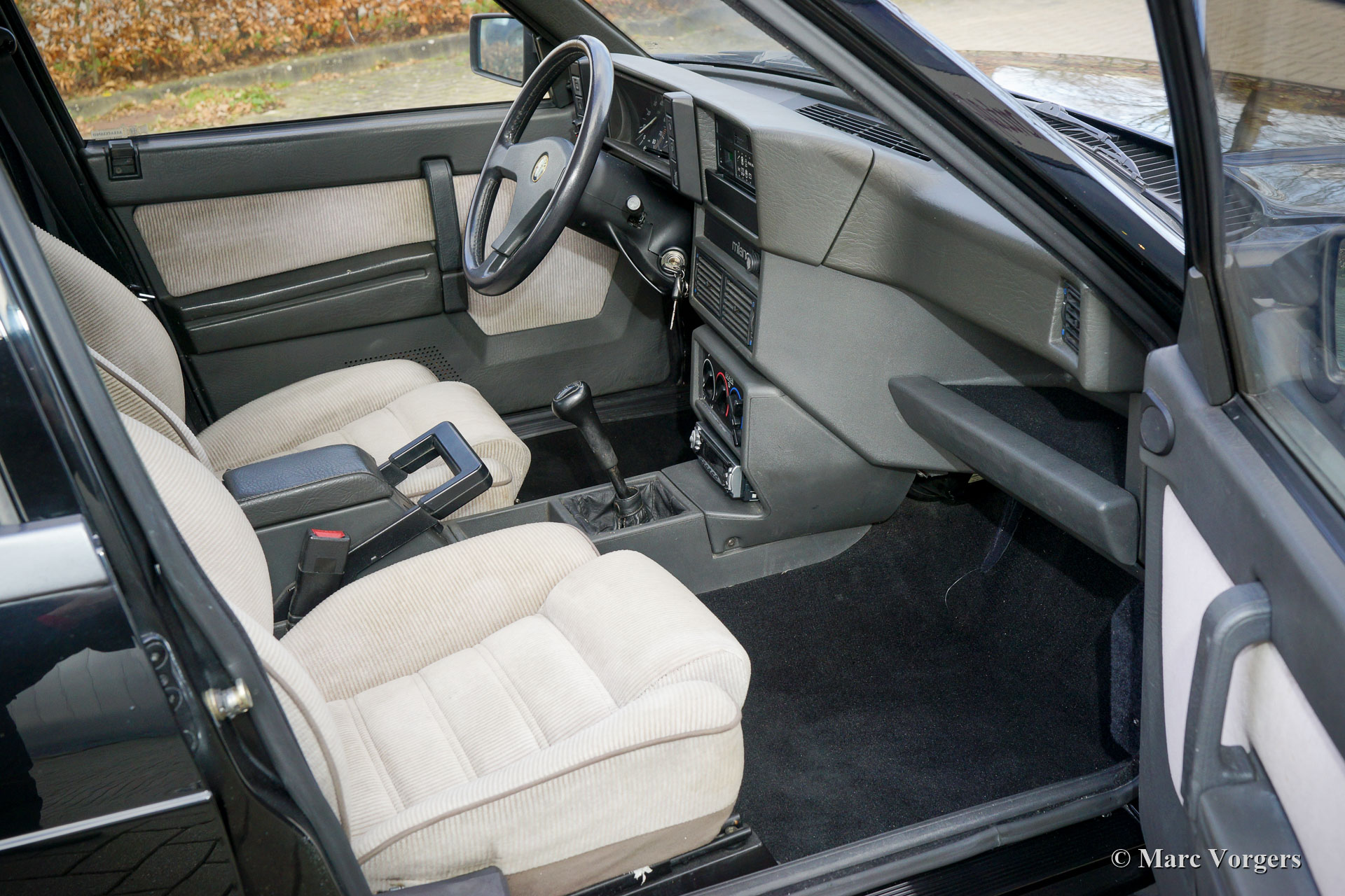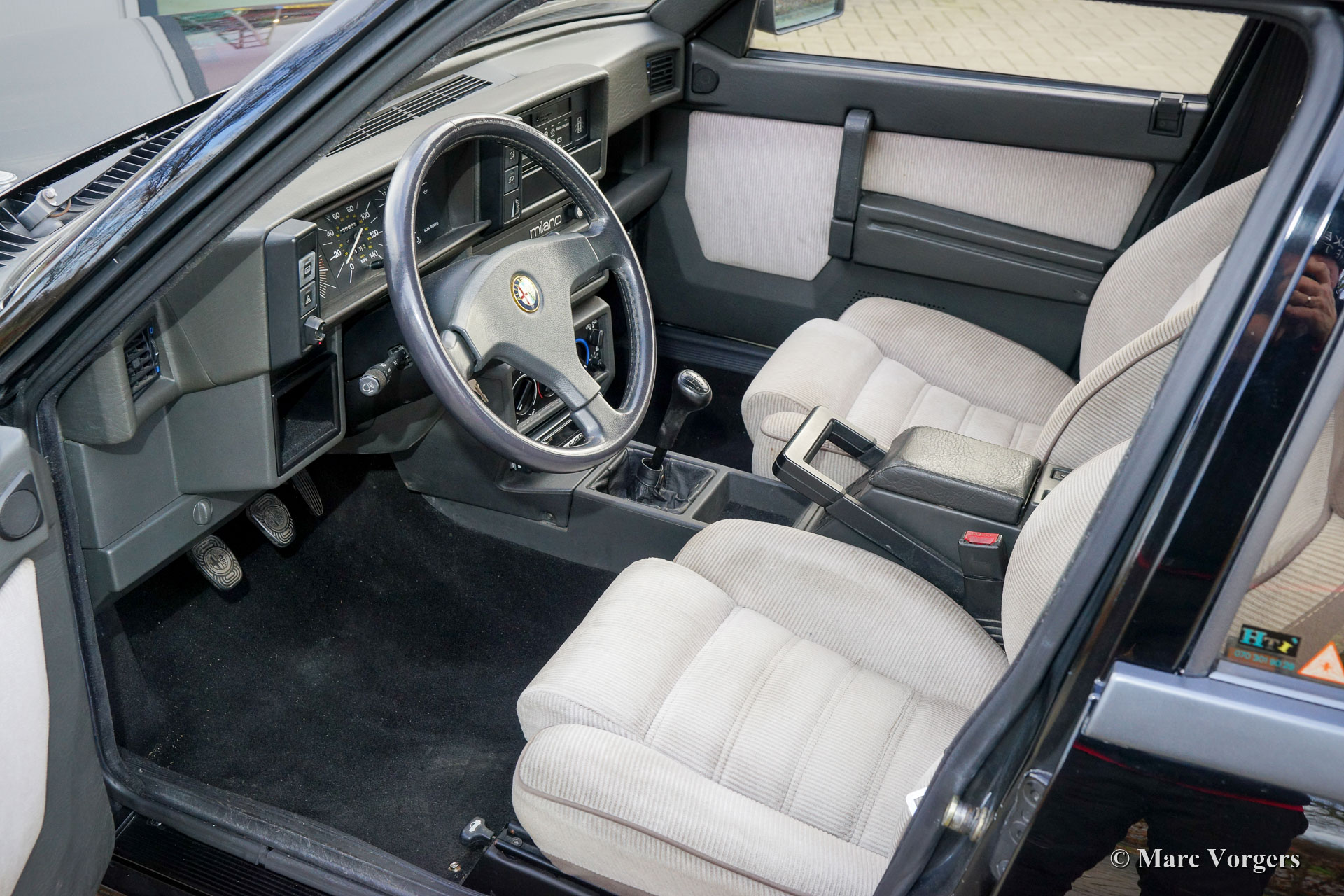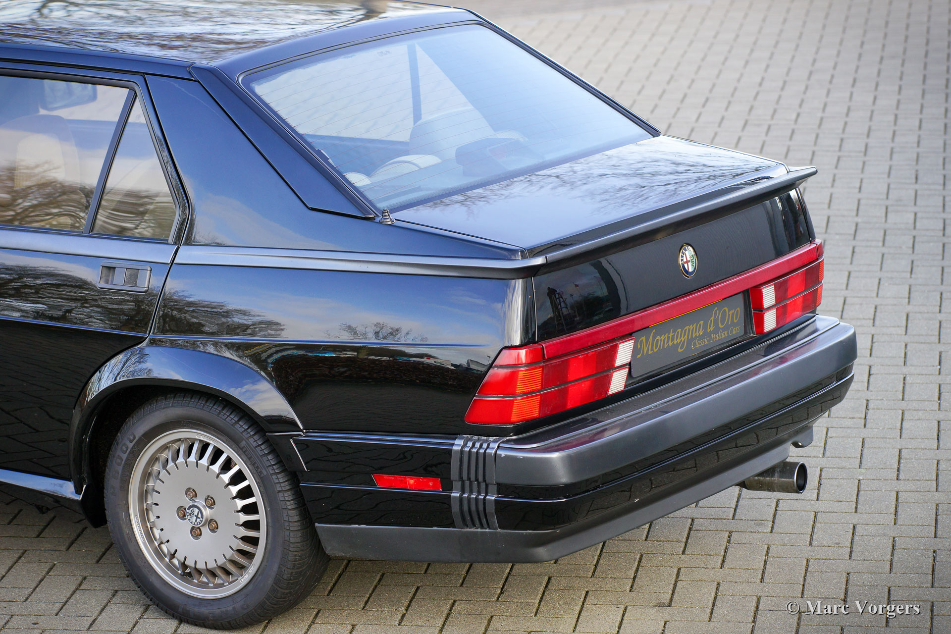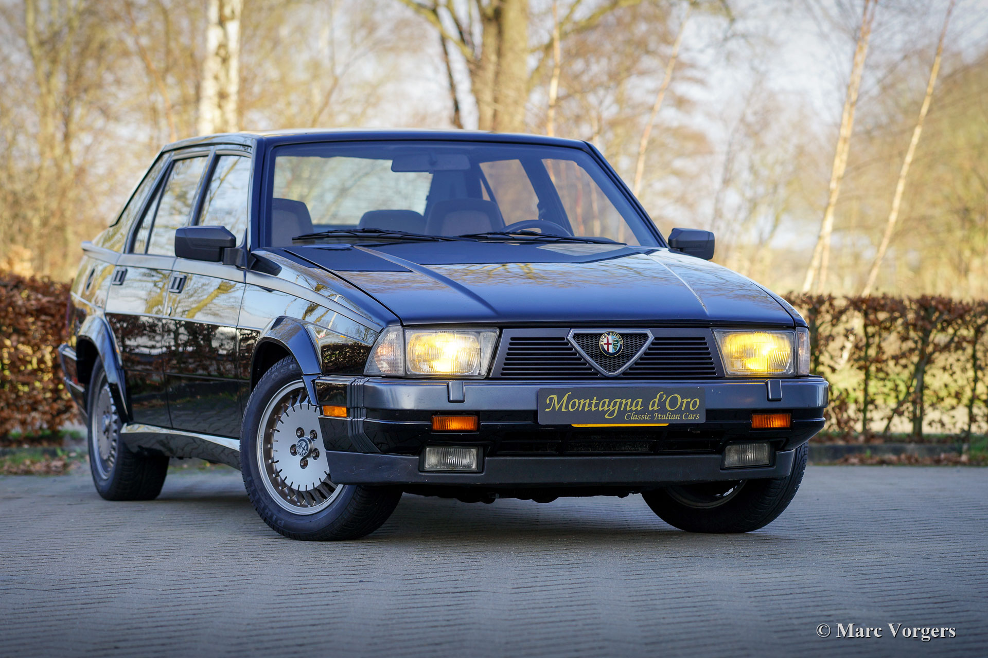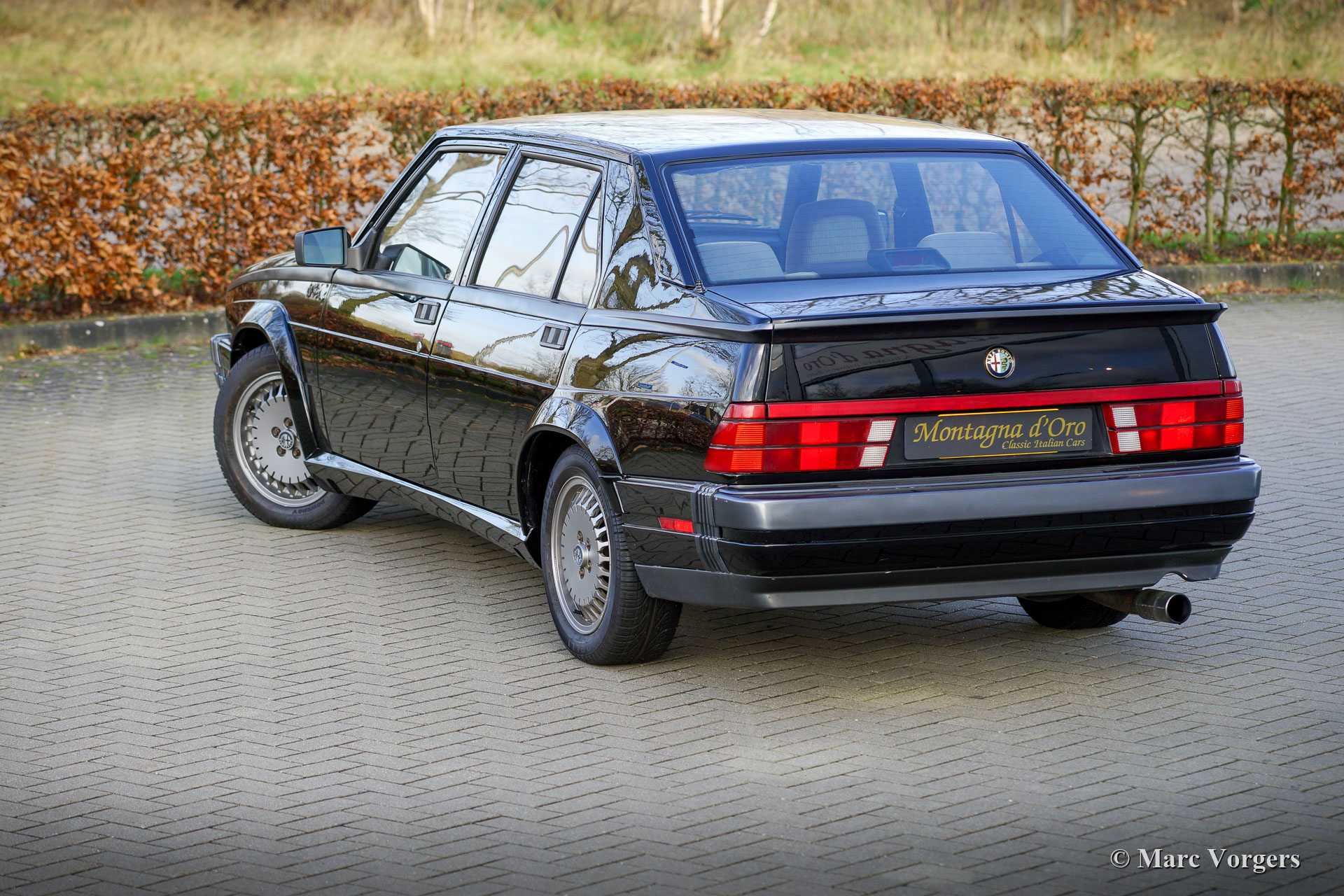 Alfa Romeo 75 2.5 V6 Milano, année 1986. Couleur noire (Nero 601 Doppio Strato) associée à un intérieur en tissu gris/noir. L'Alfa Romeo 75 Milano n'était vendue que sur le marché américain. Le Milano se distingue des modèles européens avec ses pare-chocs spéciaux et l'équipement standard d'options de luxe comme les vitres électriques autour et la climatisation. Le Milano était disponible sur le marché américain de 1986 à 1989. Le Milano pouvait être équipé d'un moteur V6 de 2,5 ou 3,0 litres. Cet exemplaire fantastique fut vendu neuve par D. Spernak 'Fuzzy' d'Auto Palace à Pittsburgh (Pennsylvanie) et immatriculé aux États-Unis le 18 septembre 1986. La voiture fut exportée aux Pays-Bas en 1989. Aux Pays-Bas, la voiture fut chérie par de vrais passionnés, et la voiture a parcouru 130,333 milles depuis l'origine. Cette Alfa 75 Milano est dans un très bon état d'origine avec seulement de légers signes d'utilisation antérieure. Cette 75 Milano montre tous les détails d'origine et la voiture roule parfaitement. Le moteur V6 de 2,5 litres est un pur délice et sonne de manière impressionnante ! Cette fantastique Alfa Romeo 75 Milano est livrée avec tous les carnets d'origine, y compris un carnet d'entretien rempli et tamponné. Il s'agit d'un exemple merveilleux et super original pour les passionnés d'Alfa Romeo !