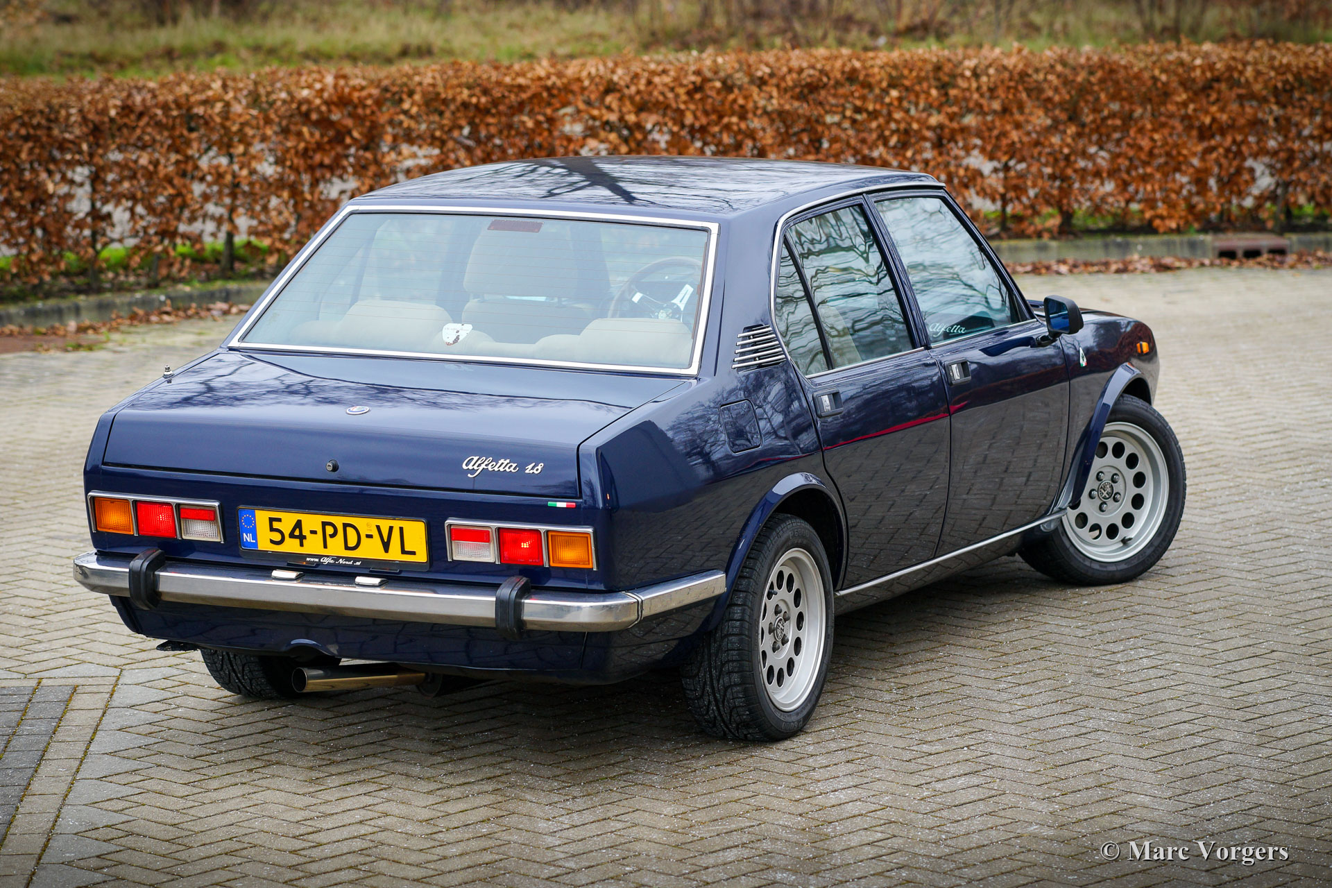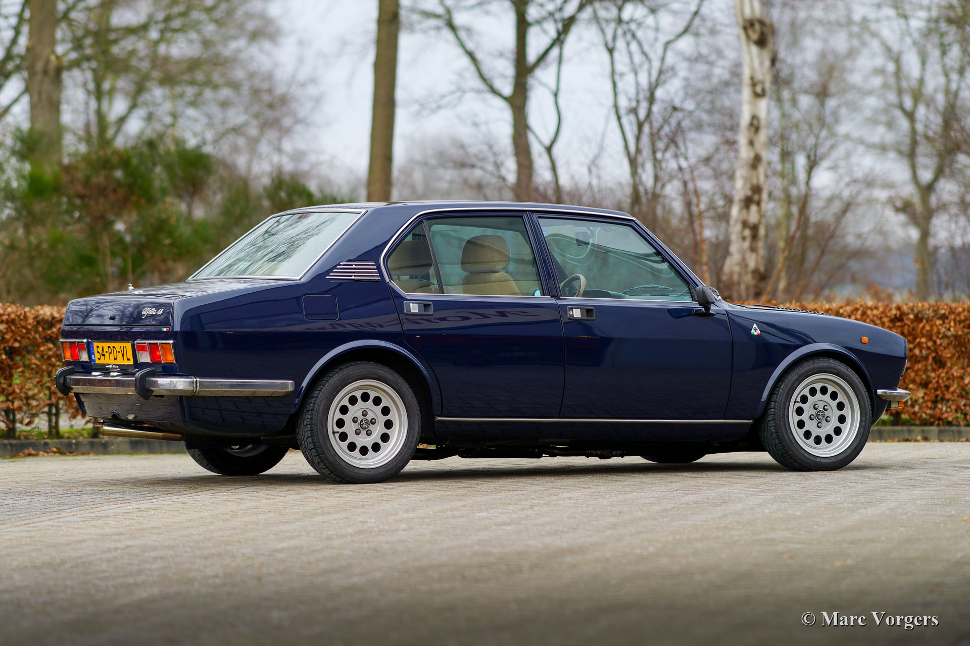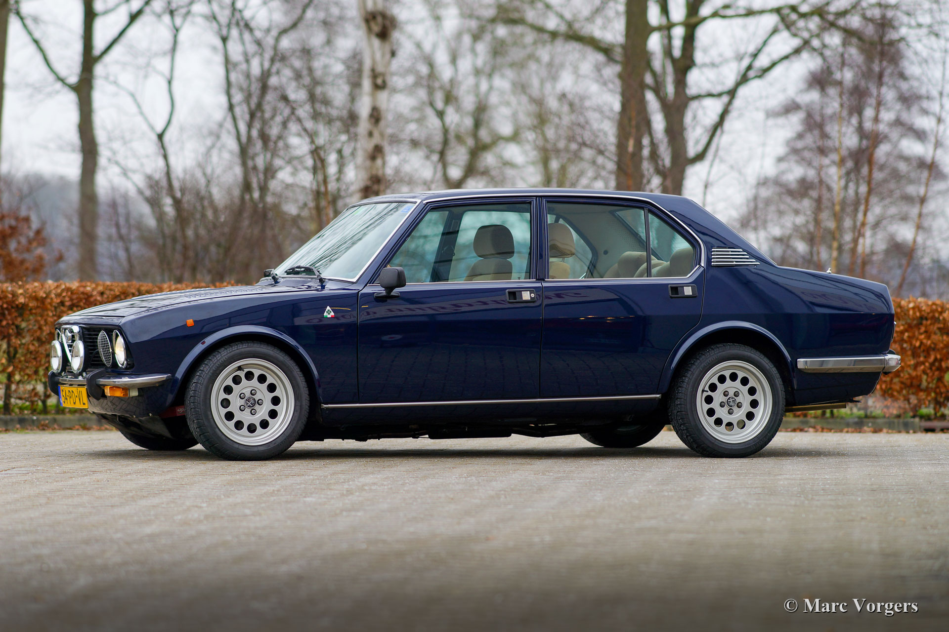 Alfa Romeo Alfetta Twin Spark, année 1980. Couleur bleu foncé « Blu Olandese » (AR343) associée à un intérieur Recaro en tissu beige et à un tapis noir. Cette Alfa Romeo Alfetta a été importée aux Pays-Bas en 2004. Ces dernières années, l'Alfetta a reçu une restauration de carrosserie dans laquelle de nombreuses pièces d'origine furent utilisées (toutes les portes et l'aile avant gauche). Après cela, la voiture a reçu une magnifique peinture dans la couleur d'origine. L'intérieur fut équipé des sièges Recaro spéciaux Alfa 75 « Numerata », et les sièges arrière et les panneaux des portes ont reçu une nouvelle sellerie. De plus, la voiture fut largement améliorée et reconstruite mécaniquement, l'Alfetta 1.8 Twin Spark est maintenant une 2.0 Twin Spark incroyablement rapide avec 180 ch et 202 Nm de couple. Vous trouverez ci-dessous une liste de toutes les mises à niveau spéciales (de réglage). Cette Alfetta Twin Spark est en très bon état et la voiture roule et pilote très sportive! Le compteur kilométrique indique 63,972 kilomètres, le moteur, la boîte de vitesses et la transmission nouvellement révisés ont parcouru 6000 kilomètres. Cette Alfa Romeo Alfetta est une magnifique machine motrice pour route ou piste!