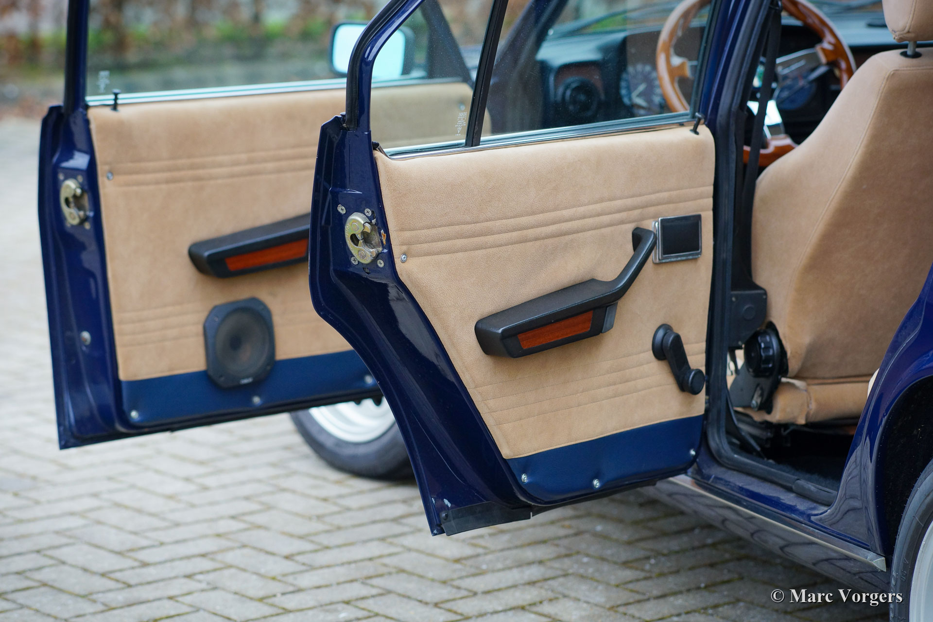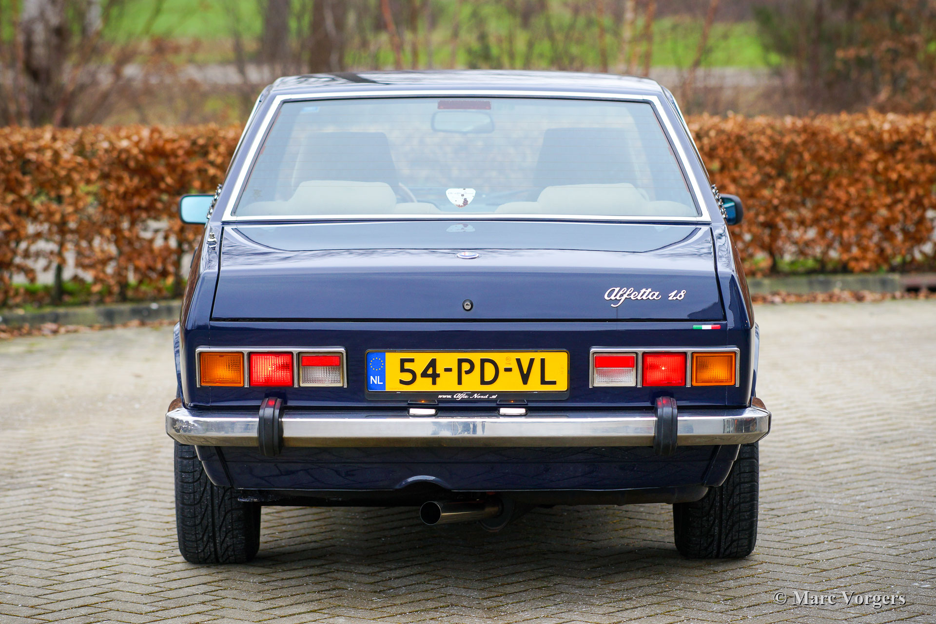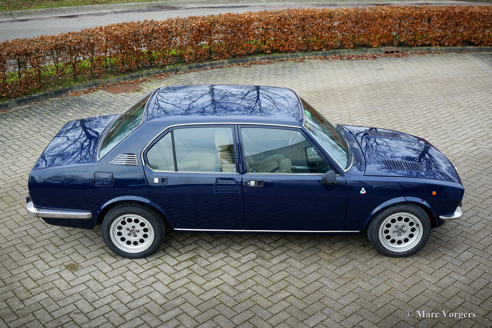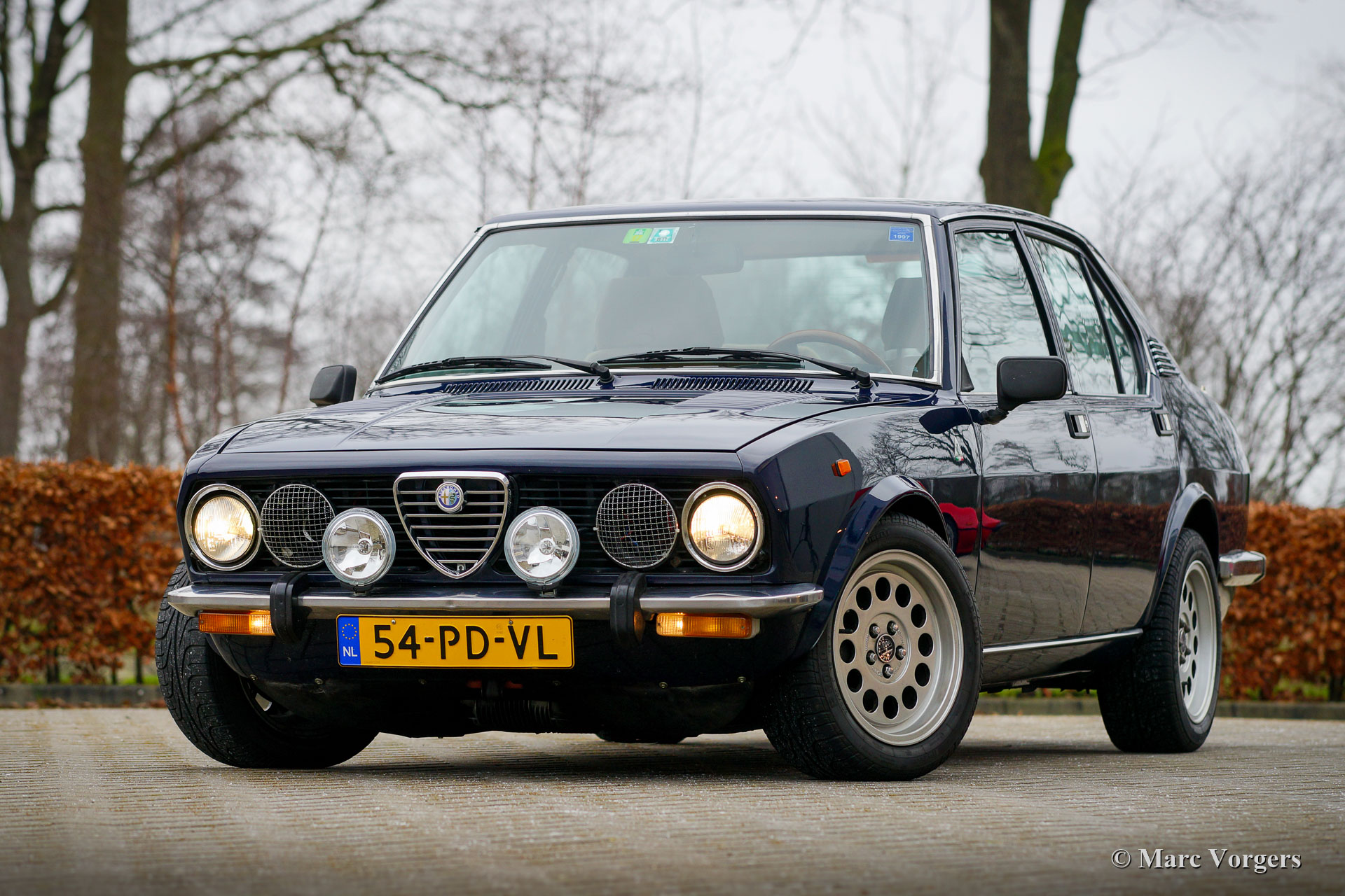 Alfa Romeo Alfetta Twin Spark, année 1980. Couleur bleu foncé « Blu Olandese » (AR343) associée à un intérieur Recaro en tissu beige et à un tapis noir. Cette Alfa Romeo Alfetta a été importée aux Pays-Bas en 2004. Ces dernières années, l'Alfetta a reçu une restauration de carrosserie dans laquelle de nombreuses pièces d'origine furent utilisées (toutes les portes et l'aile avant gauche). Après cela, la voiture a reçu une magnifique peinture dans la couleur d'origine. L'intérieur fut équipé des sièges Recaro spéciaux Alfa 75 « Numerata », et les sièges arrière et les panneaux des portes ont reçu une nouvelle sellerie. De plus, la voiture fut largement améliorée et reconstruite mécaniquement, l'Alfetta 1.8 Twin Spark est maintenant une 2.0 Twin Spark incroyablement rapide avec 180 ch et 202 Nm de couple. Vous trouverez ci-dessous une liste de toutes les mises à niveau spéciales (de réglage). Cette Alfetta Twin Spark est en très bon état et la voiture roule et pilote très sportive! Le compteur kilométrique indique 63,972 kilomètres, le moteur, la boîte de vitesses et la transmission nouvellement révisés ont parcouru 6000 kilomètres. Cette Alfa Romeo Alfetta est une magnifique machine motrice pour route ou piste!