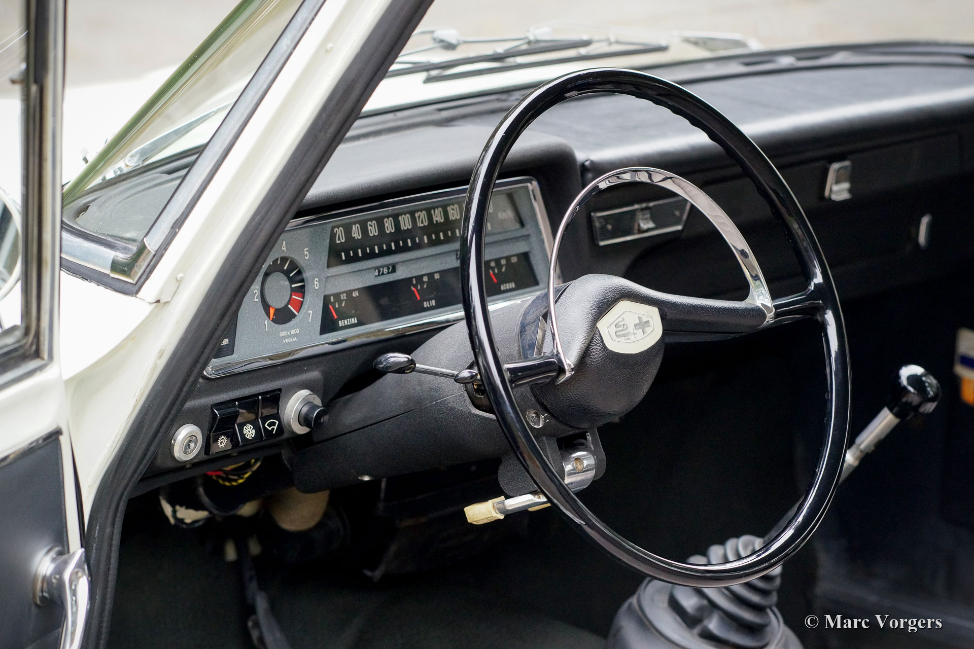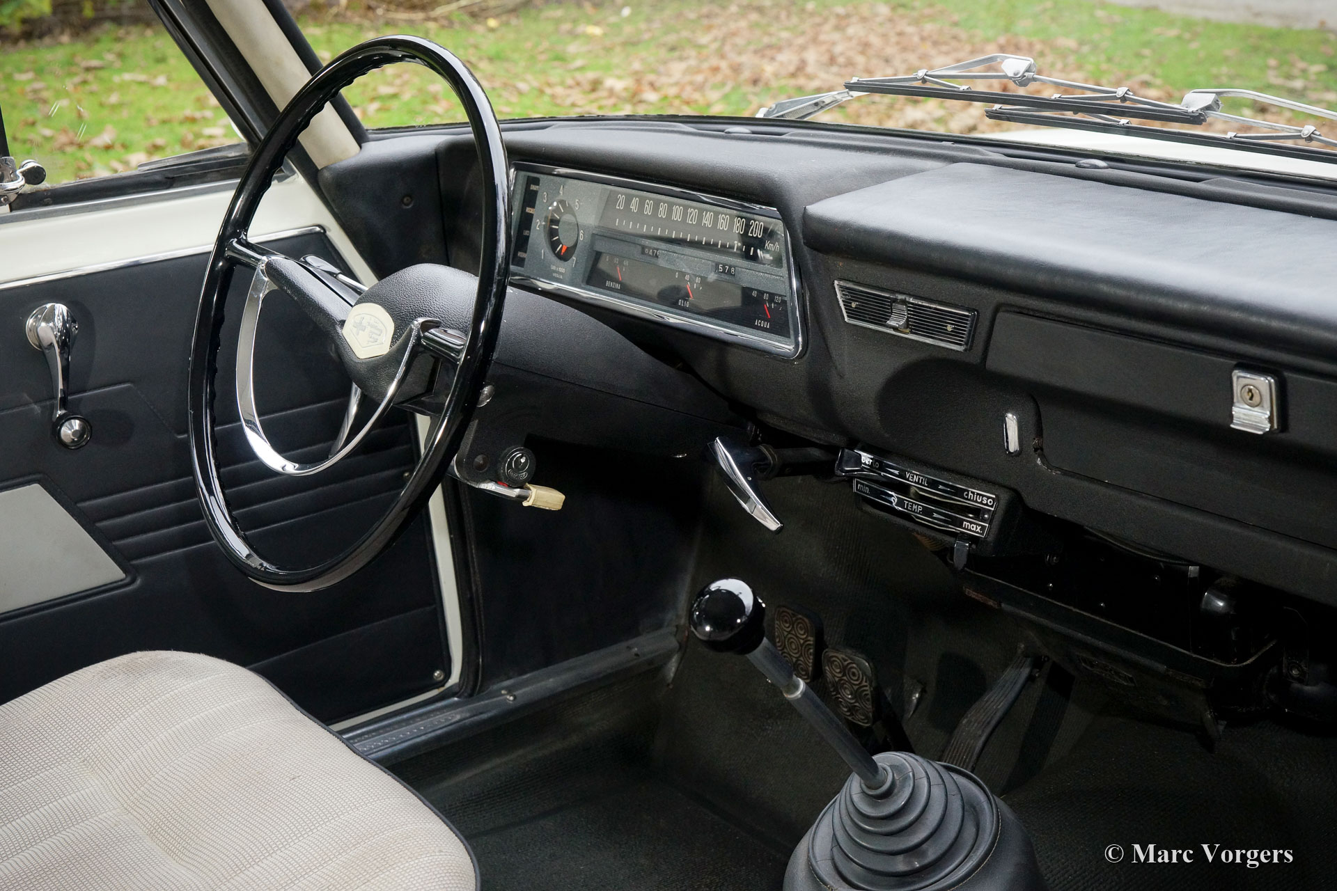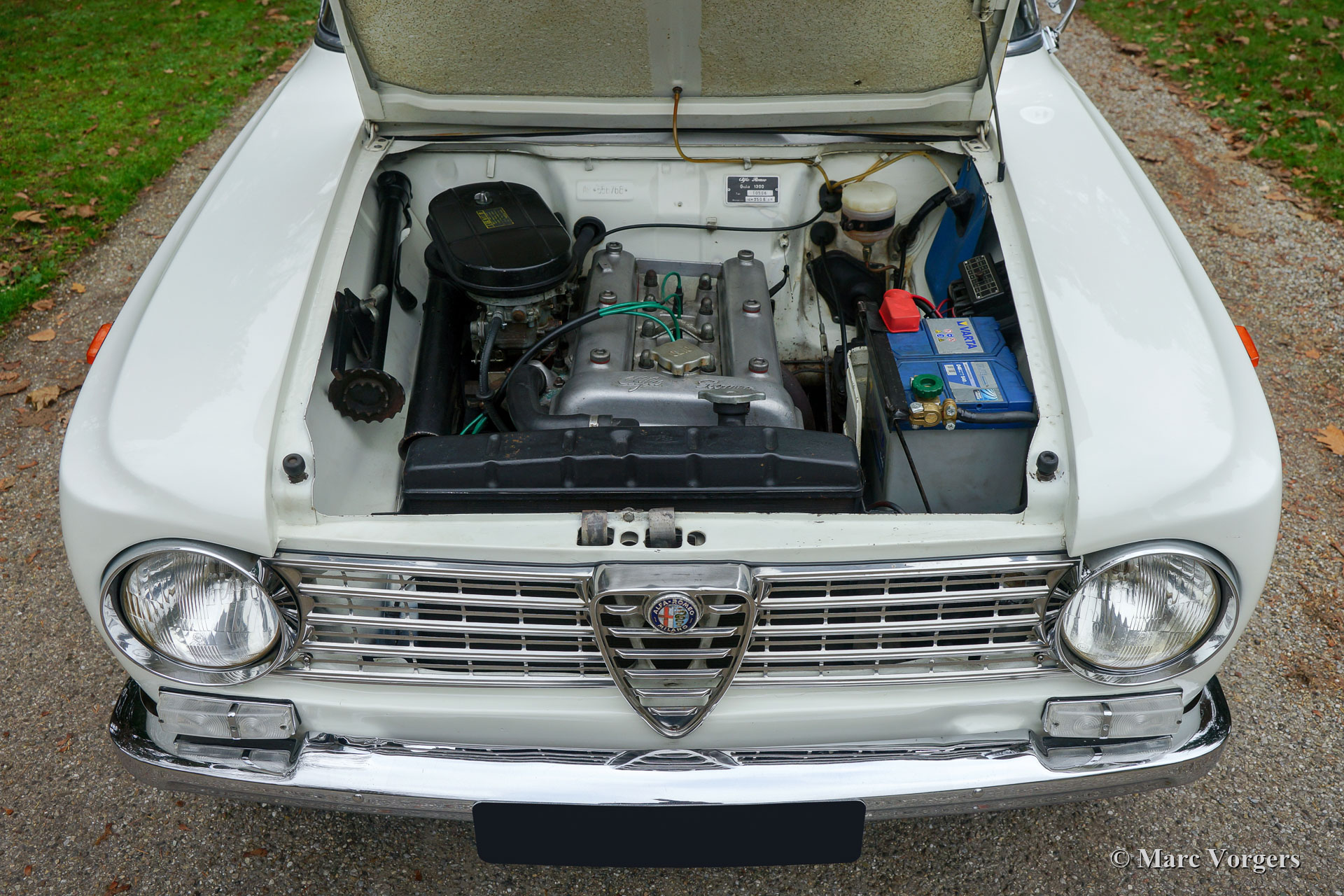 Alfa Romeo Giulia 1300, année 1964. Couleur Bianco Spino (Blanc) combinée à un intérieur noir et des faces d’assise en tissu gris clair. Cette magnifique Alfa Romeo Giulia est un exemple original très original en très bon état ! Au cours des dernières années, le moteur et les carburateurs furent révisés et les amortisseurs de choc furent remplacés. La voiture fut repeinte, en couleur original, il y a quelques années. L'intérieur est entièrement d'origine et en très bon. Les faces des sièges en tissu montrent des signes de vieillesse. Cette belle Alfa Romeo Giulia 1300 montre tous les détails originaux et la voiture roule et pilote parfaitement !