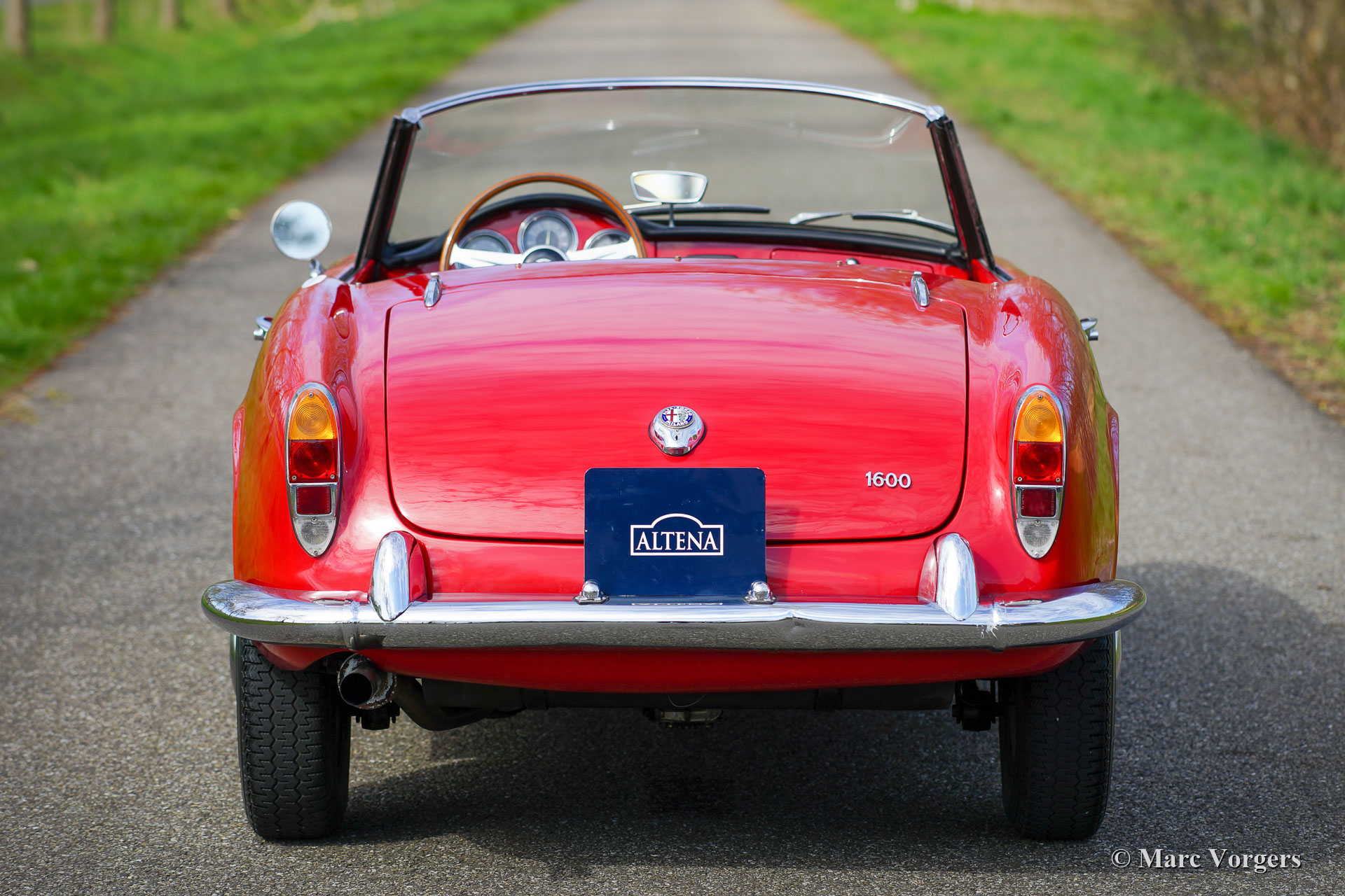 Alfa Romeo Giulia 1600 Spider, année 1963. Couleur rouge combinée avec un intérieur en cuir noir et un tapis rouge. Capote en mohair noir. Cette magnifique Alfa Romeo 1600 Spider conçue par PininFarina fut vendue neuve en Floride et a passé successivement quelques décennies dans le Colorado. En 2000, la voiture fut exportée vers l'Europe. Un ancien propriétaire était Patrick Ayoub qui était un concepteur pour BMW et Volkswagen. Cette magnifique Giulia Spider fut largement restaurée aux États-Unis dans le passé. L'Alfa est en bon état et montre tous les détails d'origine. La carrosserie et la peinture montrent quelques signes d'usure et d'âge, le dessous est de couleur carrosserie. L'intérieur est en très bon état, tout comme le compartiment moteur propre et bien détaillé. La voiture est livrée avec un bon fichier historique et des factures de service. Cette très belle Alfa Romeo Giulia Spider est le modèle recherché avec le puissant moteur de 1600 cm3. Le corps et suspension compact et léger combiné avec le moteur à double came de 1600 cm3 et à la boîte de vitesses à 5 rapports en font un ensemble sportif pour le conducteur inspiré !