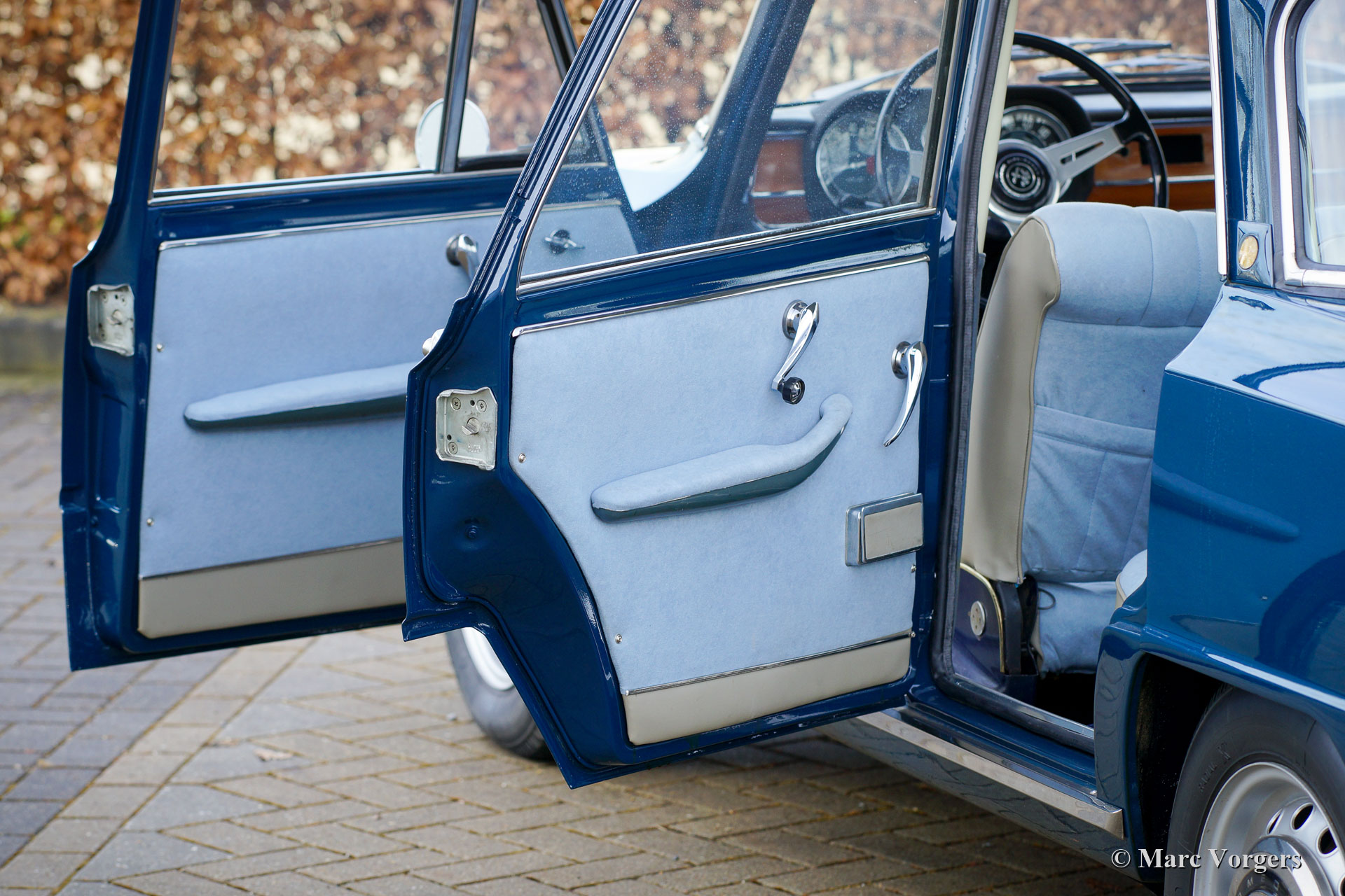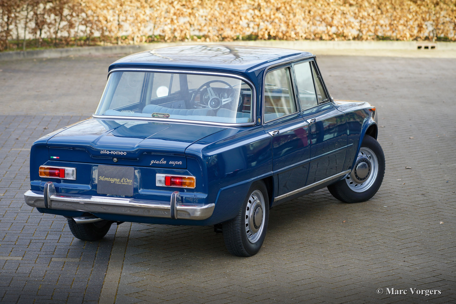 Alfa Romeo Giulia 1600 Super «Bollino Oro», année 1966. Couleur bleu (Bluetta AR327). Intérieur avec sièges en tissu bleu clair / vinyle gris clair et panneaux de porte combinées avec un tapis bleu foncé. Cette magnifique Alfa Romeo Giulia Super «Bollino Oro» fut vendue neuve en Italie, le premier propriétaire était M. Giorgio Villefranca. La Giulia 1600 Super avec le pack de finition «Bollino Oro» est le modèle de berline Giulia le plus recherché. La voiture présente une garniture de calandre en acier inoxydable, une garniture de seuil en acier inoxydable et le badge «Bollino Oro» sur le «montant C». Cette magnifique Giulia 1600 Super est dans un état jamais restauré, très original et excellent, la voiture montre tous les détails d'origine. Seul un rembourrage manque dans le coffre. L'intérieur d'origine montre des traces d'utilisation minimes, ce qui est magnifique après 55 ans ! Les revêtements de siège en tissu bleu pâle et les portes des voitures ont presque l'air neuf ! La carrosserie montre un ajustement du panneau fantastique et la peinture est excellente. Le dessous et le compartiment moteur sont propres et magnifiquement détaillés. L'automobile fut importée d'Italie récemment, la voiture a une immatriculation italienne. Le compteur n'indique que 74,482 kilomètres, ce qui est considéré comme original compte tenu de la superbe originalité de la voiture et des très légères traces d'utilisation à l'intérieur. Récemment, la voiture fut reconstruite mécaniquement détaillée, le moteur fut révisé (doit encore être rodé), Et la suspension fut entièrement reconstruite avec de nouveaux amortisseurs, ressorts et autres pièces pour améliorer la conduite et la tenue de route. De plus, le réservoir de carburant fut renouvelé. Il s’agit d’une Alfa Romeo Giulia 1600 Super «Bollino Oro» très désirable en excellent état, une voiture pour les vrais amateurs et / ou collectionneurs Alfa Romeo.