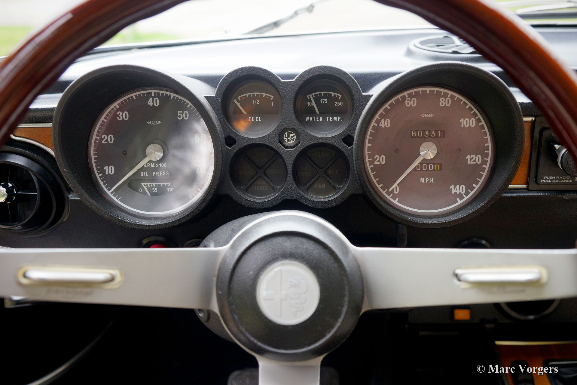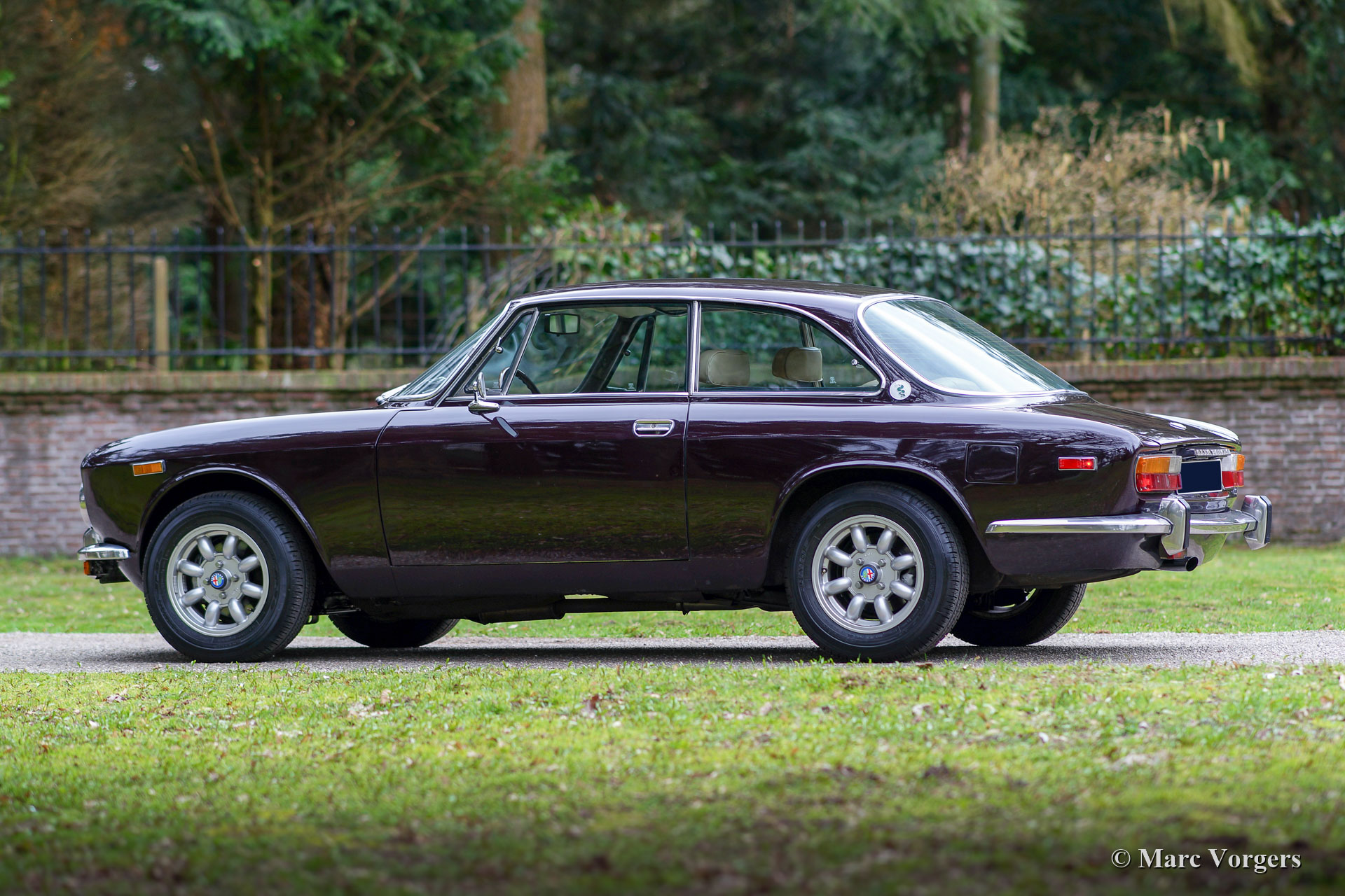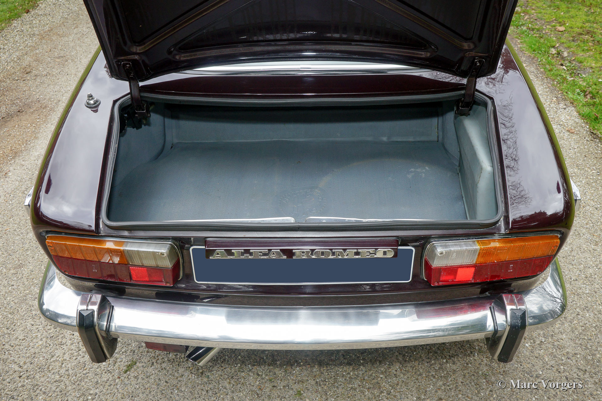 Alfa Romeo Giulia 2000 GTV, année 1975. Couleur Faggio (rouge foncé / marron) associée à un intérieur en similicuir beige et à un tapis noir. Cette superbe Alfa Romeo ‘Bertone’ fut vendue neuve à un militaire allemand à Hambourg. Le modèle américain Giulia GTV 2000 n’a jamais été exporté aux États-Unis et la voiture était équipée de deux carburateurs doubles Dell’Orto au lieu de l’injection d’essence Spica. Cette merveilleuse Alfa Romeo fut largement restauré. La voiture est en excellent état et la voiture roule parfaitement ! Cette Giulia GTV montre de beaux détails originaux et la voiture est dotée de jantes en alliage de style « GB » Minilite. Les voitures Alfa Romeo Giulia des années 1960 et 1970 comprenaient toutes les caractéristiques de la vraie voiture de sport : un moteur en aluminium avec double arbre à cames en tête (DOHC), des chambres de combustion hémisphériques, des soupapes d'échappement à refroidissement par le sodium, une boîte manuelle à cinq vitesses et des freins à disque tout autour. La 2000 GTV était également équipée d’un différentiel à glissement limité pour permettre à la puissance de 150 SAE de rouler correctement. C'est une Alfa Romeo Giulia 2000 GTV très désirable !
