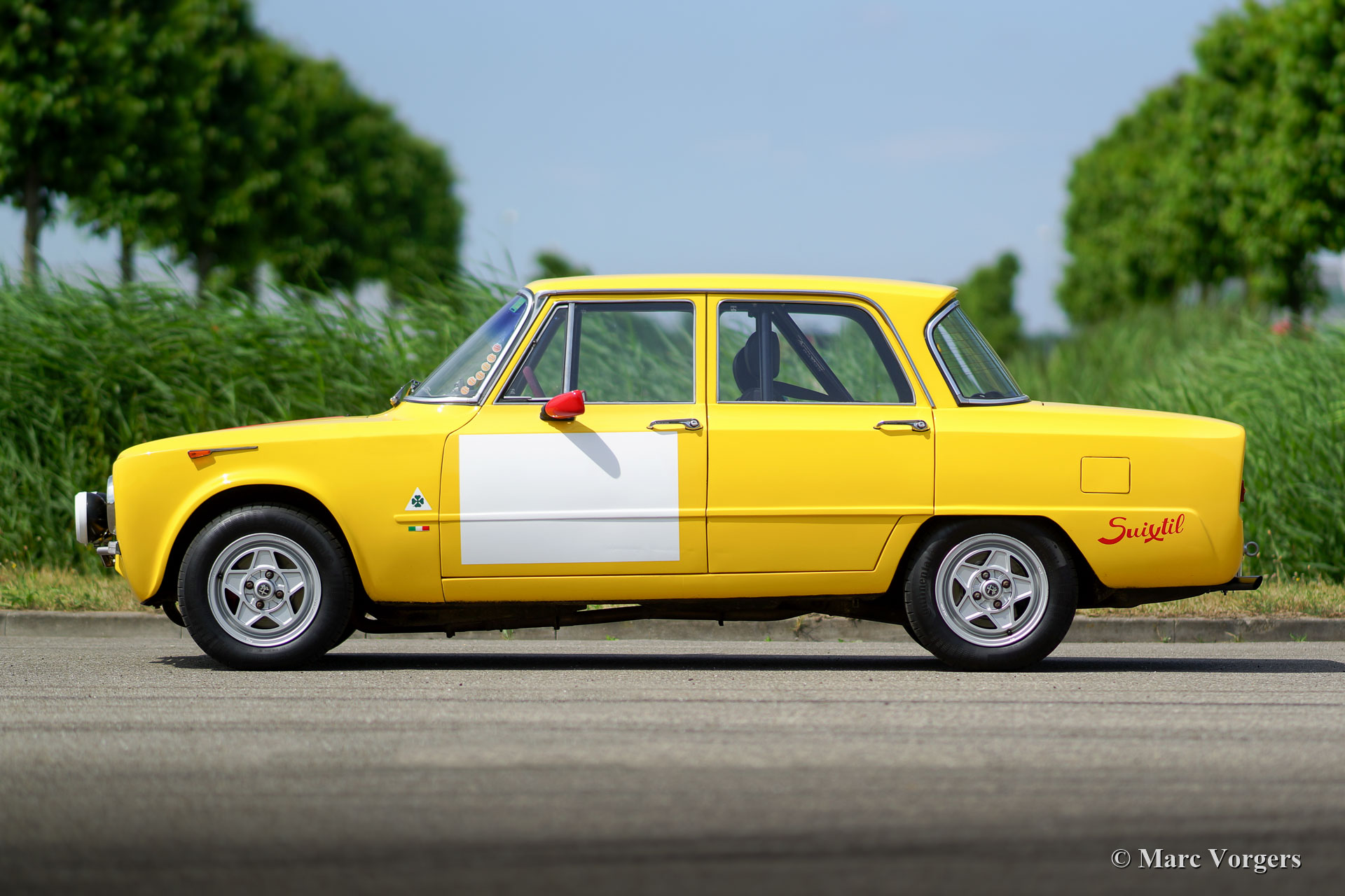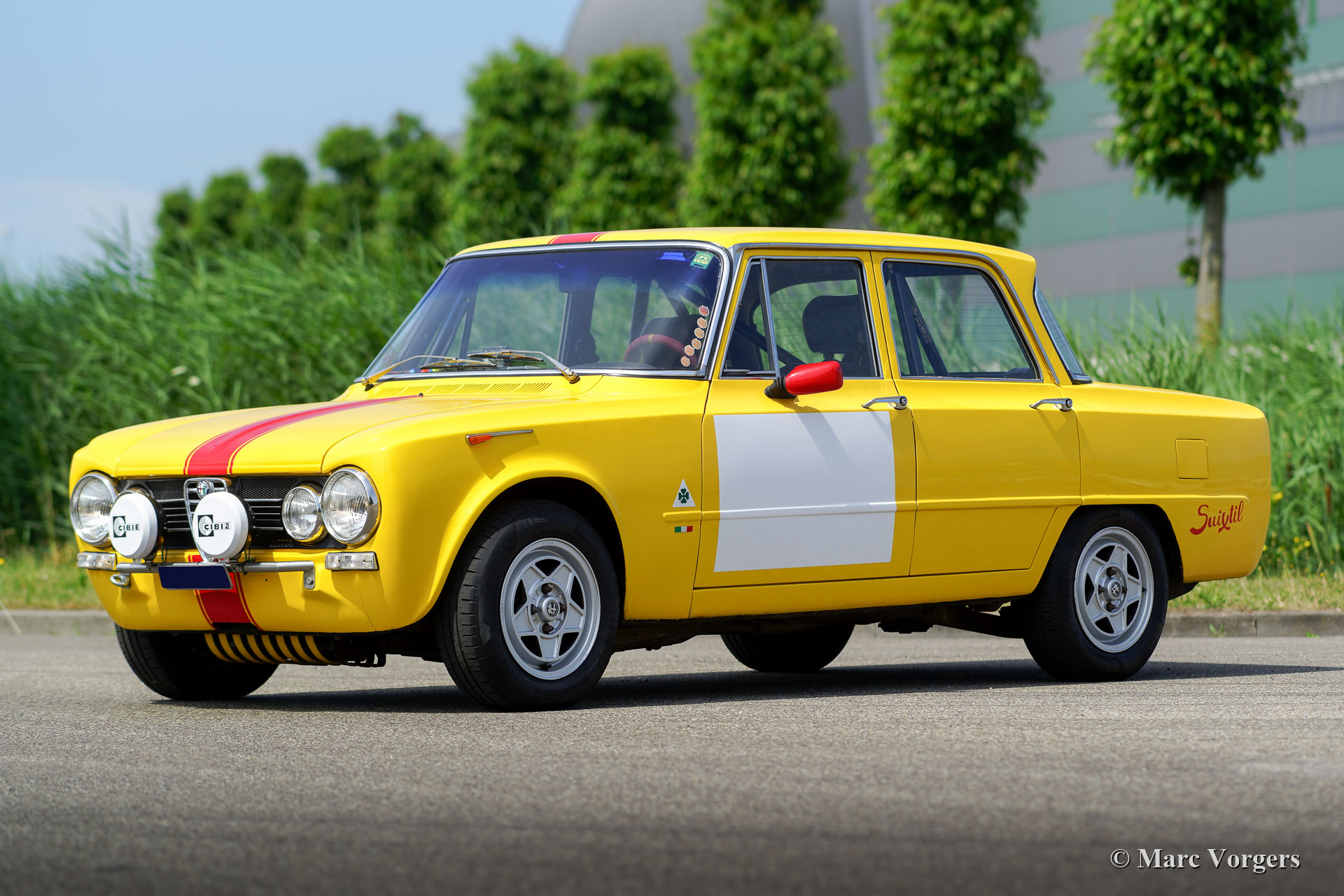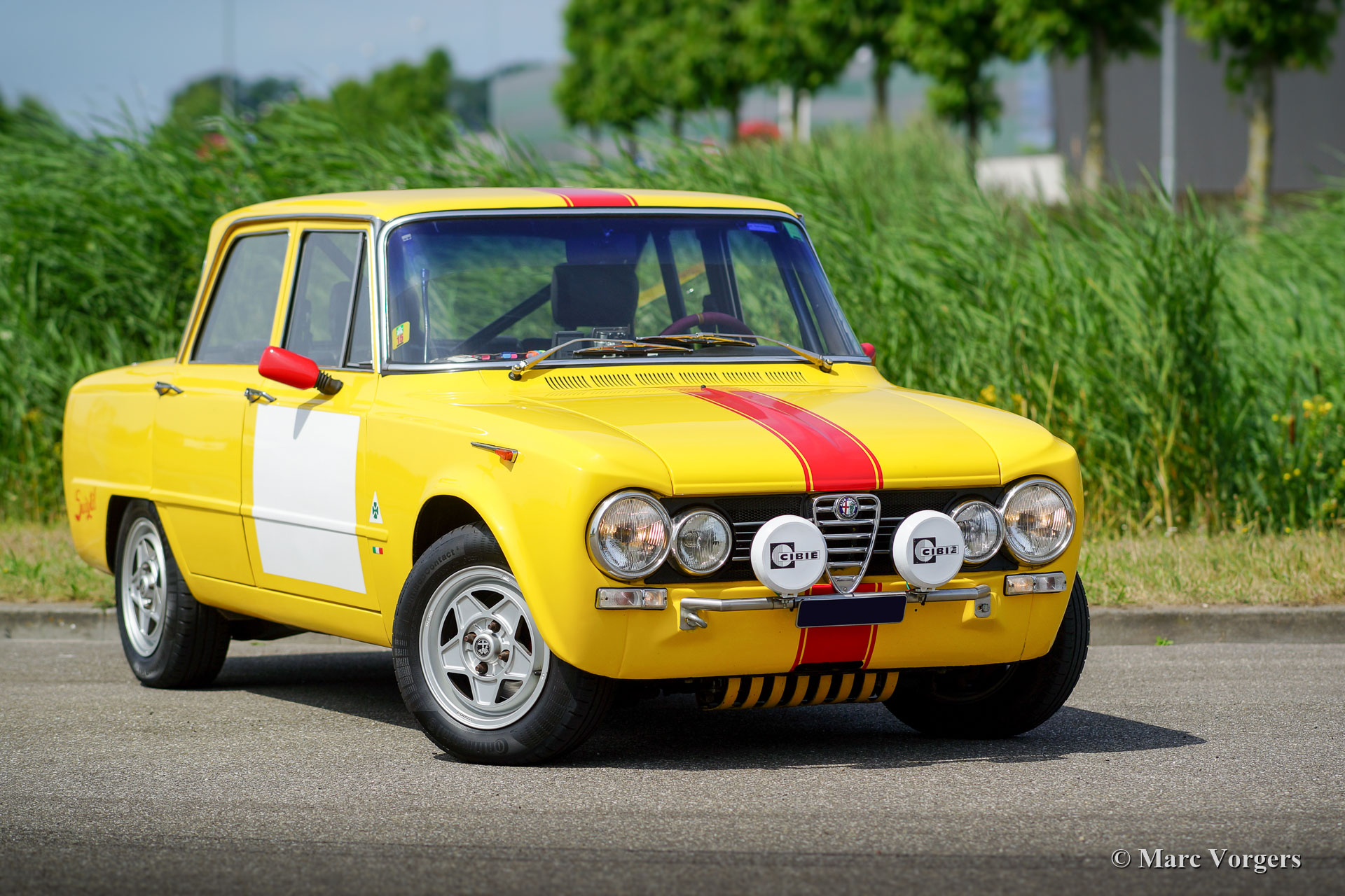 Alfa Romeo Giulia Super Rallye, année 1971. Couleur jaune (Giallo Ginestra 258) avec rayures rouges sur la longueur de la carrosserie. Intérieur de rallye en cuir bleu foncé (sièges spéciaux avec support latéral superbe et repose-tête), tapis bleu foncé et tapis de sol protecteur en caoutchouc. Cette fantastique voiture de rassemblement Alfa Romeo fut créée et préparée de façon professionnelle et parfaite. L'automobile est en superbe condition et la voiture conduit!