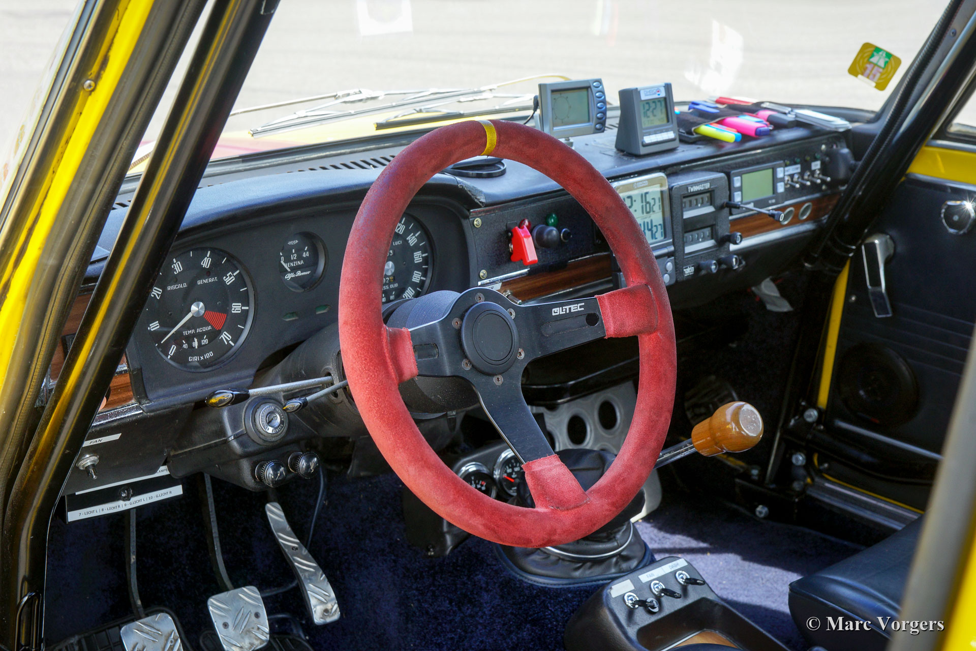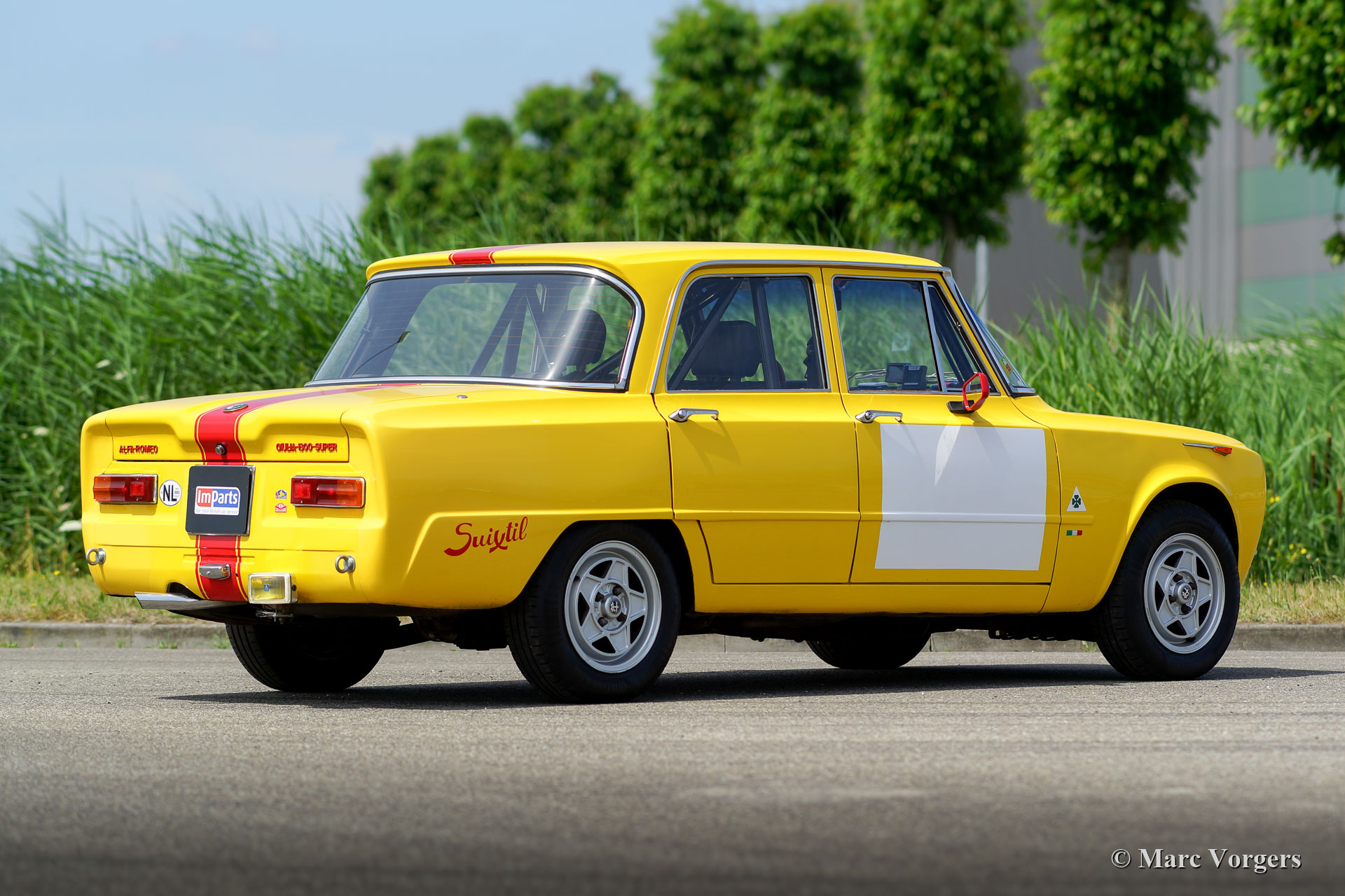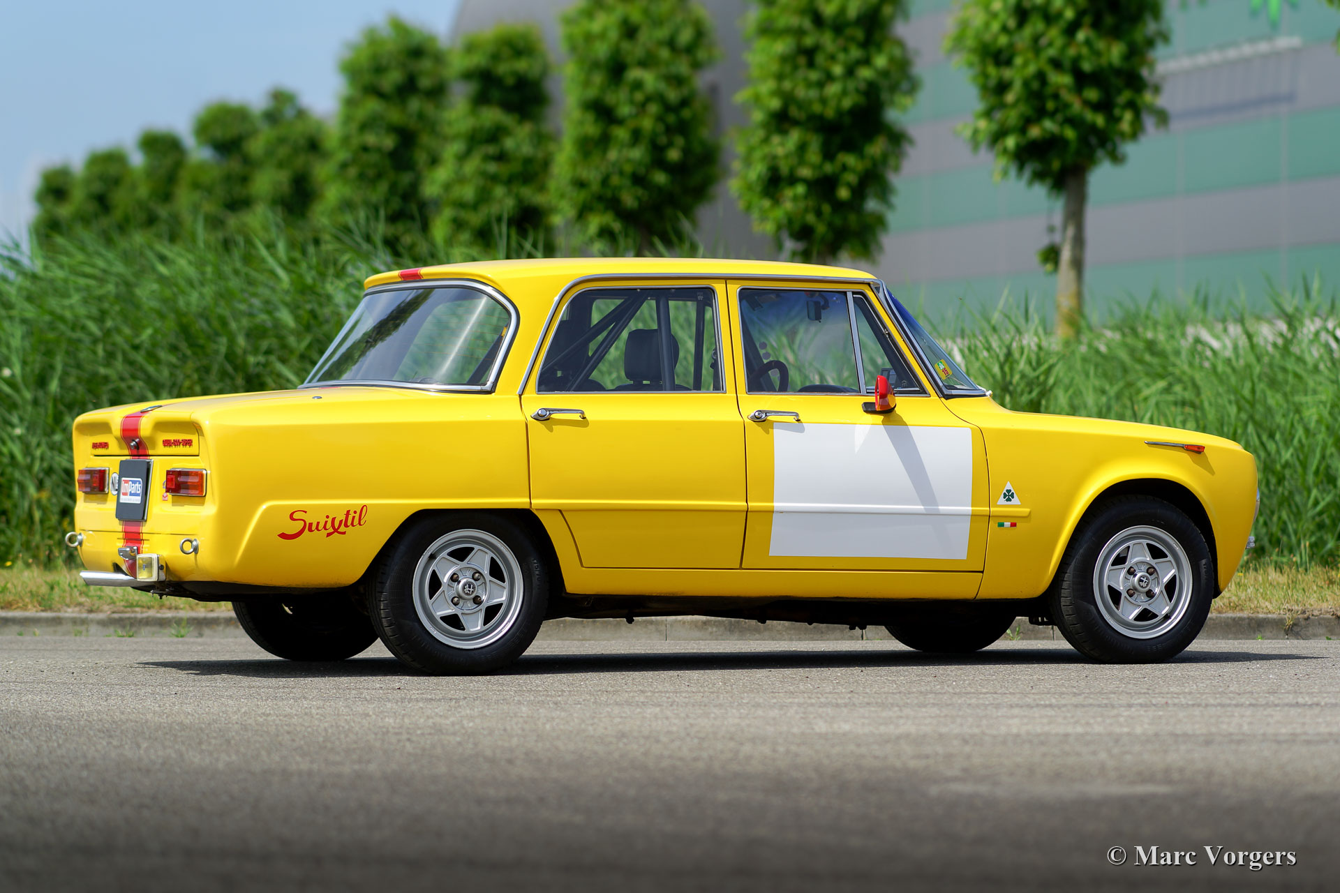 Alfa Romeo Giulia Super Rallye, année 1971. Couleur jaune (Giallo Ginestra 258) avec rayures rouges sur la longueur de la carrosserie. Intérieur de rallye en cuir bleu foncé (sièges spéciaux avec support latéral superbe et repose-tête), tapis bleu foncé et tapis de sol protecteur en caoutchouc. Cette fantastique voiture de rassemblement Alfa Romeo fut créée et préparée de façon professionnelle et parfaite. L'automobile est en superbe condition et la voiture conduit!