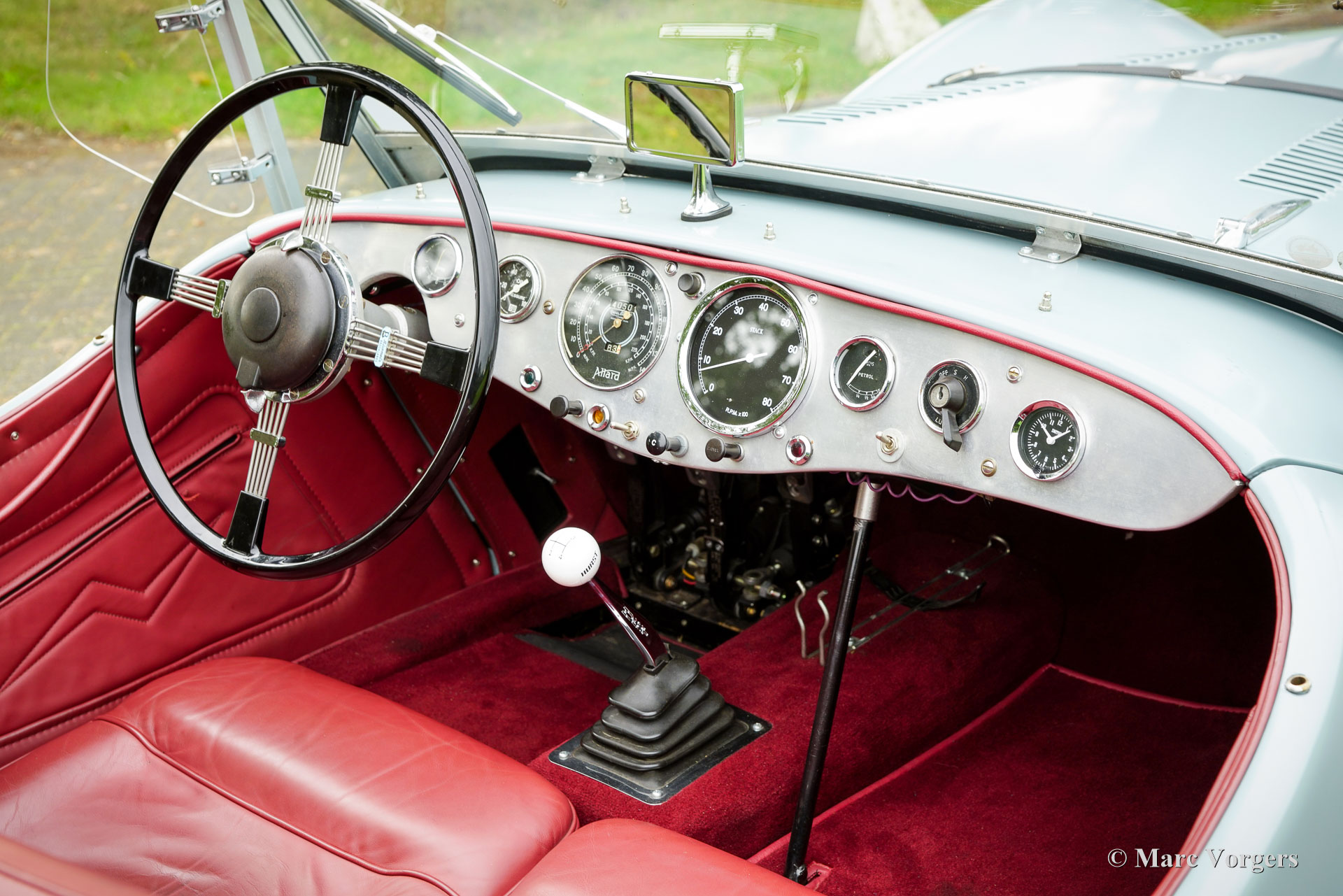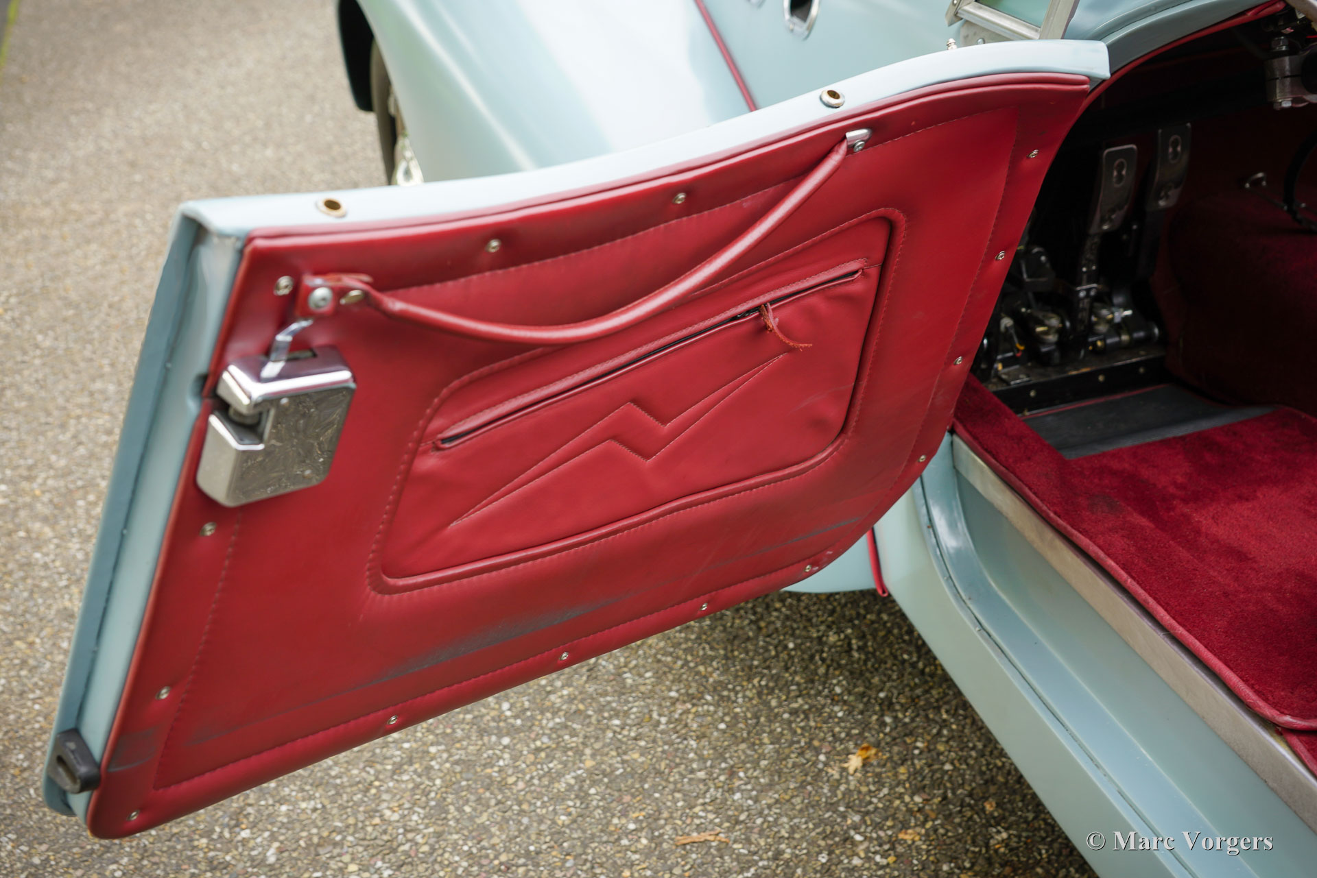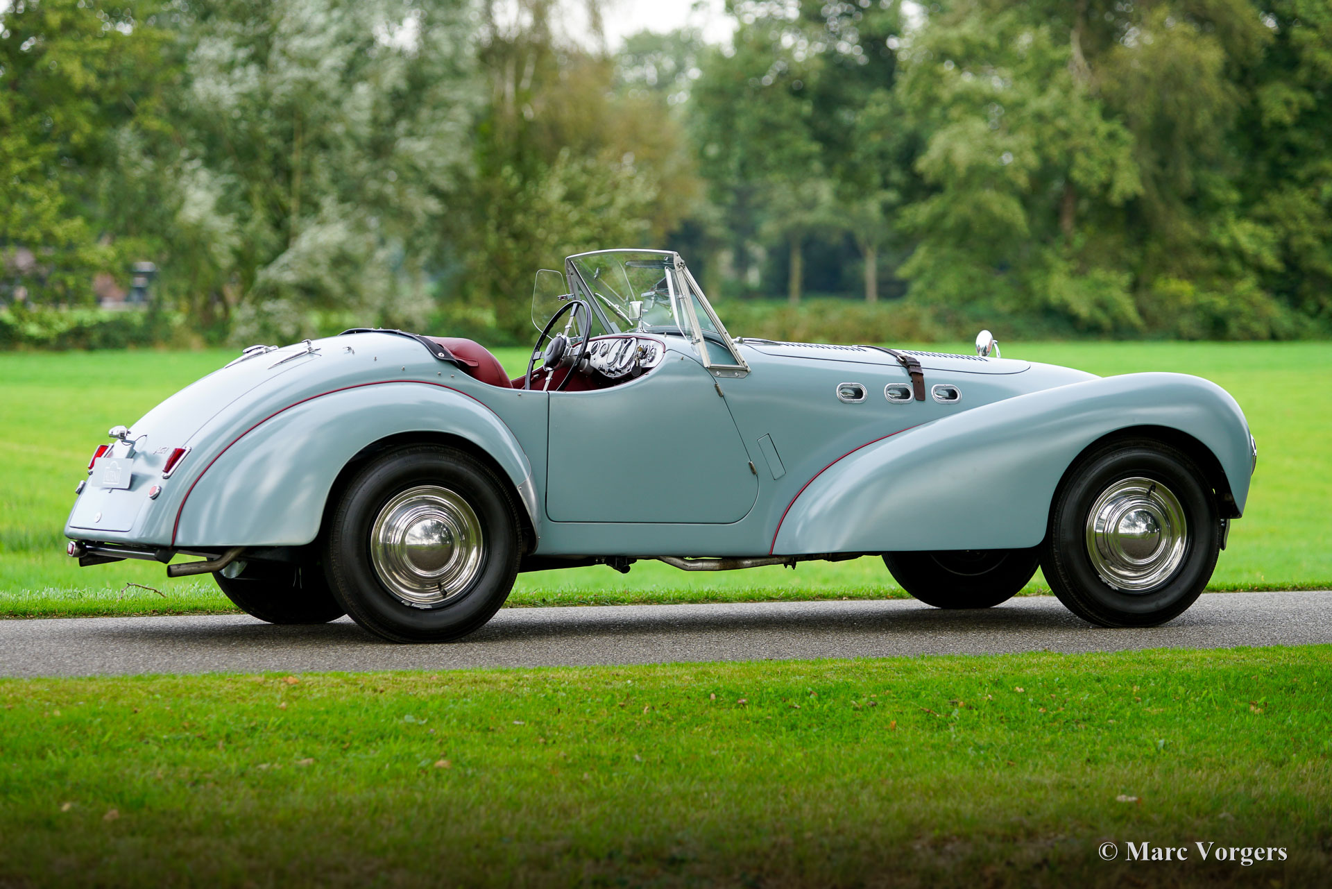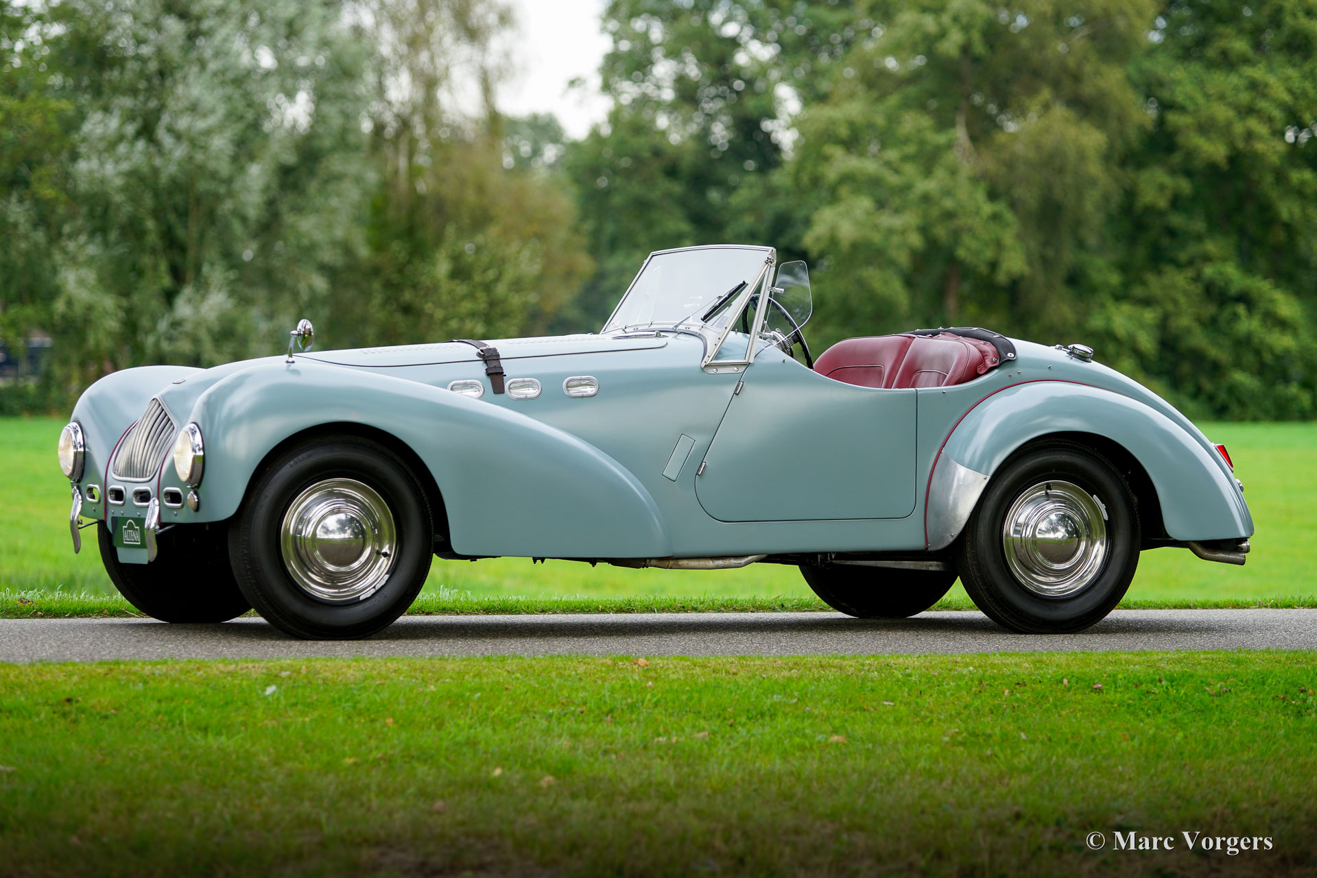 Allard K2 Roadster, année 1952. Numéro de châssis K1986. Couleur bleu pâle mat associée à un intérieur en cuir rouge. Ce rare Allard K2 Roadster fut vendu neuf aux USA où il a passé 37 ans avec le premier propriétaire. En 2010, la voiture fut importée en Europe et entièrement restaurée en Belgique. La carrosserie a reçu une nouvelle peinture et les composants mécaniques furent révisés. Depuis 2010, la voiture n'a connu qu'un seul propriétaire ; ce roadster Allard K2 est dans un excellent état et la voiture roule de manière impressionnante. Les voitures Allard furent construites de 1945 à 1958 à Clapham, au sud-ouest de Londres. Carroll Shelby, de l'AC Cobra, et l'ingénieur en chef de la Chevrolet Corvette, Zora Arkus-Duntov, ont tous deux conduits des Allard au début des années 1950, ce qui nous dit que les voitures Allard étaient et sont quelque chose de spécial. Les voitures étaient basées sur un châssis Ford Pilot modifié avec un essieu oscillant Ballamy à l'avant. Les voitures étaient vendues avec des moteurs V8 américains dérivés de Ford, Mercury, Chrysler et Cadillac. Les voitures étaient carrossées en aluminium par l'ami d'Allard, Godfrey Imhof. Cet Allard K2 Roadster est équipé d'un moteur Cadillac V8. La voiture se dirige et se comporte très bien et le moteur tire, tourne et sonne superbement ! Seuls 119 exemplaires du K2 Roadster furent construits de 1950 à 1952, seules 25 voitures existent encore. Cette automobile très spéciale est livrée avec un dossier historique d'origine ! Un tas de documentation, qui comprend la correspondance avec le club Allard et le manuel d'instruction original ! Une voiture très spéciale et rare qui est prête à être appréciée par le nouveau propriétaire !