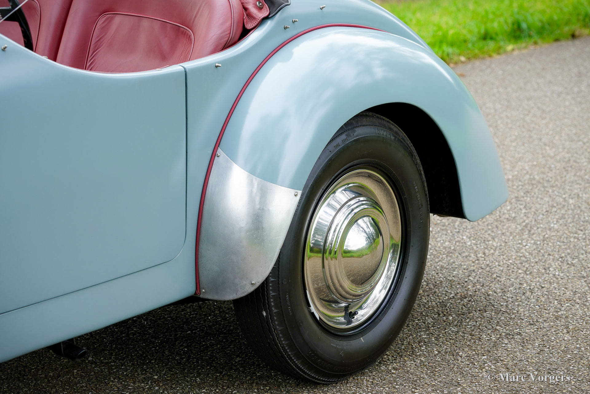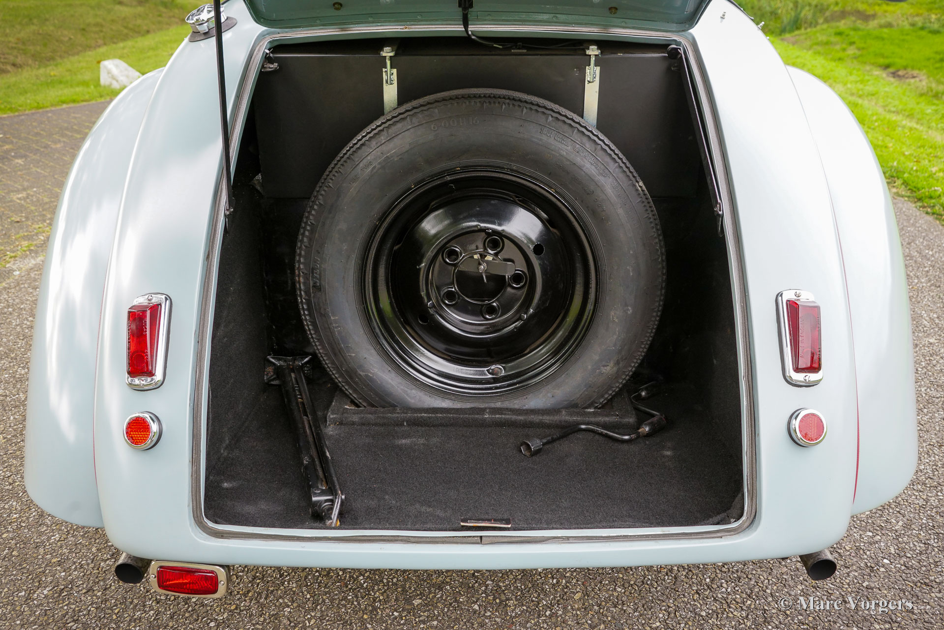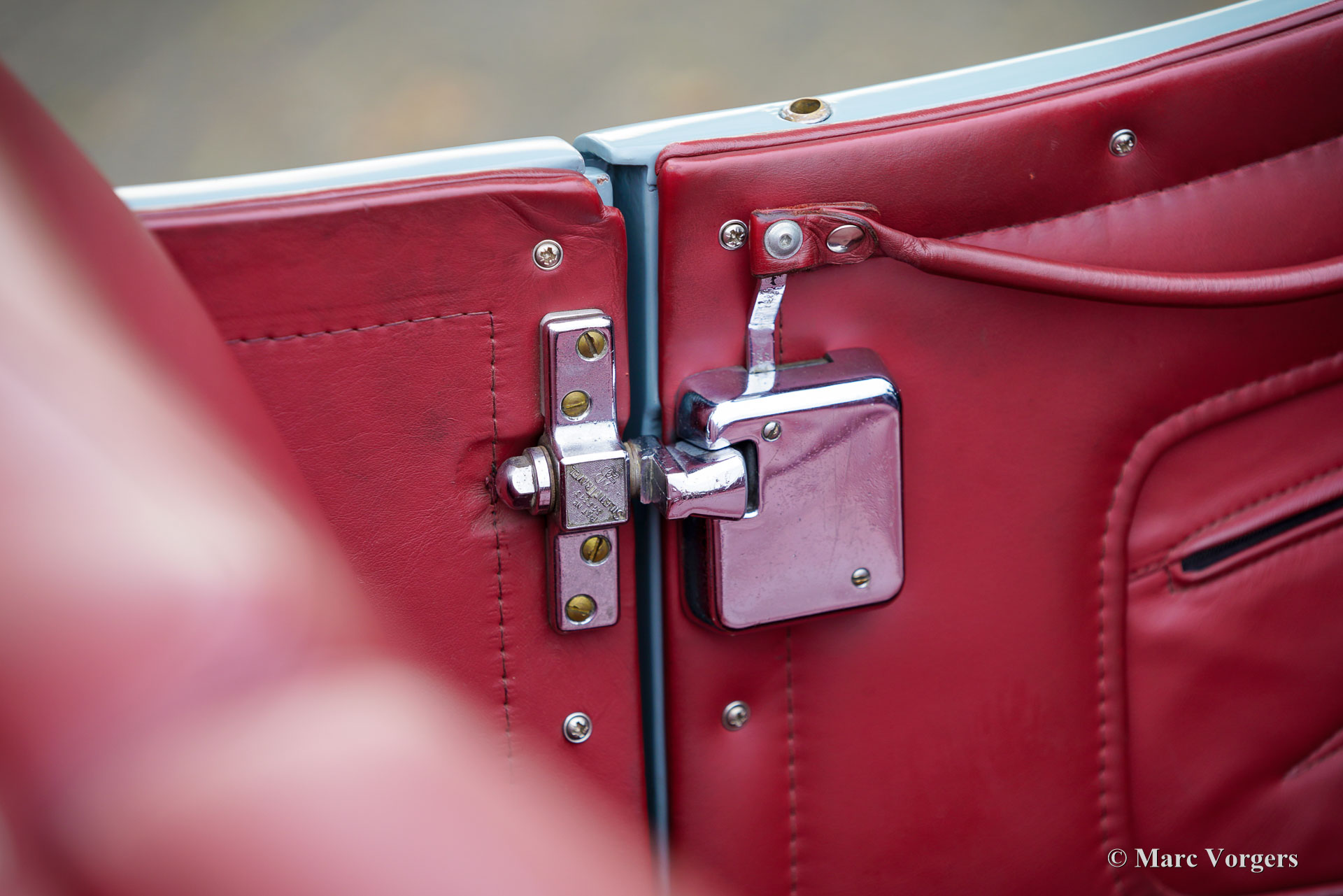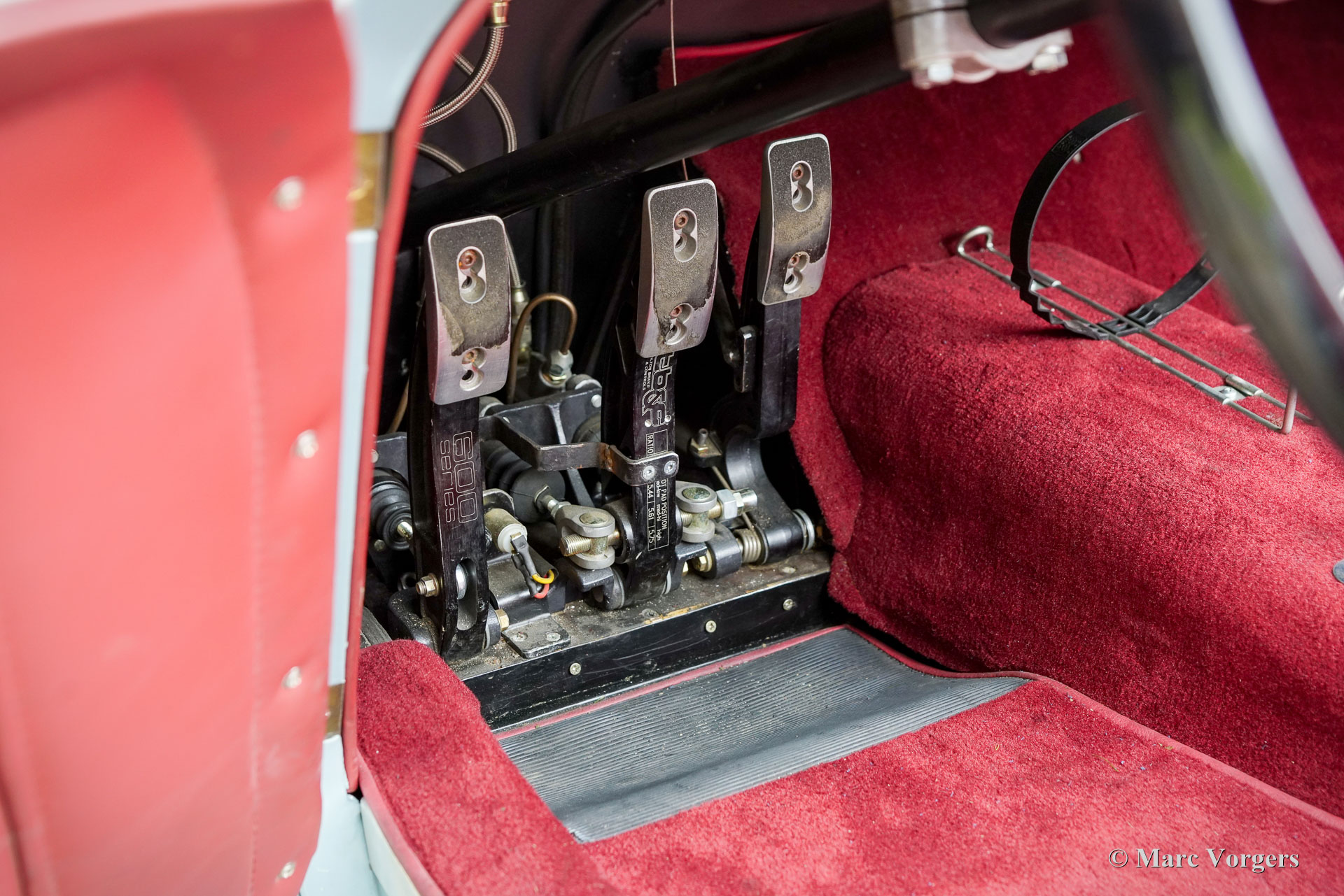 Allard K2 Roadster, année 1952. Numéro de châssis K1986. Couleur bleu pâle mat associée à un intérieur en cuir rouge. Ce rare Allard K2 Roadster fut vendu neuf aux USA où il a passé 37 ans avec le premier propriétaire. En 2010, la voiture fut importée en Europe et entièrement restaurée en Belgique. La carrosserie a reçu une nouvelle peinture et les composants mécaniques furent révisés. Depuis 2010, la voiture n'a connu qu'un seul propriétaire ; ce roadster Allard K2 est dans un excellent état et la voiture roule de manière impressionnante. Les voitures Allard furent construites de 1945 à 1958 à Clapham, au sud-ouest de Londres. Carroll Shelby, de l'AC Cobra, et l'ingénieur en chef de la Chevrolet Corvette, Zora Arkus-Duntov, ont tous deux conduits des Allard au début des années 1950, ce qui nous dit que les voitures Allard étaient et sont quelque chose de spécial. Les voitures étaient basées sur un châssis Ford Pilot modifié avec un essieu oscillant Ballamy à l'avant. Les voitures étaient vendues avec des moteurs V8 américains dérivés de Ford, Mercury, Chrysler et Cadillac. Les voitures étaient carrossées en aluminium par l'ami d'Allard, Godfrey Imhof. Cet Allard K2 Roadster est équipé d'un moteur Cadillac V8. La voiture se dirige et se comporte très bien et le moteur tire, tourne et sonne superbement ! Seuls 119 exemplaires du K2 Roadster furent construits de 1950 à 1952, seules 25 voitures existent encore. Cette automobile très spéciale est livrée avec un dossier historique d'origine ! Un tas de documentation, qui comprend la correspondance avec le club Allard et le manuel d'instruction original ! Une voiture très spéciale et rare qui est prête à être appréciée par le nouveau propriétaire !