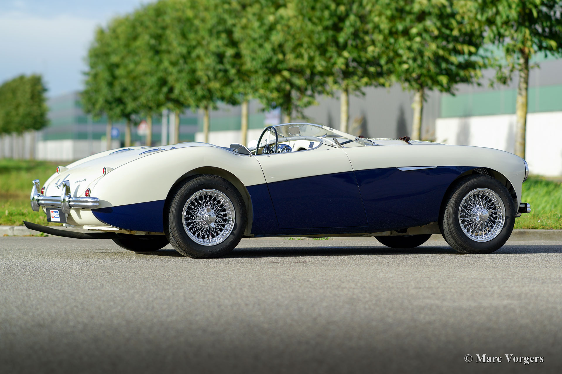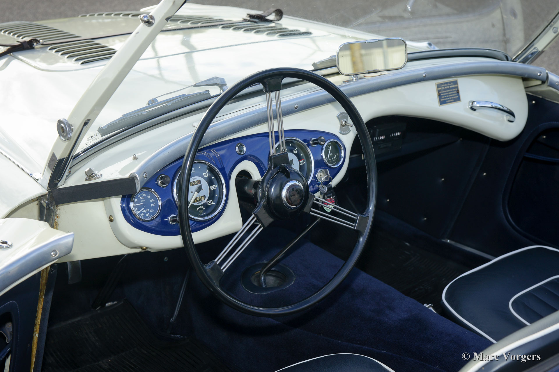 Austin Healey 100-Four (BN1) ‘Le Mans’, année 1955. Couleur « Old English white » sur bleu foncé, associée à un intérieur bleu foncé. Capote, écrans latéraux et couvercle de tonneau en bleu foncé. Ce magnifique Austin Healey 100 ‘Le Mans’ fut importé des États-Unis en 1997. La voiture fut restaurée et révisée détaillée dans le passé. Au cours de la restauration, les améliorations / modifications suivantes furent apportées : Le moteur fut reconstruit selon les spécifications « Le Mans » avec des carburateurs S.U. plus gros, un arbre à cames de type « fast road » et un couvercle de soupapes en aluminium. Une « cold air box » fut installée, des louvres furent ajoutés au capot ainsi qu’un bracelet en cuir. En outre, un système d'échappement spécial fut monté et la voiture fut dotée de freins à disque sur les roues avant. Le système de freinage comporte désormais deux circuits (avant / arrière). La boîte de vitesses à trois vitesses BN1 et l'essieu arrière furent remplacés par une boîte de vitesses à quatre vitesses BN2 et un essieu arrière BN2. Un rapport photo complet de la restauration et la révision est présent, de même qu'un certificat du patrimoine « Heritage » et un livre de photos de l'histoire néerlandaise de la voiture. Il s'agit d'une magnifique voiture de conducteur et d'un Austin Healey hautement désirable !