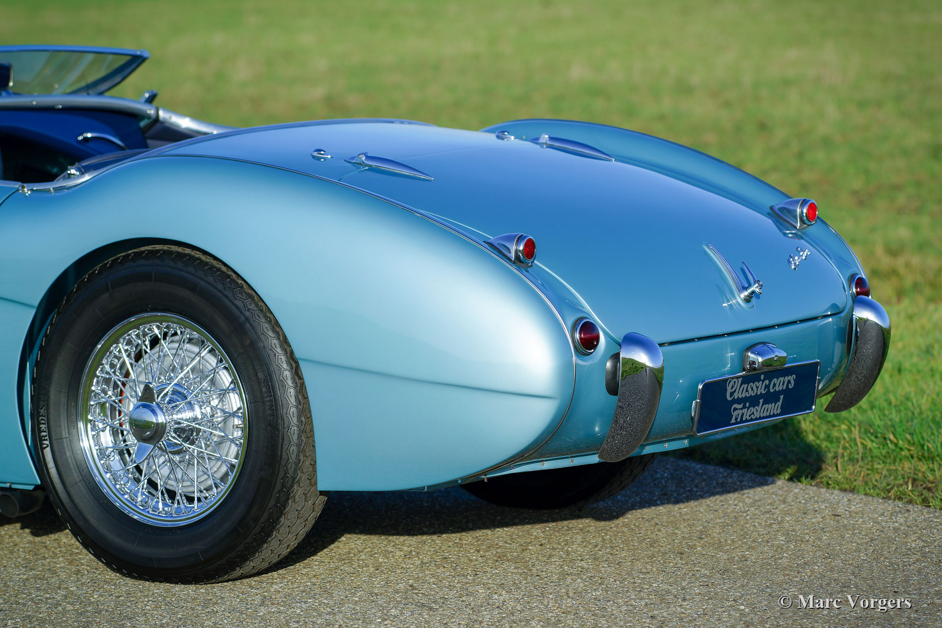 Austin Healey 100/M BN2 ‘Le Mans’, année 1956. « Matching mumbers and colours », un certificat Héritage confirmant est présent. La Healey 100 ‘Le Mans’ présenté ici est un modèle rare construit / reconverti en periode, la voiture est inscrite au registre Le Mans USA ! Couleur « Ice Blue » métallisé associée à un intérieur en cuir bleu et à un tapis bleu foncé. Capot et couvercle-tonneau bleu, écrans latéraux encadré bleu. Ce fabuleux « Big Healey » fut restauré détaillée par un spécialiste hollandais d’Austin Healey entre 2015 et 2018. Un dossier de restauration complet avec rapport photo et factures est présent. Cette Austin Healey 100/M « Le Mans » est en parfait état ; concours ! Bien entendu, le moteur et la boîte de vitesses furent révisés, de même que les indicateurs du tableau de bord. Le corps fut restauré à partir de métal nu, le corps présente un ajustement parfait des panneaux et des lignes nettes. Toutes les pièces chromées furent rechromées à la perfection. Le kit spécial « Le Mans » comprend une culasse spéciale, un arbre à cames « sport » haut de gamme, S.U. Carburateurs H6 avec une boîte à air froid, des louvres dans le capot et une sangle de maintien en cuir par-dessus le capot. Le modèle BN2 est doté d’un overdrive en 3ème et 4ème vitesse. La voiture est équipée de freins à disque aux roues avant, d’un échappement latéral, d’un nouveau faisceau de câblage, couvercle de soupapes en aluminium, de roues à fil chromées et de phares antibrouillard Lucas SFT576 supplémentaires à l’avant. La voiture est livrée avec le très rare manuel (service) original, le manuel du propriétaire et le jeu d’outils original !