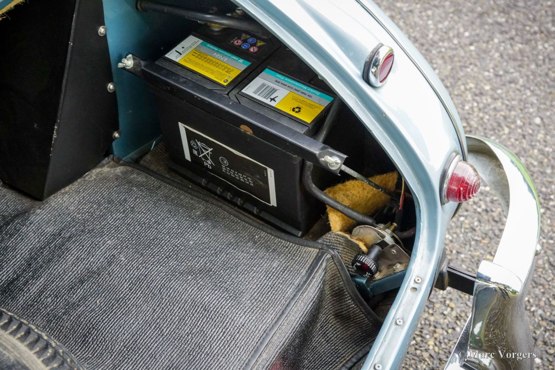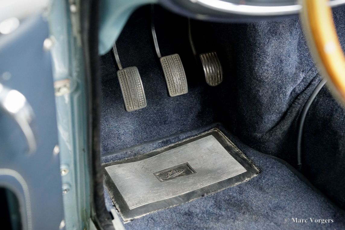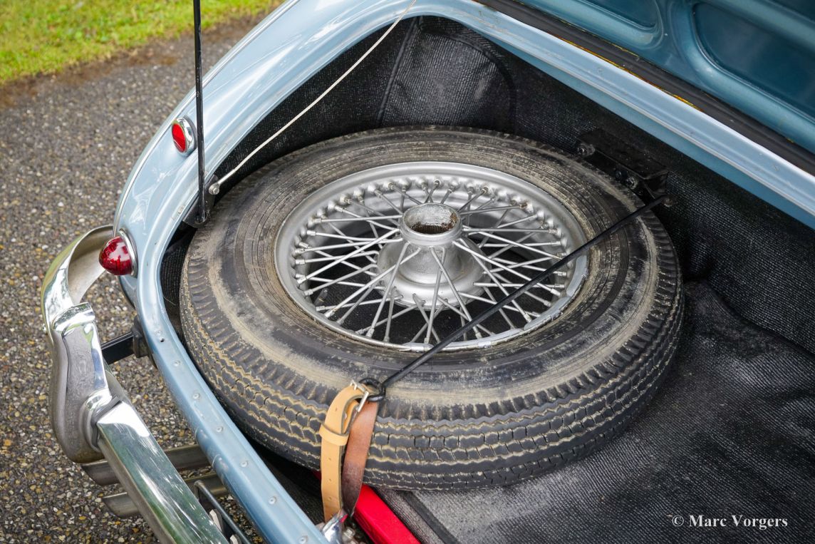 Austin Healey 3000 MK II, année 1961. Numéro de châssis HBT7L15775, numéro de moteur 29E/RU/H1991. Il s'agit d'un modèle rare d'Austin Healey 3000 MK II à 3 carburateurs, produit à seulement 5 096 exemplaires. La carrosserie est bleu glacier métallisé sur fond blanc crème (Old English white), avec un intérieur bleu comprenant des sièges en cuir bleu bordés de passepoils blancs, un tableau de bord et des garnitures de portes en similicuir bleu, ainsi qu'une moquette bleue. La capote et le couvre-tonneau sont en mohair bleu, et deux pare-brises latéraux en aluminium avec vitres en plexiglas complètent l'équipement météo. Cette magnifique « Big Healey » fut vendue neuve aux États-Unis et expédiée de Louisiane aux Pays-Bas en 2005. Entre 2005 et 2007, elle a bénéficié d'une restauration complète et minutieuse. Un carnet de restauration et un reportage photo sont également disponibles. La restauration fut réalisée par trois spécialistes renommés : le moteur fut révisé par le cabinet van Giersbergen, la carrosserie par le cabinet van Emst. Les autres composants mécaniques furent révisés et restaurés par Altena Classic Service. Nous avons accompagné le propriétaire dans la finalisation de cette magnifique Austin Healey. Après vingt ans de plaisir, il nous a demandé de lui trouver un nouveau foyer. Elle présente de légères traces d'utilisation et est en très bon état ! Le moteur sonne et tourne à merveille, et la voiture roule parfaitement. La Healey est équipée de jantes à rayons chromées chaussées de pneus Vredestein Sprint Classic, d'écrous de roue chromés à cliquet, d'un porte-bagages chromé, de deux rétroviseurs chromés montés sur les portes, d'un volant MotoLita avec jante en bois, de freins à disque à l'avant et d'un échappement en acier inoxydable. C'est une magnifique « Big Healey » en très bon état, restaurée dans les couleurs les plus populaires. Une voiture de collection fantastique qui vous promet de grands moments de plaisir à ciel ouvert !