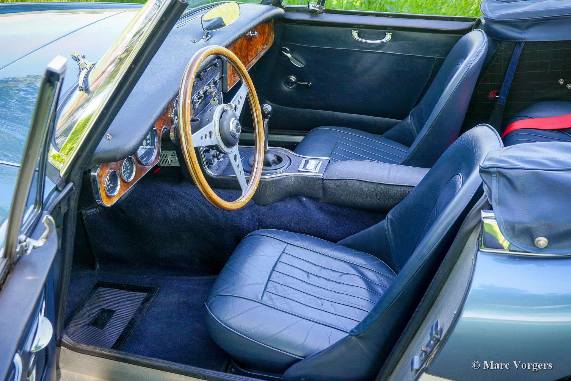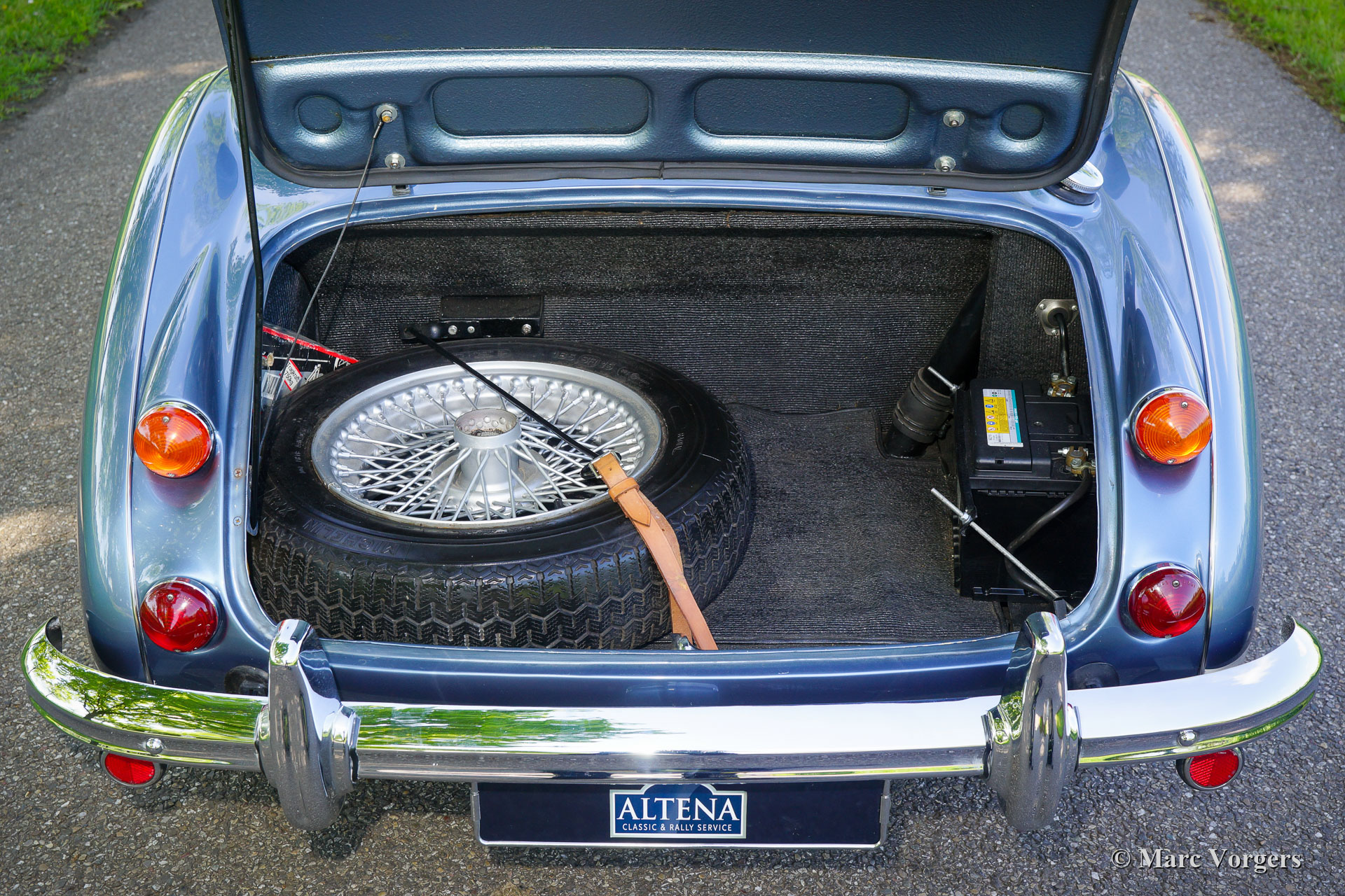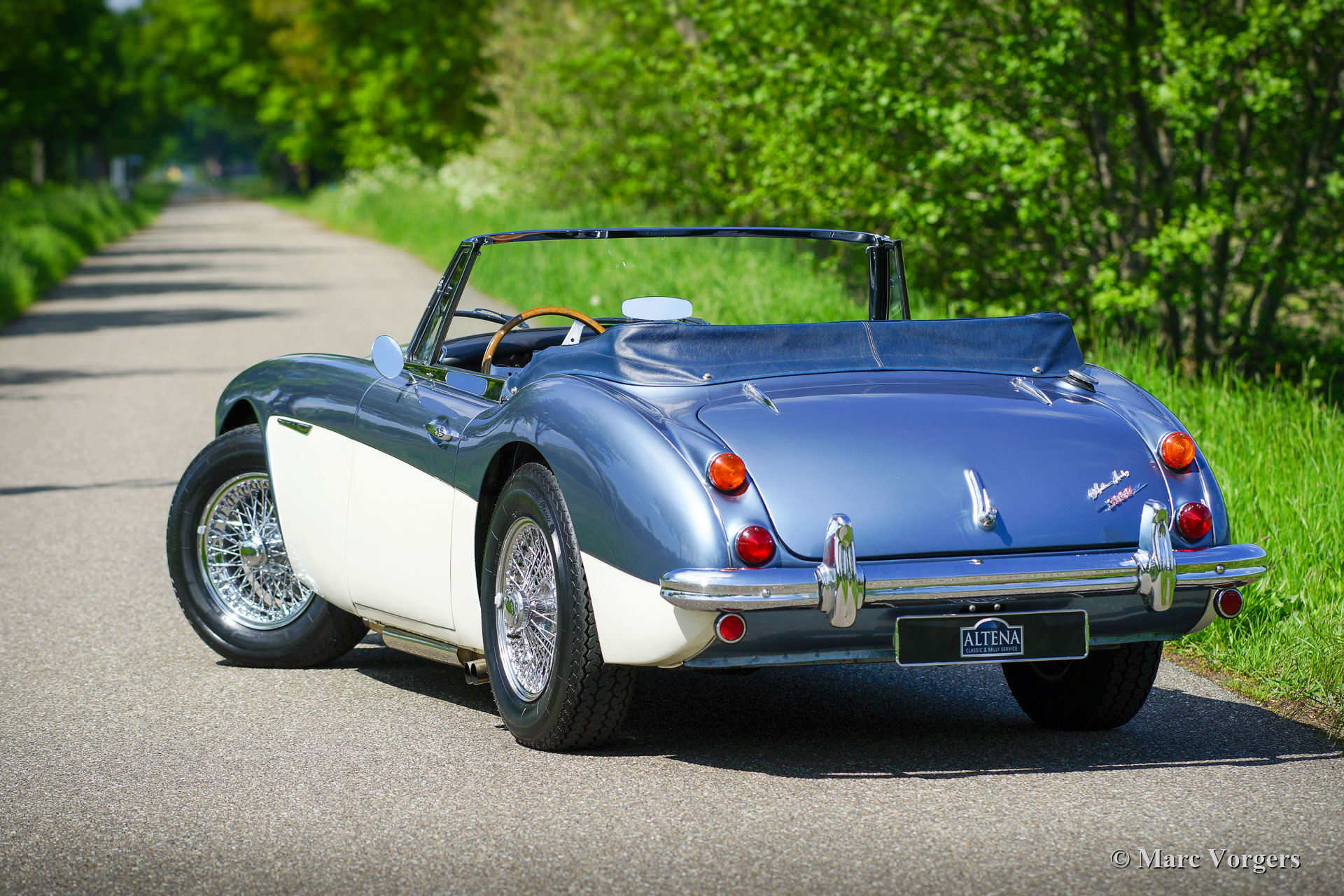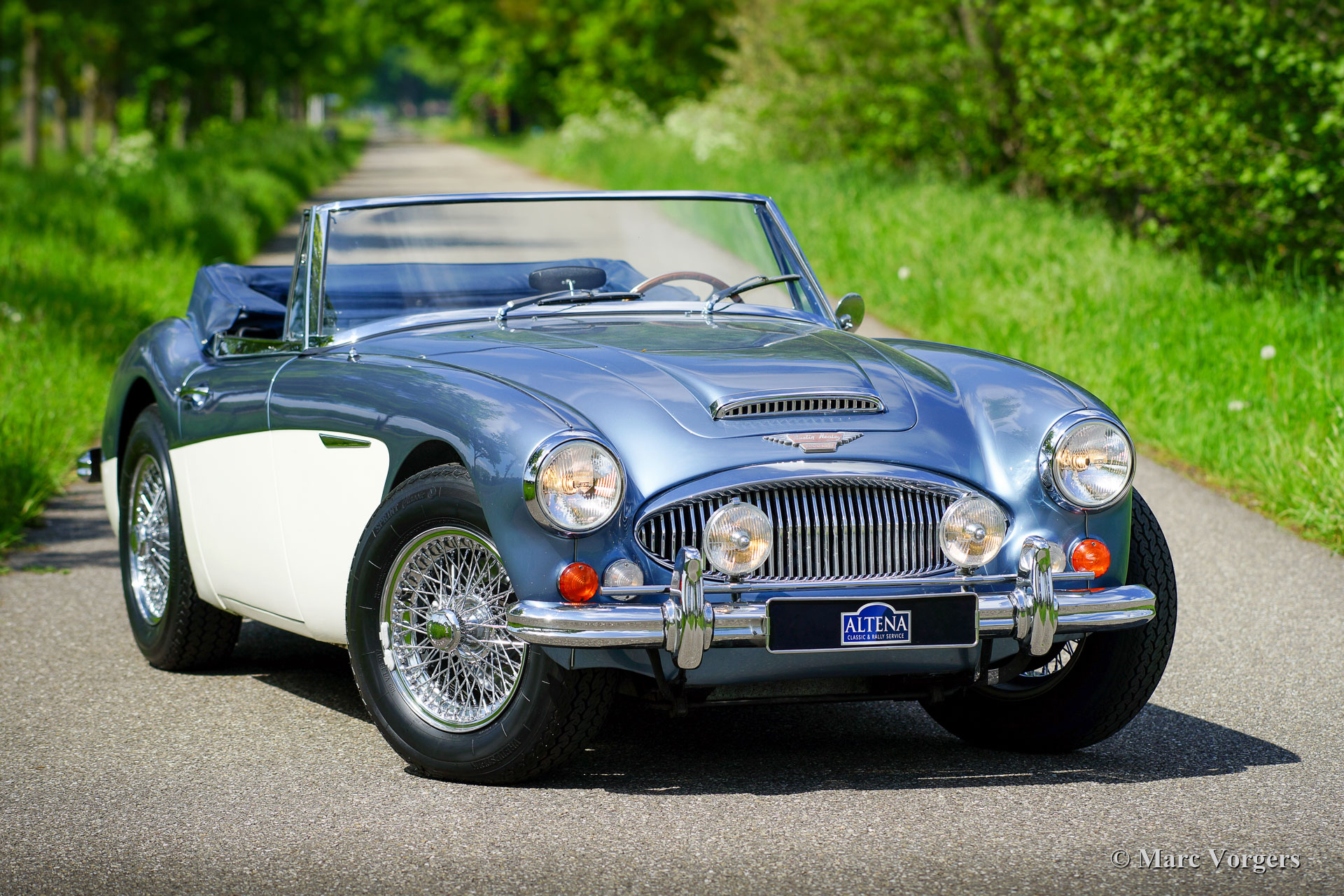 Austin Healey 3000 Mk III phase 2, année 1966. Couleur bleu Healey métallisé sur blanc « Old English » combiné avec un intérieur en cuir bleu foncé et un tapis bleu foncé. Capote et couvercle de la hotte bleu foncé. Cette magnifique Austin Healey fut vendu neuve aux USA. L'automobile fut expédiée aux Pays-Bas en 1979. La voiture fut largement restaurée dans le passé par le spécialiste Austin Healey Cees Cardol, des photos de la restauration sont présentes. Cette « Big Healey » est entretenue dans les ateliers d'Altena Classic Service depuis 2005. Altena a vendu la voiture au propriétaire actuel en 2013. Cette magnifique Austin Healey est en très bon état et la voiture roule superbement ! La voiture est équipée d’overdrive, roues à rayons chromées, une barre de badge équipée d'une paire de phares antibrouillard Lucas SFT576, un échappement latéral en acier inoxydable, des harnais de sécurité rouges (la couleur peut être changée) et un volant MotoLita avec une jante en bois. La voiture est livrée avec un historique (d'entretien), un document Heritage et une brochure originale. C'est un fantastique « Big Healey » dans la combinaison de couleurs la plus recherchée !