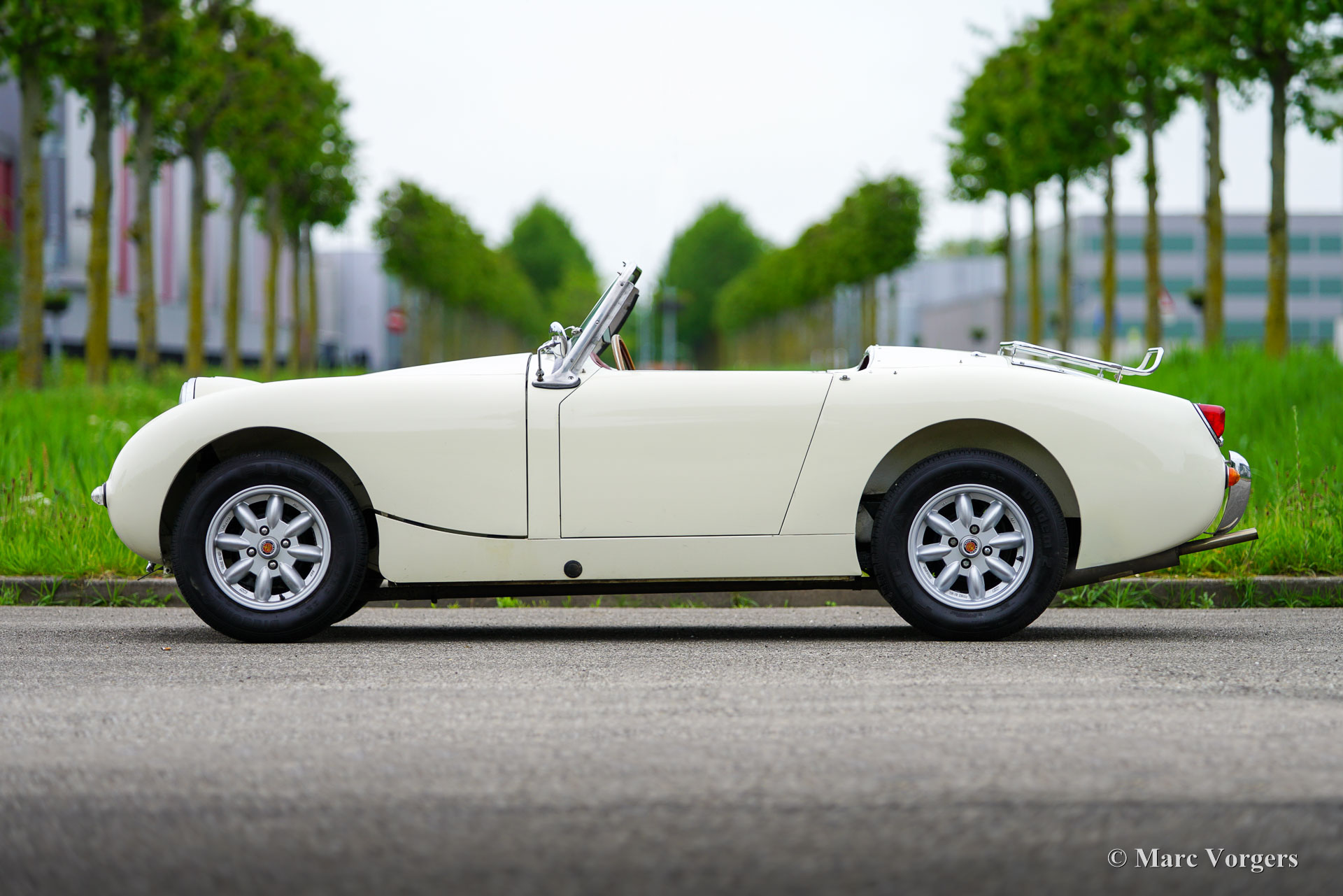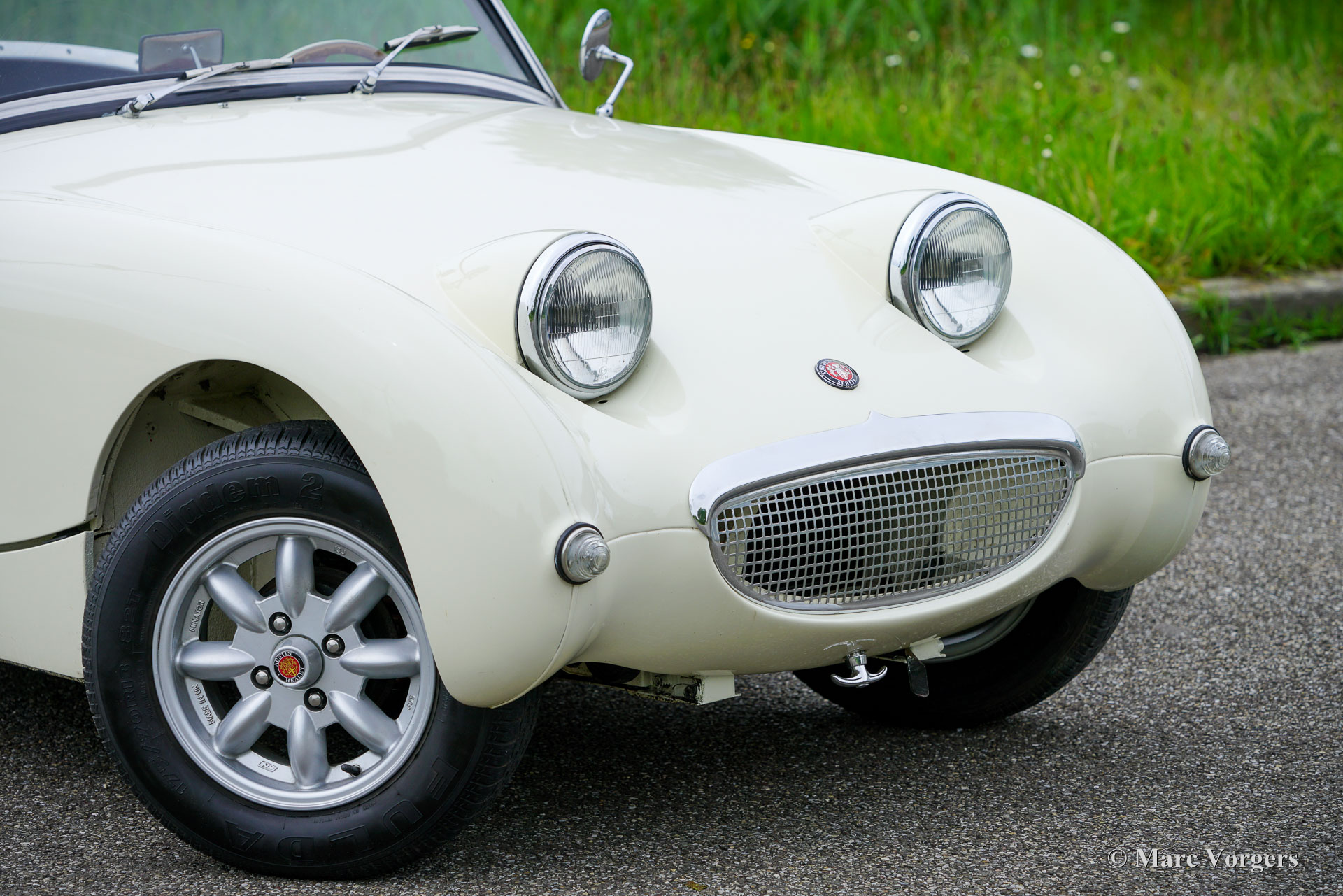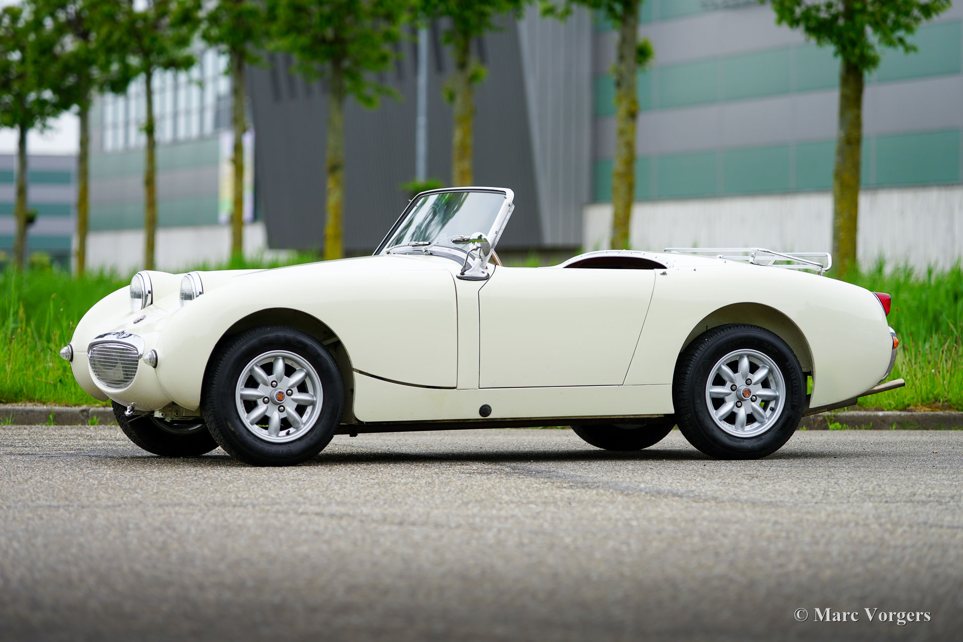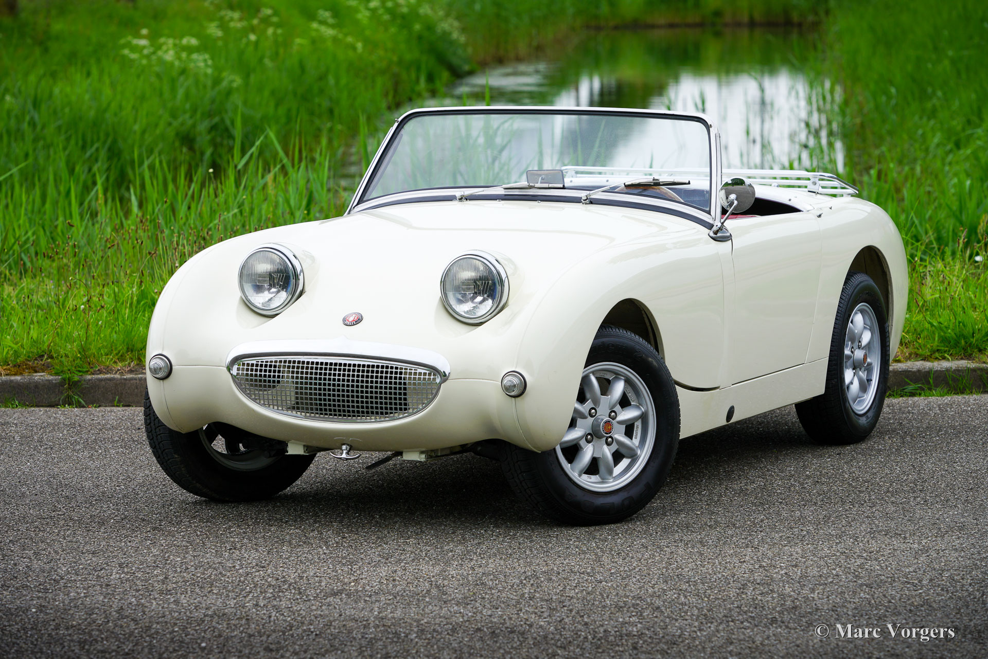Austin Healey Sprite MK 1, année 1958. Couleur blanc crème (Old English White) combinée à un intérieur en cuir rouge garni de passepoil blanc et de tapis rouge. La voiture est livrée avec une capote noire et un toit rigide d'origine. Il s’agit d’un très désirable MK 1 Austin Healey Sprite qui est généralement surnommé « Frog Eye » ou « Bug Eye » en Angleterre/ Etats Unis. Ces petites voitures de sport britanniques spartiates et sportives sont un plaisir à conduire et à voir avec elles, les spectateurs lèvent le pouce et de nombreux passants expriment leur adoration pour la voiture. Vous et votre copilote roulerez avec un grand sourire jusqu'aux oreilles. Cette Austin Healey Sprite est en bon état et la voiture roule à merveille. Le moteur d'origine de 948 cm3 fut remplacé par un moteur plus puissant de 1 098 cm3. Le moteur respire à travers deux S.U. carburateurs, un alternateur fut installé et le système électrique fut modifié de la masse positive à la masse négative. De plus, la voiture est équipée d'un volant sport avec jante en bois et de belles jantes en alliage de 13 pouces de style Minilite chaussées de pneus Fulda 155/70 R13. Le coffre de la voiture est accessible depuis derrière les sièges, le « Frog Eye » ne comporte pas de couvercle de coffre ordinaire. L'Austin Healey Sprite MK 1 est un classique très populaire, ce charmant « Frog Eye » attend de plaire à un fier nouveau propriétaire !