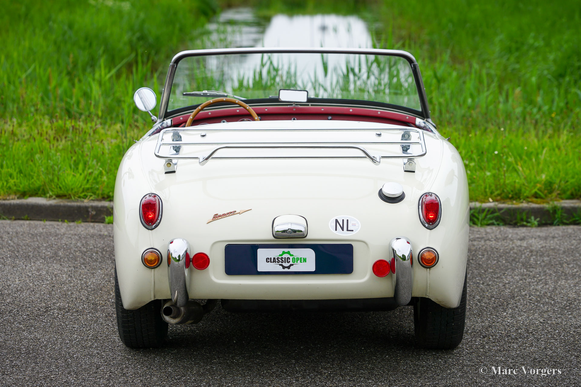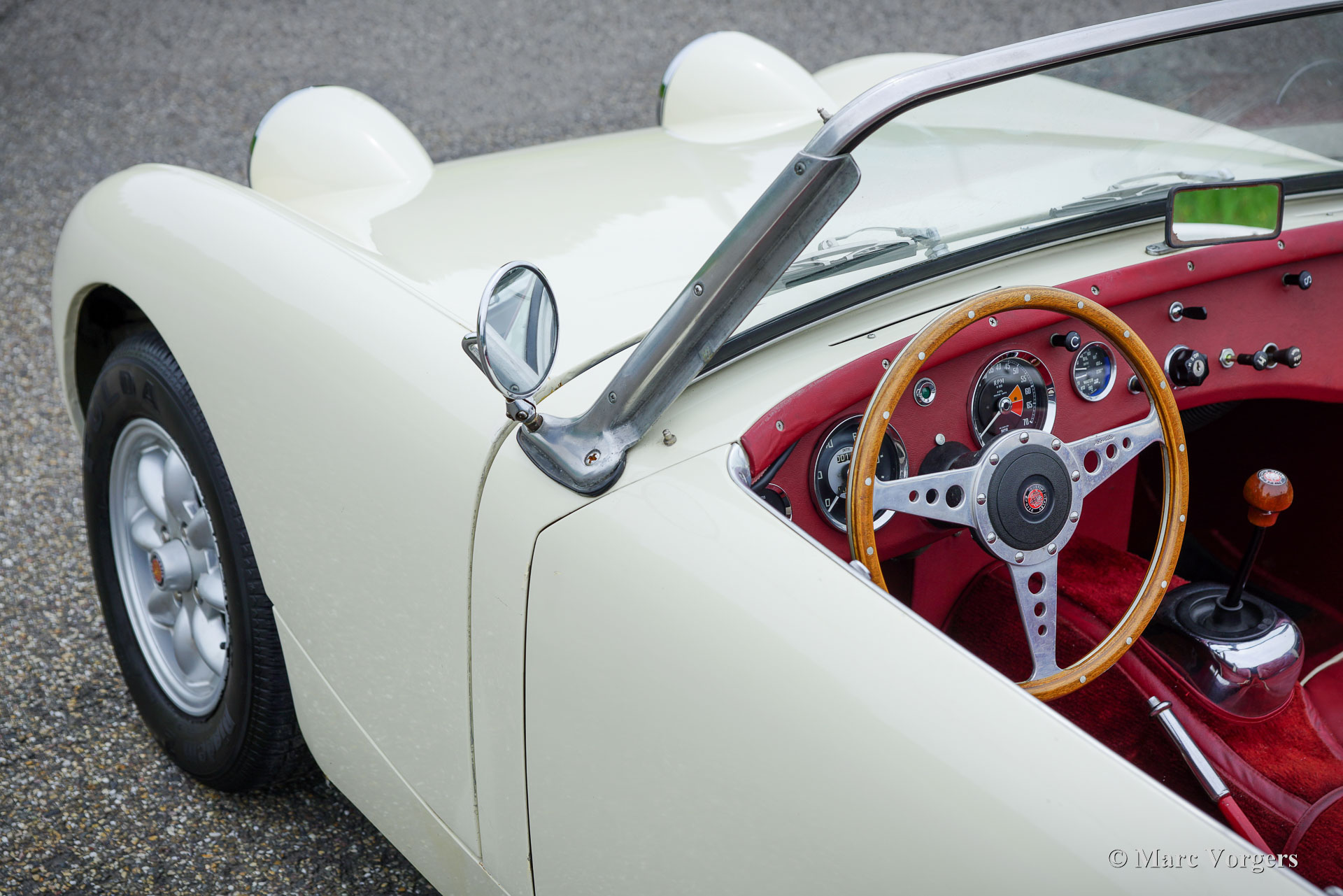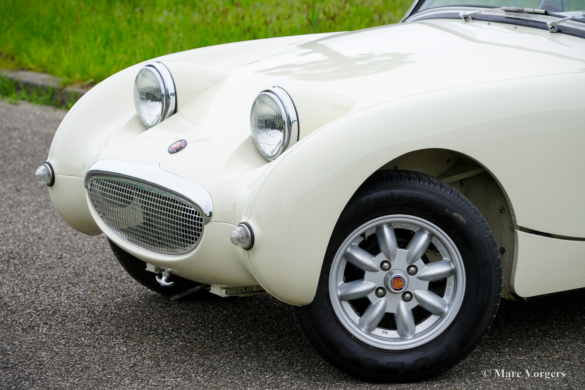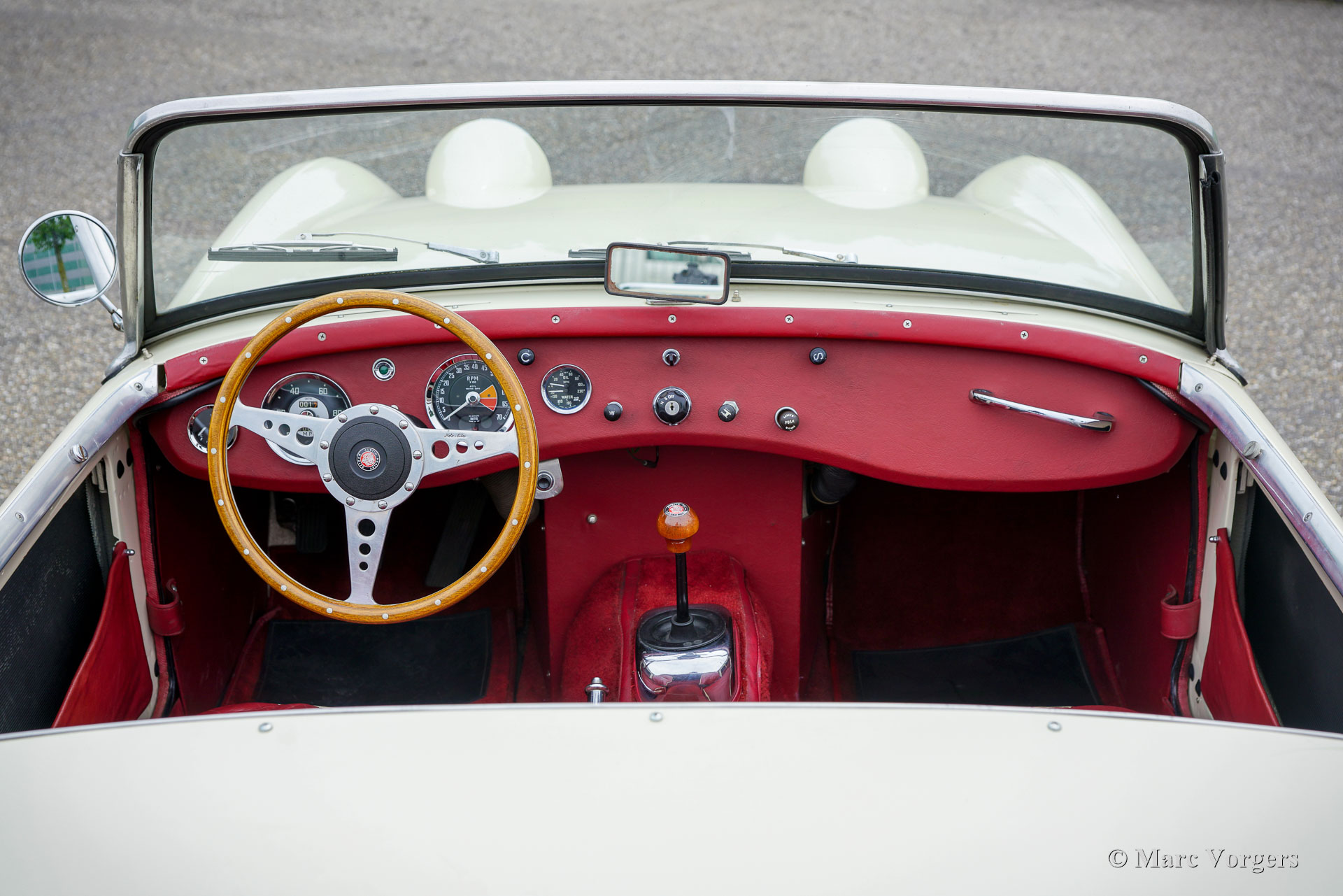 Austin Healey Sprite MK 1, année 1958. Couleur blanc crème (Old English White) combinée à un intérieur en cuir rouge garni de passepoil blanc et de tapis rouge. La voiture est livrée avec une capote noire et un toit rigide d'origine. Il s’agit d’un très désirable MK 1 Austin Healey Sprite qui est généralement surnommé « Frog Eye » ou « Bug Eye » en Angleterre/ Etats Unis. Ces petites voitures de sport britanniques spartiates et sportives sont un plaisir à conduire et à voir avec elles, les spectateurs lèvent le pouce et de nombreux passants expriment leur adoration pour la voiture. Vous et votre copilote roulerez avec un grand sourire jusqu'aux oreilles. Cette Austin Healey Sprite est en bon état et la voiture roule à merveille. Le moteur d'origine de 948 cm3 fut remplacé par un moteur plus puissant de 1 098 cm3. Le moteur respire à travers deux S.U. carburateurs, un alternateur fut installé et le système électrique fut modifié de la masse positive à la masse négative. De plus, la voiture est équipée d'un volant sport avec jante en bois et de belles jantes en alliage de 13 pouces de style Minilite chaussées de pneus Fulda 155/70 R13. Le coffre de la voiture est accessible depuis derrière les sièges, le « Frog Eye » ne comporte pas de couvercle de coffre ordinaire. L'Austin Healey Sprite MK 1 est un classique très populaire, ce charmant « Frog Eye » attend de plaire à un fier nouveau propriétaire !