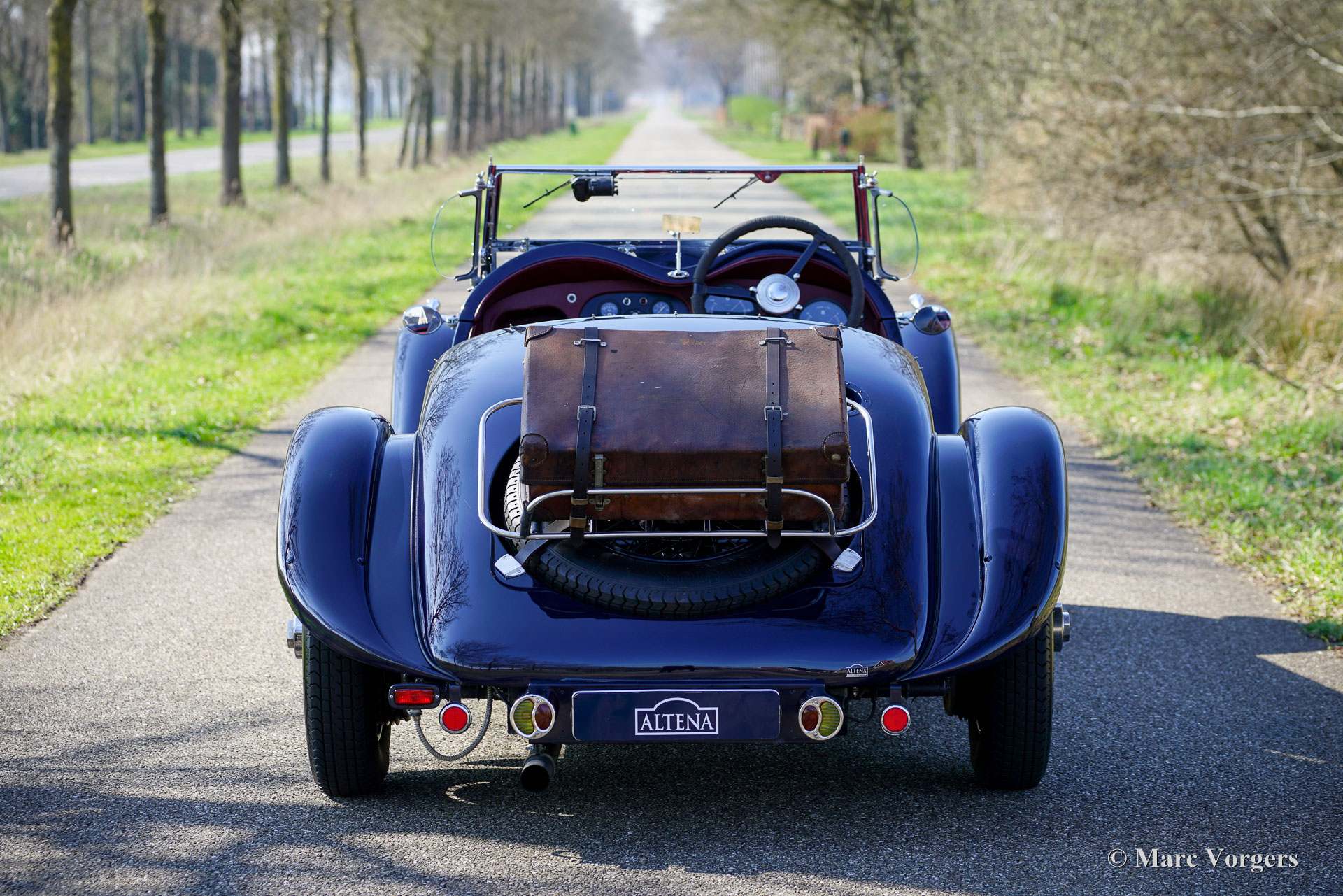 Bentley Alpine, construite par Racing Green Engineering en 2010, châssis de 1950. Numéro de châssis (VIN) B251HP, numéro de moteur B81 B250H. Couleur bleu foncé, intérieur cuir rouge et moquette rouge. Capote et couvre-capote en mohair noir. Cette magnifique Bentley Alpine Special a été construite à la perfection par le célèbre préparateur britannique Racing Green Engineering. La carrosserie spéciale « Alpine », flambant neuve, a été associée à un châssis de Bentley Mk VI entièrement restauré et révisé. Tous les éléments mécaniques, tels que la boîte de vitesses, le pont arrière, les freins, la suspension, etc., ont été révisés ou remplacés. Le moteur six cylindres en ligne a été remplacé par un impressionnant moteur V8 Bentley B81 de 6,5 litres, équipé de quatre carburateurs SU ! Depuis sa restauration, la voiture a parcouru 15 000 kilomètres. Cette Bentley, magnifique et captivante, est en excellent état ! Elle offre une conduite remarquable et son habitacle spacieux est idéal pour les personnes de grande taille. Les freins, la boîte de vitesses à quatre rapports entièrement synchronisés et la direction sont d'une grande facilité d'utilisation. Cette magnifique Bentley Alpine est une voiture impressionnante : son allure est époustouflante, son confort de conduite est optimal, son moteur est très puissant et la position de conduite surélevée est un véritable plaisir ! Elle est équipée de jantes à rayons de 19 pouces peintes, chaussées de pneus Excelsior Radial 6.50-R19, d'un porte-bagages chromé avec une valise en cuir et de deux coffres latéraux sur mesure offrant un espace de rangement supplémentaire. Ce véhicule peut être importé et immatriculé dans n'importe quel pays européen ; tous les documents sont fournis. Cette fabuleuse Bentley est prête pour toutes les aventures et tous les événements historiques entre les mains de son nouveau propriétaire. Altena Classic Service est partenaire officiel de « Racing Green Engineering ». Nous vous offrons tous les conseils, l'assistance et l'entretien dont vous pourriez avoir besoin pour votre Bentley.