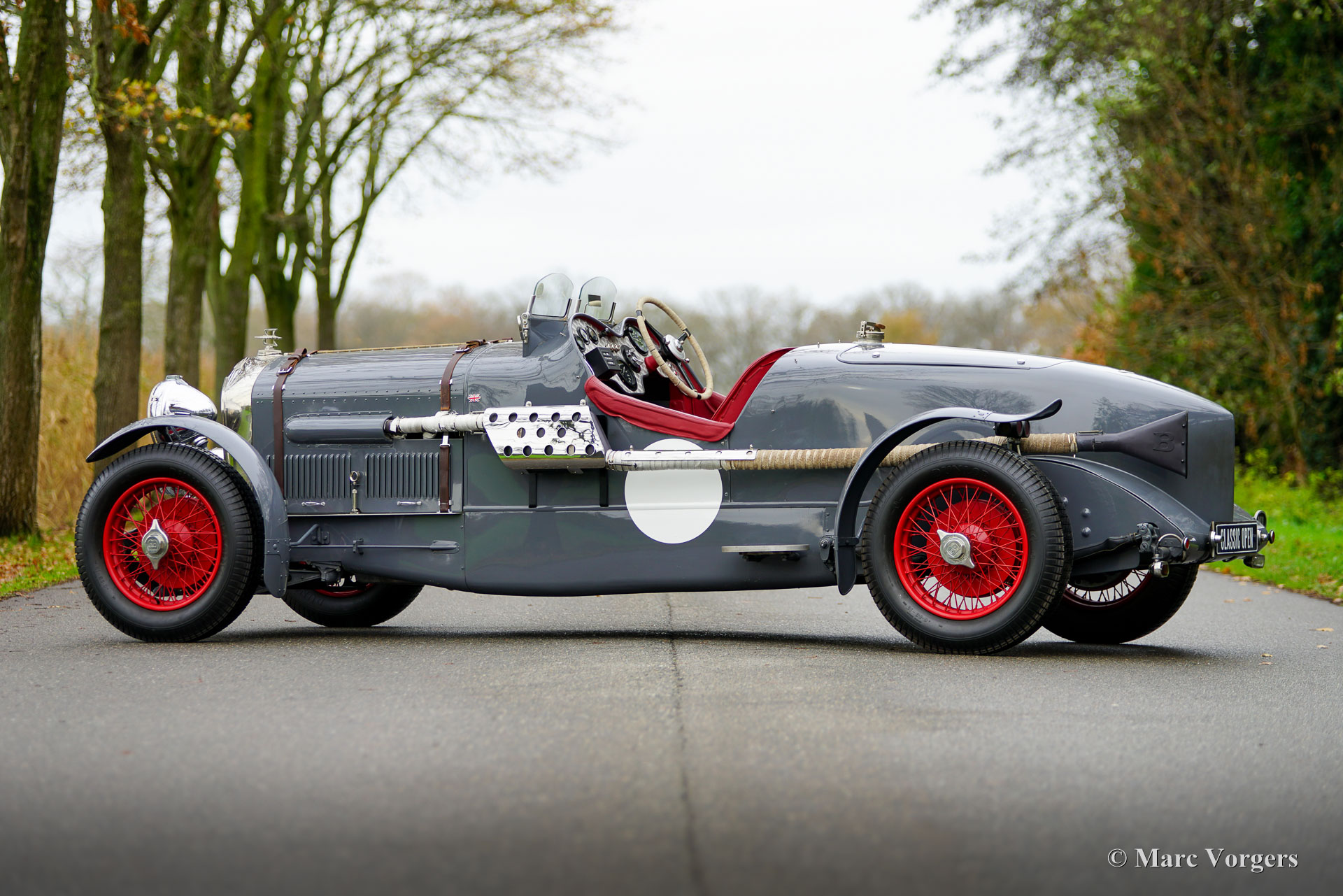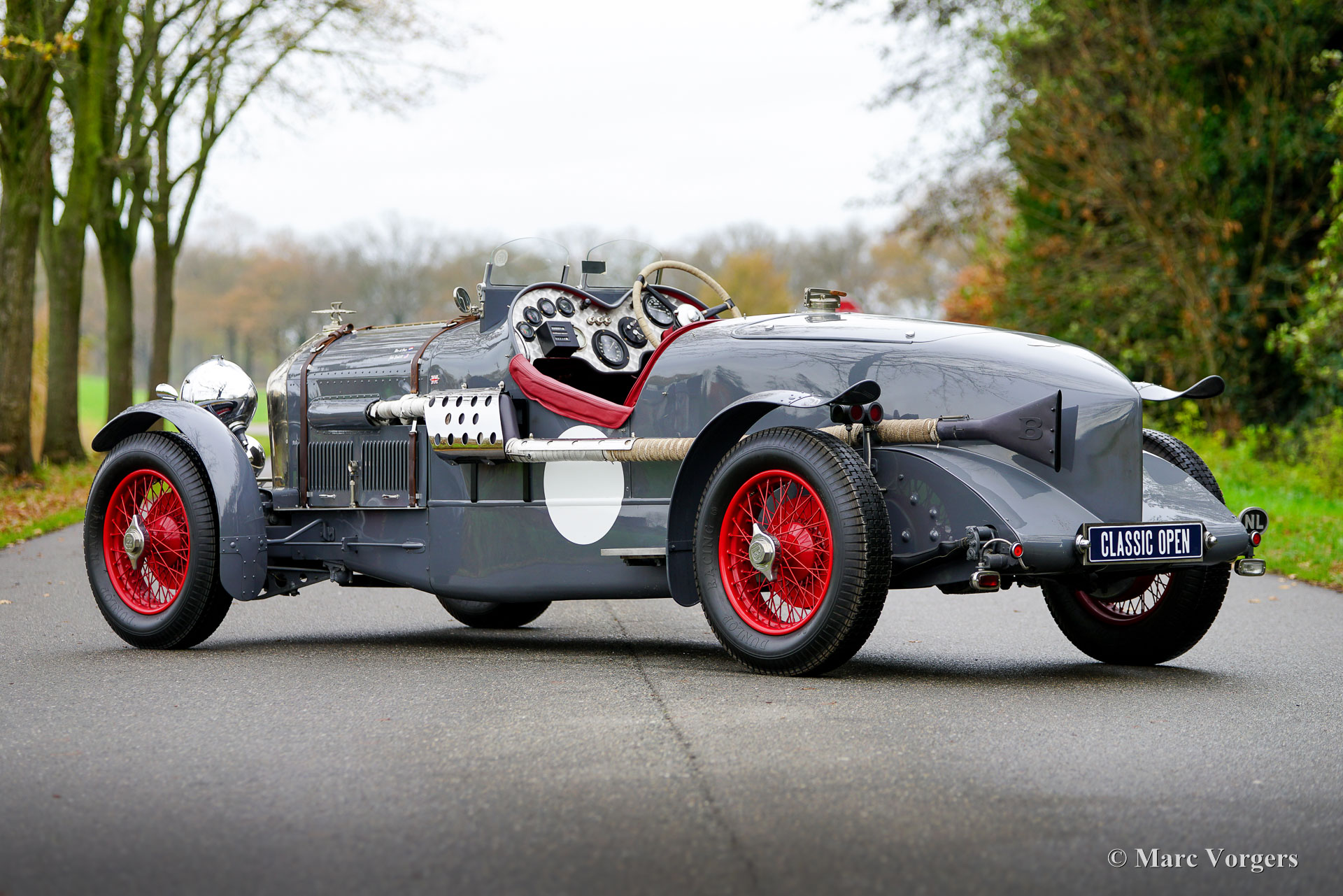 Bentley « Old Number One » spéciale, châssis de 1947. Numéro de châssis B172AK. Carrosserie grise avec roues à rayons rouges. Intérieur garni de cuir rouge et moquette en laine rouge assortie. Cette magnifique réplique de la Bentley « Old Number One » fut construite sur un châssis original de Bentley Mk VI de 1947. La voiture fut assemblée par Vintage Car Serry (Serry Exclusive) à Hilversum, aux Pays-Bas. Cette entreprise renommée réalise depuis dix ans des répliques sur mesure de la légendaire Bentley Speed Six « Old Number One », victorieuse aux 24 Heures du Mans en 1929 et 1930. Cette automobile impressionnante est dotée d'une mécanique authentique de Bentley MK VI entièrement révisée (moteur Bentley B60 six cylindres en ligne de 4,25 litres et boîte de vitesses Bentley à 4 rapports), d'une carrosserie en aluminium superbement réalisée à la main et d'une sellerie en cuir et laine d'une qualité exceptionnelle. Ce splendide exemplaire fut achevé en 2016 et immatriculé en 2017. Depuis, il n'a connu qu'un seul propriétaire soigneux qui a parcouru 4 981 miles à son bord. Cette Bentley spéciale fut construite et finie avec un niveau d'exigence très élevé et est en excellent état ! Basée sur le châssis et la mécanique de la sublime Bentley Mk VI (qui étaient les meilleures de l'industrie dans les années 1940), cette voiture offre une conduite agréable et facile, contrairement au modèle original de 1929. L'expérience de conduite à ciel ouvert est magnifique et le grondement puissant de l'échappement, avec son silencieux Brooklands et son aileron arrière, est tout simplement envoûtant ! Le tableau de bord en aluminium, orné d'une multitude de cadrans, impressionne et donne l'impression d'être aux commandes d'un avion de chasse. L'habitacle offre un espace généreux pour un conducteur et un passager de grande taille. À l'arrière, un coffre spacieux abrite la roue de secours et permet de ranger vos bagages. L'unique Bentley Speed Six « Old Number One » est l'une des voitures les plus emblématiques de l'époque des « Bentley Boys ». Cette superbe réplique en aluminium, réalisée à la main et dotée d'un châssis et de composants mécaniques Bentley d'origine, offre à un nouveau propriétaire aventureux l'expérience et l'héroïsme légendaire des « Bentley Boys » du Mans !