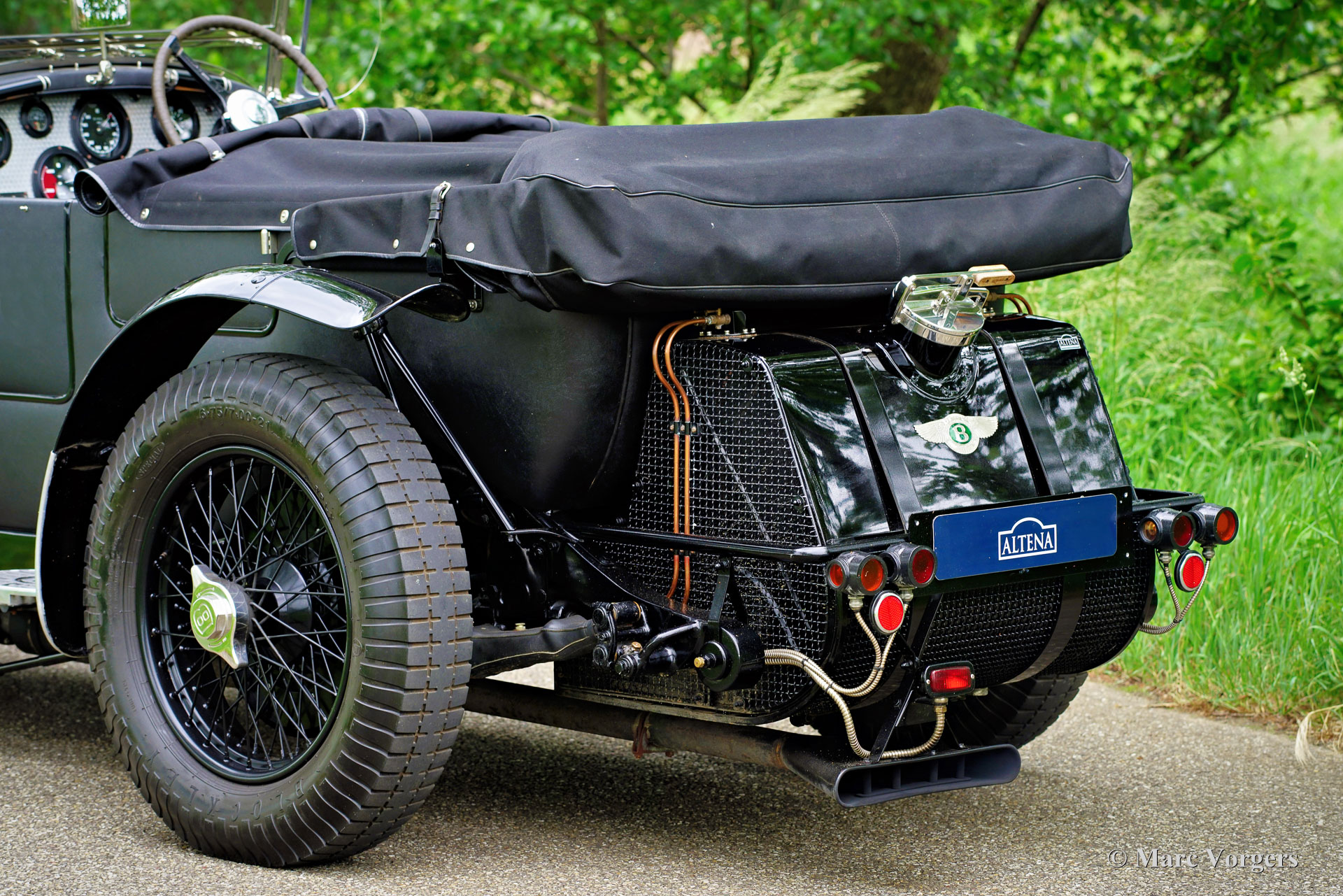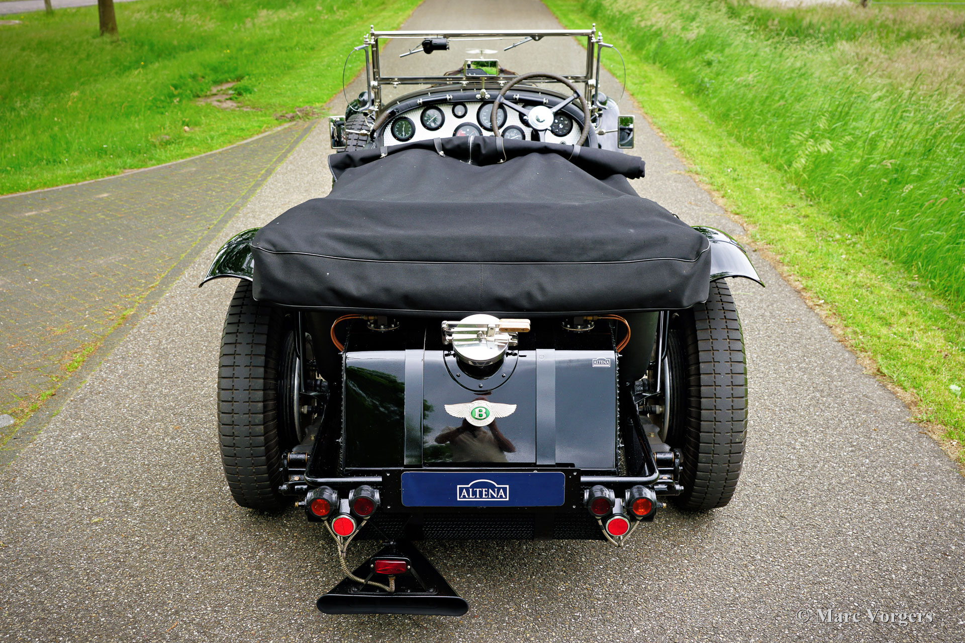 The Bentley 3 Litre was W.O. Bentley’s first design. The car was presented in 1919 but the first cars were sold in 1921. The four cylinder cars of rugged construction where in a class of their own for they combined the size and comfort of the big tourers and saloons with the road holding, and speed of the smaller sports- and racing cars. The Bentley was a true owner-driver car for the sporting motorist and connoisseur. The Bentley car could be had in three different types which were designated with three different radiator badges*. Red badge: short chassis speed model, Blue badge: the early short and then long chassis type for bespoke bodywork, Green badge: very rare and used for about eighteen 100 mph. These Green badge car won at Le Mans in 1924 and 1927 (Old Number Seven.) The 3-Litre was built from 1919 until 1929.