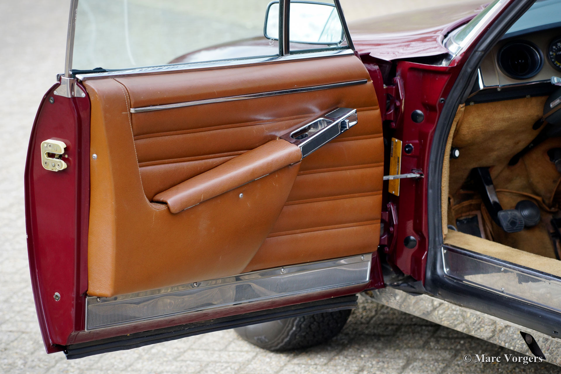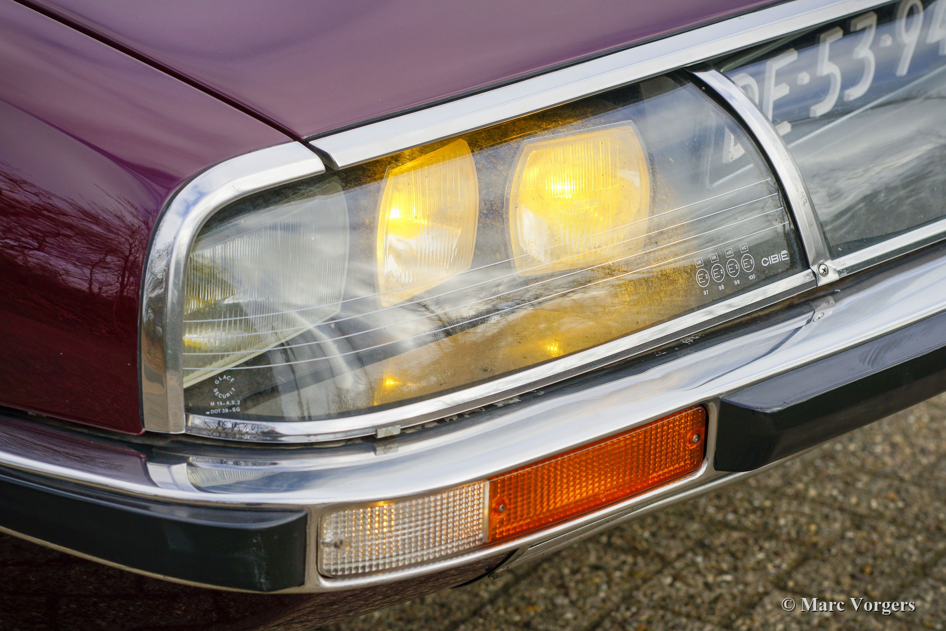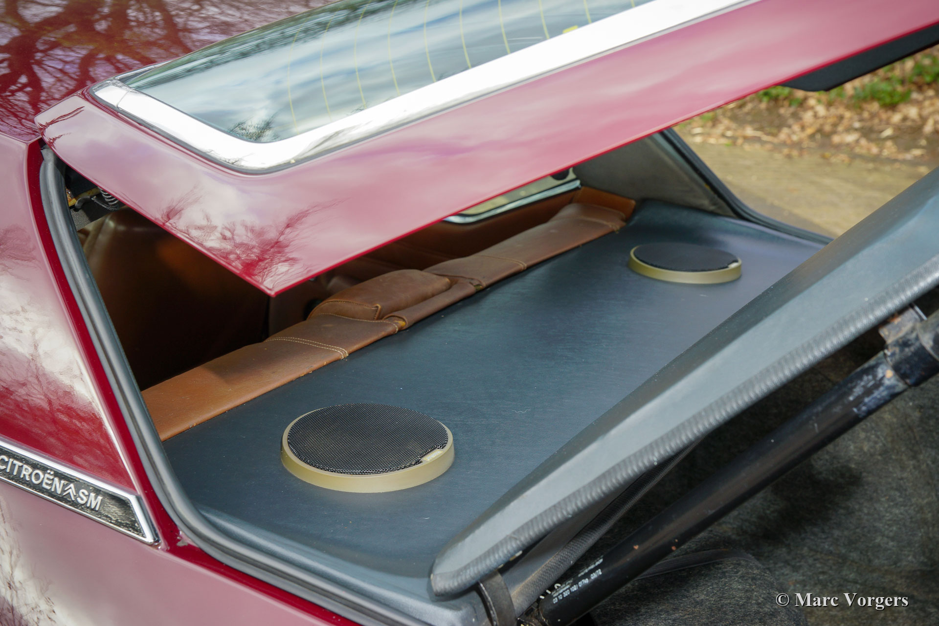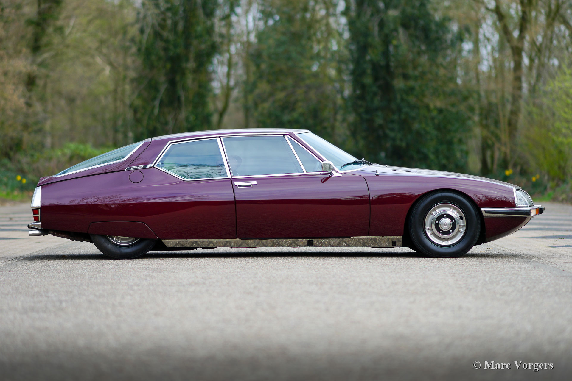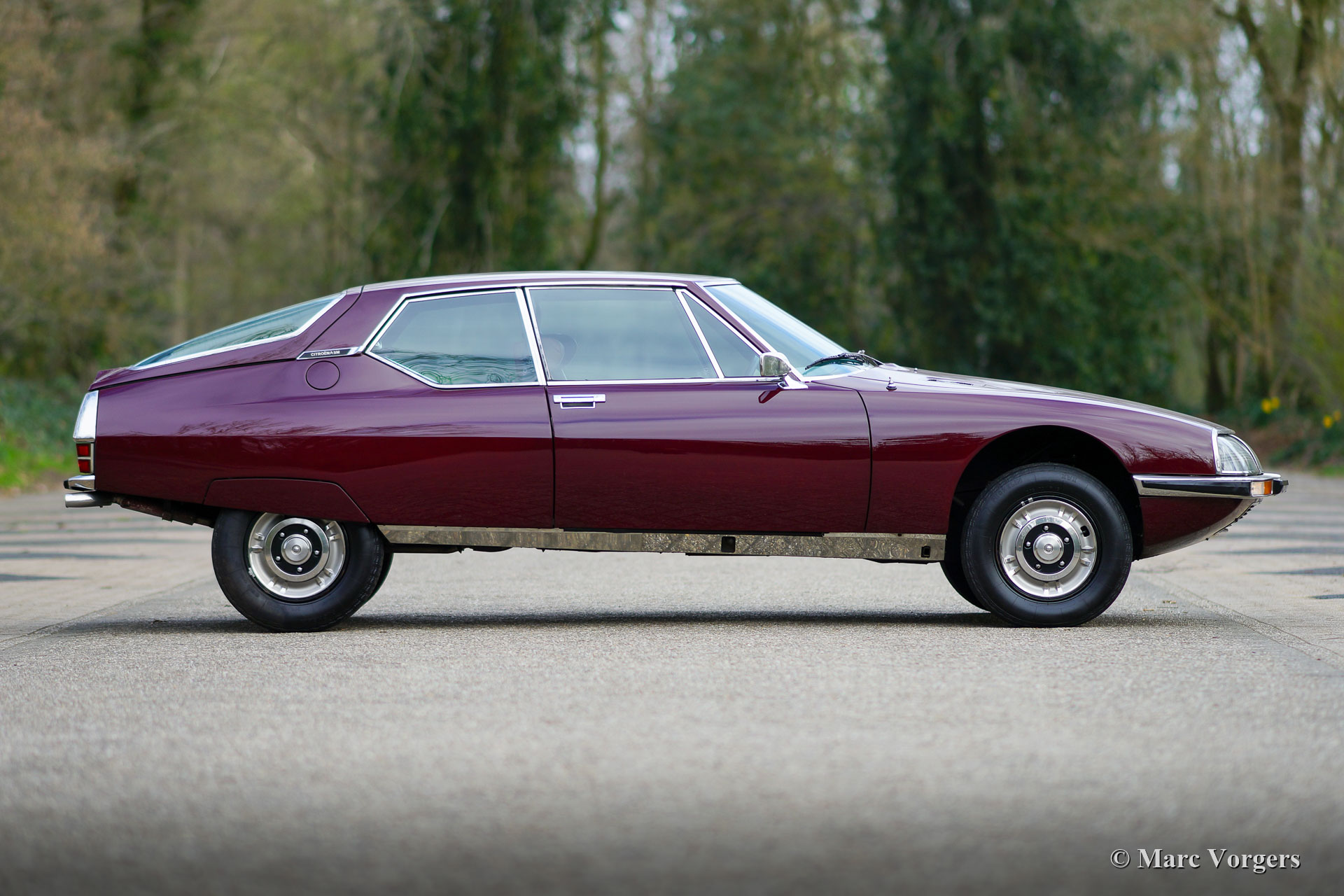 Citroën SM, année 1972. Couleur rouge bordeaux associée à un intérieur en cuir marron et à une moquette assortie. Cette magnifique Citroën SM fut vendue neuve aux États-Unis d'Amérique (US). En 1990, la voiture fut importée aux Pays-Bas. Le dernier propriétaire chérit la voiture depuis 2003, cette année-là, la voiture était déjà en service dans notre atelier. À un moment donné, le système d'injection d'origine fut remplacé par trois carburateurs Weber à double étranglement, ce qui était également une option d'origine. En 2003, le propriétaire a décidé d'améliorer la voiture. Le moteur fut reconstruit avec toutes les améliorations importantes telles que des soupapes améliorées, de meilleurs guides de chaîne de distribution et une pompe à huile améliorée. En 2004, la voiture a reçu une nouvelle peinture parfaite. La peinture crème terne d'origine fut remplacée par le magnifique bordeaux qui orne maintenant la voiture. De plus, la façade américaine fut remplacée par la magnifique façade en verre de style européen avec des projecteurs pivotants ! Nous pouvons regarder en arrière en janvier 2009 dans l'histoire de l'entretien, la voiture a reçu des améliorations et des services pour plus de 21 000 € et la voiture a parcouru 22 500 kilomètres depuis. Cette Citroën SM est en très bon état ! L'intérieur en cuir brun naturel et le tapis montrant des signes d'usure. La voiture est équipée de la radio Continental Edison d'origine, une option très recherchée. La suspension hydropneumatique fonctionne parfaitement, le moteur Maserati V6 fonctionne à merveille, la boîte de vitesses manuelle à 5 rapports se déplace parfaitement et les freins hydrauliques fonctionnent parfaitement. En raison de son apparence impressionnante, de la superbe suspension hydropneumatique et du puissant moteur Maserati V6, la Citroën SM est surnommée « Sa Majestée » en France. En regardant ce merveilleux SM, et en particulier lors de la conduite et de l'expérience, ce nom prouve qu'il est bien choisi.