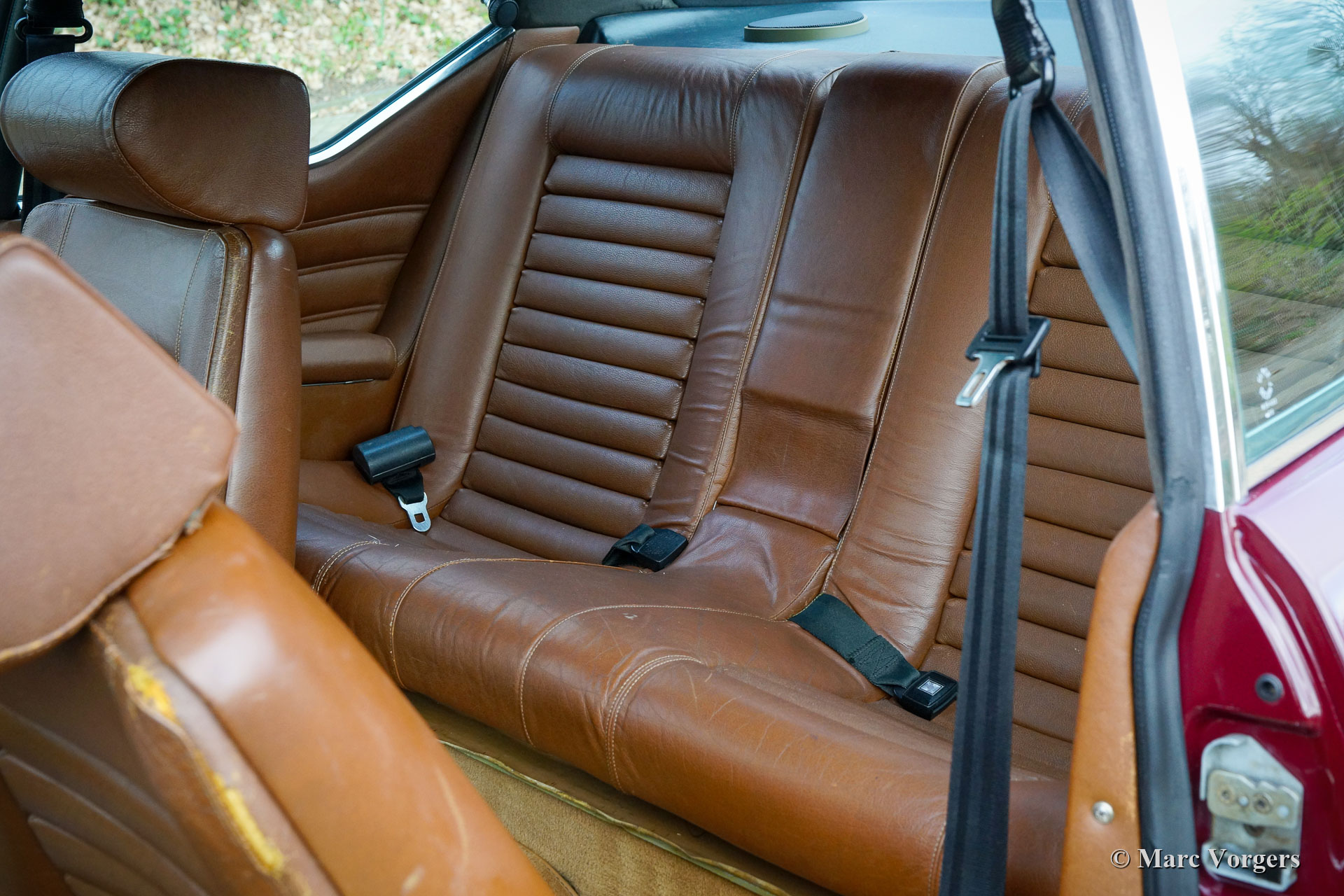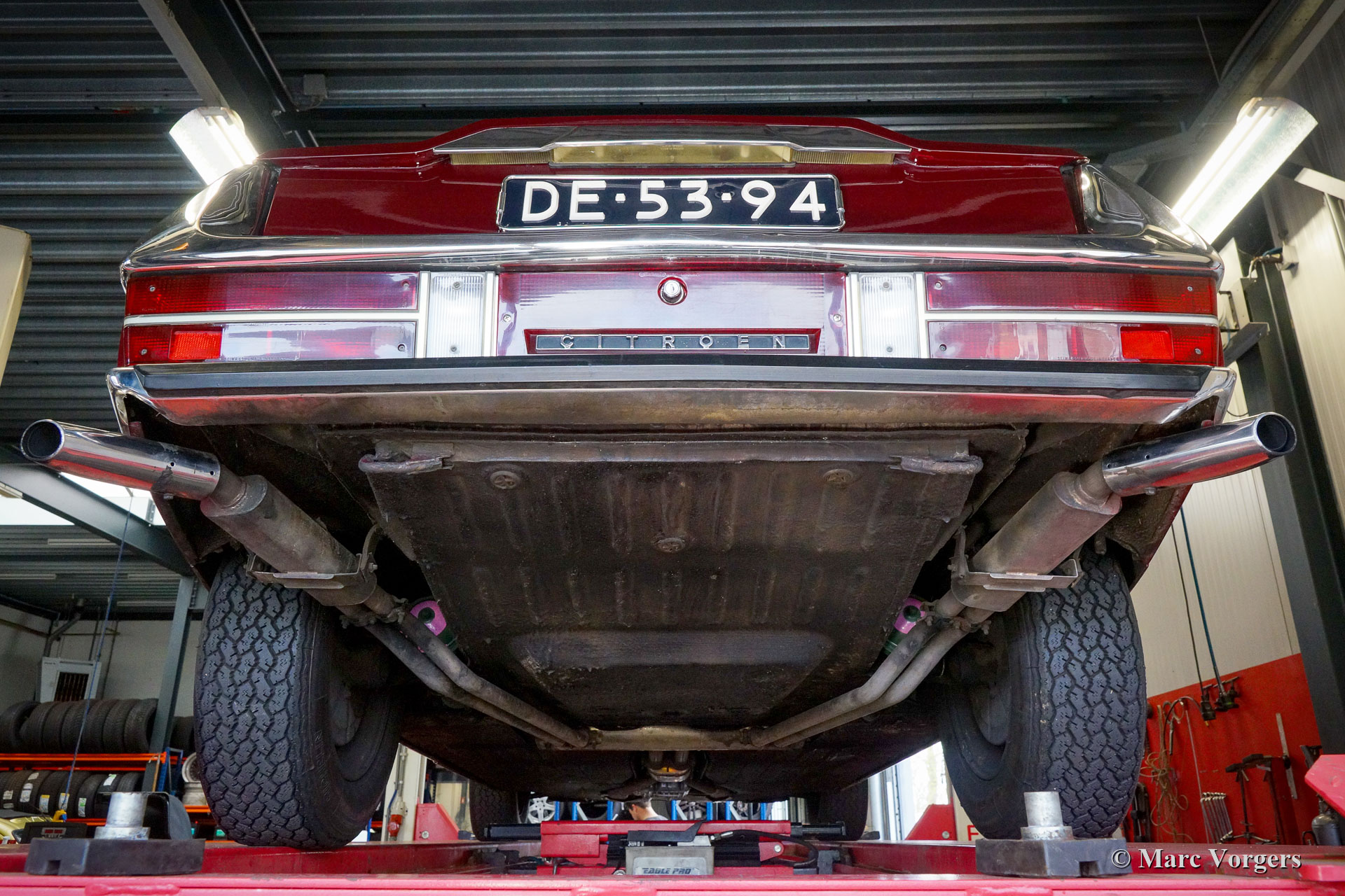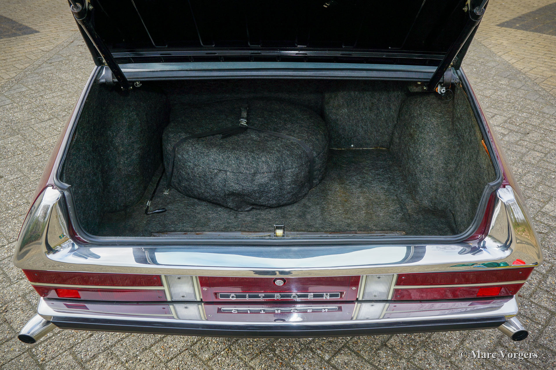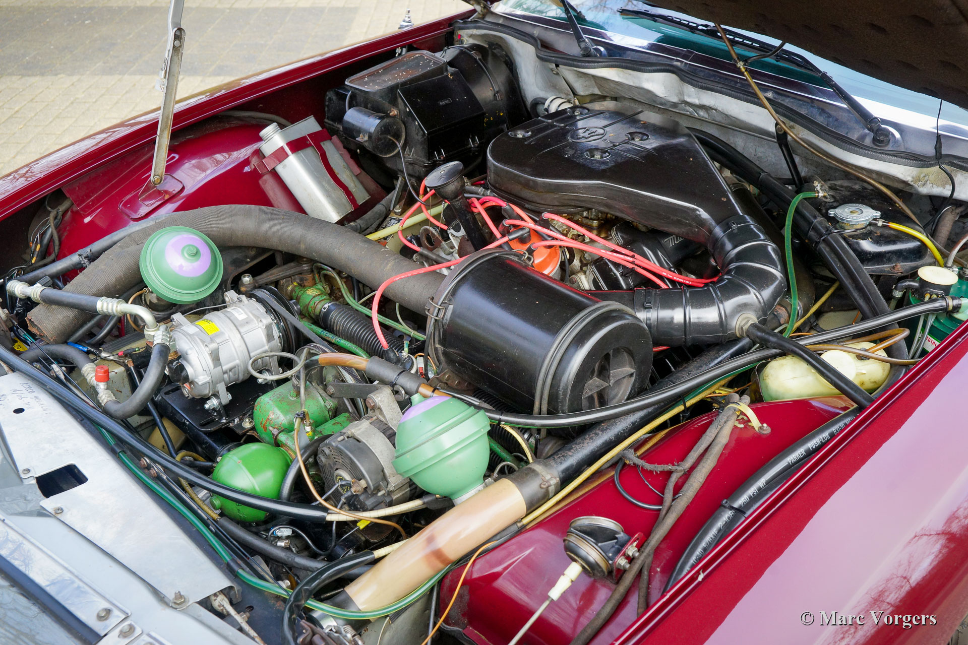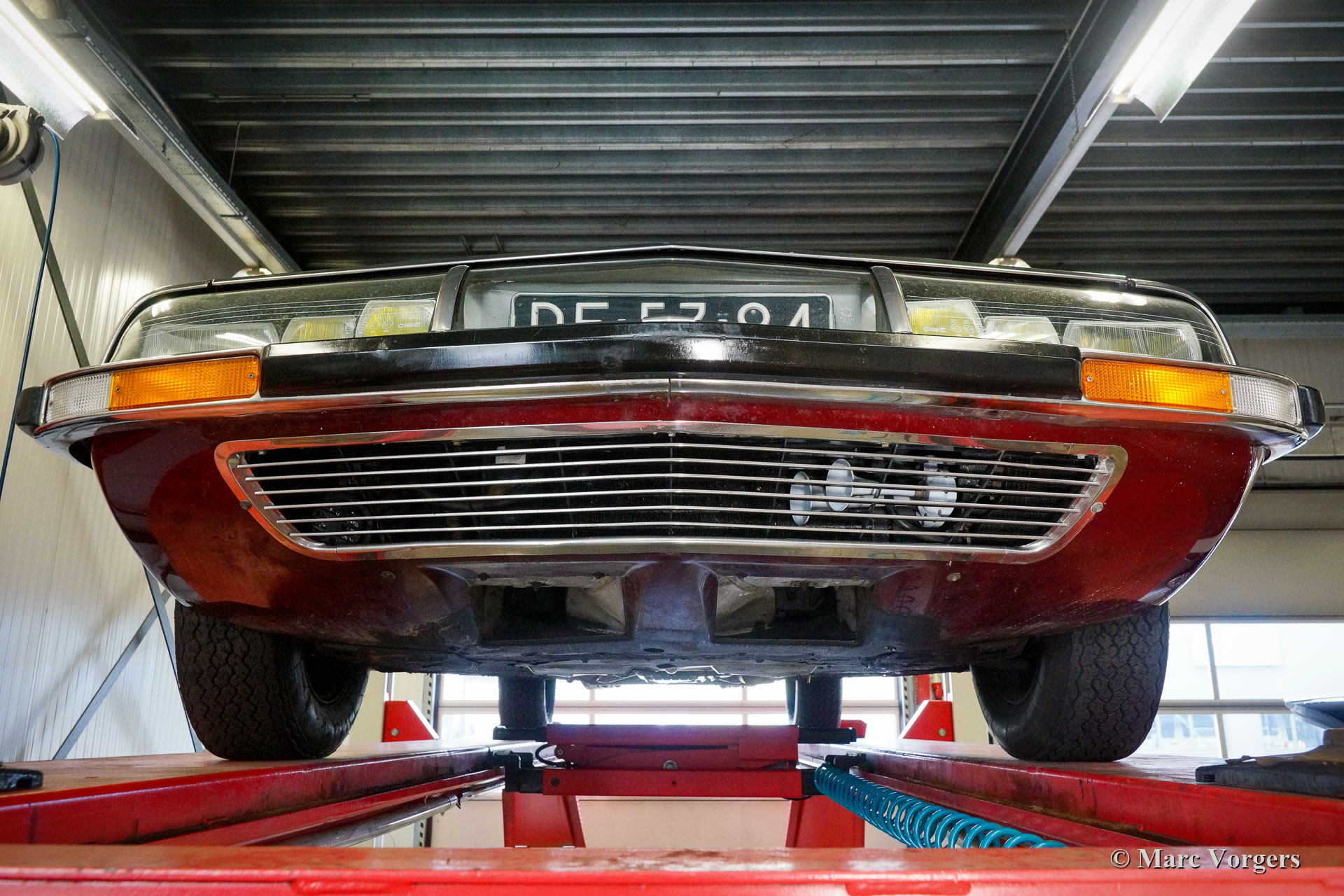 Citroën SM, année 1972. Couleur rouge bordeaux associée à un intérieur en cuir marron et à une moquette assortie. Cette magnifique Citroën SM fut vendue neuve aux États-Unis d'Amérique (US). En 1990, la voiture fut importée aux Pays-Bas. Le dernier propriétaire chérit la voiture depuis 2003, cette année-là, la voiture était déjà en service dans notre atelier. À un moment donné, le système d'injection d'origine fut remplacé par trois carburateurs Weber à double étranglement, ce qui était également une option d'origine. En 2003, le propriétaire a décidé d'améliorer la voiture. Le moteur fut reconstruit avec toutes les améliorations importantes telles que des soupapes améliorées, de meilleurs guides de chaîne de distribution et une pompe à huile améliorée. En 2004, la voiture a reçu une nouvelle peinture parfaite. La peinture crème terne d'origine fut remplacée par le magnifique bordeaux qui orne maintenant la voiture. De plus, la façade américaine fut remplacée par la magnifique façade en verre de style européen avec des projecteurs pivotants ! Nous pouvons regarder en arrière en janvier 2009 dans l'histoire de l'entretien, la voiture a reçu des améliorations et des services pour plus de 21 000 € et la voiture a parcouru 22 500 kilomètres depuis. Cette Citroën SM est en très bon état ! L'intérieur en cuir brun naturel et le tapis montrant des signes d'usure. La voiture est équipée de la radio Continental Edison d'origine, une option très recherchée. La suspension hydropneumatique fonctionne parfaitement, le moteur Maserati V6 fonctionne à merveille, la boîte de vitesses manuelle à 5 rapports se déplace parfaitement et les freins hydrauliques fonctionnent parfaitement. En raison de son apparence impressionnante, de la superbe suspension hydropneumatique et du puissant moteur Maserati V6, la Citroën SM est surnommée « Sa Majestée » en France. En regardant ce merveilleux SM, et en particulier lors de la conduite et de l'expérience, ce nom prouve qu'il est bien choisi.