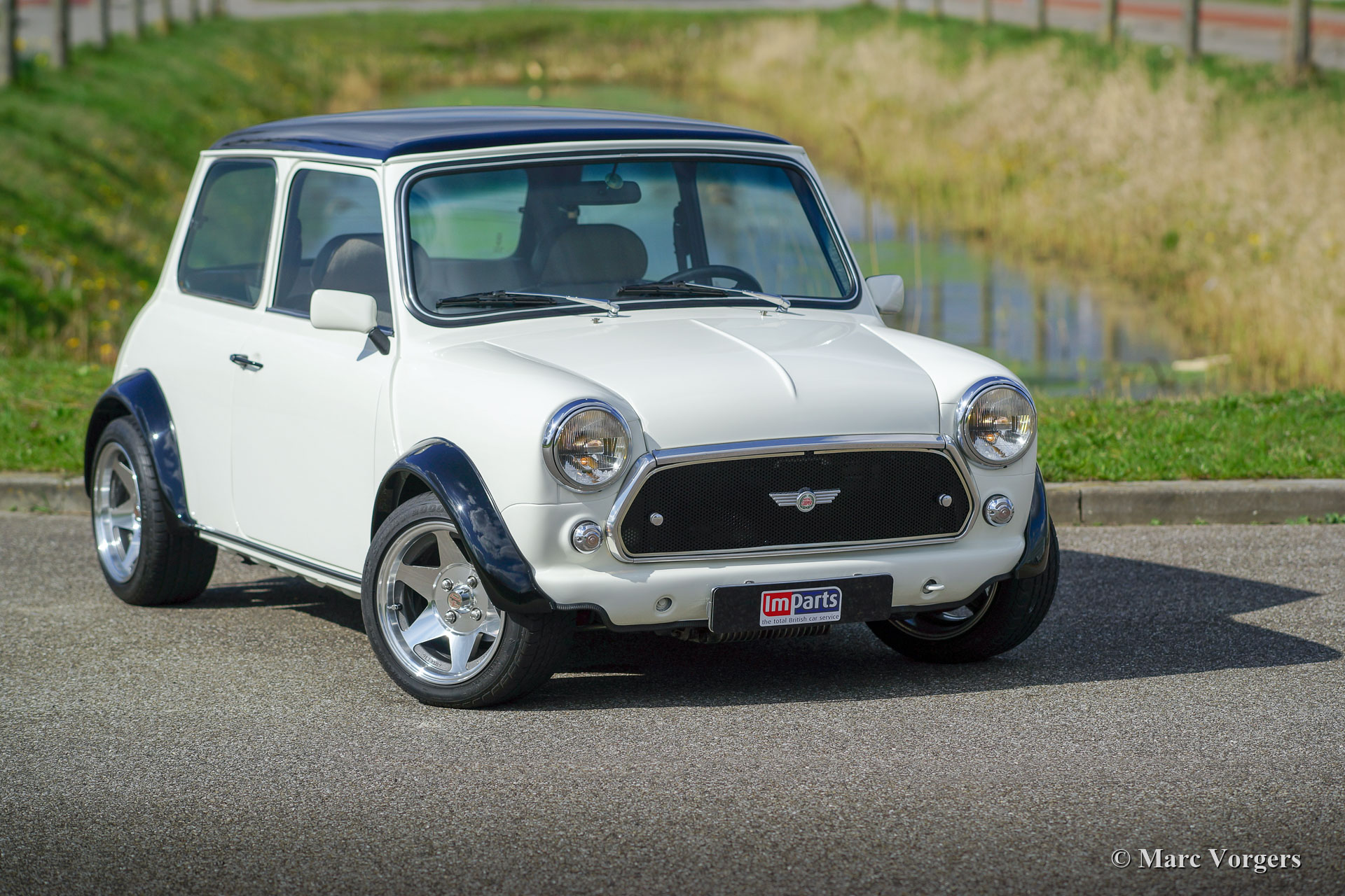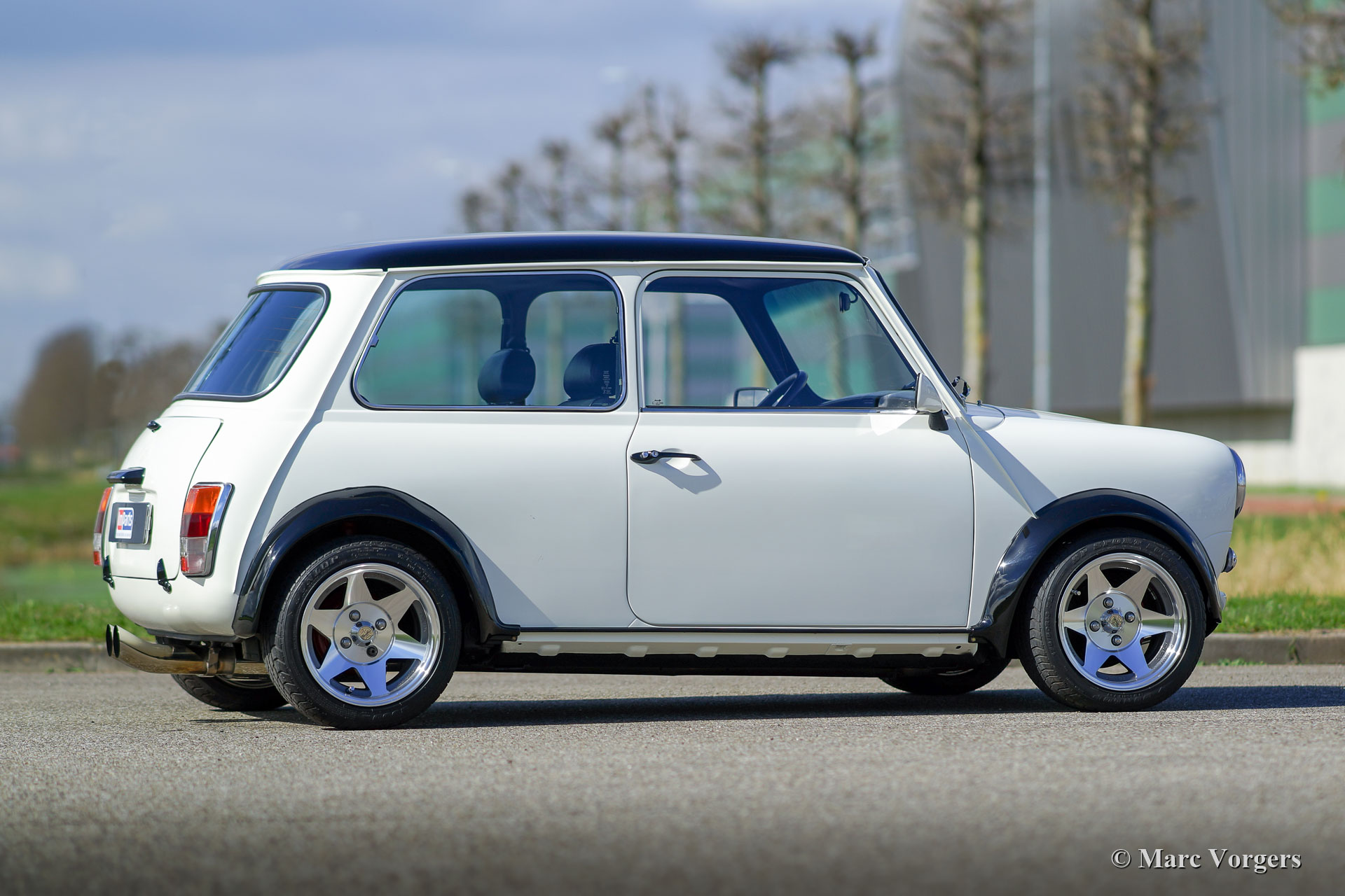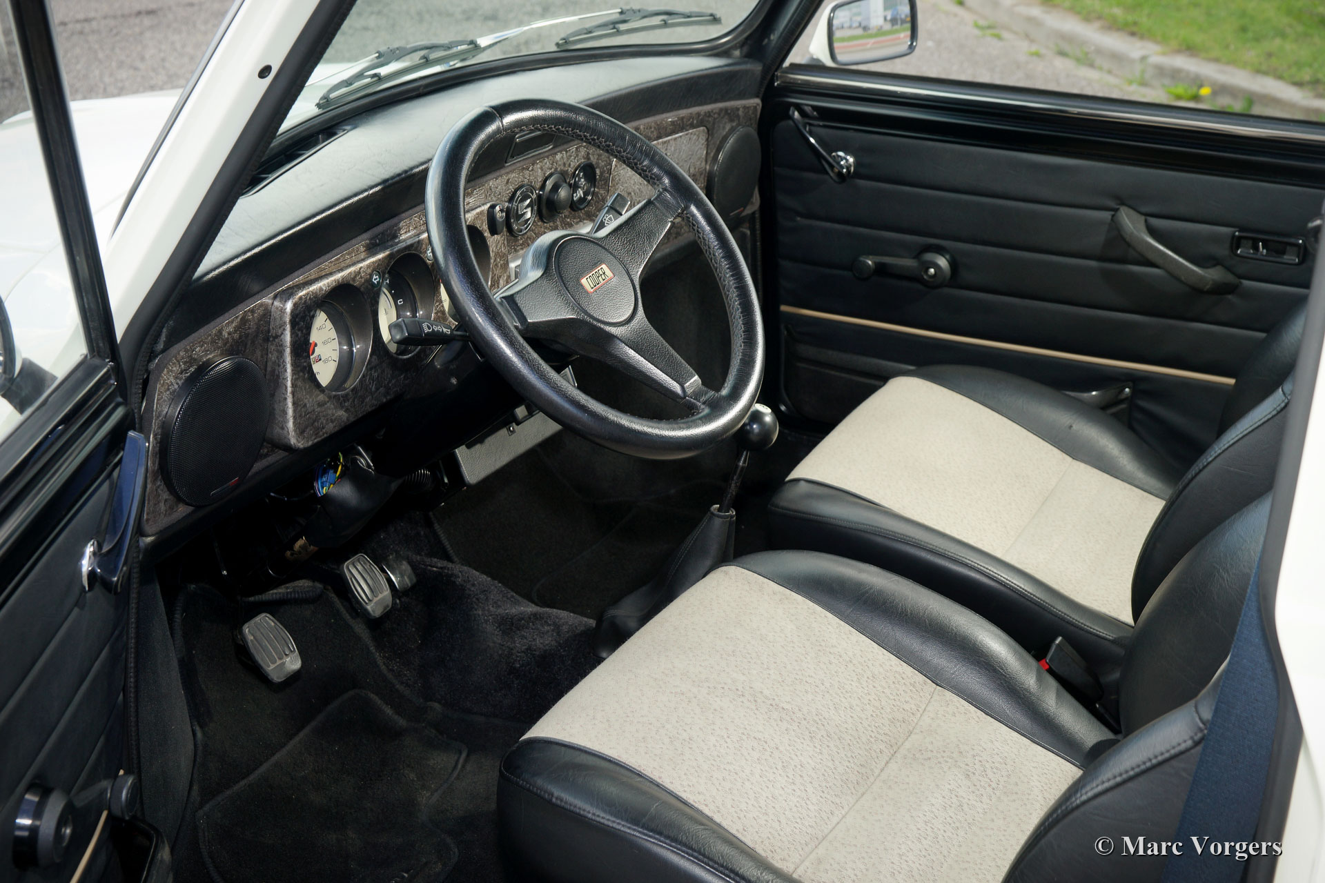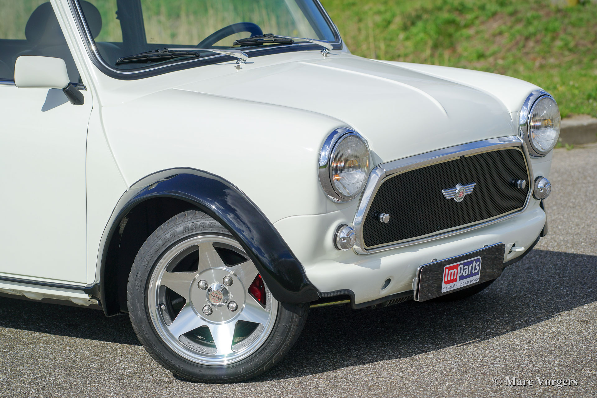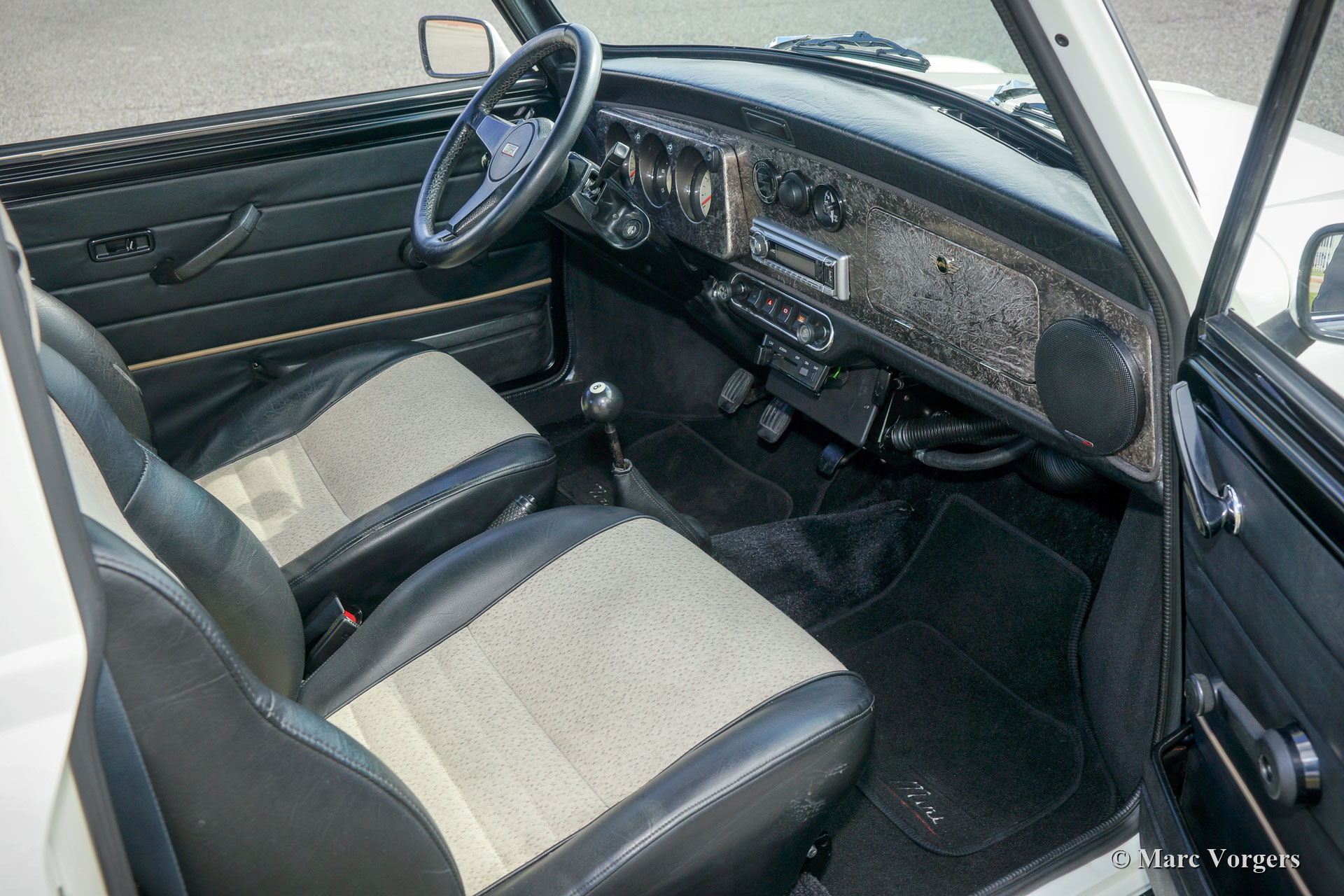 Classic Mini ‘Outlaw’ 1275, année 1985. Couleur blanche combinée à un toit noir et à de larges élargisseurs d'ailes noirs. Intérieur Mini Cooper noire avec contrastes de siège blanc crème et tapis noir. Cet extravagant Leyland Mini ‘Outlaw’ 1275 ne peut pas passer inaperçu… La couleur de la carrosserie blanche, des LARGES élargisseurs d'ailes noirs, les fantastiques roues polies et la note d’échappement grondante font tout un constat ; JE SUIS ICI ! Cette Classic Mini est en superbe état. La voiture roule et pilote comme neuve ! L'intérieur de Cooper avec le tableau de bord spécial de Stilauto de Milan est magnifique ! Le moteur de 1275 cm3 développe 69 chevaux et le système audio haut de gamme est suffisamment puissant pour lutter contre la piste sonore de l'échappement de style DTM ! La voiture est livrée avec de nombreuses autres options souhaitables : roues en alliage poli Starmag 13x7 pouces, pneus Dunlop SP Sport 175 / 45-13, vitres teintées vertes, élargisseurs d'ailes « sport-pack », garniture Cooper, volant Cooper en cuir, Cooper tableau de bord, jauges de tableau de bord avec fonds de couleur crème, deux rétroviseurs en couleur du carrosserie, isolation sous le tapis, une calandre spéciale, des phares à halogène, des amortisseurs Koni… Trop de choses à énumérer ici ! Ceci est un : SPLENDIDE Classic Mini en superbe état !