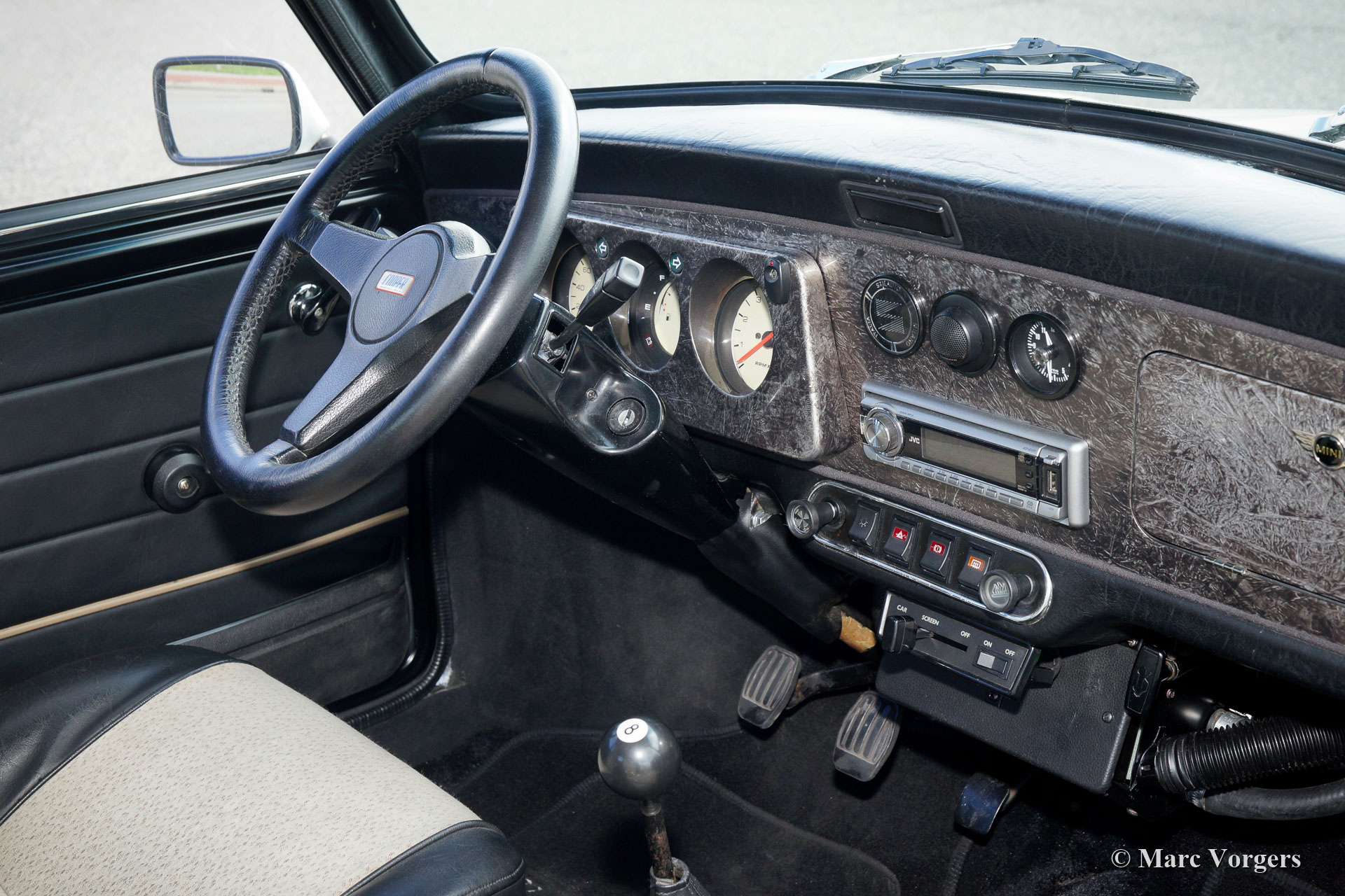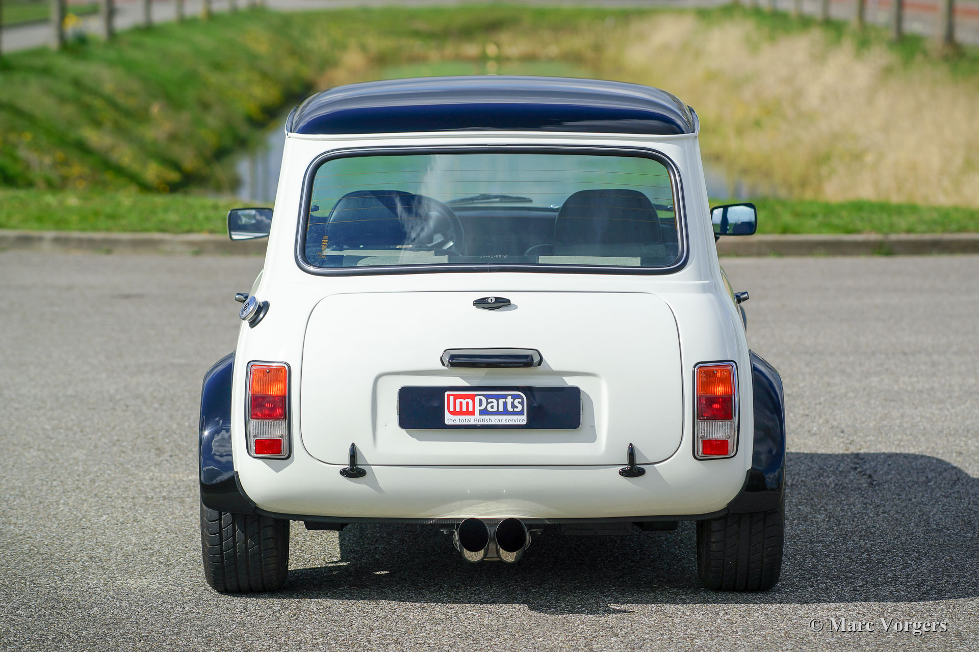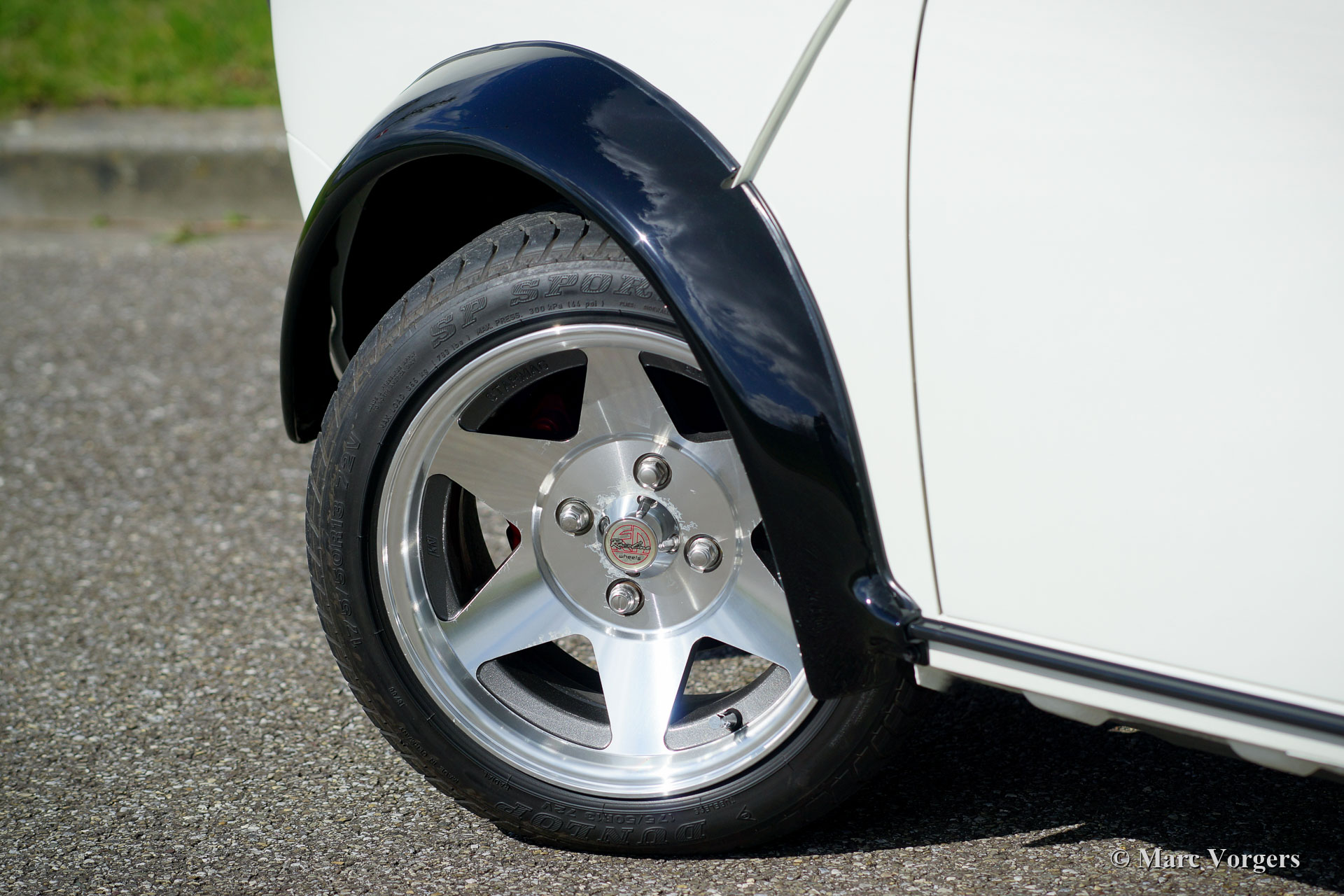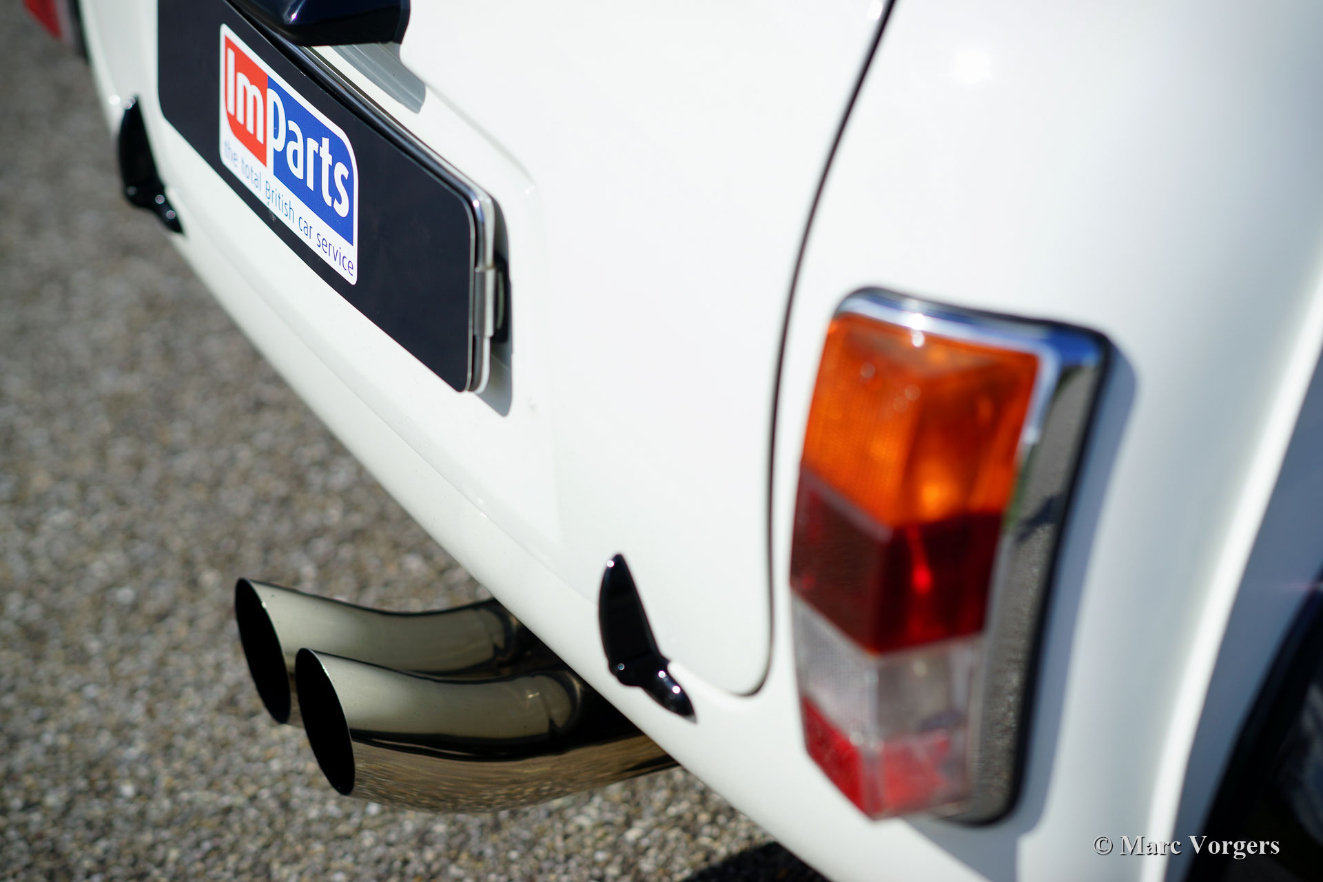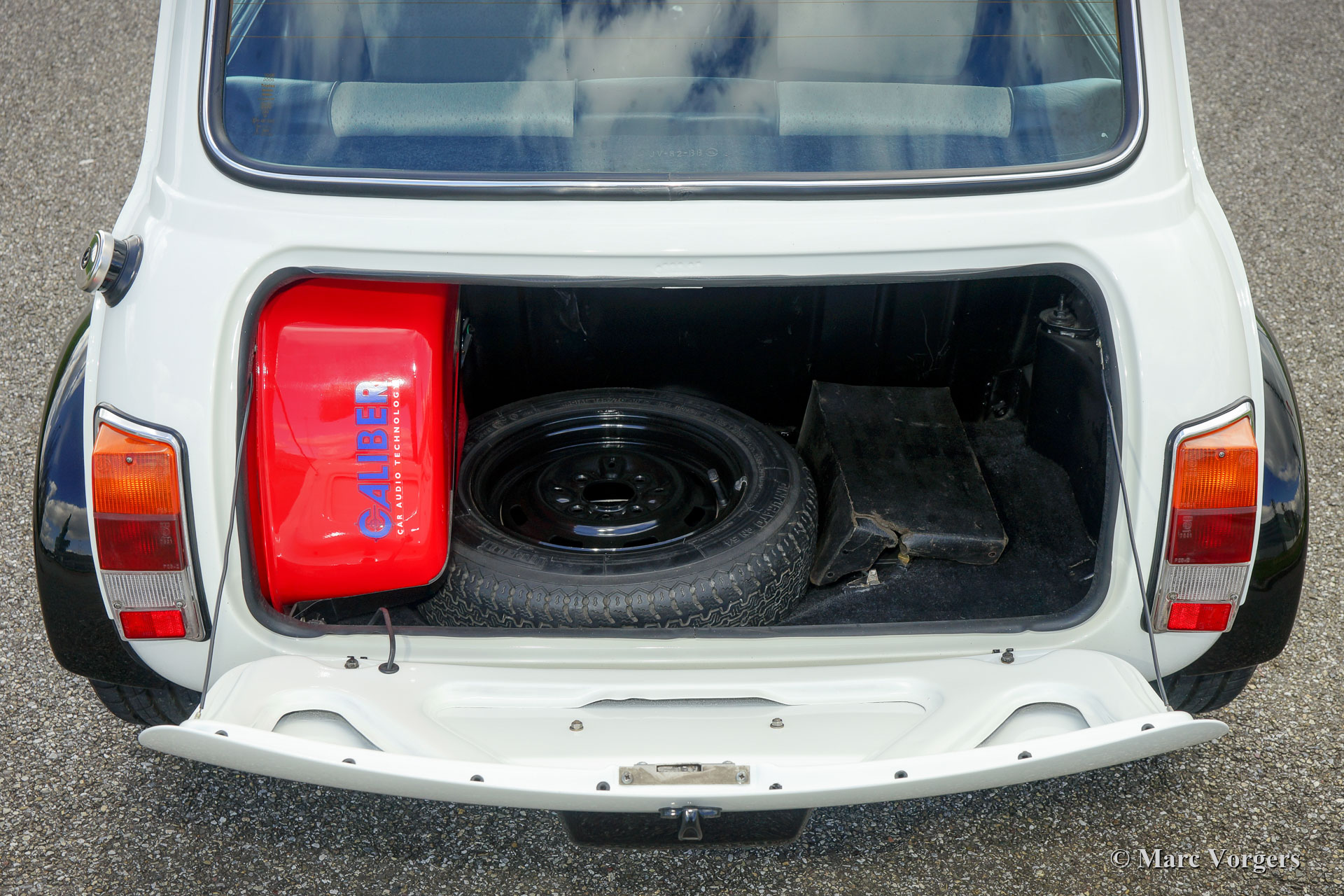 Classic Mini ‘Outlaw’ 1275, année 1985. Couleur blanche combinée à un toit noir et à de larges élargisseurs d'ailes noirs. Intérieur Mini Cooper noire avec contrastes de siège blanc crème et tapis noir. Cet extravagant Leyland Mini ‘Outlaw’ 1275 ne peut pas passer inaperçu… La couleur de la carrosserie blanche, des LARGES élargisseurs d'ailes noirs, les fantastiques roues polies et la note d’échappement grondante font tout un constat ; JE SUIS ICI ! Cette Classic Mini est en superbe état. La voiture roule et pilote comme neuve ! L'intérieur de Cooper avec le tableau de bord spécial de Stilauto de Milan est magnifique ! Le moteur de 1275 cm3 développe 69 chevaux et le système audio haut de gamme est suffisamment puissant pour lutter contre la piste sonore de l'échappement de style DTM ! La voiture est livrée avec de nombreuses autres options souhaitables : roues en alliage poli Starmag 13x7 pouces, pneus Dunlop SP Sport 175 / 45-13, vitres teintées vertes, élargisseurs d'ailes « sport-pack », garniture Cooper, volant Cooper en cuir, Cooper tableau de bord, jauges de tableau de bord avec fonds de couleur crème, deux rétroviseurs en couleur du carrosserie, isolation sous le tapis, une calandre spéciale, des phares à halogène, des amortisseurs Koni… Trop de choses à énumérer ici ! Ceci est un : SPLENDIDE Classic Mini en superbe état !