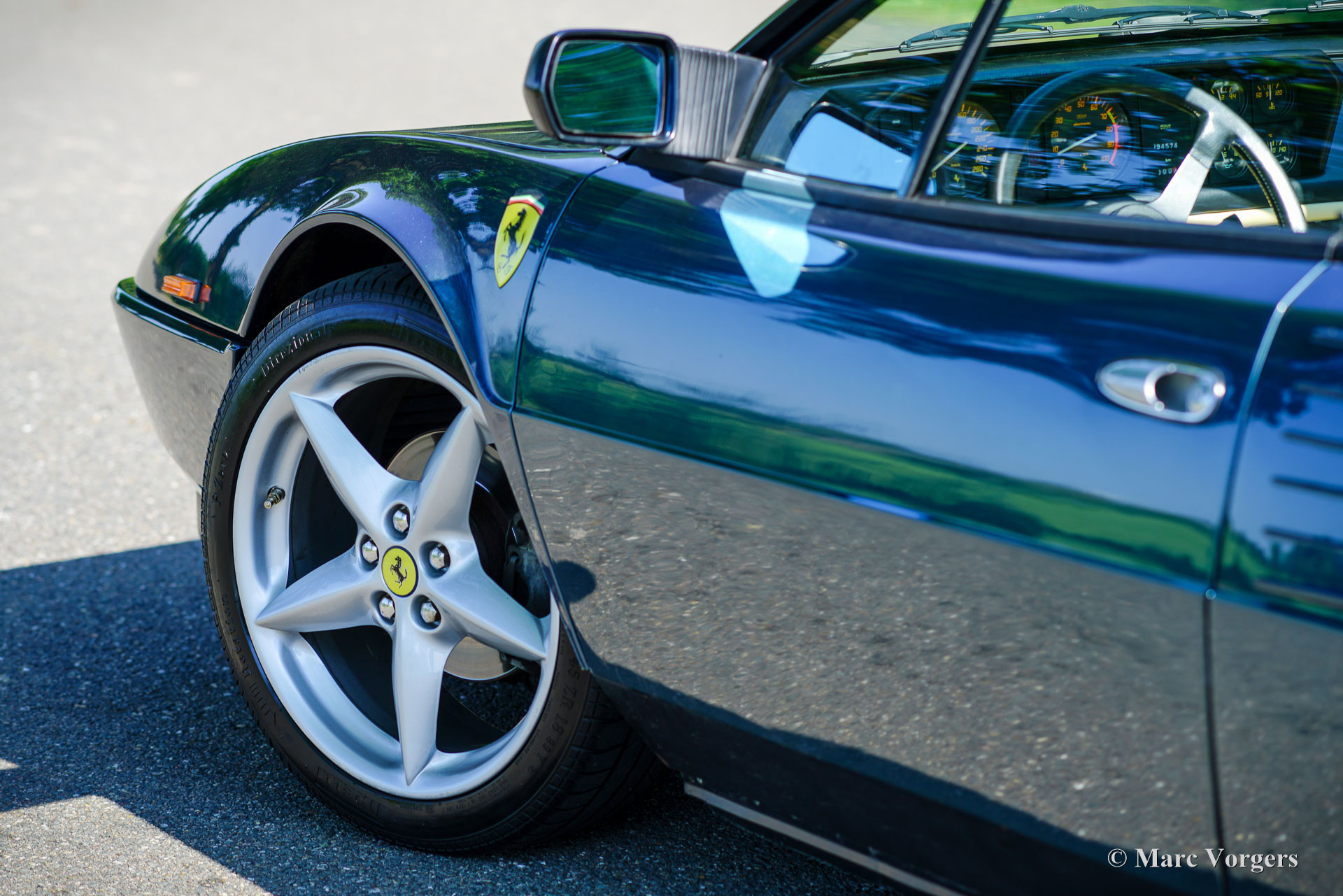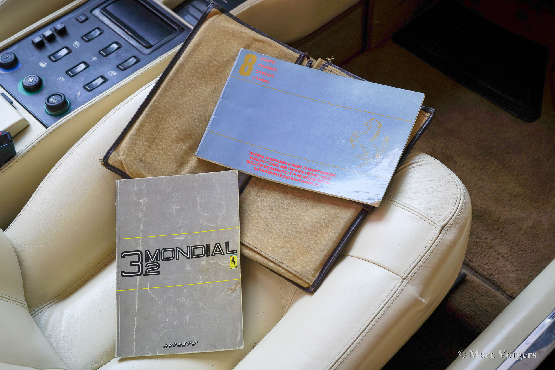 Ferrari Mondial 3.2 QV Cabriolet, année 1986. Couleur bleu foncé métallisé (Blu-Chiaro) combinée à un intérieur en cuir beige pâle garni de moquette brun pâle. Capote et couvre-capot noirs. Cette fantastique Ferrari Mondial 3.2 QV Cabriolet fut vendue neuve en Allemagne. En 2014, la voiture fut exportée en Belgique, maintenant la Ferrari est immatriculée aux Pays-Bas. La Ferrari Mondial fait partie de la famille de modèles de voitures de sport Ferrari F108 équipées d'un moteur V8 à 90 degrés monté transversalement. Conçu par Pininfarina, le Mondial respire le style Ferrari élégant des années 1980 avec les phares escamotables, la calandre horizontale et les quatre feux arrière ronds. Cette Ferrari Mondial a parcouru 94 580 kilomètres depuis neuve. La voiture est dans un bon état d'origine et montre tous les détails d'origine. La dernière révision complète fut exécutée à 82500 kilomètres en Belgique. Nous livrerons la voiture équipée d'une nouvelle courroie de distribution. Cette Ferrari Mondial roule et se manie délicieusement, et l'expérience de conduite à ciel ouvert est tout simplement fantastique ! La combinaison de couleurs est superbe, l'intérieur en cuir beige clair contraste joliment avec la peinture bleu vif métallisé. Le look est amélioré par les merveilleuses jantes en alliage Ferrari 360. Le fiable moteur V8 de 3,2 litres à 32 soupapes délivre une belle puissance de 271 ch à 7 000 tr/min. La note d'échappement est magnifique grâce à un système d'échappement spécial ! Seulement 810 exemplaires de ce modèle Ferrari Mondial 3.2 QV Cabriolet furent construits. Une Ferrari V8 décapotable désirable !