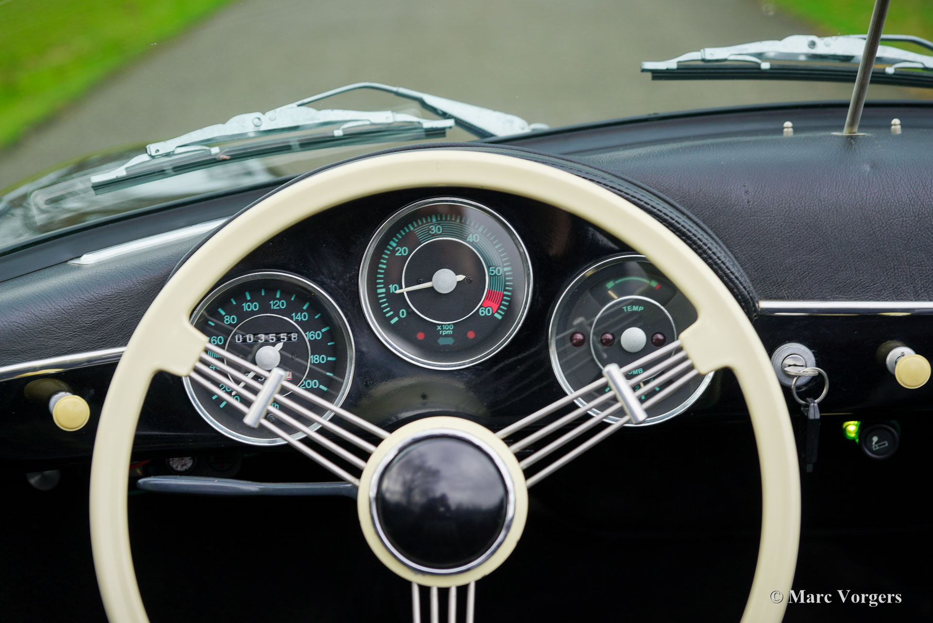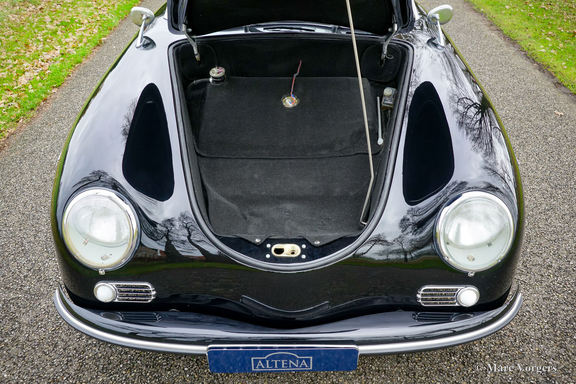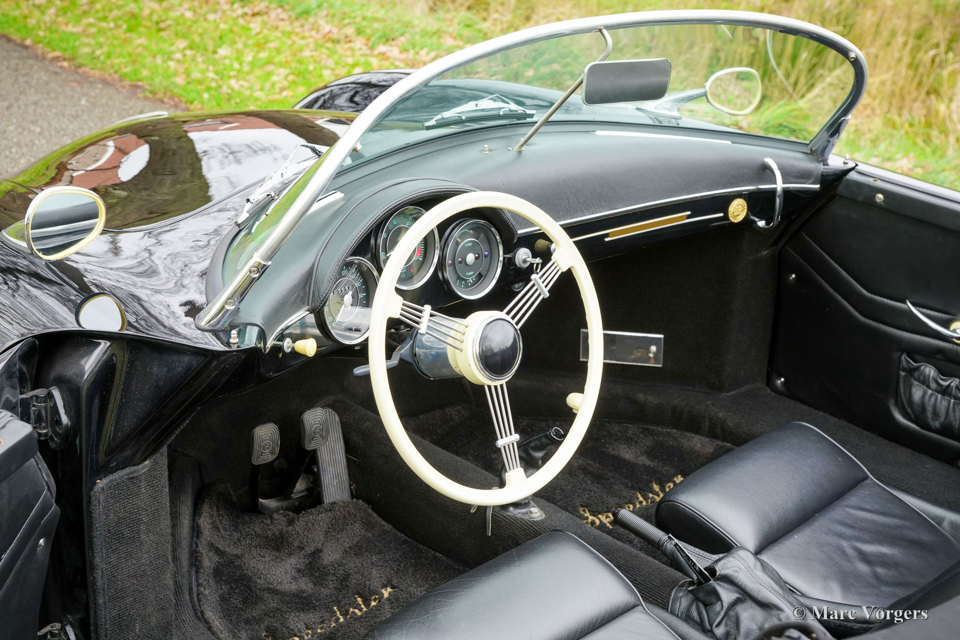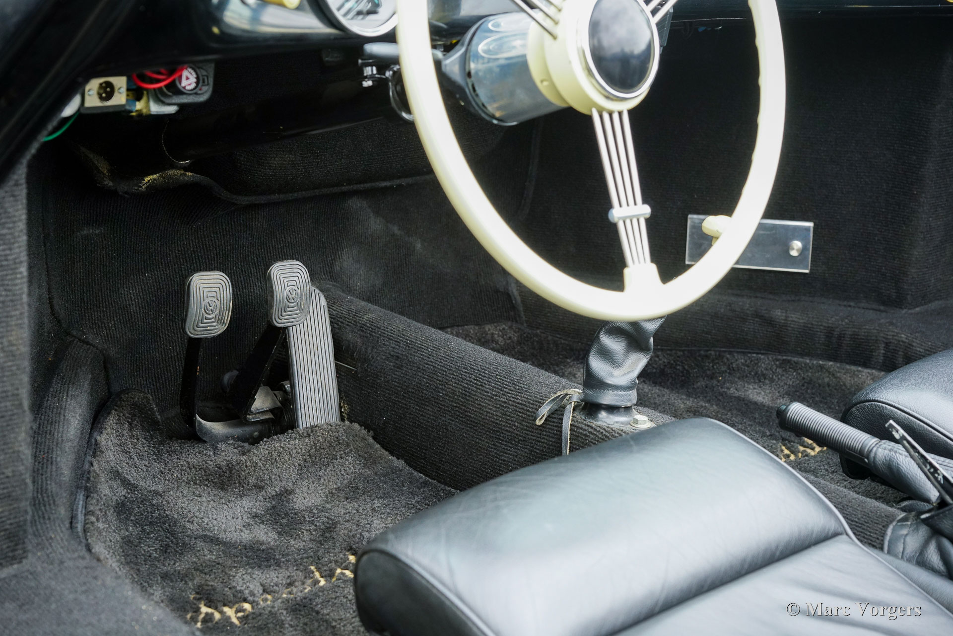 Réplique de 356 Speedster, année 1965. Arborant une superbe finition « triple noir » avec carrosserie, intérieur et capote noirs, cette magnifique réplique de 356 Speedster est tout simplement époustouflante ! Construite sur un châssis de Coccinelle VW de 1965 raccourci, cette superbe réplique présente une carrosserie sculptée à l’identique de la 356 A Speedster originale (avec son pare-brise incurvé) produite par Porsche entre 1955 et 1959. Elle est réalisée en fibre de verre (PRV) et non en métal. Tous les détails extérieurs et intérieurs reproduits sont fidèles à l’original : tableau de bord, instruments, volant, levier de vitesses, poignées de porte, logos et badges (absents des photos), phares avant et arrière, jantes et enjoliveurs. Les tapis de sol moelleux, ajoutés ultérieurement, apportent une touche de confort à cette sportive au style épuré. Le moteur boxer quatre cylindres VW refroidi par air offre des performances dynamiques et une sonorité impressionnante. Cette réplique de 356 Speedster est en superbe état ; elle ne présente que de légères traces d'utilisation. Elle est équipée d'une capote en mohair noir, d'un couvre-tonneau et de vitres latérales, et est immatriculée aux Pays-Bas. Seuls 4 144 exemplaires environ (dont 2 910 modèles A) de la Porsche 356 Speedster originale furent produits par Porsche. Ces voitures sont rares, très recherchées et, par conséquent, très chères. Une belle réplique est tout à fait abordable et peut constituer une alternative idéale pour ceux qui souhaitent profiter de la beauté, du style et des sensations de conduite uniques d'une 356 Speedster. Ce magnifique exemplaire est si parfait qu'un spécialiste ne pourra le distinguer d'un modèle original qu'à l'extérieur.