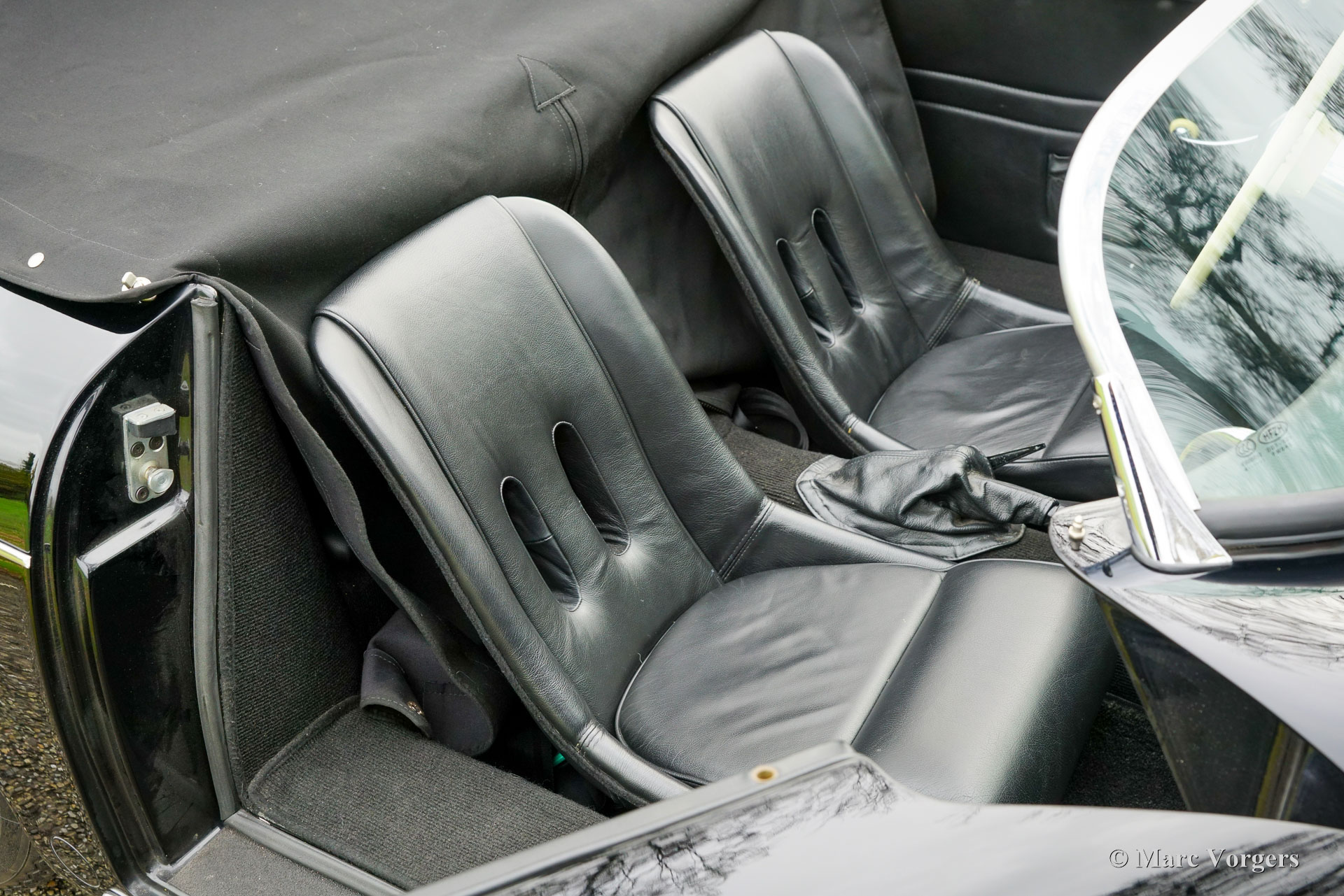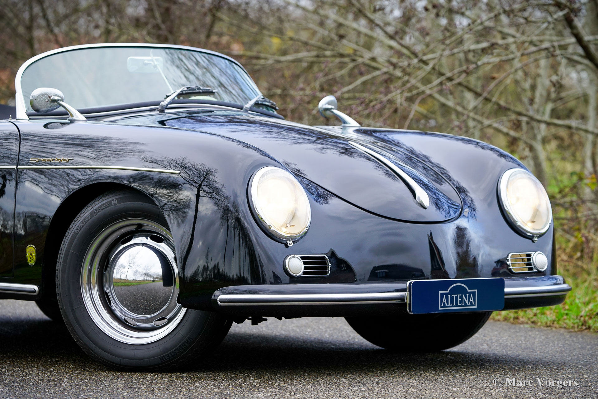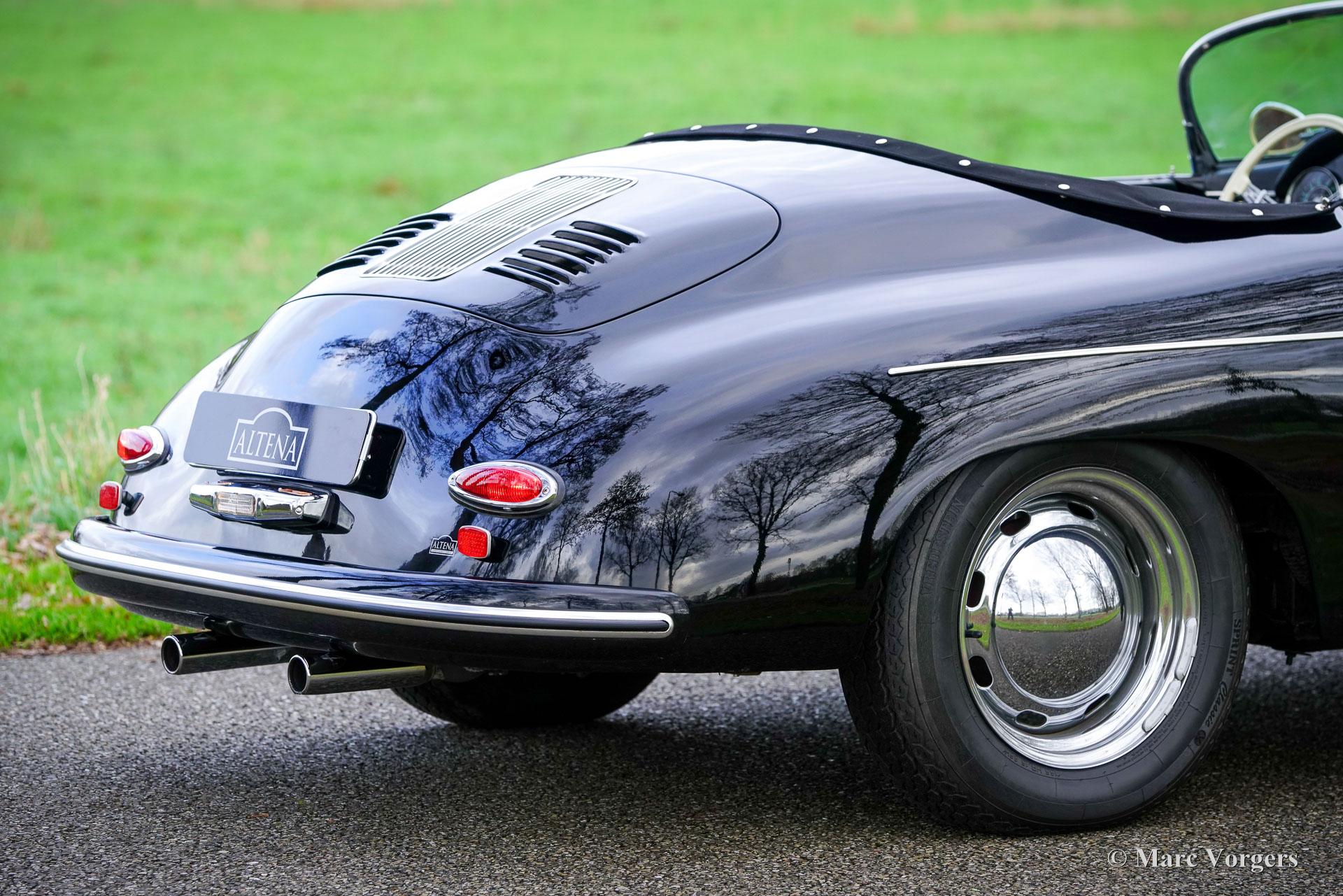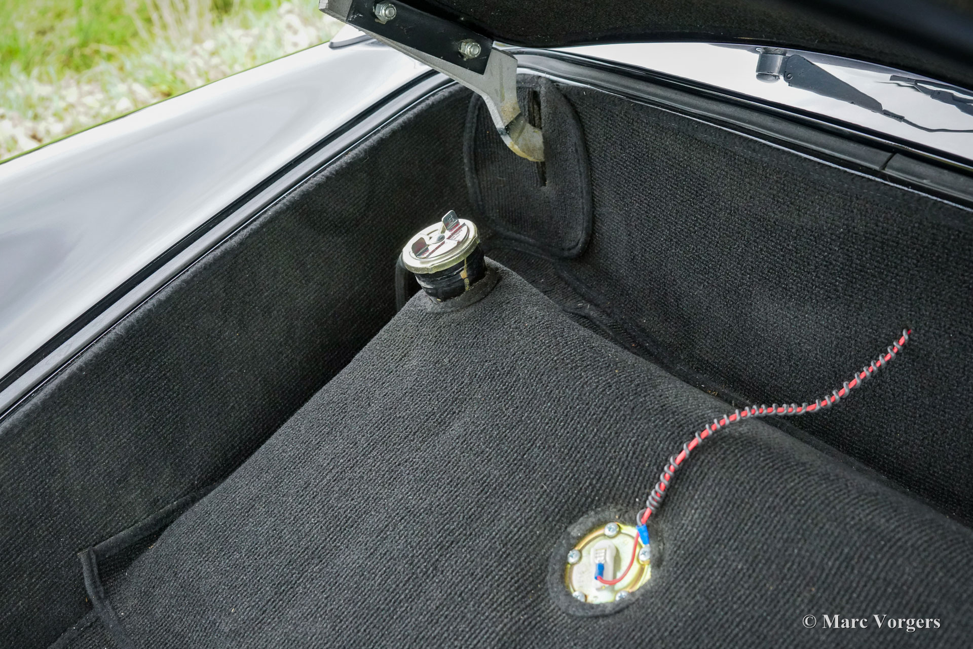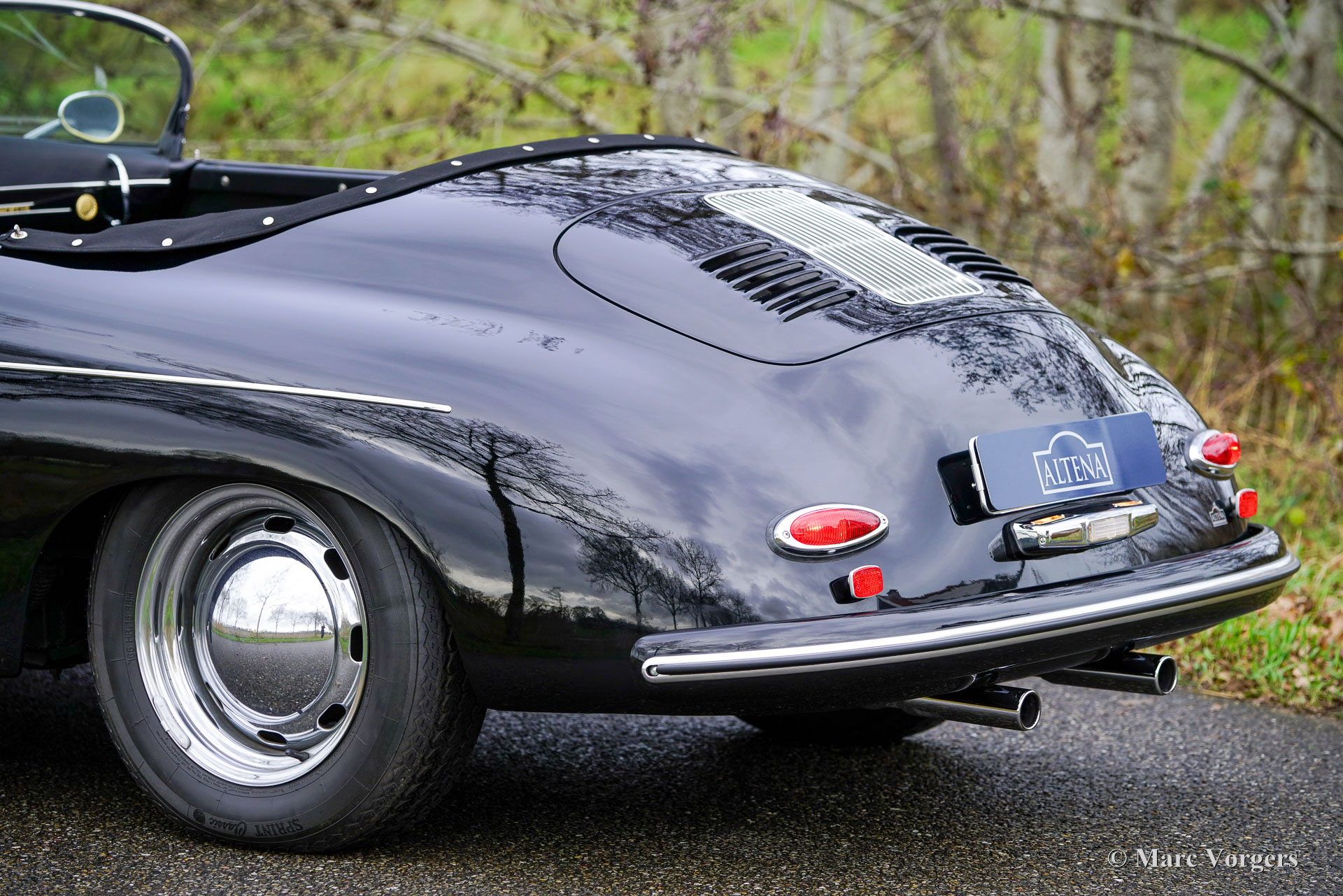 Réplique de 356 Speedster, année 1965. Arborant une superbe finition « triple noir » avec carrosserie, intérieur et capote noirs, cette magnifique réplique de 356 Speedster est tout simplement époustouflante ! Construite sur un châssis de Coccinelle VW de 1965 raccourci, cette superbe réplique présente une carrosserie sculptée à l’identique de la 356 A Speedster originale (avec son pare-brise incurvé) produite par Porsche entre 1955 et 1959. Elle est réalisée en fibre de verre (PRV) et non en métal. Tous les détails extérieurs et intérieurs reproduits sont fidèles à l’original : tableau de bord, instruments, volant, levier de vitesses, poignées de porte, logos et badges (absents des photos), phares avant et arrière, jantes et enjoliveurs. Les tapis de sol moelleux, ajoutés ultérieurement, apportent une touche de confort à cette sportive au style épuré. Le moteur boxer quatre cylindres VW refroidi par air offre des performances dynamiques et une sonorité impressionnante. Cette réplique de 356 Speedster est en superbe état ; elle ne présente que de légères traces d'utilisation. Elle est équipée d'une capote en mohair noir, d'un couvre-tonneau et de vitres latérales, et est immatriculée aux Pays-Bas. Seuls 4 144 exemplaires environ (dont 2 910 modèles A) de la Porsche 356 Speedster originale furent produits par Porsche. Ces voitures sont rares, très recherchées et, par conséquent, très chères. Une belle réplique est tout à fait abordable et peut constituer une alternative idéale pour ceux qui souhaitent profiter de la beauté, du style et des sensations de conduite uniques d'une 356 Speedster. Ce magnifique exemplaire est si parfait qu'un spécialiste ne pourra le distinguer d'un modèle original qu'à l'extérieur.
