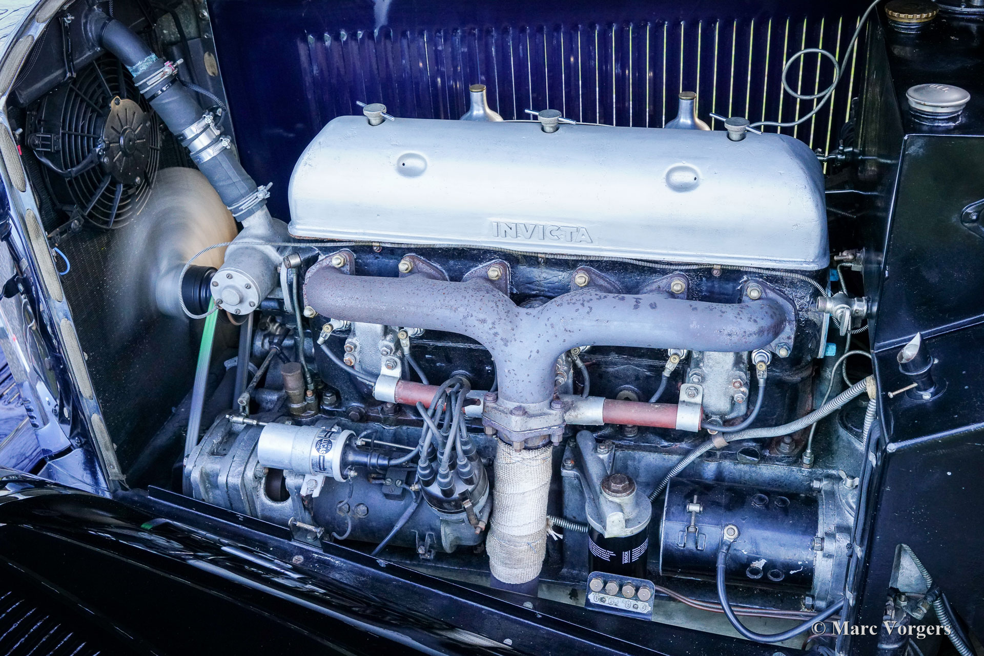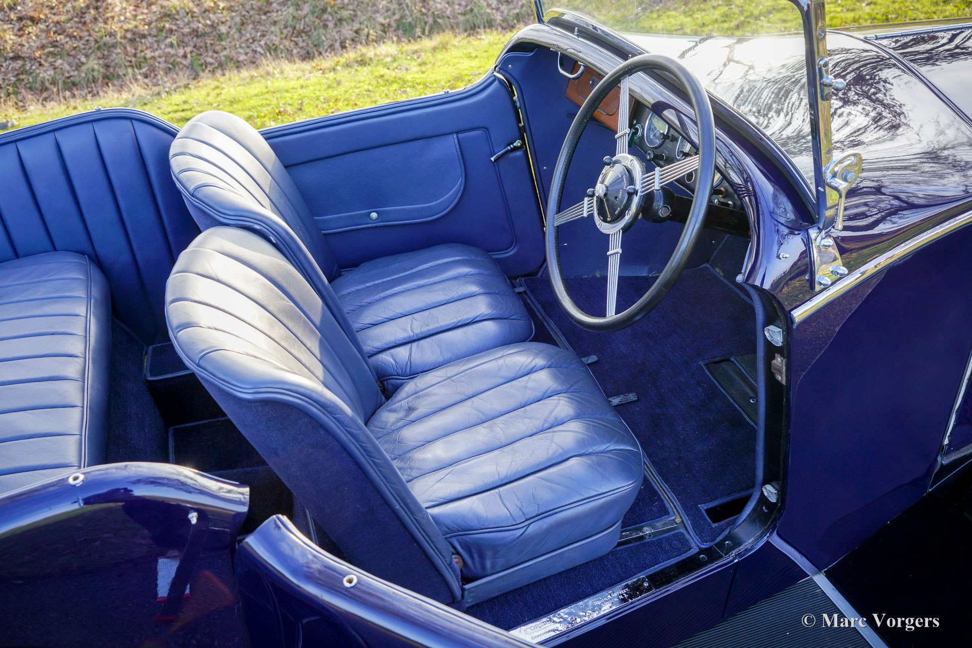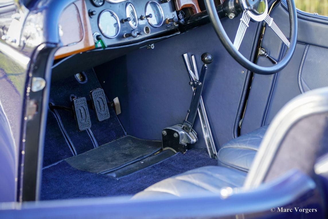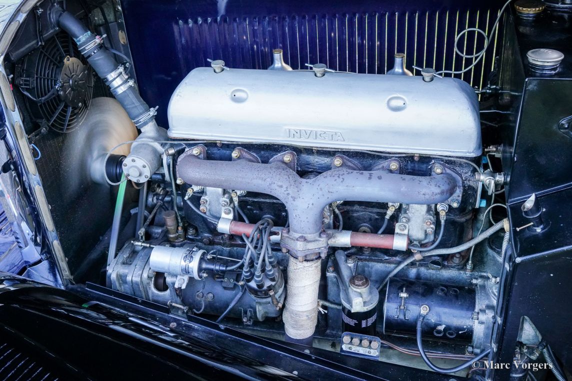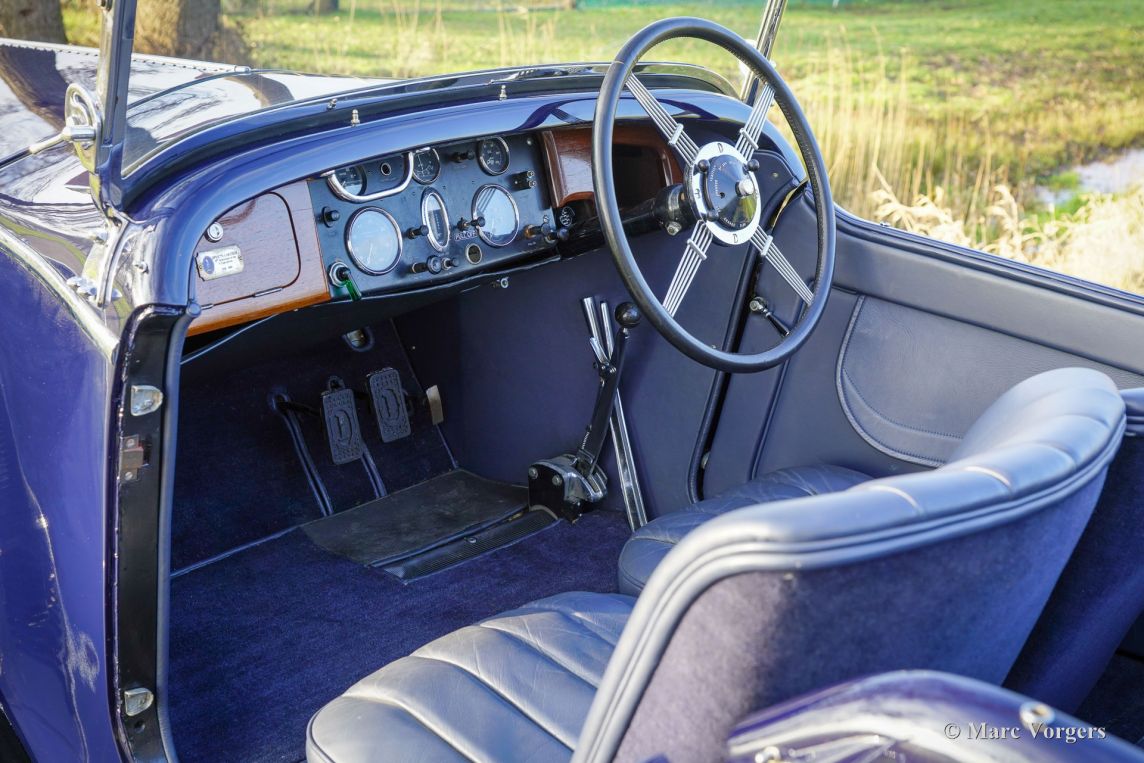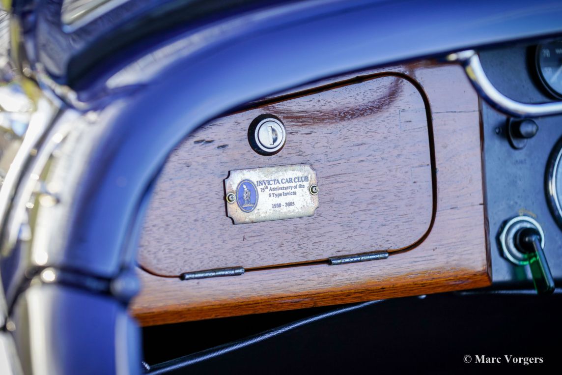 Invicta 4½ Litres (série A), année 1931 (première immatriculation le 2 janvier 1931, année de construction : 1930). Numéro de châssis A204, numéro de moteur 7918. Couleur extérieure : bleu Oxford, châssis noir et roues à rayons noires. Intérieur en cuir bleu, moquette bleue et capote en mohair noir. Dans les années 1920, Invicta s’est forgé une réputation d’excellence en matière de performances et de tenue de route. Avec l’introduction du modèle 4½ Litres, une légende est née. Ce modèle haut de gamme, très onéreux, était réputé pour ses performances sportives et son accélération exceptionnelle. L’Invicta 4½ Litres fut produite en très petite série ; les archives de l’usine et des clubs indiquent qu’environ 50 exemplaires furent construits au total. La production s’est déroulée entre 1930 et 1933, et le modèle fut proposé en plusieurs versions, dont le châssis bas et, plus tard, le type S. Les carrosseries étaient fournies par une variété de carrossiers de renom tels que Vanden Plas, Corsica, Lancefield et autres, ce qui explique certaines variations dans les chiffres rapportés. Cette production extrêmement faible, combinée à la conception avancée du modèle et à son pedigree en compétition, explique la réputation de l'Invicta 4½ Litres comme l'une des voitures de sport britanniques les plus rares et les plus recherchées de l'avant-guerre. Le modèle 4½ Litres présenté ici, châssis A204, conserve sa carrosserie d'origine de tourer quatre places décapotable signée Corsica de Londres. Restaurée par le passé, elle a conservé de magnifiques détails d'origine. Sous le capot, qui abrite le puissant moteur six cylindres en ligne Meadows de 110 ch, on trouve également le système de lubrification centralisée d'origine et un ventilateur de refroidissement supplémentaire. La boîte de vitesses à quatre rapports est associée à un overdrive Tim Payne. Le tableau de bord présente une série de superbes instruments d'origine (dont une jauge à essence très spéciale) et un instrument d'un modèle plus récent. L'intérieur fut récemment refait à neuf et est en excellent état. Cette rarissime Invicta 4½ litres série A provient d'une collection privée. La voiture roule parfaitement et est vendue avec un historique complet. Cette Invicta 4½ litres Corsica Tourer réunit toutes les qualités recherchées : performance, style et rareté.