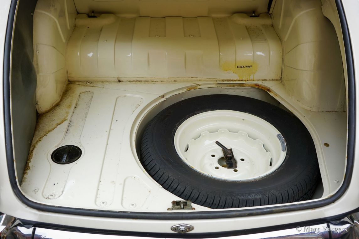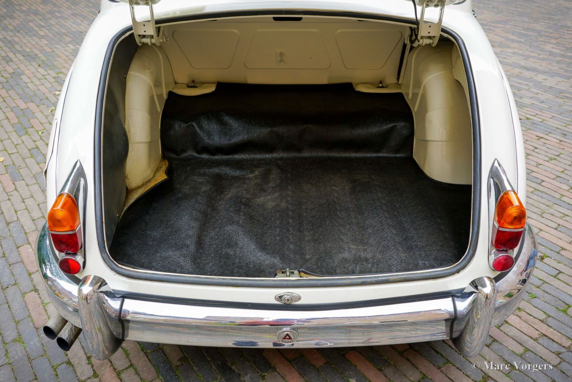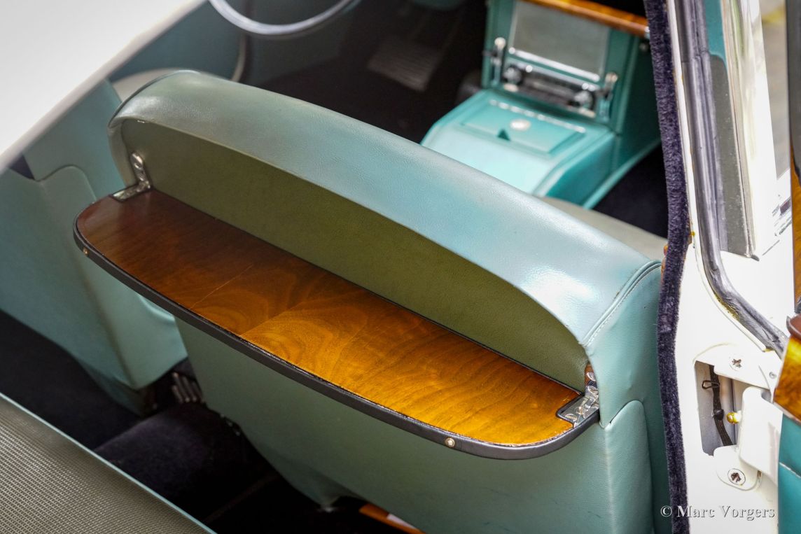 Jaguar MK II 3,8 litres automatique, année 1962. Carrosserie Old English White associée à un intérieur bicolore tissu gris/vinyle bleu aigue-marine, agrémenté de moquette noire. Cette magnifique Jaguar MK II 3,8 litres fut importée aux Pays-Bas le 14 juillet 2010. Son propriétaire actuel l'a acquise le 6 avril 2017. La boîte automatique fut réparée en 2017 et la pompe de direction fut inspectée. Le compteur affichait 840 km. En juin 2019, la voiture a bénéficié d'une révision chez un spécialiste Jaguar aux Pays-Bas. Plusieurs fuites d'huile furent réparées, la dynamo révisée, régulateur de courant et de tension remplacé et réglé, les silentblocs moteurs remplacés, les carburateurs nettoyés et révisés avec de nouvelles aiguilles, et le réservoir de carburant remplacé. La boîte automatique a ensuite été entièrement révisée. De nouveaux garde-boue Lucas Fog fut également installé. 15 000 € ont été investis en réparations et entretien depuis 2017. Cette Jaguar vintage est en très bon et merveilleux état intérieur comme extérieur. Seules les extrémités inférieures arrière des « garde-boue » au-dessus des roues arrière présentent de minuscules points de corrosion. Faisant partie d'une collection de voitures classiques, la Jaguar fut peu utilisée, le compteur kilométrique indique maintenant 2023 miles. La Jaguar Mk II 3,8 litres a été lancée en 1959. La MK II était une berline britannique raffinée qui allie confort et performances remarquables pour l'époque. Propulsée par le moteur haut de gamme Jaguar XK 3,8 litres à six cylindres en ligne de 220 ch, elle offrait une forte accélération (un peu moins de 10 secondes de 0 à 100 km/h avec la boîte automatique Borg Warner à 3 rapports) et une expérience de conduite douce, ce qui la rendait populaire auprès des propriétaires privés les plus aisés et de la police. De plus, la guilde des voleurs appréciait la MK II ; « “Pure wheels for outrunnin' the Dibble.” » Cet exemplaire présente un magnifique intérieur d'origine dans une superbe palette de couleurs des années 1960. Le tableau de bord en bois et les autres finitions en bois, somptueusement exposés, confèrent à l'intérieur une touche d'exclusivité et d'élégance. La voiture est équipée d'une radio AM Radiomobile d'origine. Ce véhicule est disponible pour visite et essai sur rendez-vous uniquement.