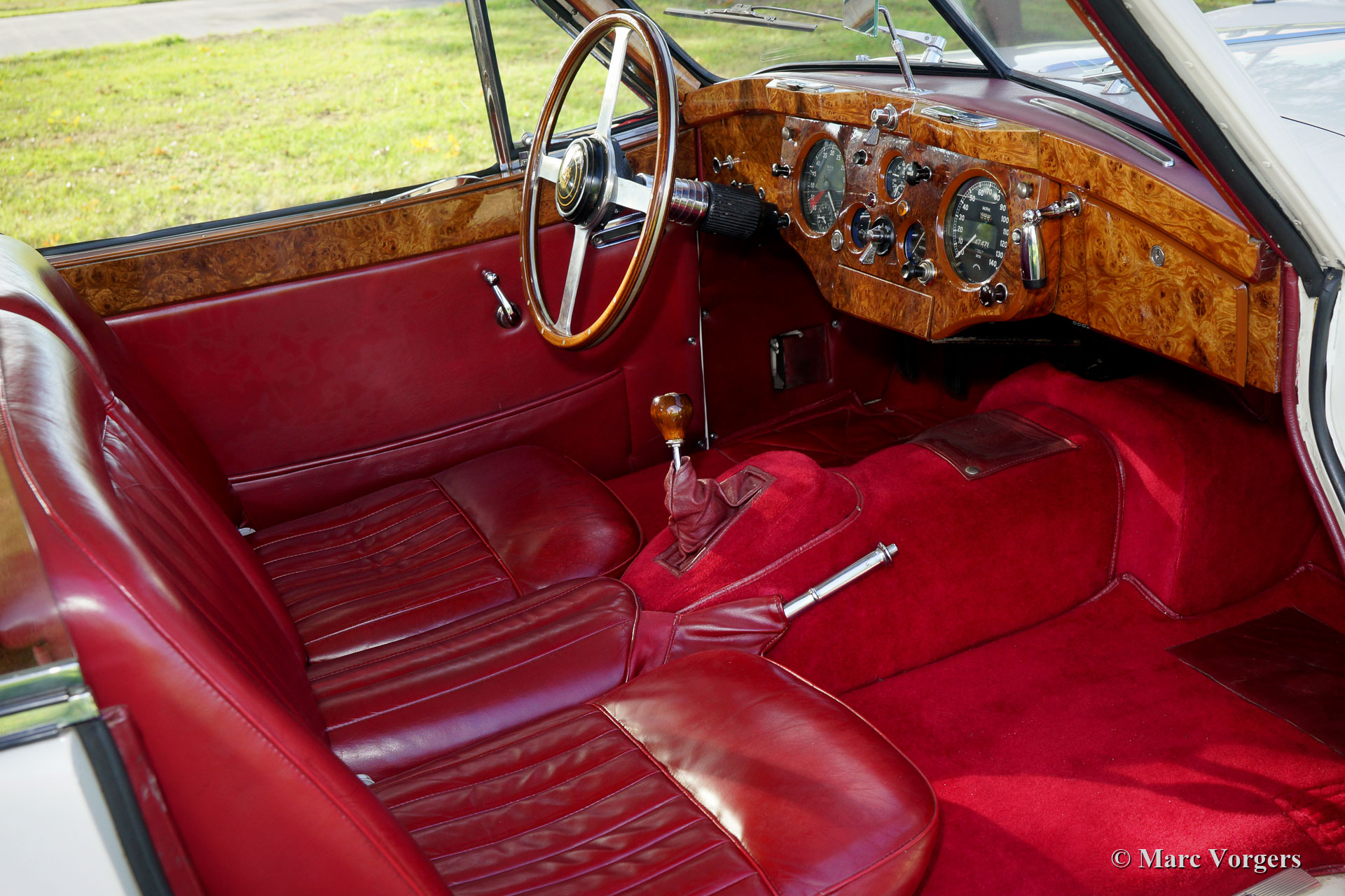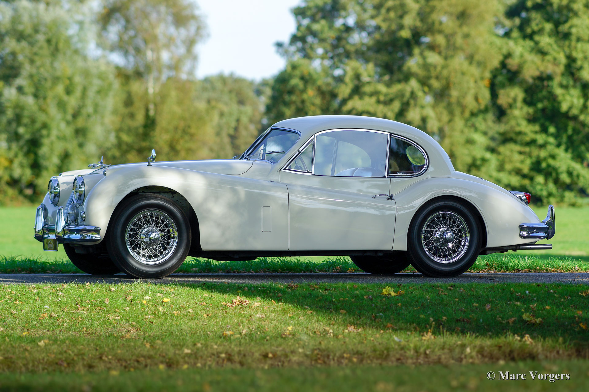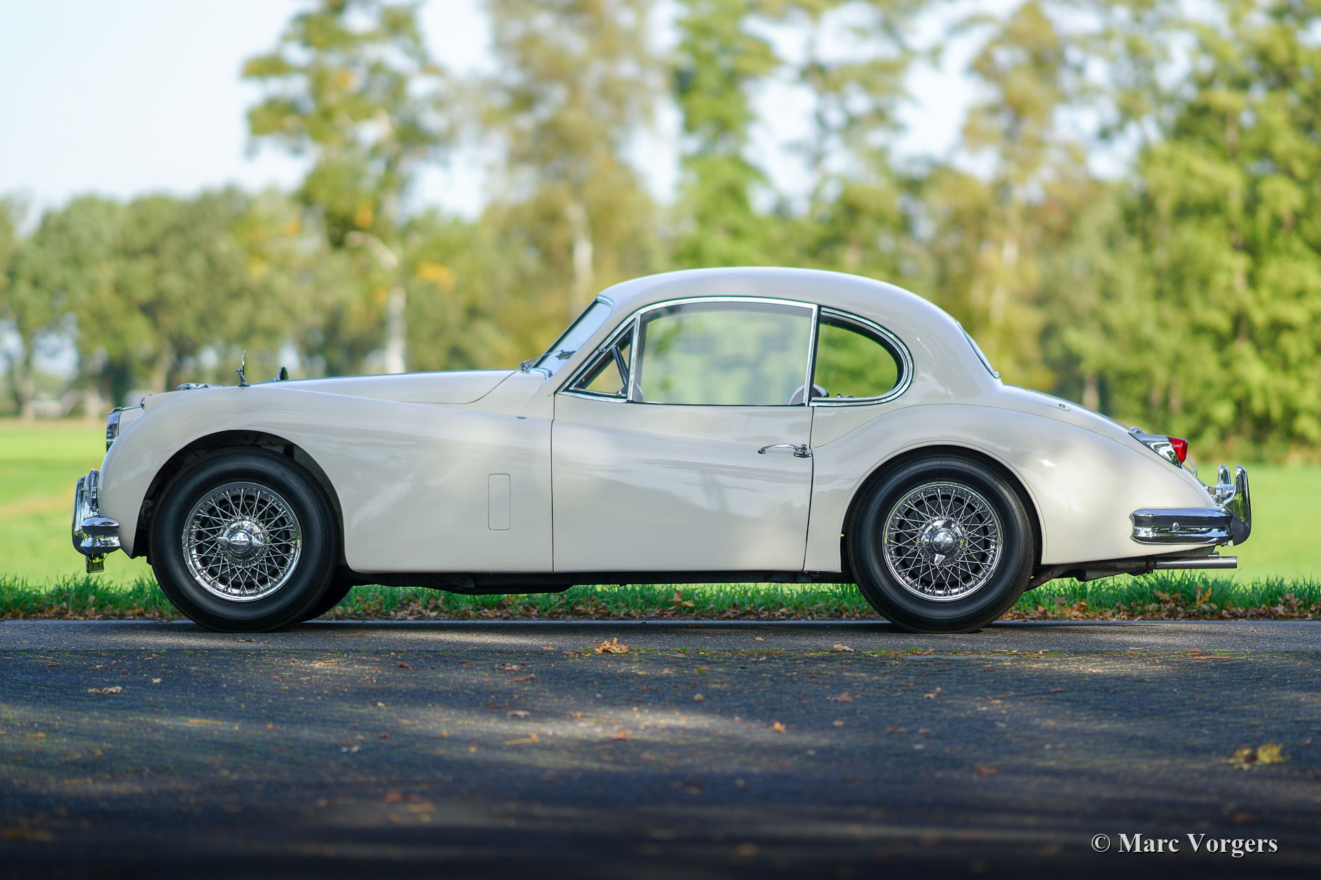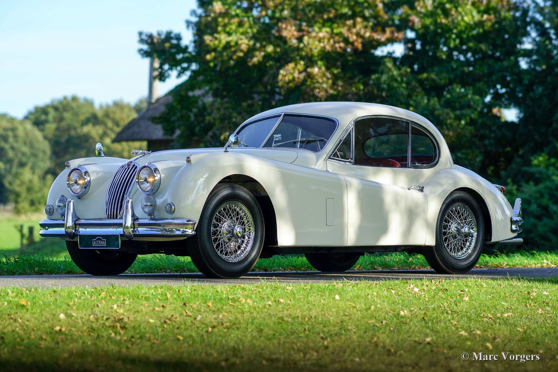 Jaguar XK 140 FHC, année 1957. Numéro de châssis 48158712XX, numéro de carrosserie J669X, numéro de moteur G9293-X, numéro de boîte de vitesses JLE36339XX. Couleur Old English White combiné avec un intérieur en cuir rouge. Cette superbe Jaguar XK 140 FHC (Fixed Head Coupé) a été enregistrée aux Pays-Bas en 2000. La Jaguar fut restaurée détaillée dans le passé et la voiture est en excellent état ! De plus, la voiture roule à merveille ! Cette Jaguar XK 140 FHC affiche tous les détails d'origine. À l'intérieur, vous trouverez le magnifique tableau de bord en bois et un volant de sport Moto Lita d'époque avec jante en bois. En outre, la voiture est équipée de phares antibrouillard Lucas SFT 576 d'époque et de roues à rayons. C'est une Jaguar XK 140 FHC très originale en excellent état ! L'automobile est livrée avec des documents néerlandais (UE). La voiture peut être exportée / importée dans le monde entier.