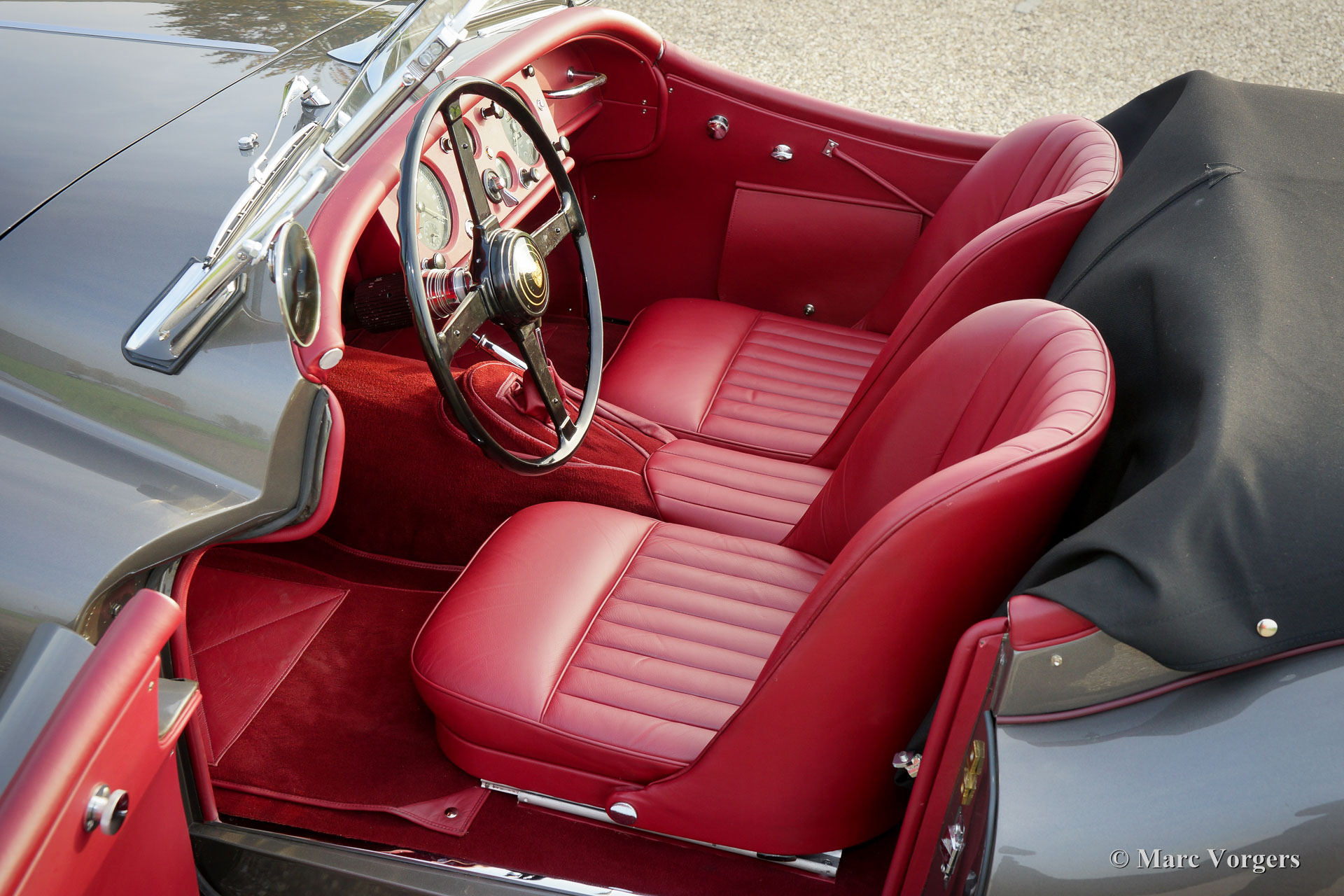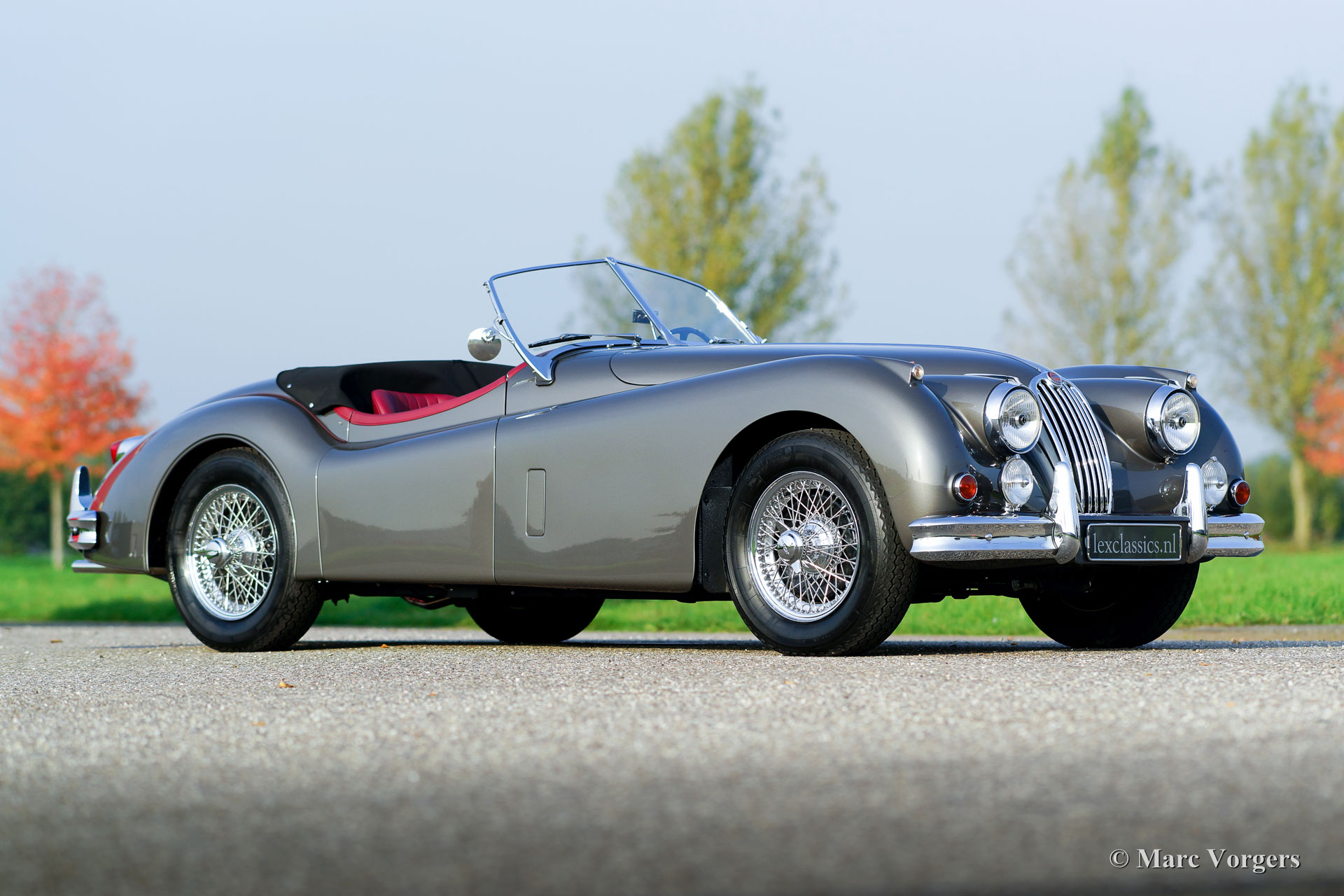 Jaguar XK 140 OTS, année 1957. Couleur 'Gun Metal' gris métallisé avec un intérieur en cuir rouge et tapis rouge. Capot en mohair noir et un couvercle de tonneau noire. Cette formidable et magnifique XK 140 OTS (Open Two Seater, également nommée Roadster) a quitté l'usine Jaguar en 1956. La voiture fut vendue neuve à New York (USA) en 1957. Cet exemple parfait était restauré complètement et parfaitement 'body-off' aux Pays-Bas dans les années 2014 - 2017. Cette Jaguar XK 140 OTS est en superbe état de TOP ; Concours ! Un reportage photographique étendu et les factures de la restauration sont présents pour donner la preuve du travail de restauration approfondie. Pendant la restauration, la voiture a reçu des sièges baquets de période spéciale et une modification de la boîte à pédales pour créer de l'espace supplémentaire pour les conducteurs de grande taille. L'automobile est équipée du fameux moteur six cylindres en ligne de 3,4 litres XK qui développe 210 ch. L'alimentation des roues arrière est assurée par une boîte manuelle à quatre rapports. De plus, la voiture arbore des roues à rayons chromés, des écrous chromés «knock-off», deux rétroviseurs extérieurs et un ventilateur électrique Kenlow. C'est un spécimen TOP !