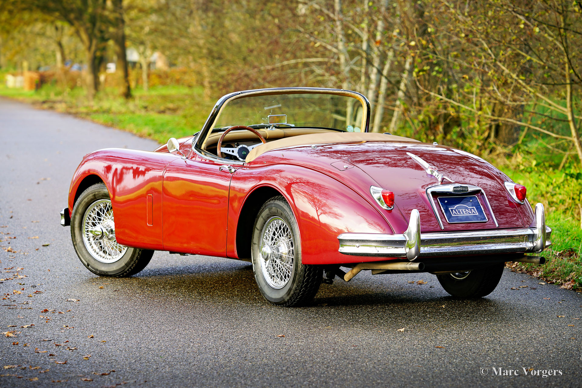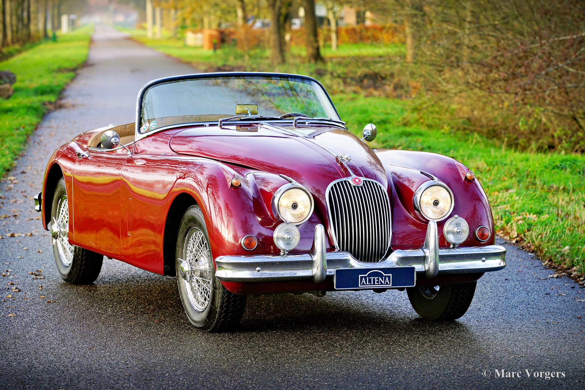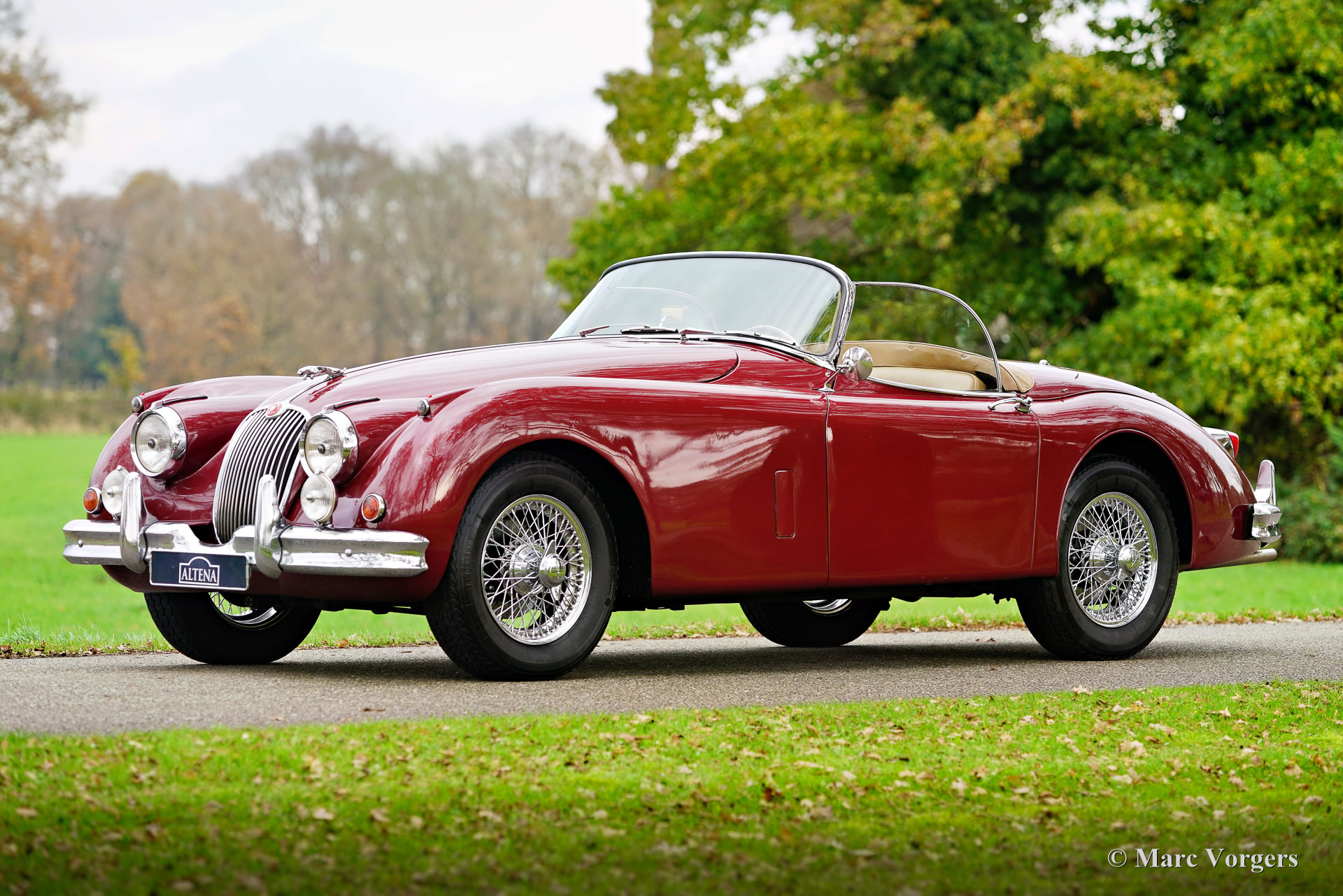Jaguar XK 150 OTS (Roadster), année 1958. Couleur rouge foncé métallisée combiné à un intérieur en cuir beige et à un tapis en laine assorti. La voiture est dotée d'une capote en mohair noir et d'un couvre-tonneau noir. Cette magnifique Jaguar XK 150 OTS (Open Two Seater, appelée « roadster » aux États-Unis) a été vendue neuve aux États-Unis. L'automobile fut expédiée aux Pays-Bas en 2010. Aux Pays-Bas, la voiture fut rénovée détaillée : la carrosserie fut perfectionnée et repeinte, et la mécanique de la voiture a été mise au goût du jour. Le moteur XK six cylindres fut remplacé par un exemplaire révisé, le moteur d'origine est toujours disponible. Une fois les travaux terminés, les propriétaires ont pleinement profité de la voiture pendant plusieurs années en découvrant les Alpes et une grande partie de l'Italie. Cette magnifique Jaguar XK 150 roadster est en bon à très bon état et la voiture se conduit à merveille. La voiture embraye, tourne et freine comme il se doit et le moteur tourne et sonne parfaitement. La voiture est équipée d'un overdrive, d'une paire de phares antibrouillard/de virage Lucas SFT576 et de jantes à rayons chromées de 16 pouces chaussées de pneus Vredestein Sprint Classic 185/16. Il s'agit d'une magnifique Jaguar XK 150 Roadster très recherchée à un rapport qualité/prix très intéressant. Un beau classique à savourer pleinement !