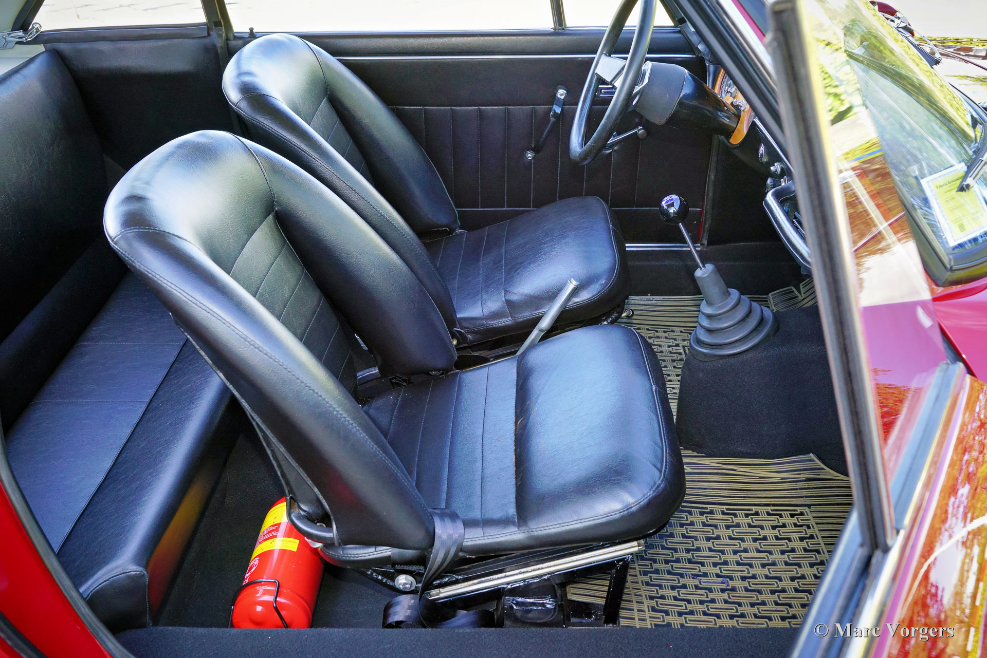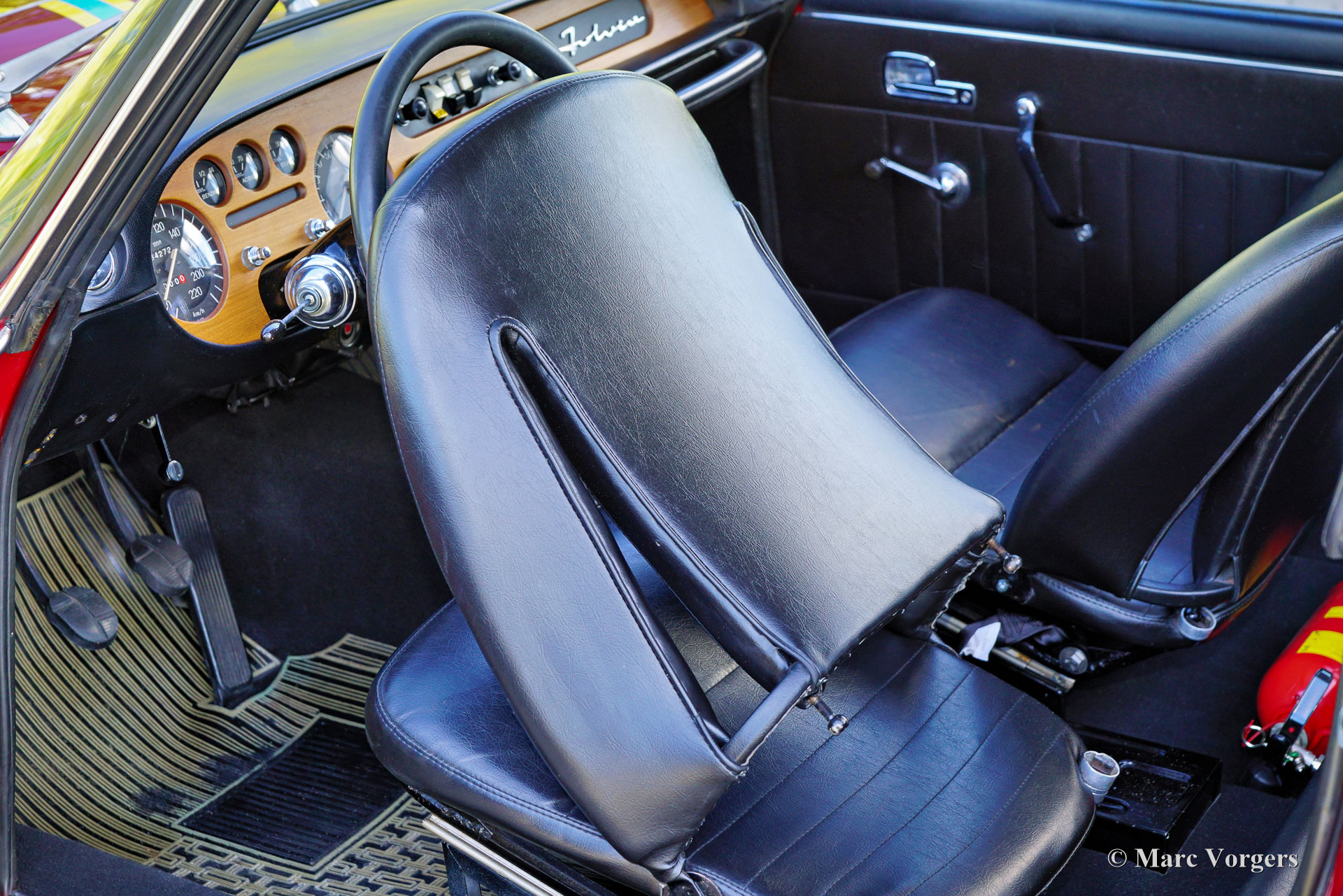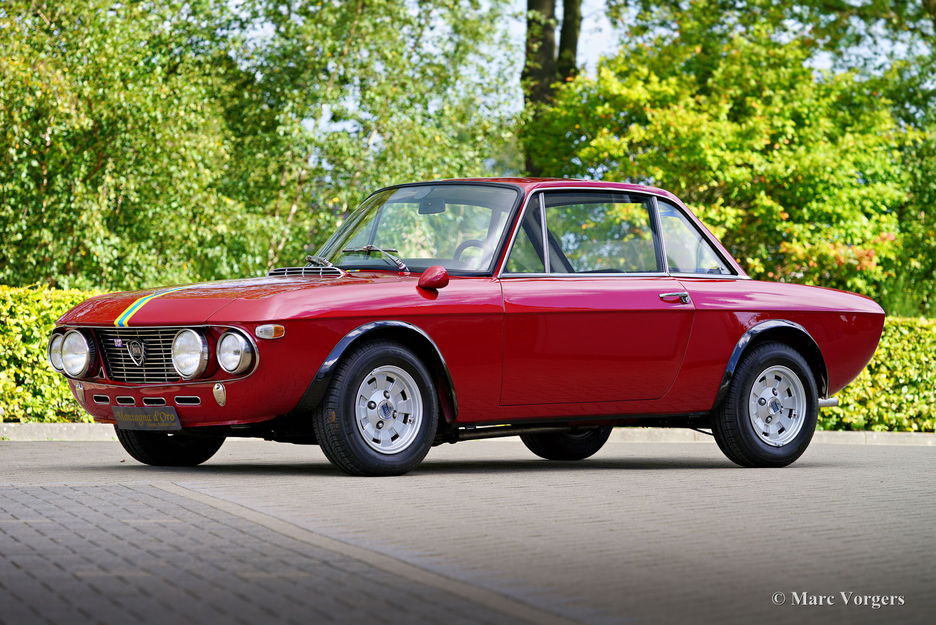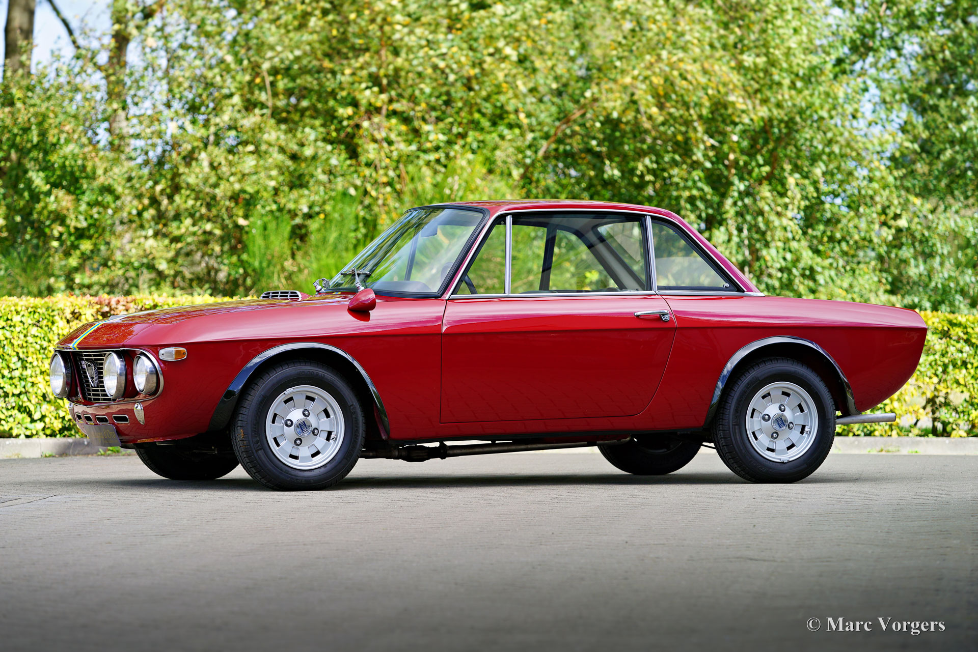 Lancia Fulvia Coupé 1600 HF « Fanalone », année 1971 (construite en 1970, première immatriculation le 3 février 1971). Numéro de châssis 818.540.001.101, numéro de moteur 818.540.226.4676. Couleur rouge foncé avec des bandes jaunes et bleues associées à un intérieur en similicuir noir et à une moquette noire. Cette Lancia Fulvia Coupé 1600 HF est le Saint Graal du programme. Il s’agit d’une version originale dite « Fanalone » (gros phares) dont seulement 1258 exemplaires furent construits de 1968 à 1970. Le moyen le plus simple de distinguer cette version spéciale est par les trous triangulaires entre les gros phares et la calandre. Cette version sportive originale est construite en utilisant beaucoup de panneaux en aluminium, une lunette arrière et des vitres latérales arrière en plexiglas, pas de pare-chocs et un intérieur minimal pour économiser du poids. Cette Lancia Fulvia fut restaurée détaillée dans le passé ; la voiture est dans un superbe état ! La voiture présente tous les détails d'origine et est équipée du volant spécial Ferrero d'origine avec l'autographe gravé de Sandro Munari (légendaire pilote de rallye Lancia). La carrosserie a reçu un traitement complet Waxoil des espaces creux. Le compteur kilométrique indique actuellement 64272 kilomètres. Récemment, la Lancia a reçu un entretien et un réglage approfondis de l'allumage et des carburateurs sur un dynamomètre (test Dyno). Le moteur délivre un très sain 133 ch (DIN).