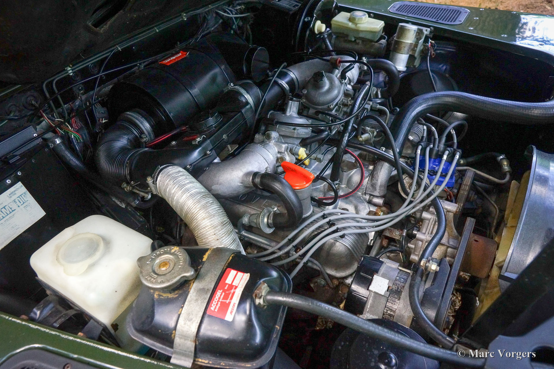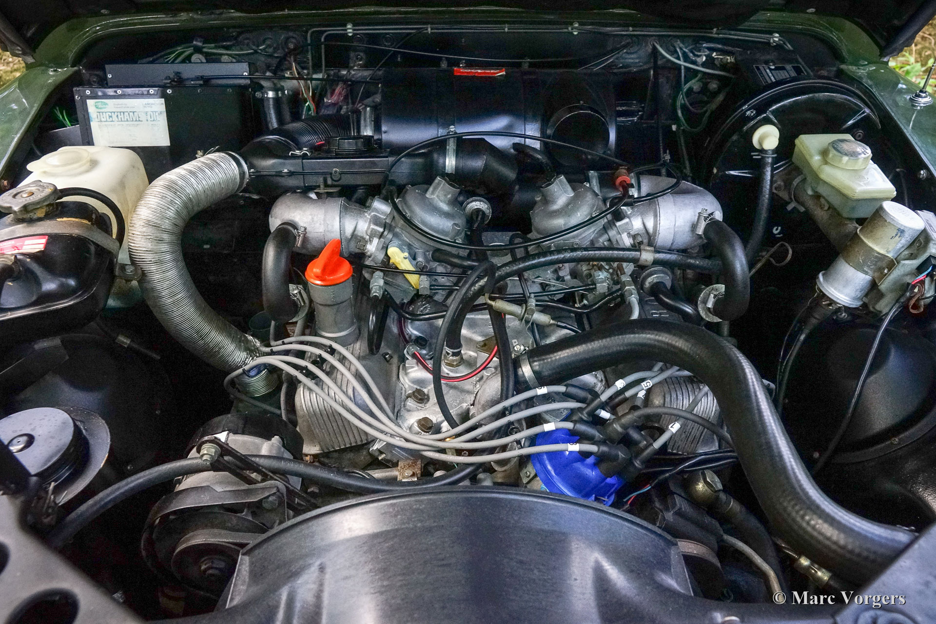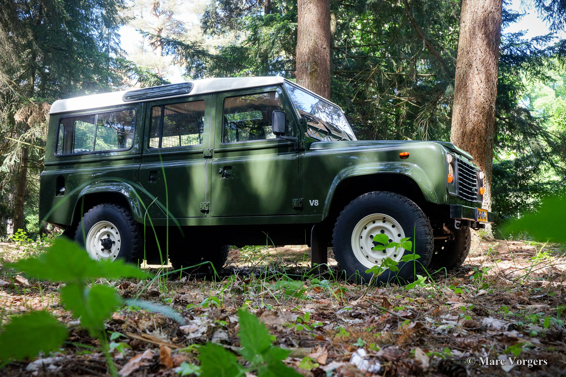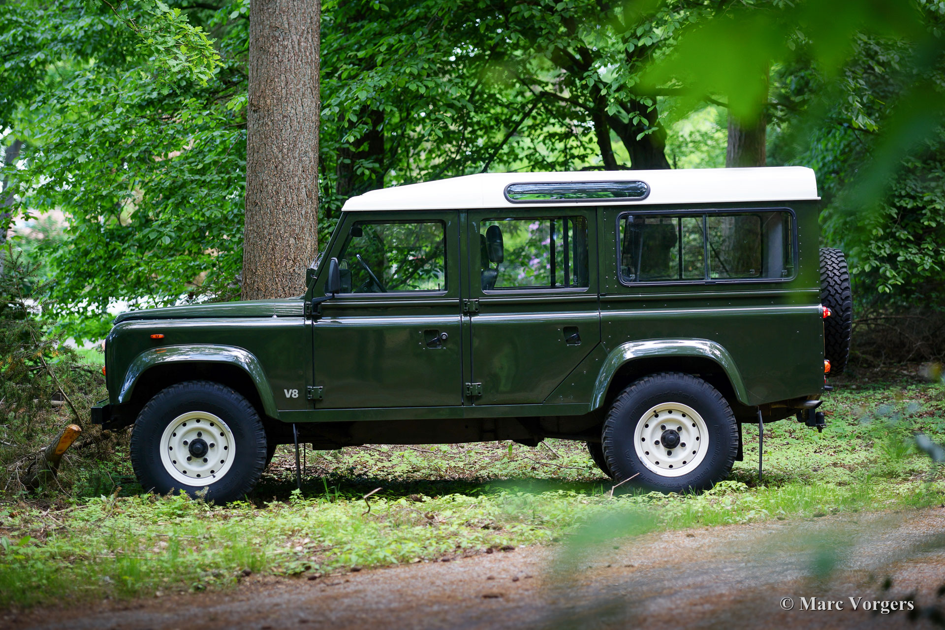Land Rover Defender 110 V8, année 1985. Couleur vert foncé avec un toit crème blanc et un intérieur noir. Cette Land Rover V8 Defender impressionnant et rare fut vendue neuf en Suisse. De Suisse, la voiture fut importée aux Pays-Bas. De nouveau, la voiture a parcouru 125.000 kilomètres. La voiture est magnifique et ne montre que de légères traces d'utilisation à l'intérieur. Le compartiment moteur a l'air presque neuve et le châssis est splendide ! Les panneaux en aluminium des portes montrent une certaine corrosion sous la peinture sur les bords. Il s'agit d'un modèle V8 long et rare, difficile à trouver et d'une grande joie à conduire et à posséder !