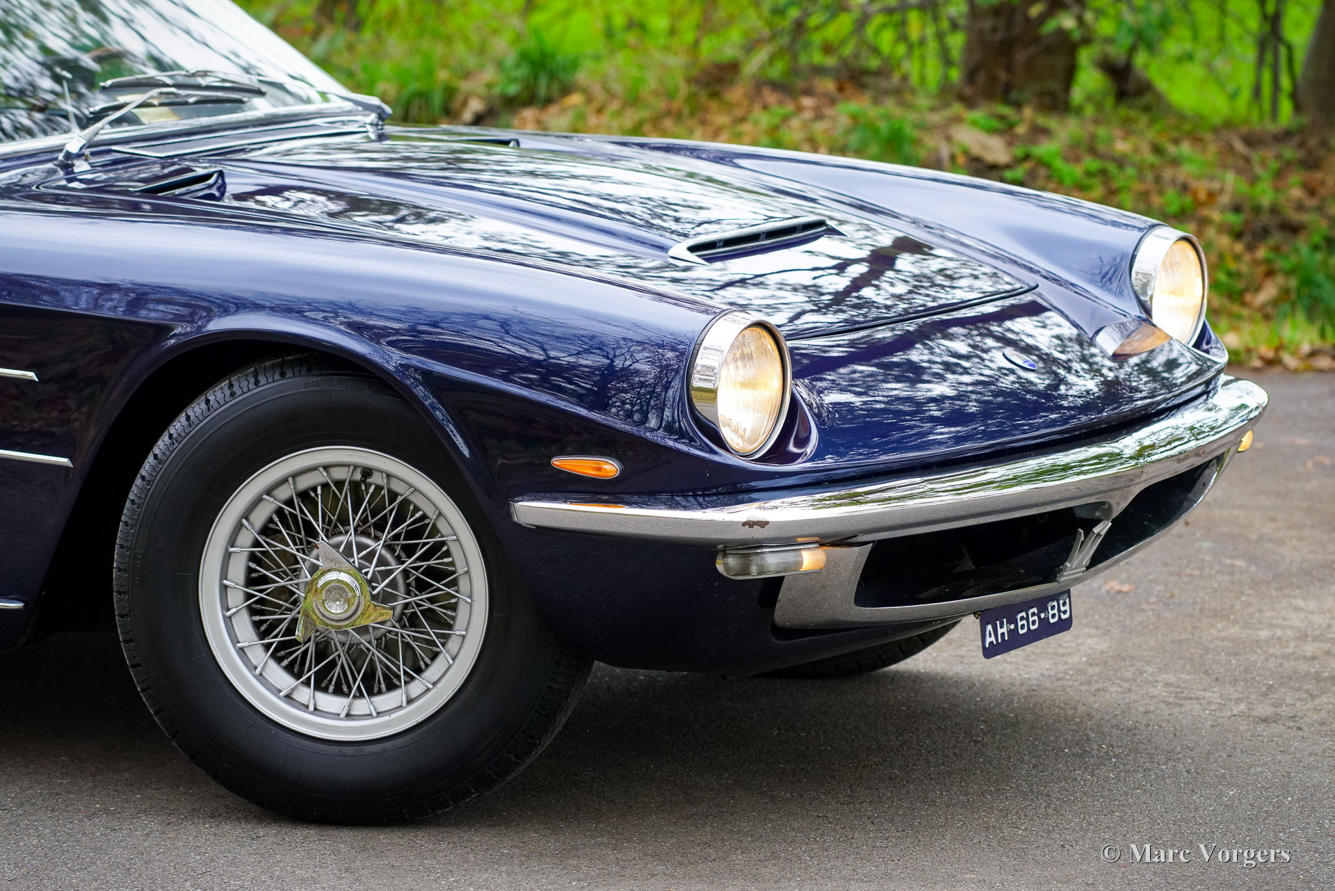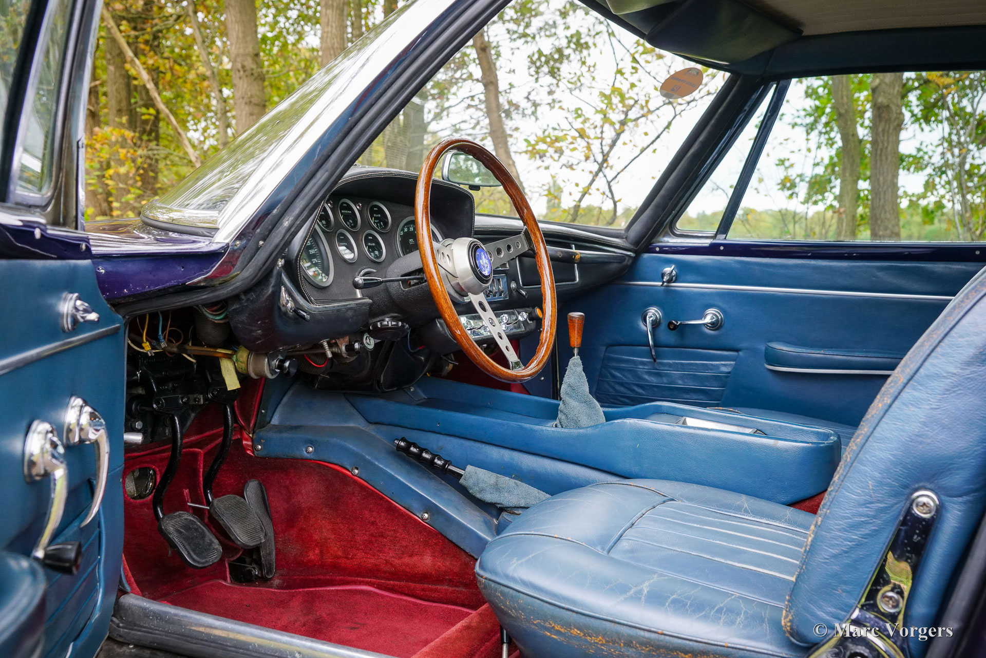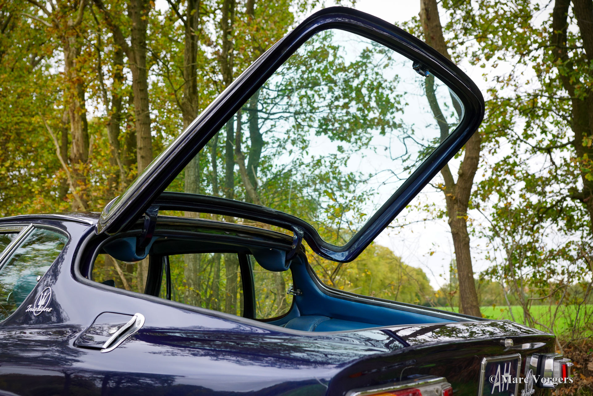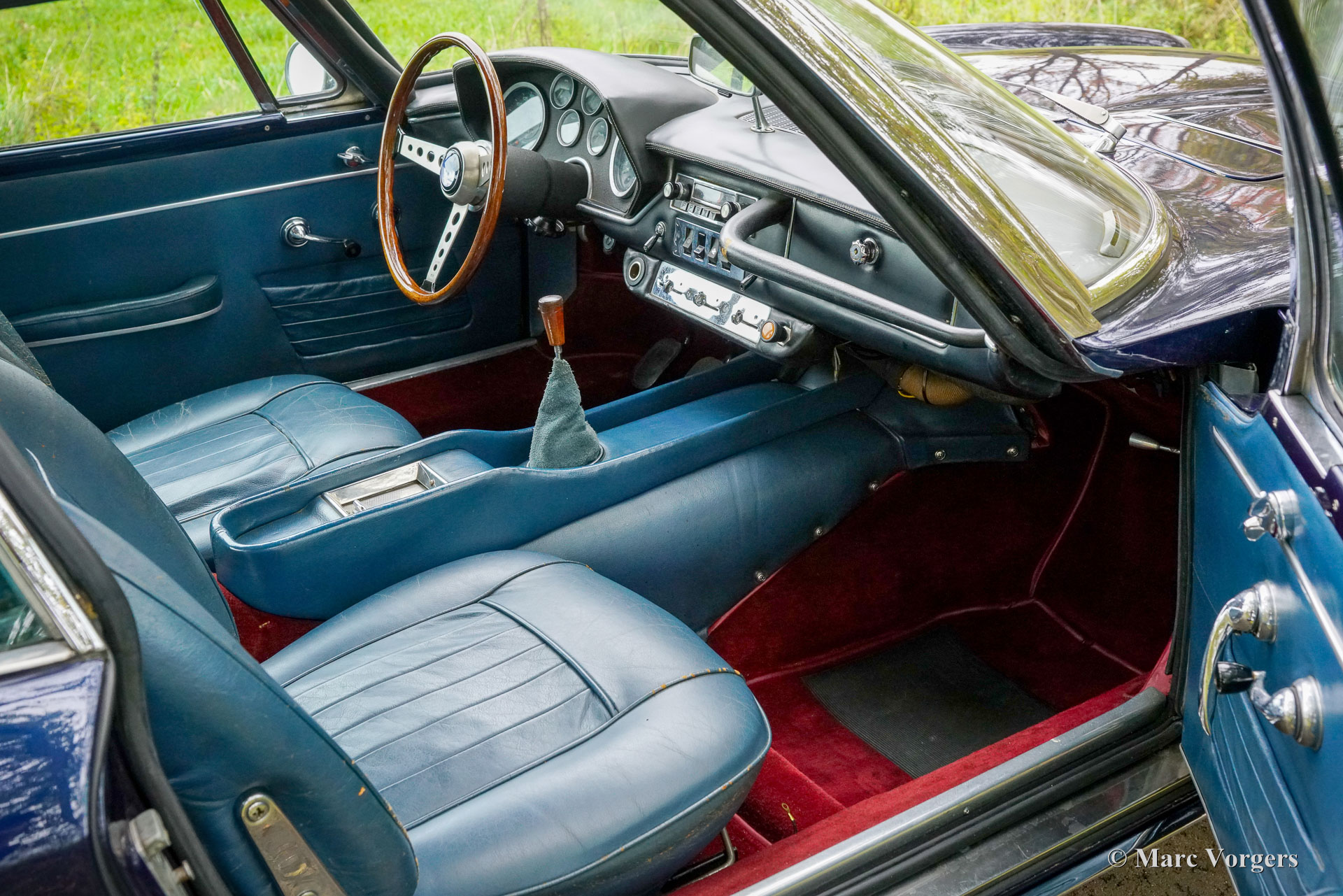 Maserati Mistral Coupé 4 litres Injection, année 1966. Numéro de châssis AM109/A1/724. Ce véhicule, dont les numéros de série correspondent, possède un moteur, une boîte de vitesses et un essieu arrière d'origine, provenant directement de l'usine et appartenant au châssis et à la carrosserie. Sa teinte bleu foncé métallisé (Blu Pervinca 106AR357) s'harmonise avec un intérieur en cuir bleu rehaussé de moquette rouge. Cette magnifique Maserati a été construite le 9 mai 1966 et alors livrée à son premier propriétaire à Vérone, en Italie. Elle a ensuite rejoint l'Allemagne, chez M. Hans Haemer, qui l'a vendue en 1982 au père de l'actuel propriétaire. La famille possède et chérit ce véhicule d'exception depuis 43 ans ! Le coupé Maserati Mistral a été lancé en 1963 et seulement 844 exemplaires furent produits, équipés de moteurs six cylindres en ligne de 3,5, 3,7 et 4,0 litres à double allumage (deux bougies par cylindre) et injection mécanique Lucas. En 1966, le moteur haut de gamme de 4,0 litres développant 265 ch est devenu disponible en option. Le superbe design GT de Pietro Frua se distinguait par une harmonieuse combinaison de lignes fluides et courbes et d'arêtes vives, ainsi que par un grand hayon vitré conférant à la voiture une allure à la fois sportive et pratique. Ce coupé Mistral 4 litres haut de gamme est sorti d'usine en teinte argent métallisé (Argento Auteuil) avec son intérieur d'origine, toujours en parfait état. Lors de son acquisition en 1982, sa carrosserie était bleu clair, puis repeinte en bleu foncé (Blu Pervinca). Dans les années 1990, la voiture a fait l'objet d'une restauration et d'une révision complètes. La voiture a ensuite reçu sa peinture actuelle, Blu Pervinca, qui commence à présenter quelques craquelures sur les flancs arrière et à l'arrière. En 2022, la culasse fut entièrement révisée. De nouvelles soupapes et de nouveaux ressorts furent installés, ainsi que les injecteurs. De plus, de nouveaux amortisseurs réglables furent montés. Cette Maserati Mistral haut de gamme est une voiture de pilote en bon, voire très bon état, offrant une conduite, une tenue de route et une sonorité exceptionnelle ! Elle est équipée de jantes à rayons Borrani peintes en argent et d'une roue de secours Borrani dans le coffre. Avec ses numéros de série concordants et un intérieur d'origine encore magnifique, cette Maserati Mistral est une véritable capsule temporelle. Un fleuron du patrimoine automobile italien, ayant appartenu à une seule famille pendant de longues années, qui ne demande qu'à être apprécié et vécu par un passionné d'automobile !