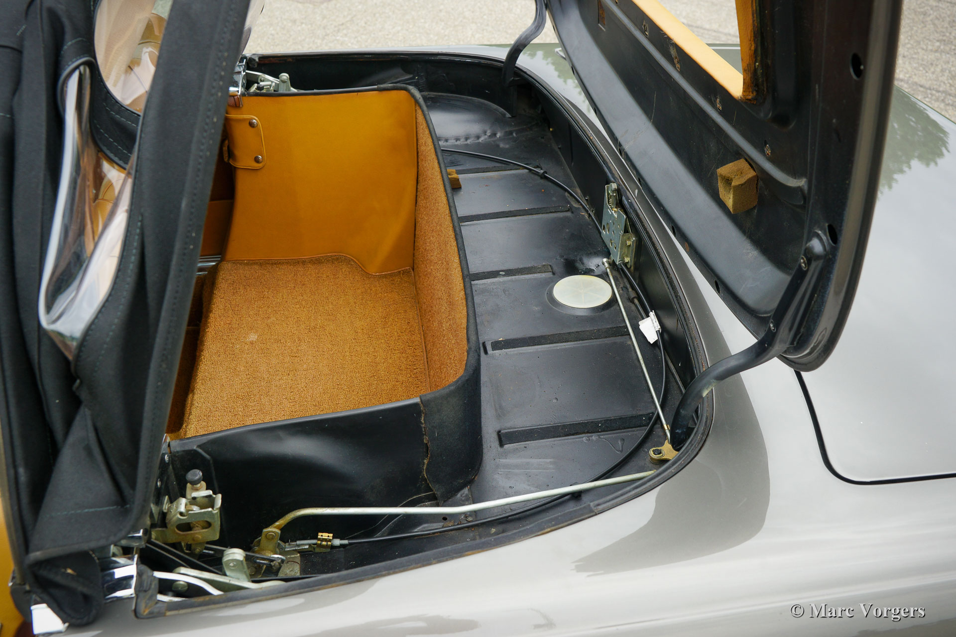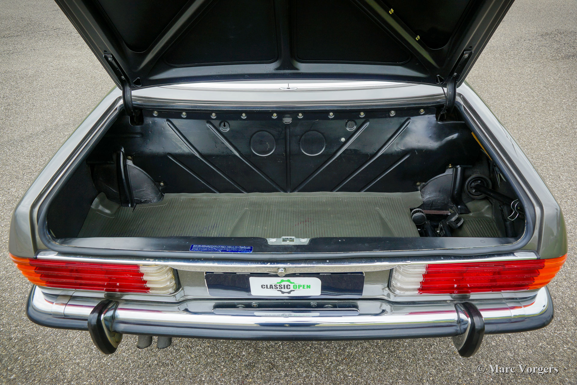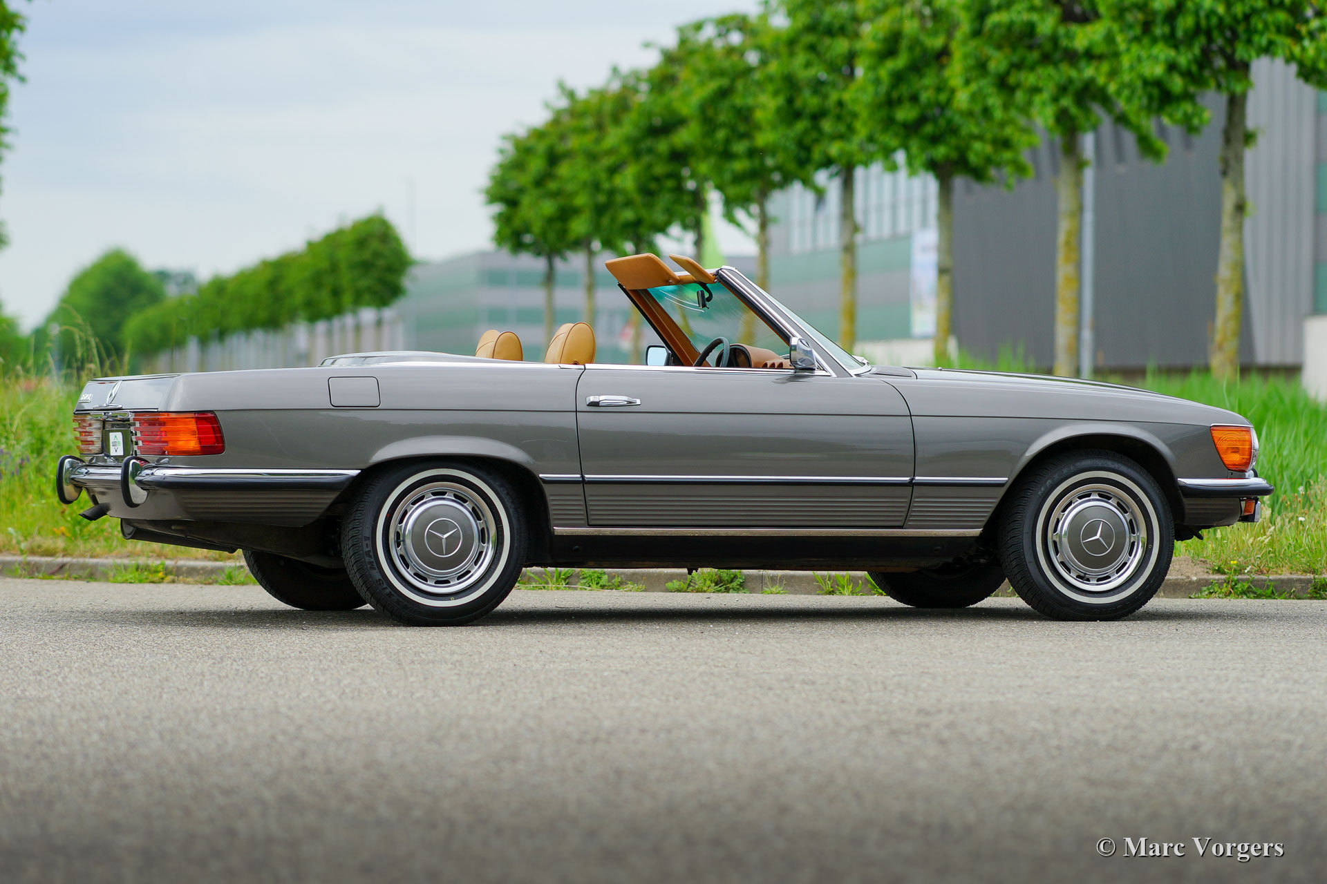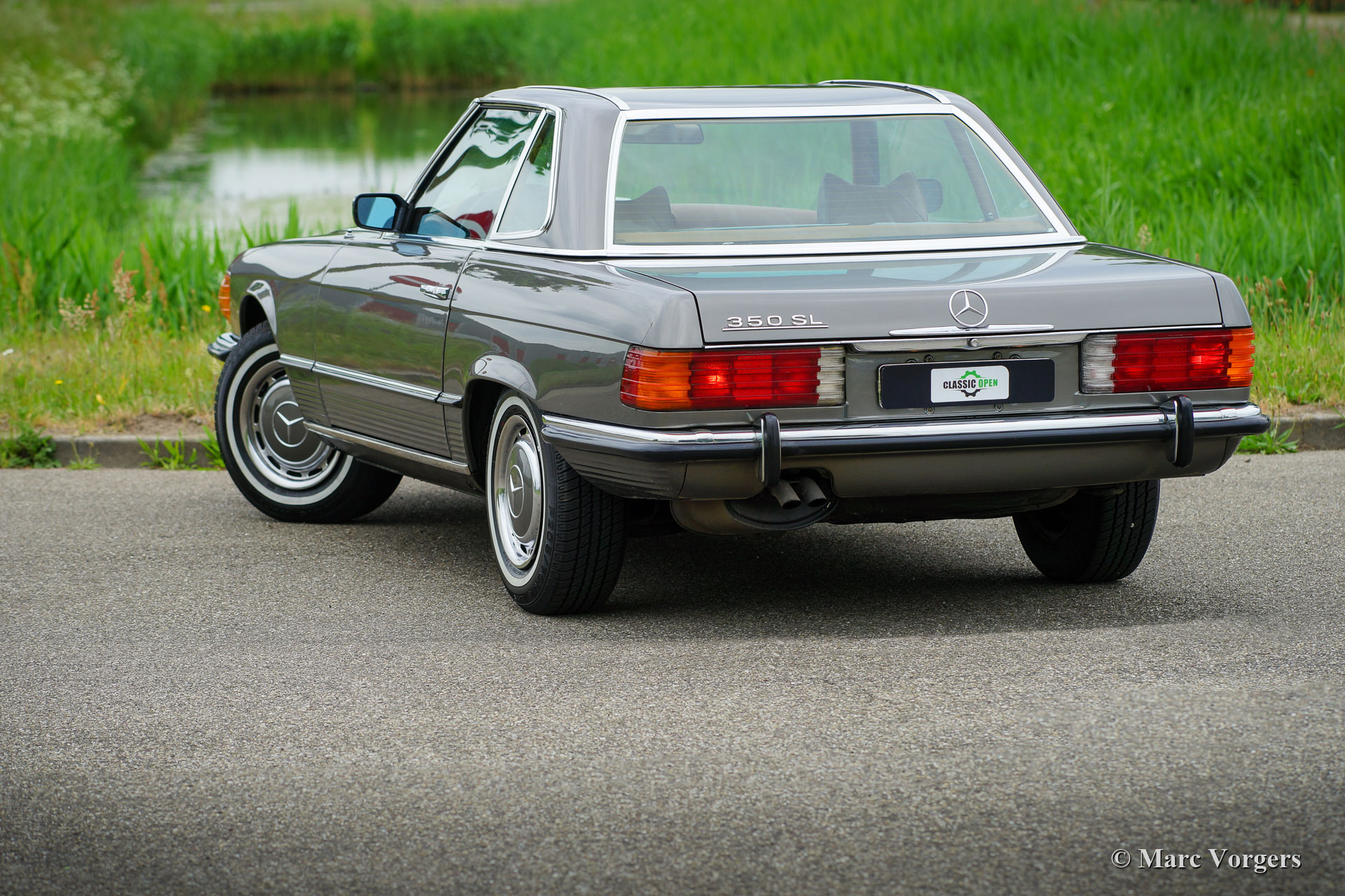 Mercedes-Benz 350 SL, année 1972. Couleur gris foncé métallisé combinée à un intérieur marron cognac. Capote en mohair noir et hard-top d'origine couleur carrosserie. Cette fantastique Mercedes 350 SL de la gamme de modèles R107 a été vendue neuve en Californie aux États-Unis. L'automobile fut importée aux Pays-Bas en 2020. La R107 est une Mercedes "evergreen", le modèle a été construit de 1971 à 1989. La 350 SL fut le premier modèle de la série de modèles. La 350 SL est équipée d'un fantastique moteur V8 couplé à une boîte de vitesses automatique. Avec un couple de 286 Nm et 220 ch, la 350 SL est une voiture de luxe rapide à toit ouvert. Avec le hard top installé, la 380 SL se transforme en un superbe coupé. Seulement 15 000 voitures de ce modèle 350 SL furent construites. Cet exemple est dans un excellent état ne montrant que de légers signes d'utilisation. La capote et le toit rigide sont également en excellent état. La voiture est équipée d'une direction assistée, de la climatisation et d'une radio stéréo Alpine avec lecteur de cassettes. Cette magnifique Mercedes 350 SL est livrée complète avec les livrets d'origine, l'ensemble d'outils et le cric d’origine. Cette 350 SL roule et sonne parfaitement, un exemple très désirable !