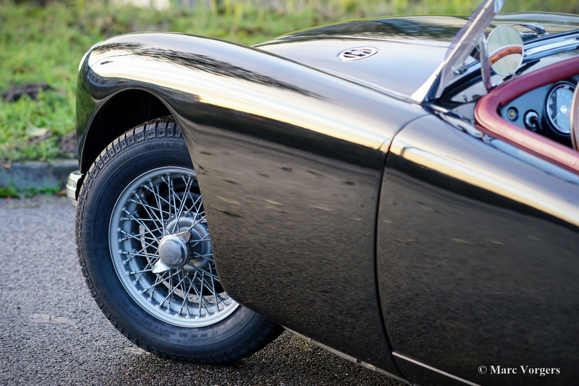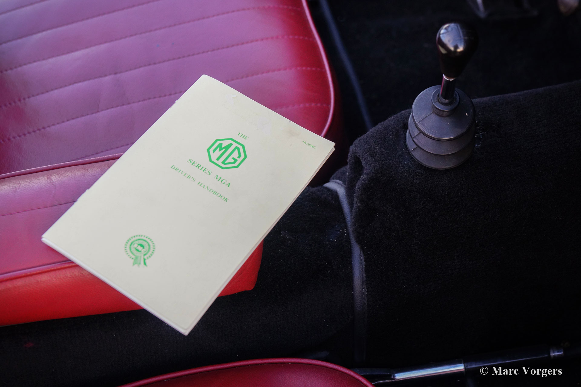 MG MGA 1500 Roadster, année 1959. Couleur noire combinée avec un intérieur en cuir rouge et un tapis noir. Capote en vinyle rouge, couvre-tonneau en vinyle noir et écrans latéraux avec cadres en aluminium. Ce magnifique roadster MGA 1500 a été restauré dans le passé, la voiture est en très bon état et la voiture roule délicieusement. Ce très beau roadster MGA fut très bien entretenue au fil des ans, la voiture montre des signes légers à normaux d'utilisation précédente. La combinaison de couleurs noir / rouge est probablement la plus belle palette de couleurs pour le roadster MGA, sportive et élégante ! Ce magnifique roadster MGA 1500 est équipé de roues à rayons peintes en argent, d'un volant sport MotoLita avec jante en bois, d'une barre de badges avec les badges néerlandais ANWB et WW (Wegenwacht – comme A.R.A. en France) des années 1960 et d'un porte-bagages chromé. Ce roadster MGA 1500 est une voiture de conducteur désirable qui apportera beaucoup de plaisir et de joie aux passionnés de MG !