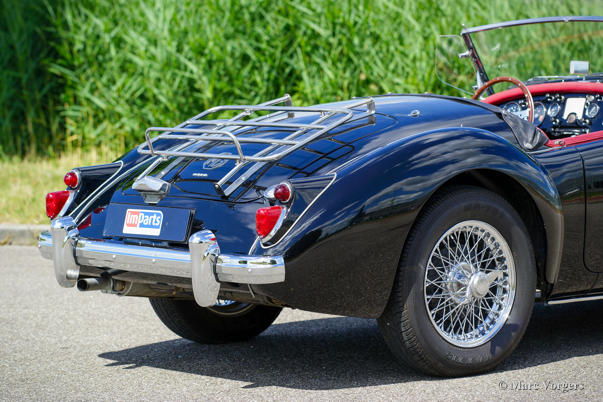 MG MGA 1600 Roadster, année 1960. Couleur noire combinée à un intérieur en cuir noir bordé de liserés rouges et d'un tapis noir. Capote et couvercle de la hotte en vinyle noir, fenêtres latérales avec cadres noirs. Ce très beau MGA 1600 roadster est équipé de roues à rayons en chrome, d’un porte-bagages en chrome, d’un volant MotoLita avec jante en bois, d’un rétroviseur pare-balles et de filtres à air sport.