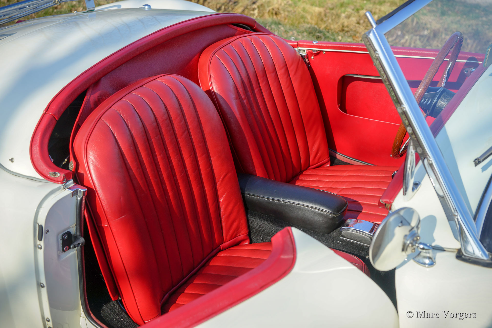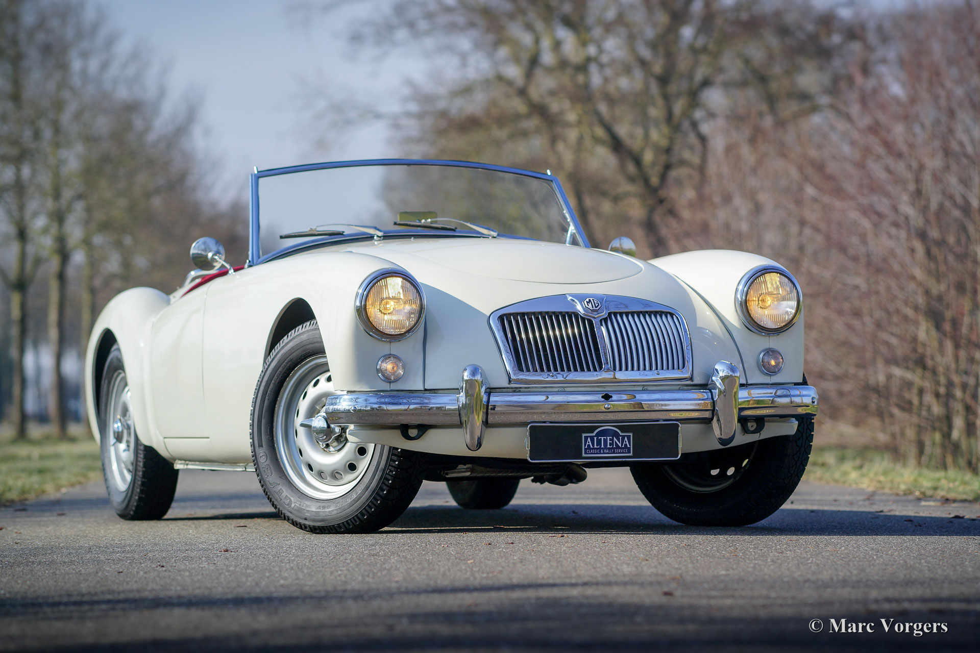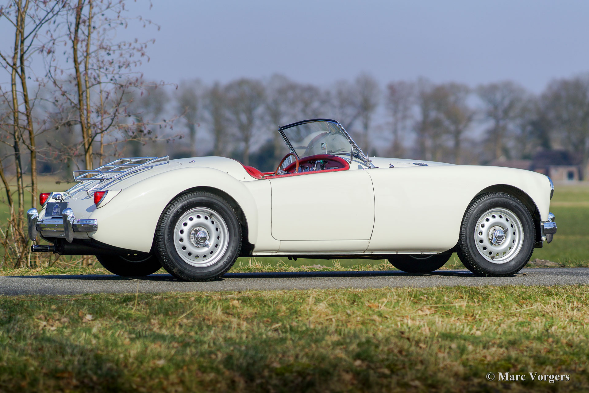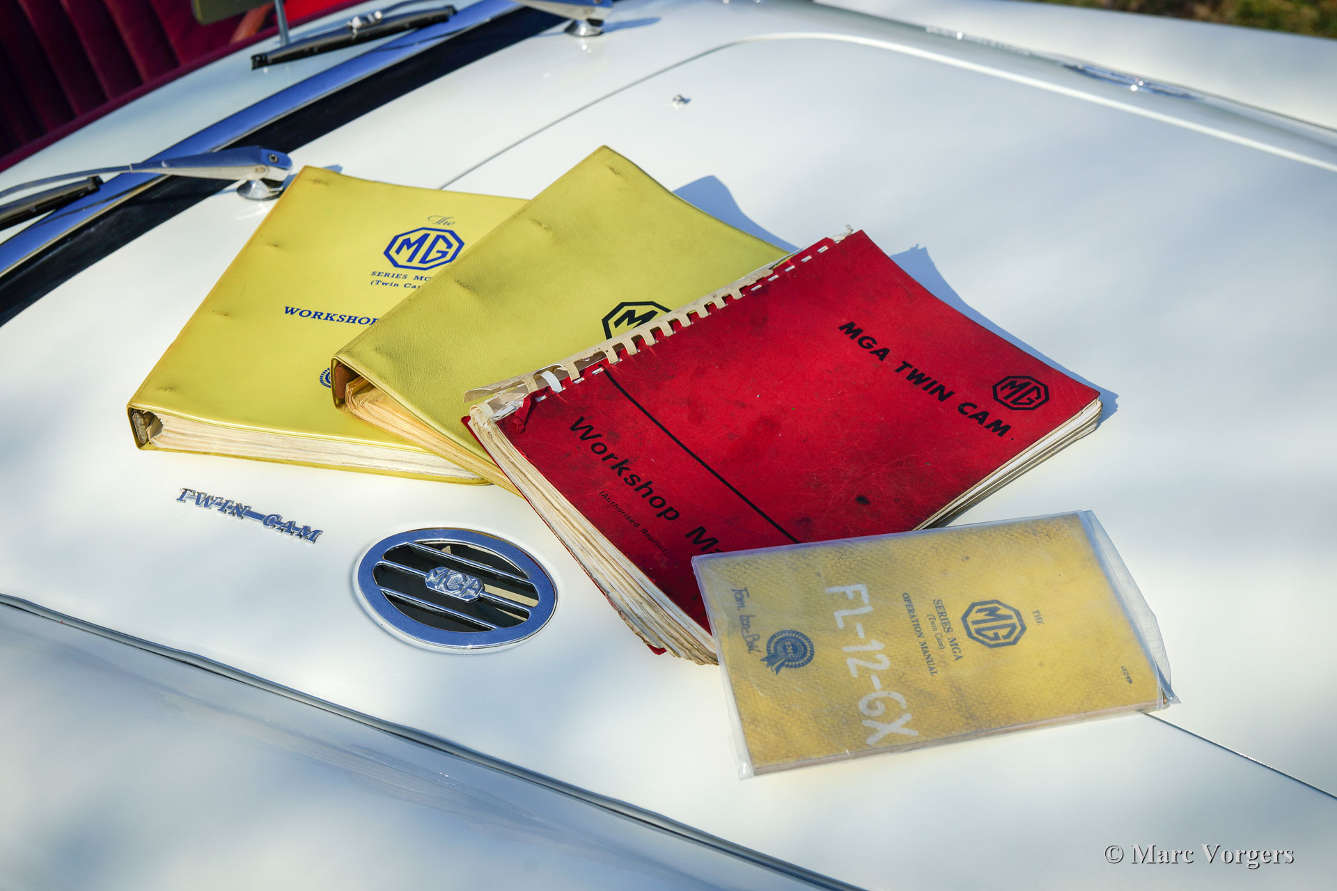 MG MGA Twin-Cam roadster, année 1958. Couleur Old English White avec un intérieur en cuir rouge et un tapis noir. Ce MGA Twin-Cam roadster rare et fabuleux fut expédié en Belgique en tant que modèle d'exportation CKD. La voiture fut assemblée en Belgique et elle fut vendue neuve dans le même pays. Il est dit que la voiture a été courue à Spa-Francorchamps à ses débuts. En 1960, la voiture fut achetée par un célèbre éditeur néerlandais de livres de voiture technique (Piet Olyslager). En 1969, la voiture fut vendue à un chirurgien qui a conduit la voiture jusqu'en 1973. Puis une restauration a été planifiée, et la voiture fut démontée. La restauration n'a jamais commencé, et la voiture fut vendue en pièces au propriétaire actuel en 1983. Puis une restauration et révision complète ont suivi. Le corps et le châssis furent dépouillés de peinture, sablés et enduits d'époxy. Ensuite, la voiture fut repeinte dans sa couleur d'origine. Le moteur Twin-Cam fut entièrement révisé, aux spécifications de compression élevées, par le spécialiste Peter Wood en Angleterre. L'ancienne culasse Twin-Cam fut remplacée par une autre culasse, d'où le numéro de série ultérieur. Les autres mécaniques furent révisées, l'intérieur a été restauré et les pièces chromées furent rechromées. Un reportage photo de la restauration est présent !