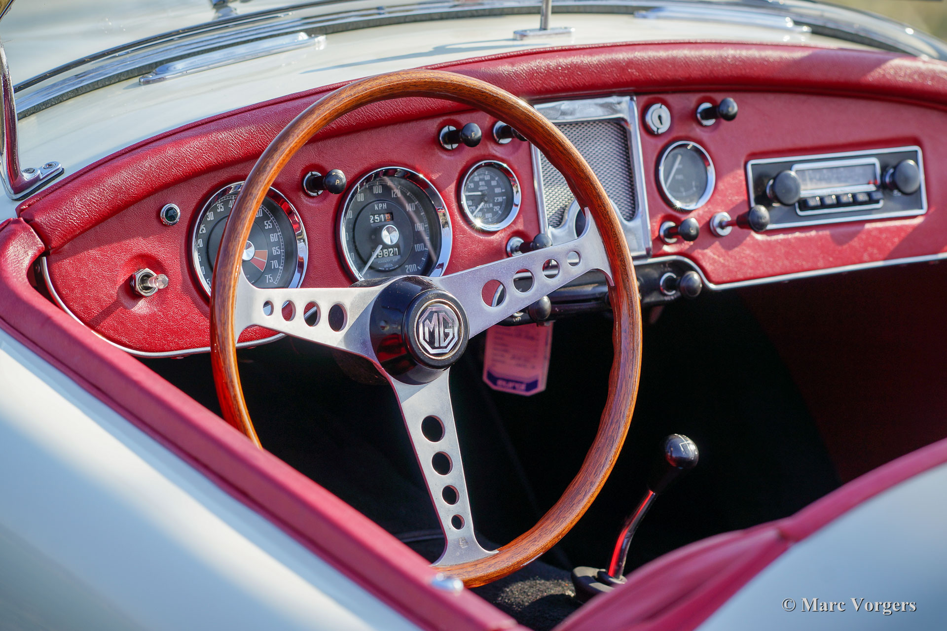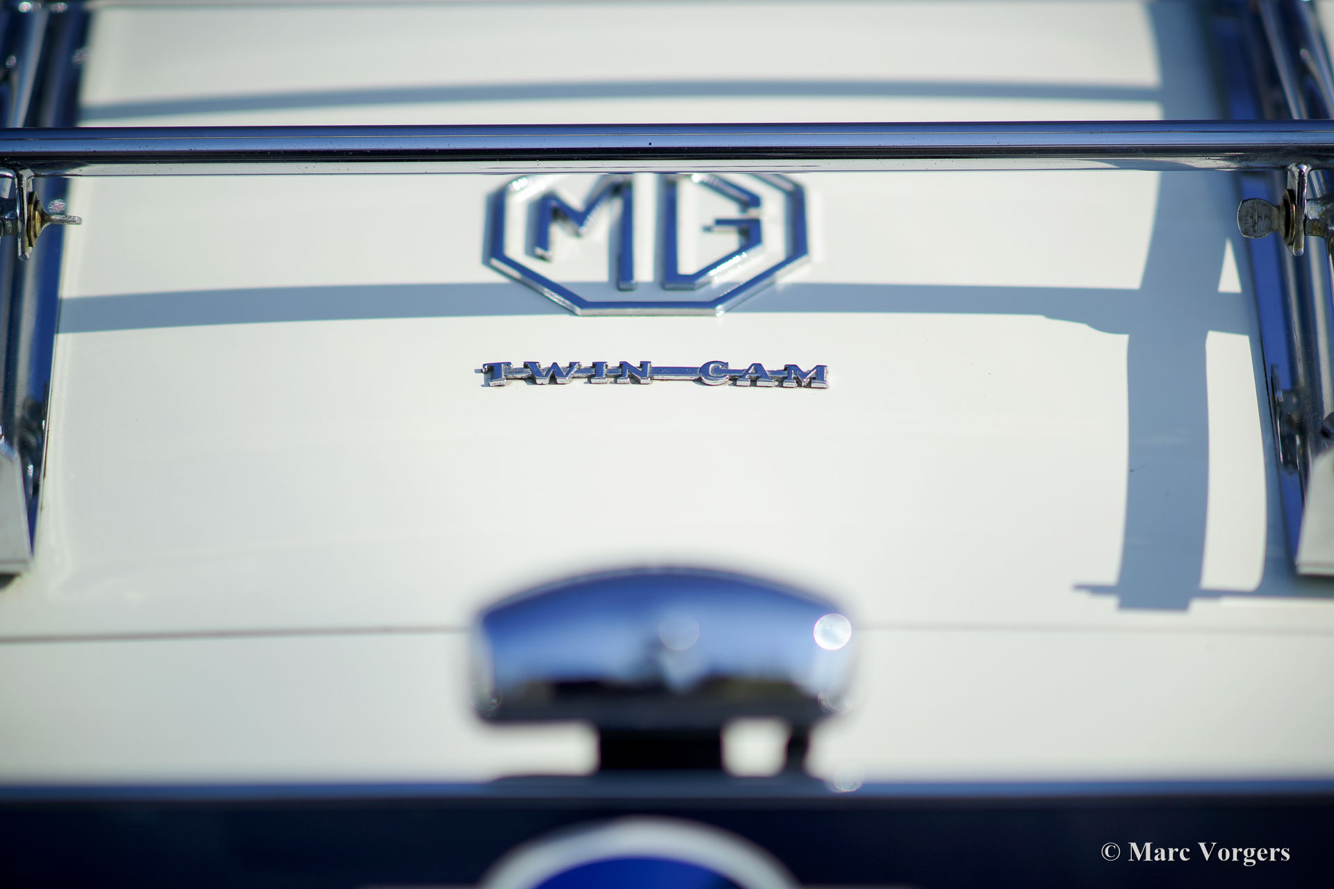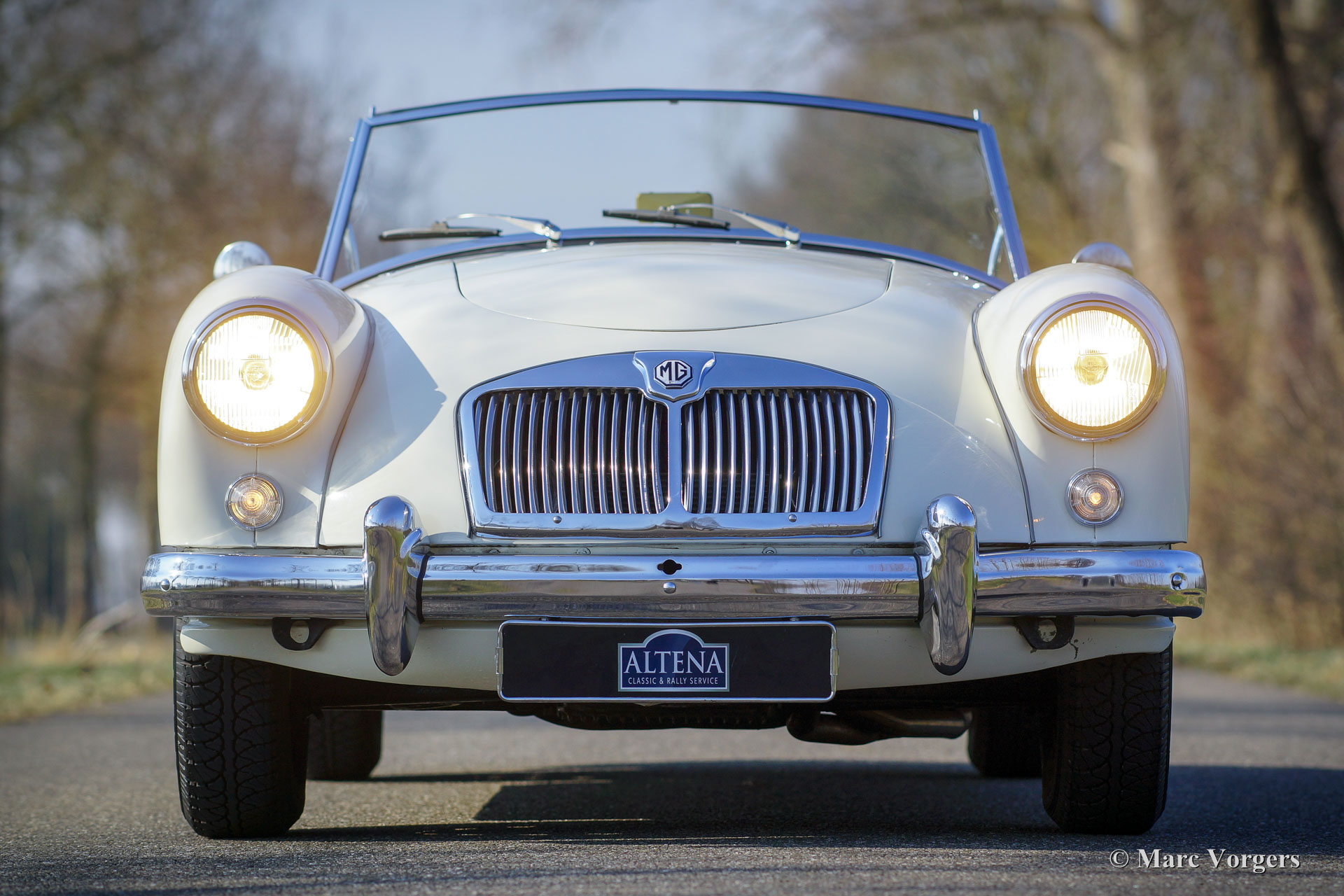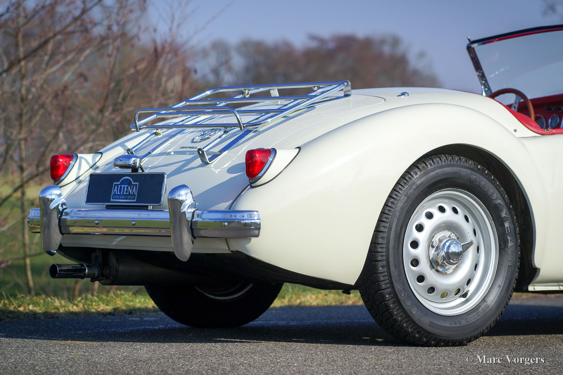 MG MGA Twin-Cam roadster, année 1958. Couleur Old English White avec un intérieur en cuir rouge et un tapis noir. Ce MGA Twin-Cam roadster rare et fabuleux fut expédié en Belgique en tant que modèle d'exportation CKD. La voiture fut assemblée en Belgique et elle fut vendue neuve dans le même pays. Il est dit que la voiture a été courue à Spa-Francorchamps à ses débuts. En 1960, la voiture fut achetée par un célèbre éditeur néerlandais de livres de voiture technique (Piet Olyslager). En 1969, la voiture fut vendue à un chirurgien qui a conduit la voiture jusqu'en 1973. Puis une restauration a été planifiée, et la voiture fut démontée. La restauration n'a jamais commencé, et la voiture fut vendue en pièces au propriétaire actuel en 1983. Puis une restauration et révision complète ont suivi. Le corps et le châssis furent dépouillés de peinture, sablés et enduits d'époxy. Ensuite, la voiture fut repeinte dans sa couleur d'origine. Le moteur Twin-Cam fut entièrement révisé, aux spécifications de compression élevées, par le spécialiste Peter Wood en Angleterre. L'ancienne culasse Twin-Cam fut remplacée par une autre culasse, d'où le numéro de série ultérieur. Les autres mécaniques furent révisées, l'intérieur a été restauré et les pièces chromées furent rechromées. Un reportage photo de la restauration est présent !