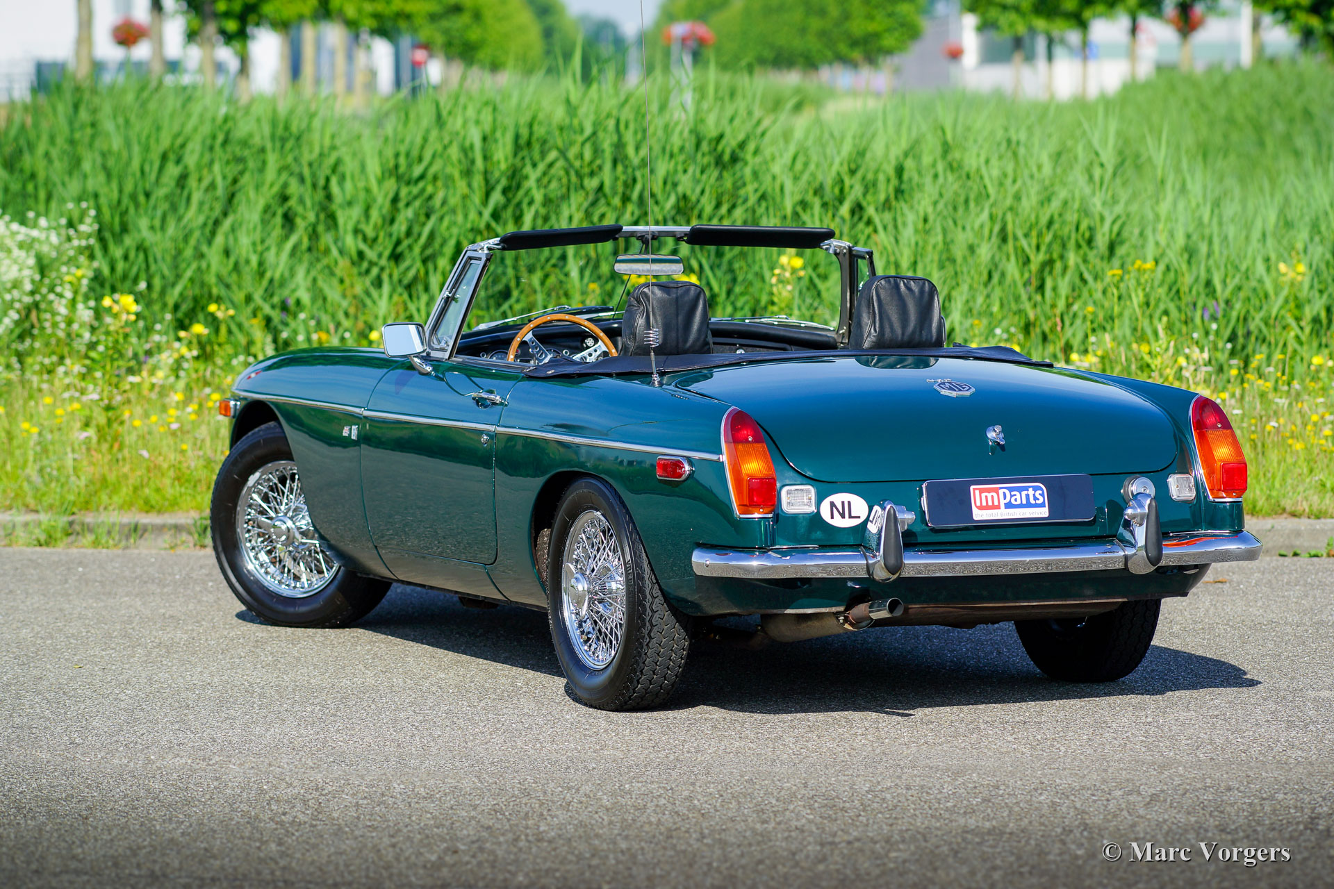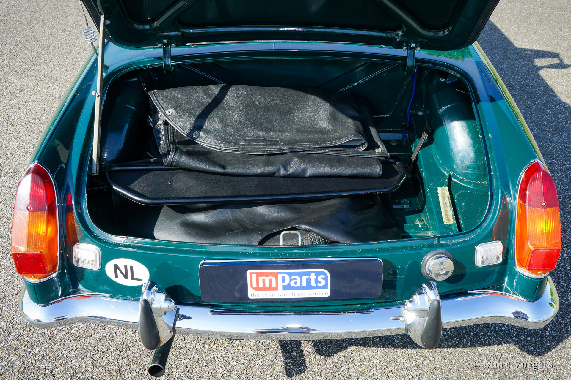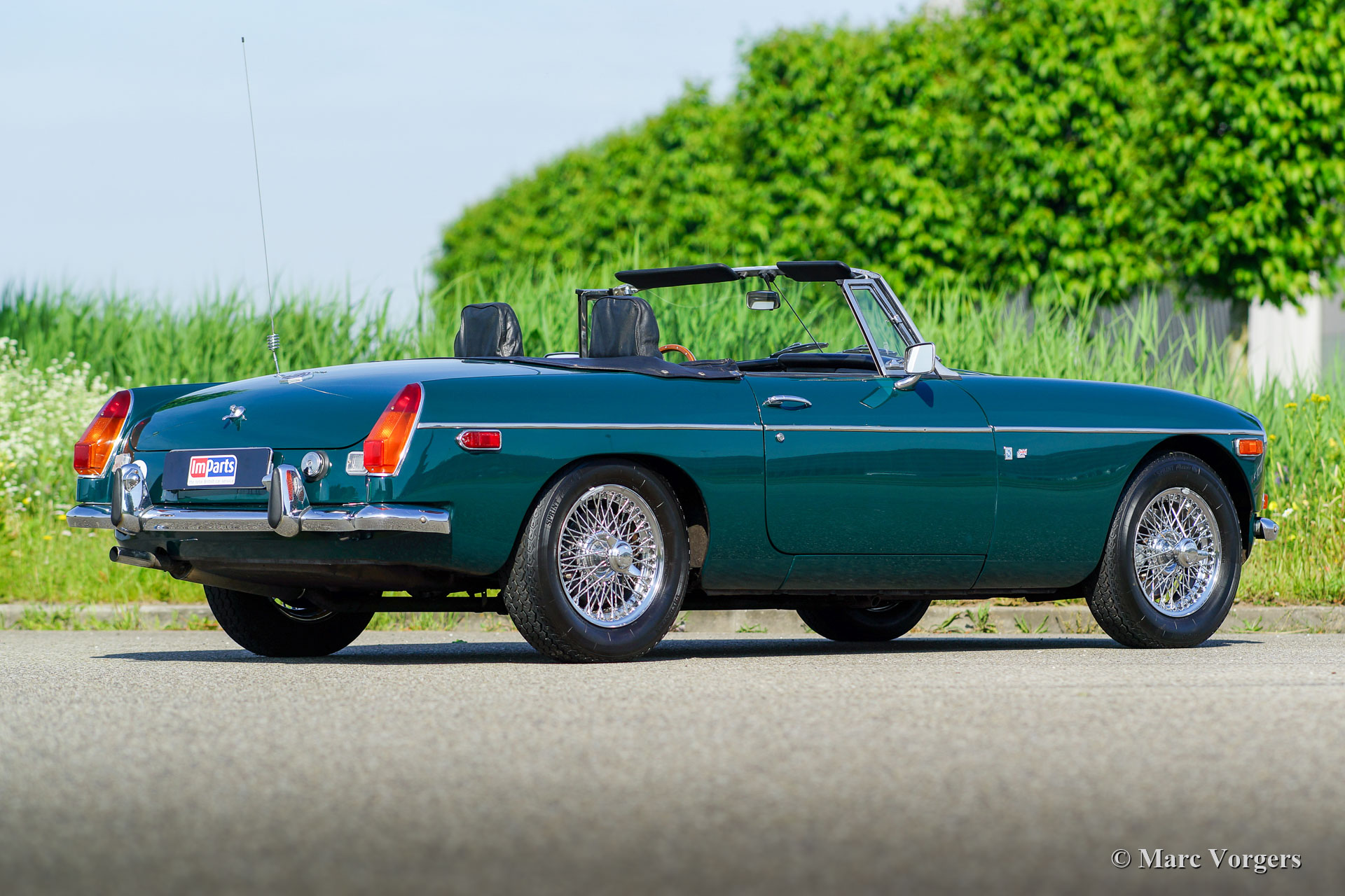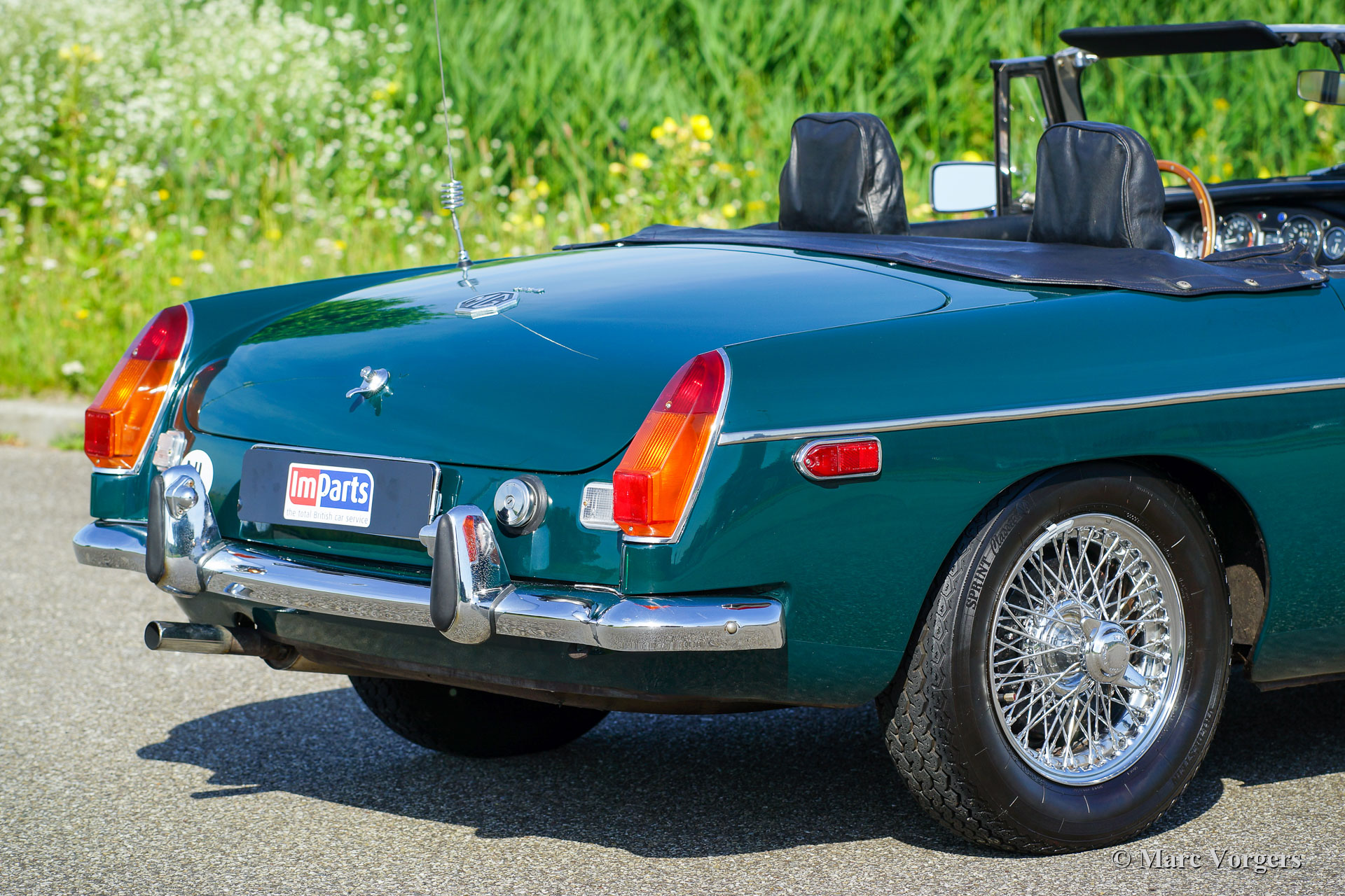 MG MGB roadster, année 1972. Couleur British Racing Green combinée à un intérieur en cuir noir, une moquette noire et une capote noire. Ce très beau MG MGB roadster en très bon état et la voiture roule et pilote à merveille ! Le moteur quatre cylindres de 1800 cm³ tourne et sonne parfaitement ! Cette voiture a reçu un traitement anti-corrosion adéquat pour le soubassement et la salle des machines. Ce très beau MGB roadster est bien outillée : la voiture est équipée d’overdrive, de roues en fil chromées, d'un volant sport MotoLita avec jante en bois, d'un pommeau de levier de vitesses en bois, d'un couvercle de tonneau noir, de deux rétroviseurs chromés montés sur les portes, d'un allumage électronique, de sièges en cuir avec repose-tête et d'un coupe-vent. Ceci est un MGB roadster souhaitable et une excellente voiture de conducteur ! La voiture est prête pour toute nouvelle aventure entre les mains d'un nouveau propriétaire.