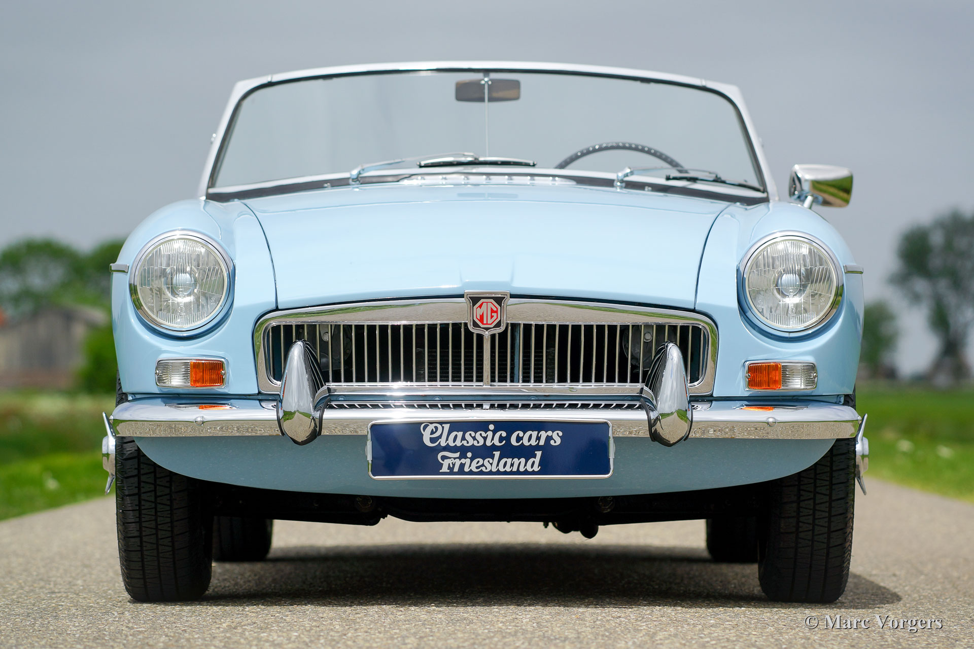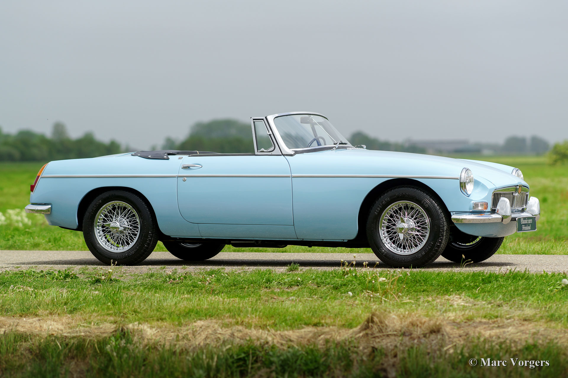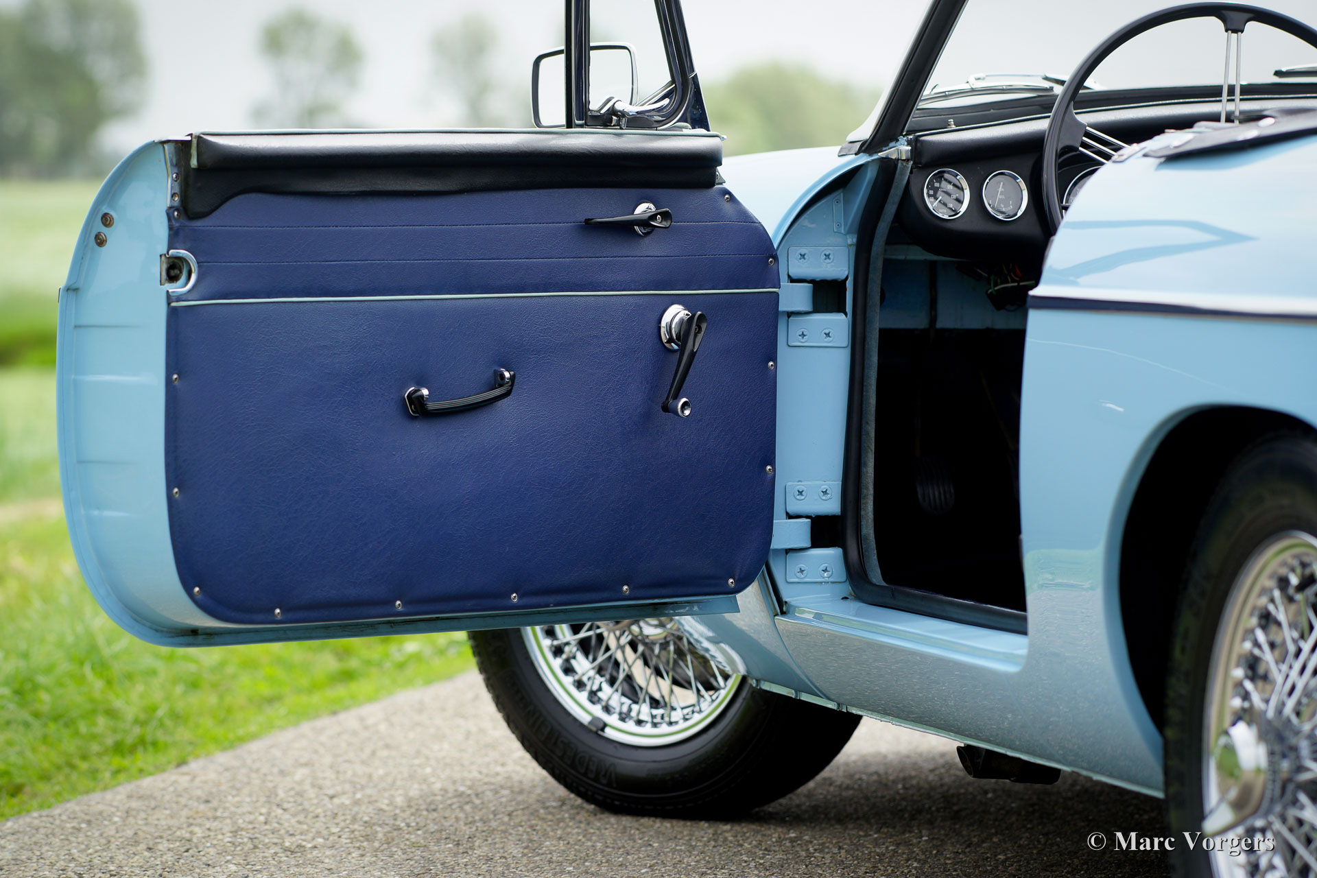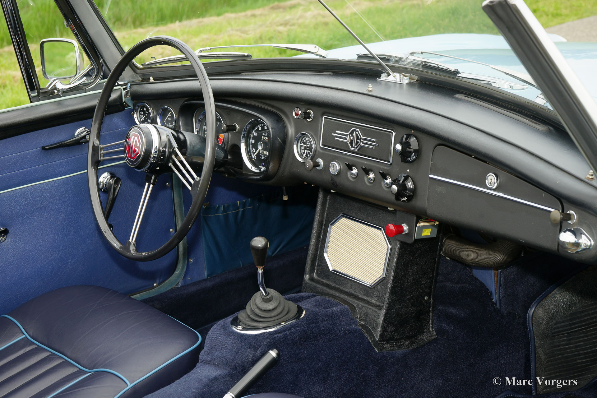 MG MGB Mk I roadster, année 1964. Couleur « Powder Blue » combinée avec un intérieur en cuir bleu foncé garni de passepoil bleu pâle. Capot bleu foncé et couvercle-tonneau blue. C'est un magnifique MGB du début du soi-disant « pull-handle ». Ce magnifique MGB roadster est super original, la voiture montre de superbes détails originaux avec la magnifique direction originale comme pièce de résistance ! L'automobile est en excellent état et la voiture roule délicieusement ! Ce MGB est équipé de roues de fil chromées, de pneus Vredestein et d'un échappement en acier inoxydable. La voiture est prête à être appréciée au maximum !