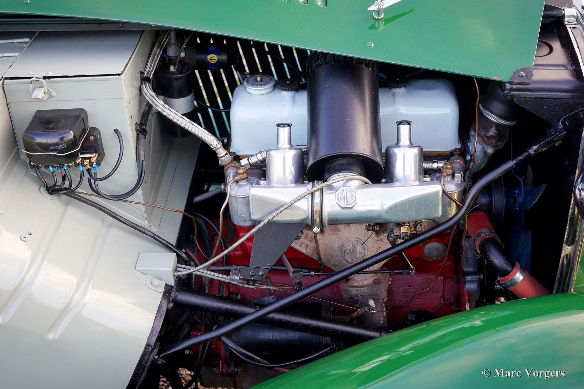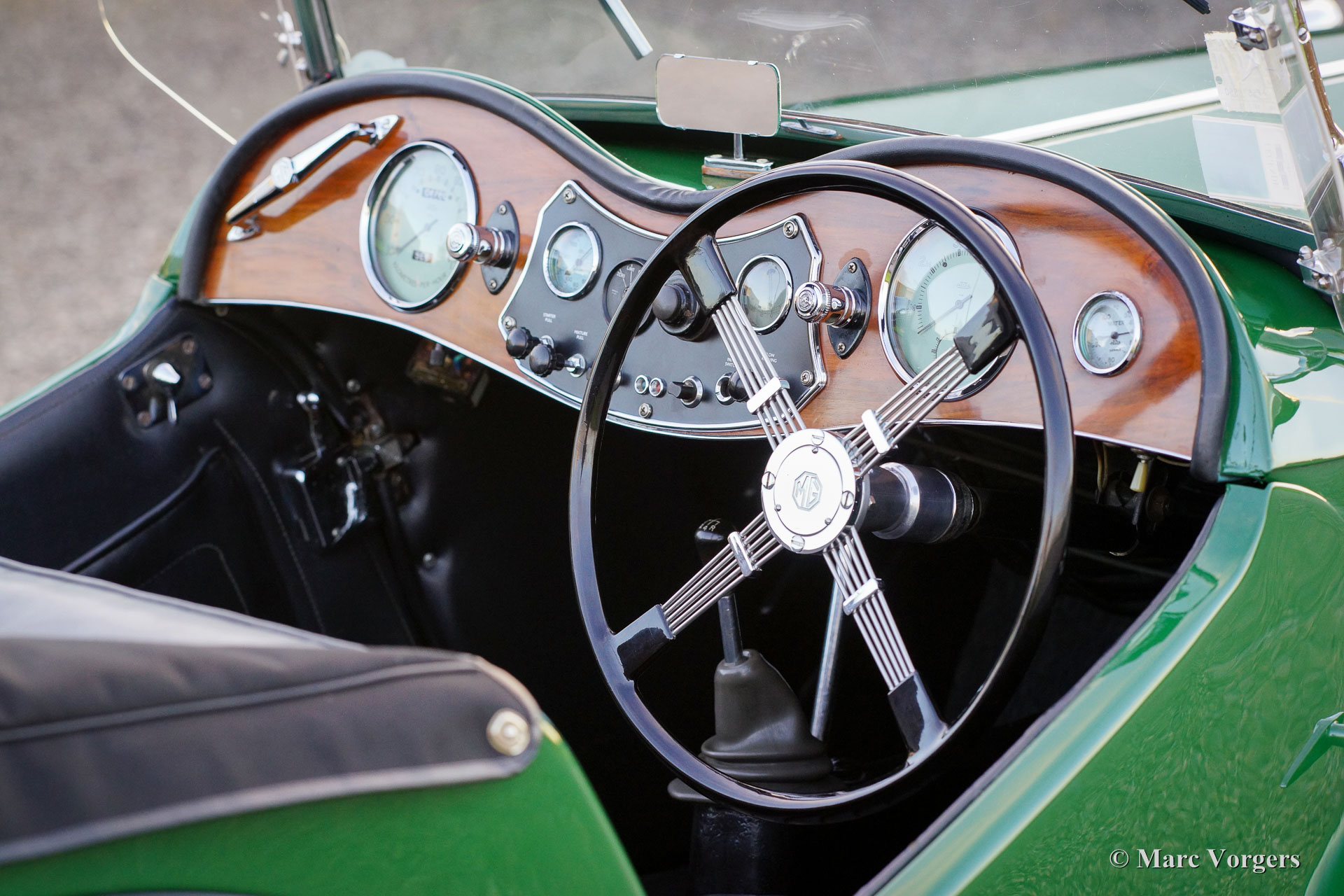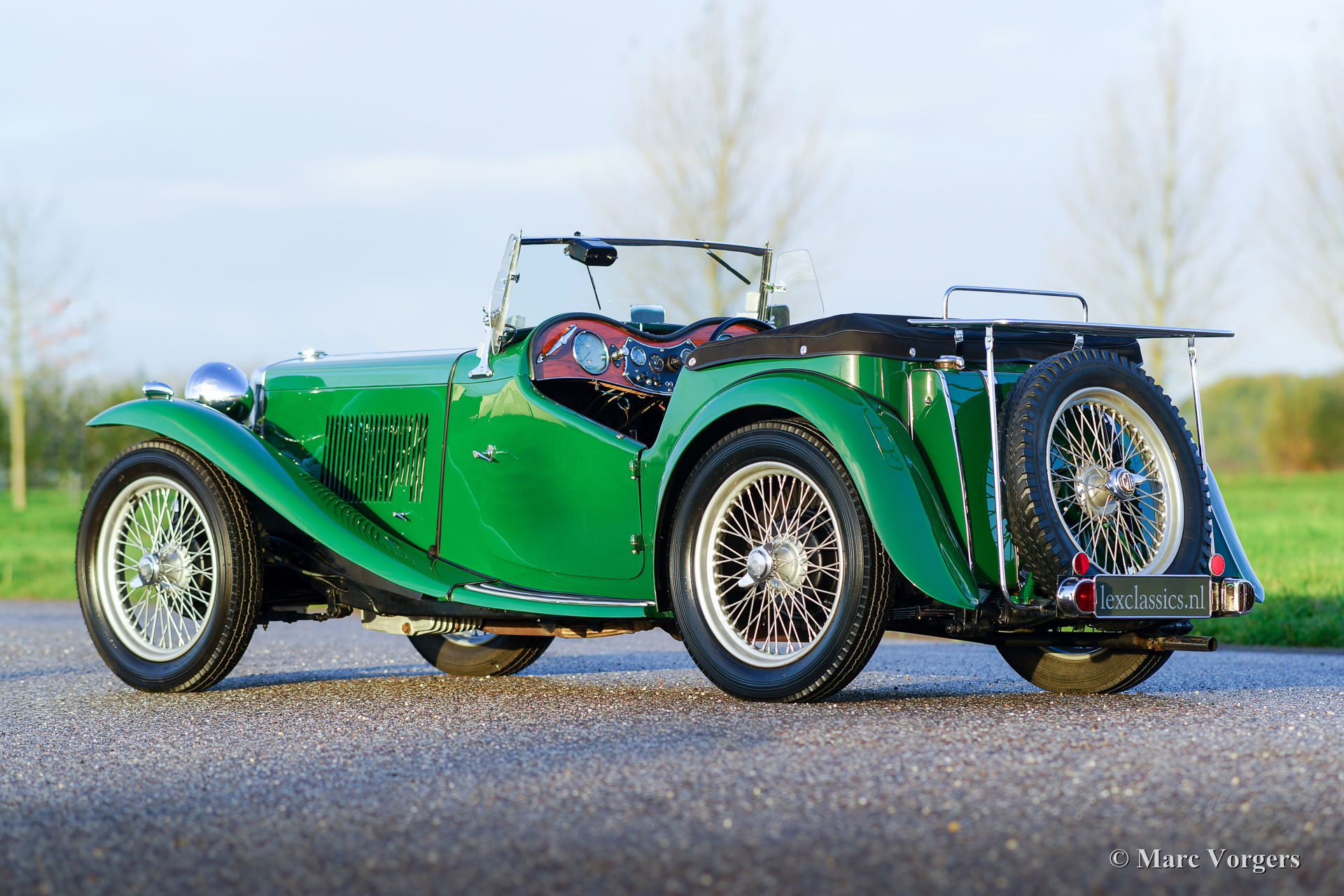 The MG TC was the first new post-war MG. The TC was introduced in 1945, and based on the pre-war TB, it was very similar. A major improvement to the TC was the larger interior, which was increased by 10 cm. The design was similar to the pre-war TB, with swept separate wings, large 19-inch wire wheels and a folding windshield. The MG TB/TC series were much admired by the American soldiers who were on the point of returning to America; this type of small sports car with its smooth handling, was not yet known in America. As a result, many TBs and TCs were shipped to America, and also the MG TC was in great demand at the other side of the pond. All TCs had right-hand steering, leaf springs all around and a 54 bhp four-cylinder engine. In 1950, the MG TC was succeeded by the MG TD.