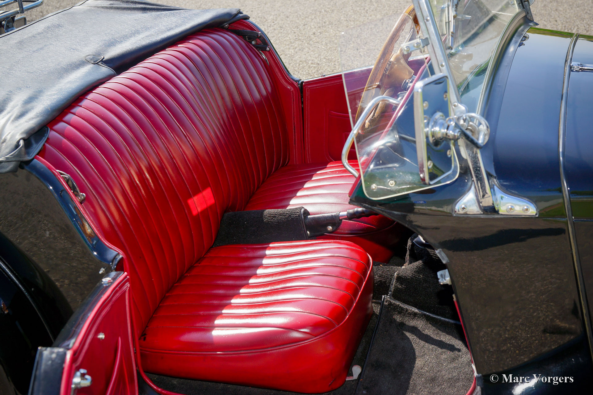 MG TD, année 1953. Couleur noire combinée à un intérieur rouge garni de moquette noire. Capote, couvercle de tonneau et cadres de vitres latérales noirs. Cette belle MG TD est en très bon état avec de légères traces d'utilisation antérieure. L'automobile roule délicieusement et l'expérience à toit ouvert apporte un sentiment de liberté ultime. La série MG ‘Midget’, qui a été introduite avant la Seconde Guerre mondiale, est le légendaire modèle de voiture de sport britannique. Les voitures ont été expédiées aux États-Unis par des soldats américains parce qu'ils n'avaient pas de voitures de sport légères chez eux. Ces voitures sont fantastiques à conduire sur les petites routes sinueuses de la campagne. Cette MG TD montre de magnifiques détails d'origine, et la voiture est équipée d'un volant de rechange avec jante en bois et d'une boîte de vitesses à 5 vitesses.