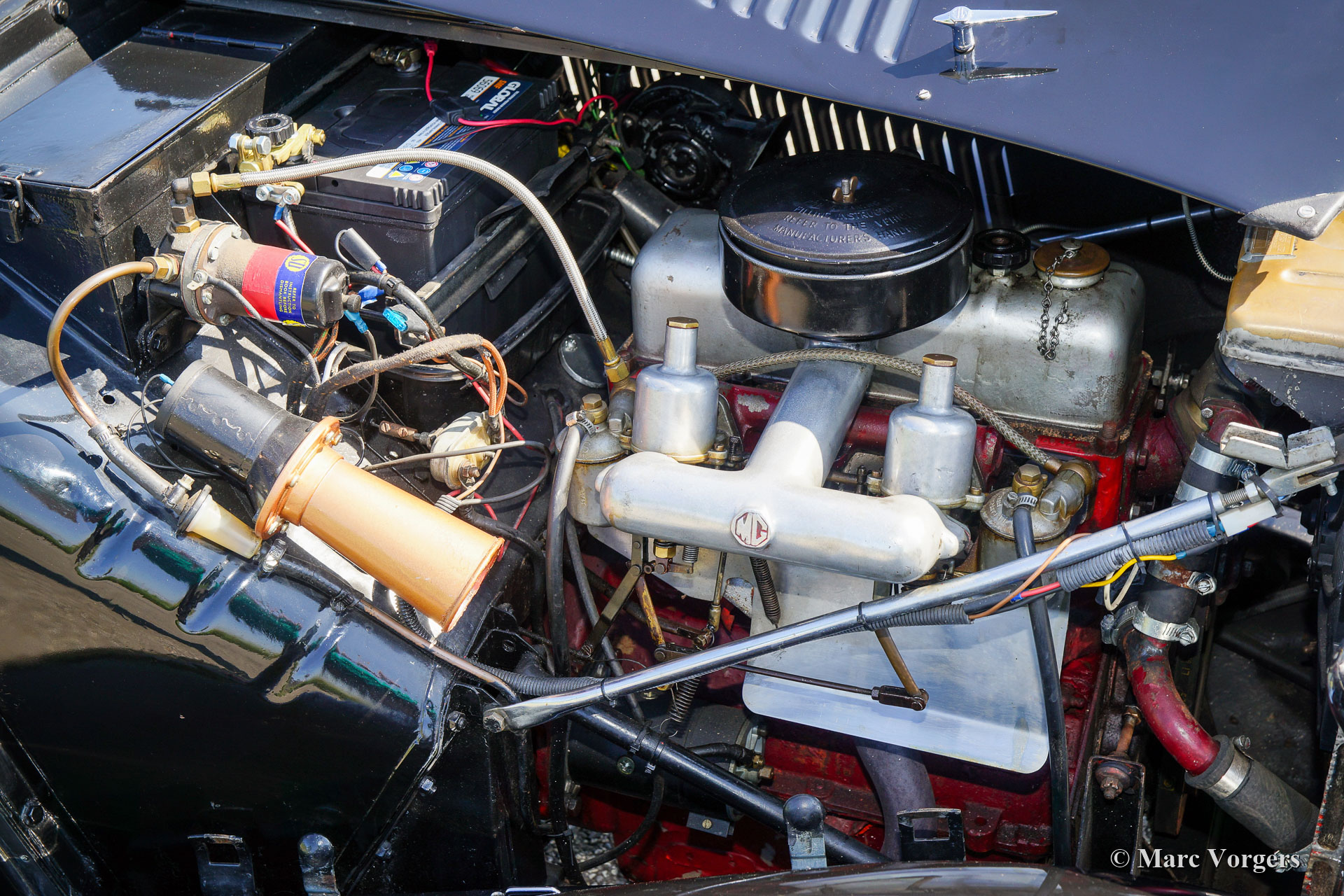 The MG TD was the successor of the MG TC, the British sports car that stole the hearts of the American soldiers returning to their country. Like the MG TC, America was the most important market for the TD. Chassis and body of the TD were largely similar to the TC. But the TD had a rack and pinion steering-gear, coil springs (instead of the leaf springs) and an independent wheel suspension in the front. The wings were different in form, as the large 19-inch wire wheels in the TD gave way to 15-inch wheels. A Mk II version was introduced in 1950, and was built simultaneously with the Mk I. The Mk II had a more powerful engine and a "power bulge" on the engine valve on the right. The MG TD was in production until 1953 and was replaced by the MG TF.