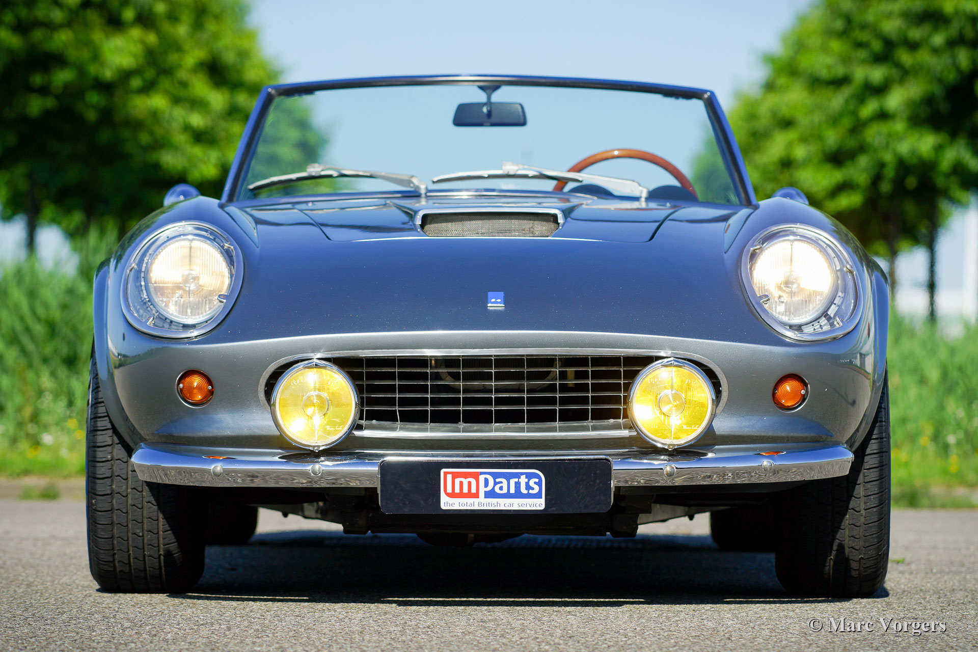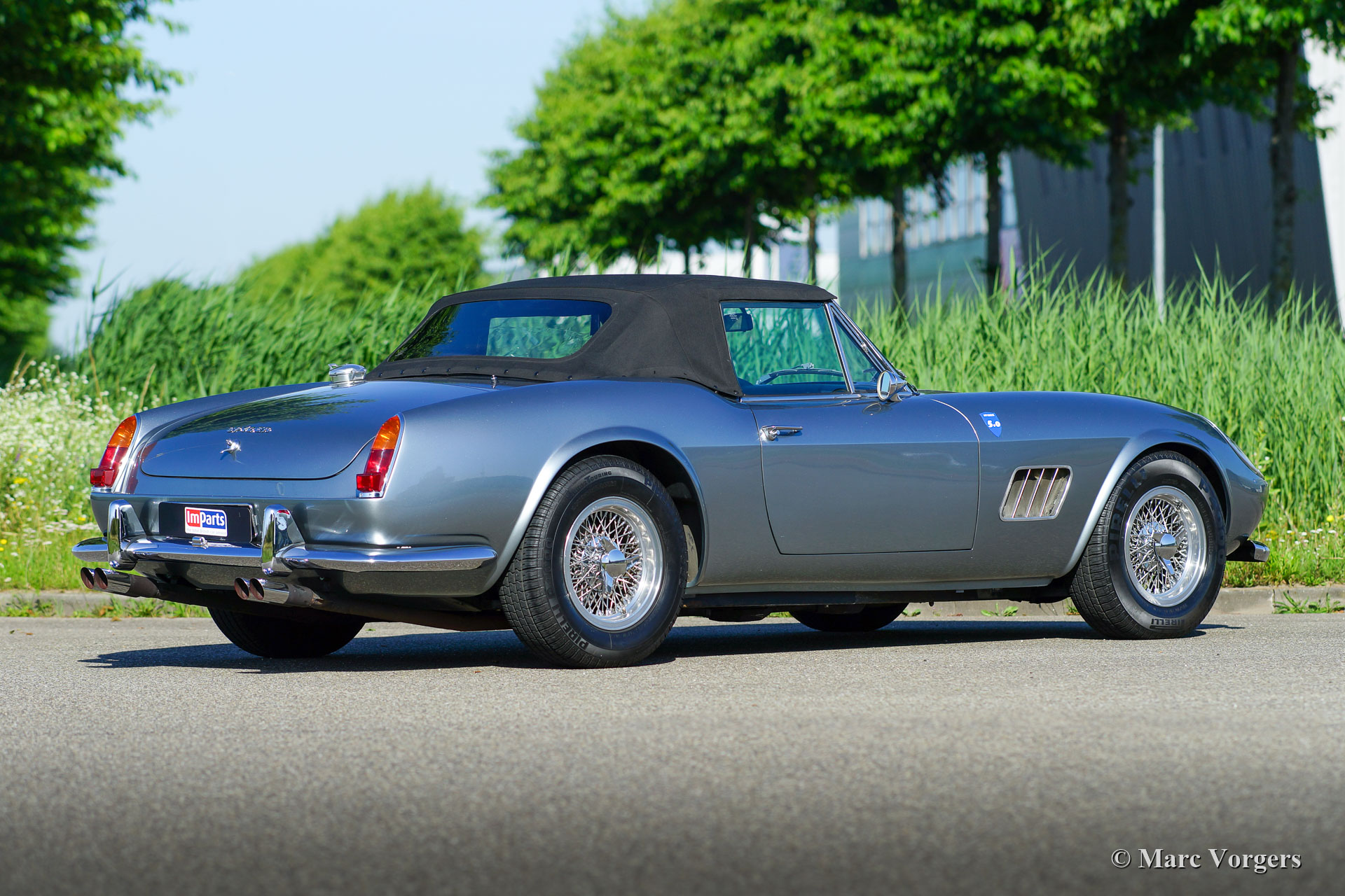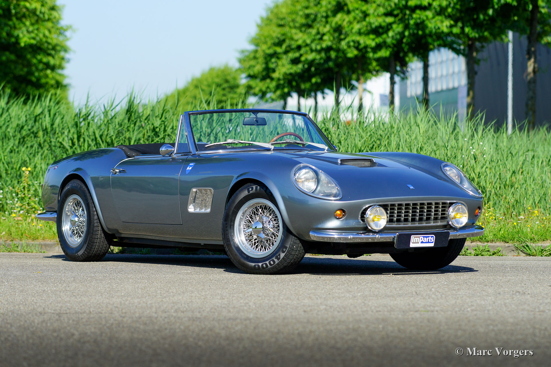 Modena Spyder California, année 1970. Couleur argent métallisé combiné avec un intérieur en cuir noir et un tapis noir. Capote et capuche noires. La Modena Spyder California est une réplique Ferrari 250 GT California 1963 avec une carrosserie GRP (polyester renforcé de fibre de verre) créée par Modena Design and Development à El Cajon, Californie, USA. La carrosserie GRP est renforcée par un renfort de capot en acier et des intérieurs de porte en acier. Le Modena Spyder est basé sur un châssis rigide multi-tubes « space frame » conçu par le designer automobile Indy car Bob Webb. Le châssis est doté d'une suspension avant indépendante, d'un essieu arrière rigide et de freins à disque tout autour. Le Modena Spyder présenté est équipé d'un moteur V8 Ford 302 cu (5 litres) couplé à une boîte de vitesses automatique à quatre vitesses. Le châssis est très robuste et bien suspendu, la voiture accélère, roule et sonne de manière impressionnante ! Cette Modena Spyder est équipée de la climatisation, d'une direction assistée, de magnifiques roues à rayons chromés, de pneus Pirelli 215 / 70-15, de projecteurs longue portée Marchal 662/672 des années 1960 avec des ampoules jaunes et d'un volant Nardi avec une jante en bois. Le Modena Spyder California est devenu mondialement célèbre en raison de son rôle important dans le film Ferris Buellers Day Off qui est sorti en 1986. La voiture a été importée aux Pays-Bas en 2006. Cette magnifique Modena Spyder California a parcouru 9000 miles et la voiture est en excellent état!
