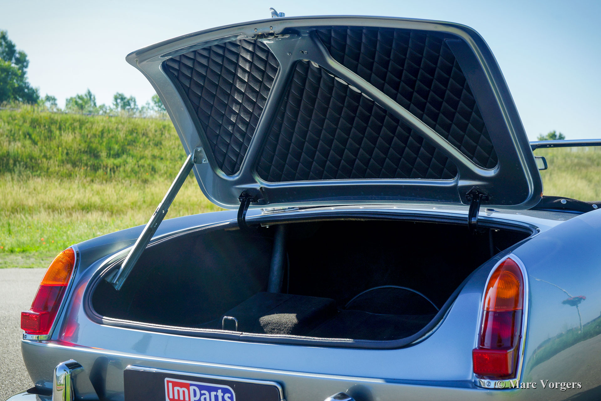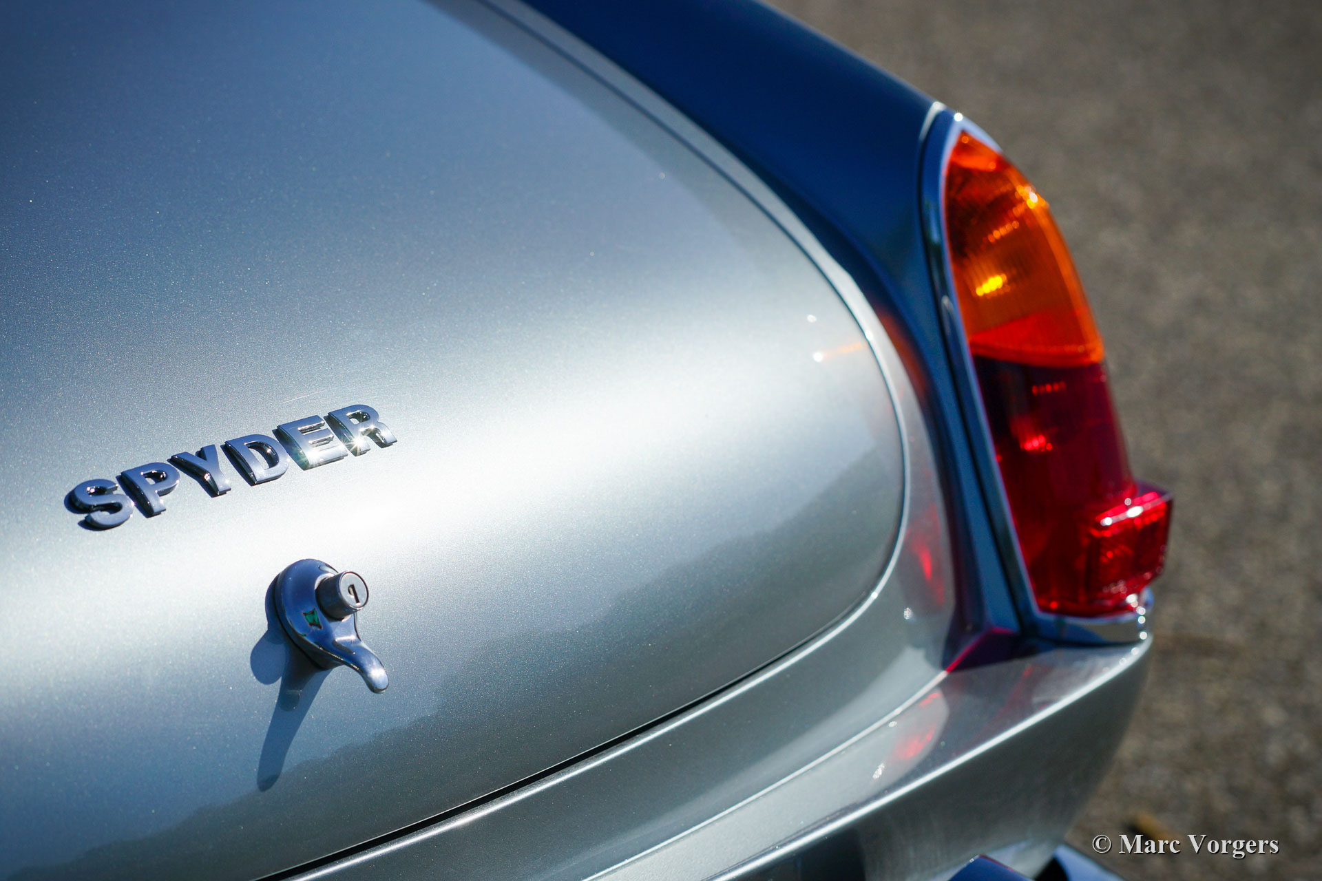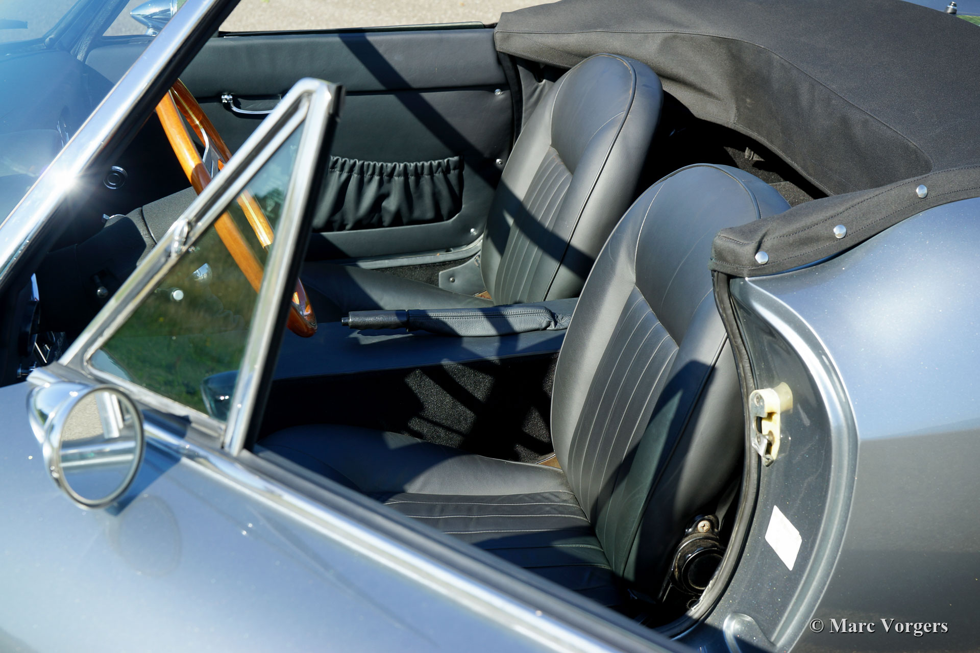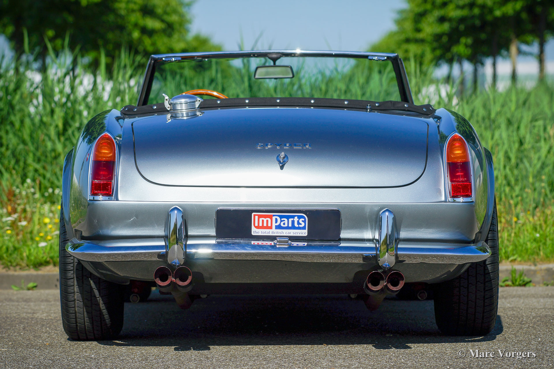 Modena Spyder California, année 1970. Couleur argent métallisé combiné avec un intérieur en cuir noir et un tapis noir. Capote et capuche noires. La Modena Spyder California est une réplique Ferrari 250 GT California 1963 avec une carrosserie GRP (polyester renforcé de fibre de verre) créée par Modena Design and Development à El Cajon, Californie, USA. La carrosserie GRP est renforcée par un renfort de capot en acier et des intérieurs de porte en acier. Le Modena Spyder est basé sur un châssis rigide multi-tubes « space frame » conçu par le designer automobile Indy car Bob Webb. Le châssis est doté d'une suspension avant indépendante, d'un essieu arrière rigide et de freins à disque tout autour. Le Modena Spyder présenté est équipé d'un moteur V8 Ford 302 cu (5 litres) couplé à une boîte de vitesses automatique à quatre vitesses. Le châssis est très robuste et bien suspendu, la voiture accélère, roule et sonne de manière impressionnante ! Cette Modena Spyder est équipée de la climatisation, d'une direction assistée, de magnifiques roues à rayons chromés, de pneus Pirelli 215 / 70-15, de projecteurs longue portée Marchal 662/672 des années 1960 avec des ampoules jaunes et d'un volant Nardi avec une jante en bois. Le Modena Spyder California est devenu mondialement célèbre en raison de son rôle important dans le film Ferris Buellers Day Off qui est sorti en 1986. La voiture a été importée aux Pays-Bas en 2006. Cette magnifique Modena Spyder California a parcouru 9000 miles et la voiture est en excellent état!